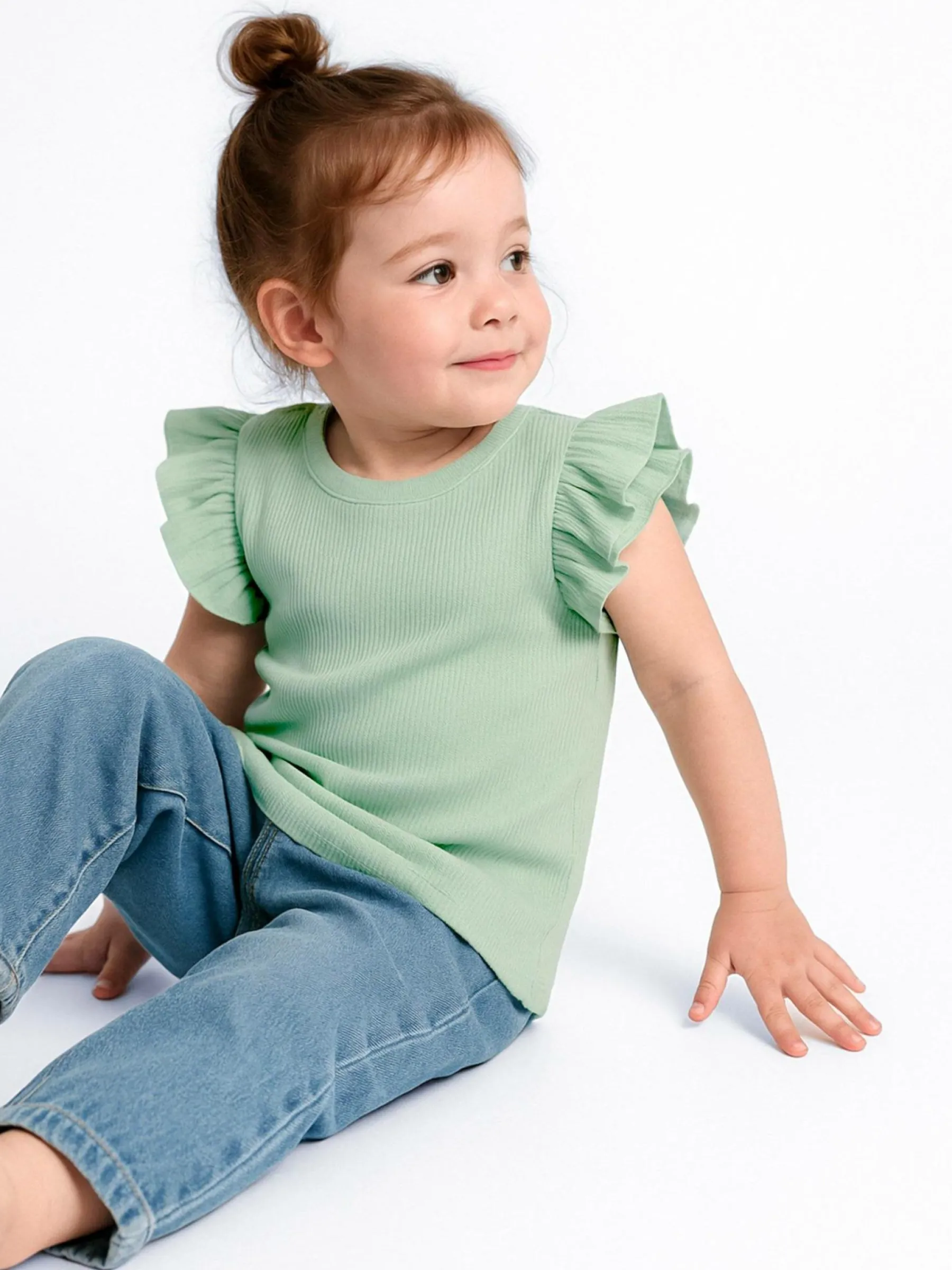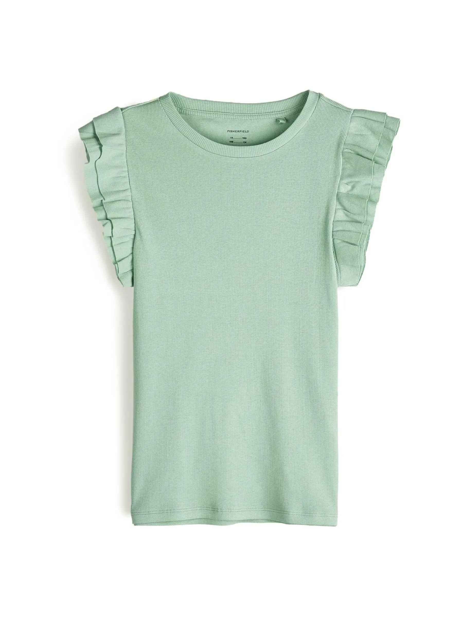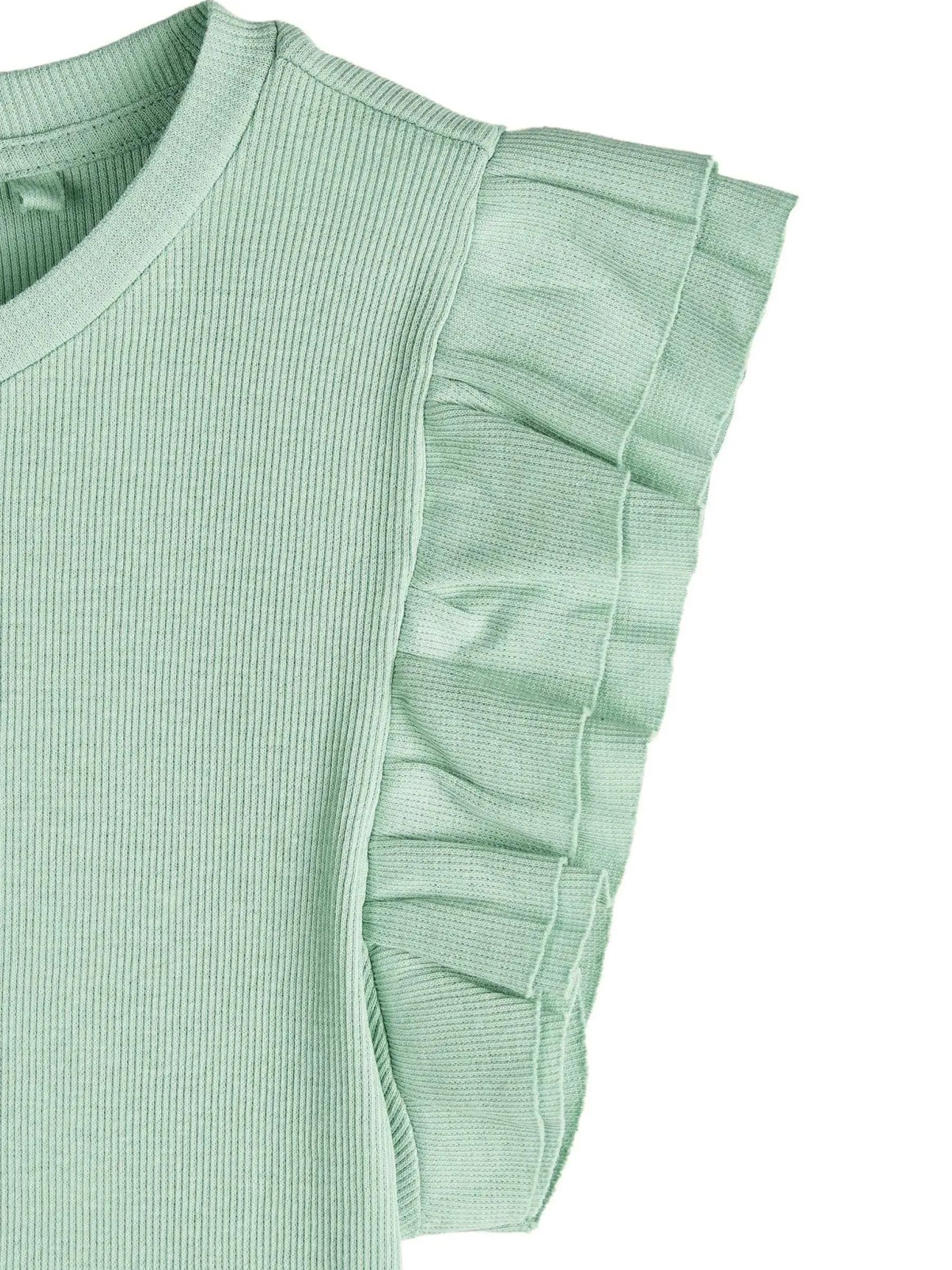 Kolor: zielonyKrój: z falbanąTyp: koszulkaRekaw: krótki rękawDługość: krótkiPattern style: pojedynczy kolorDetal…