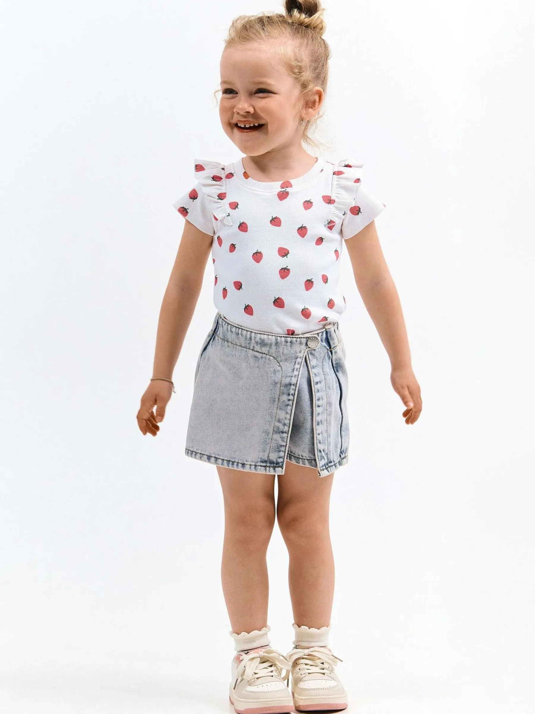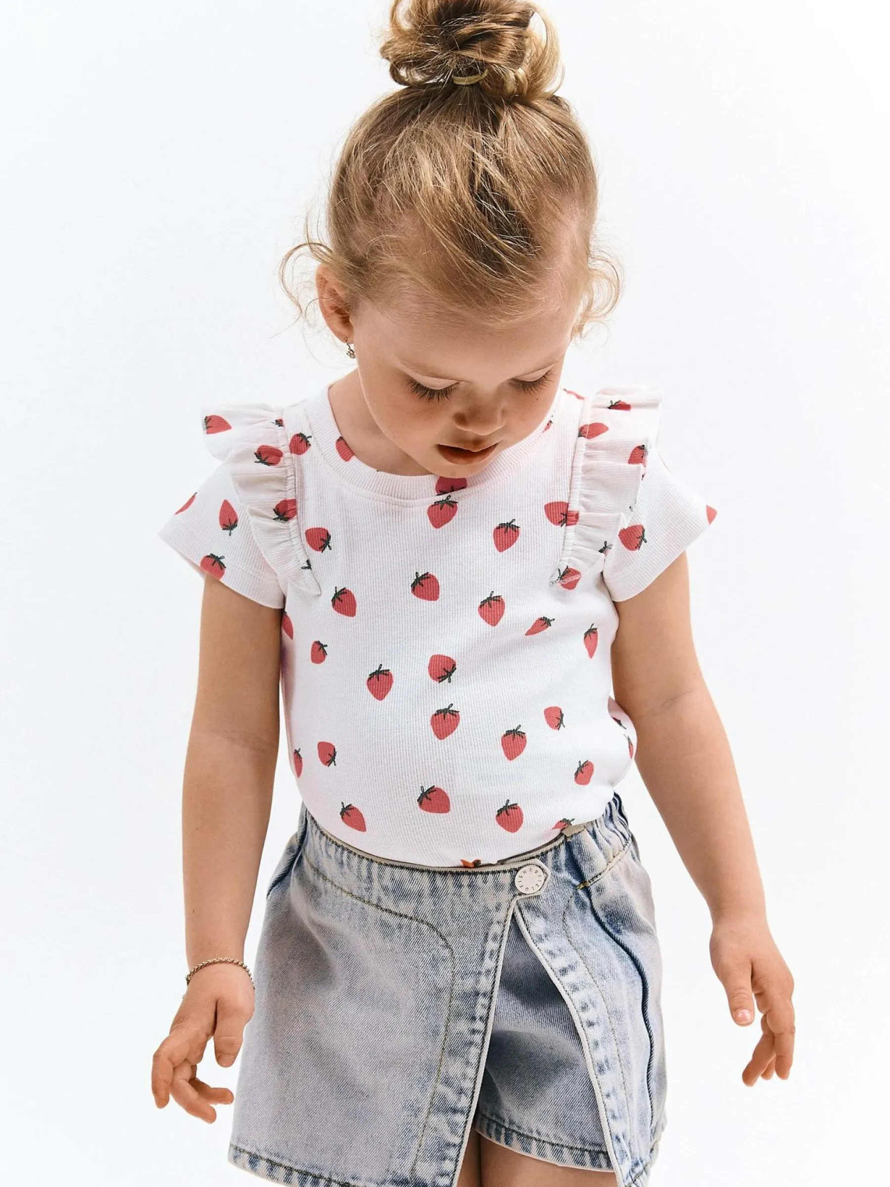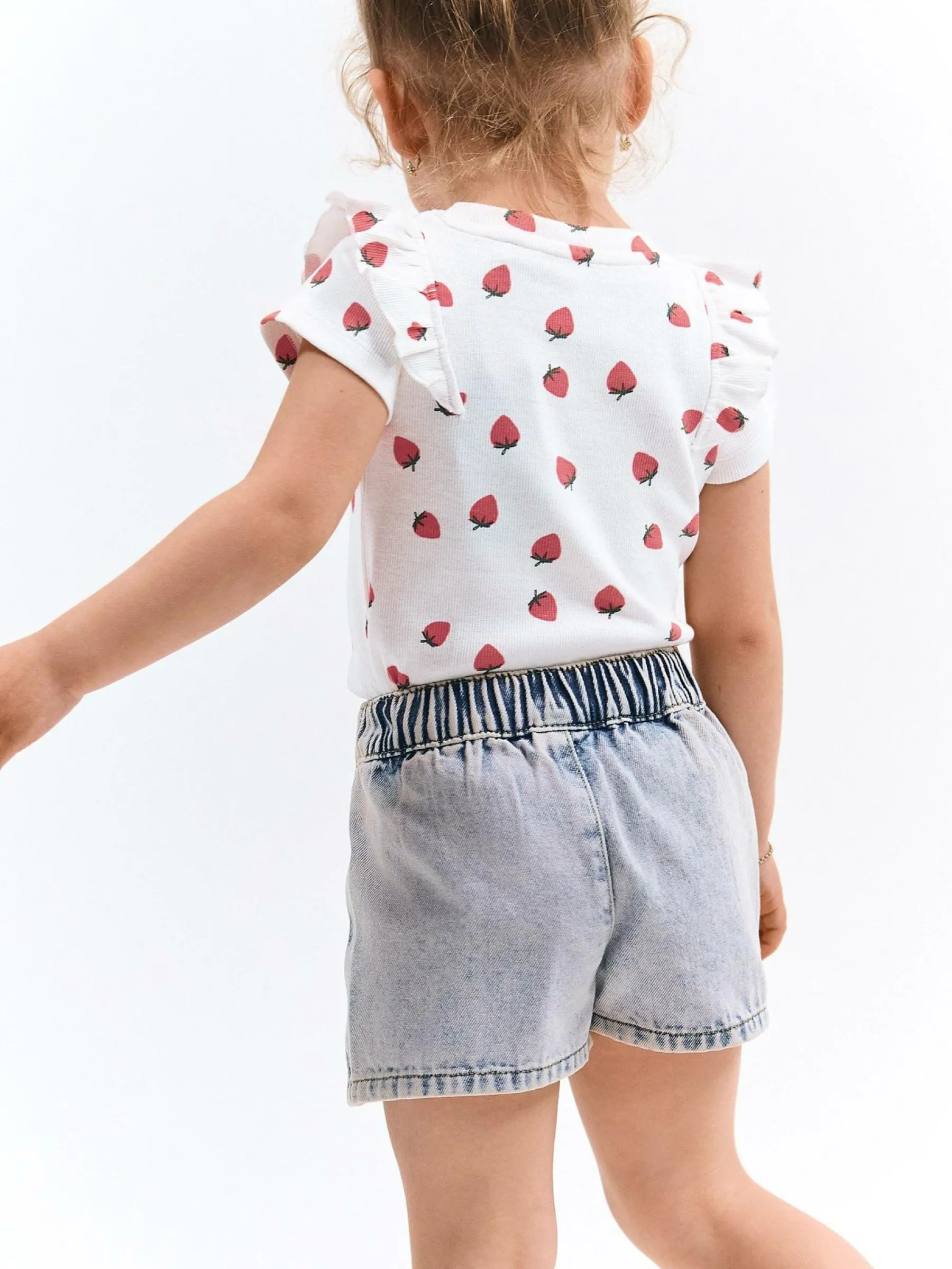 Kolor: białyKrój: z falbanąTyp: koszulkaRekaw: krótki rękawDługość: krótkiPattern style: żebrowany, wzorzysteD…