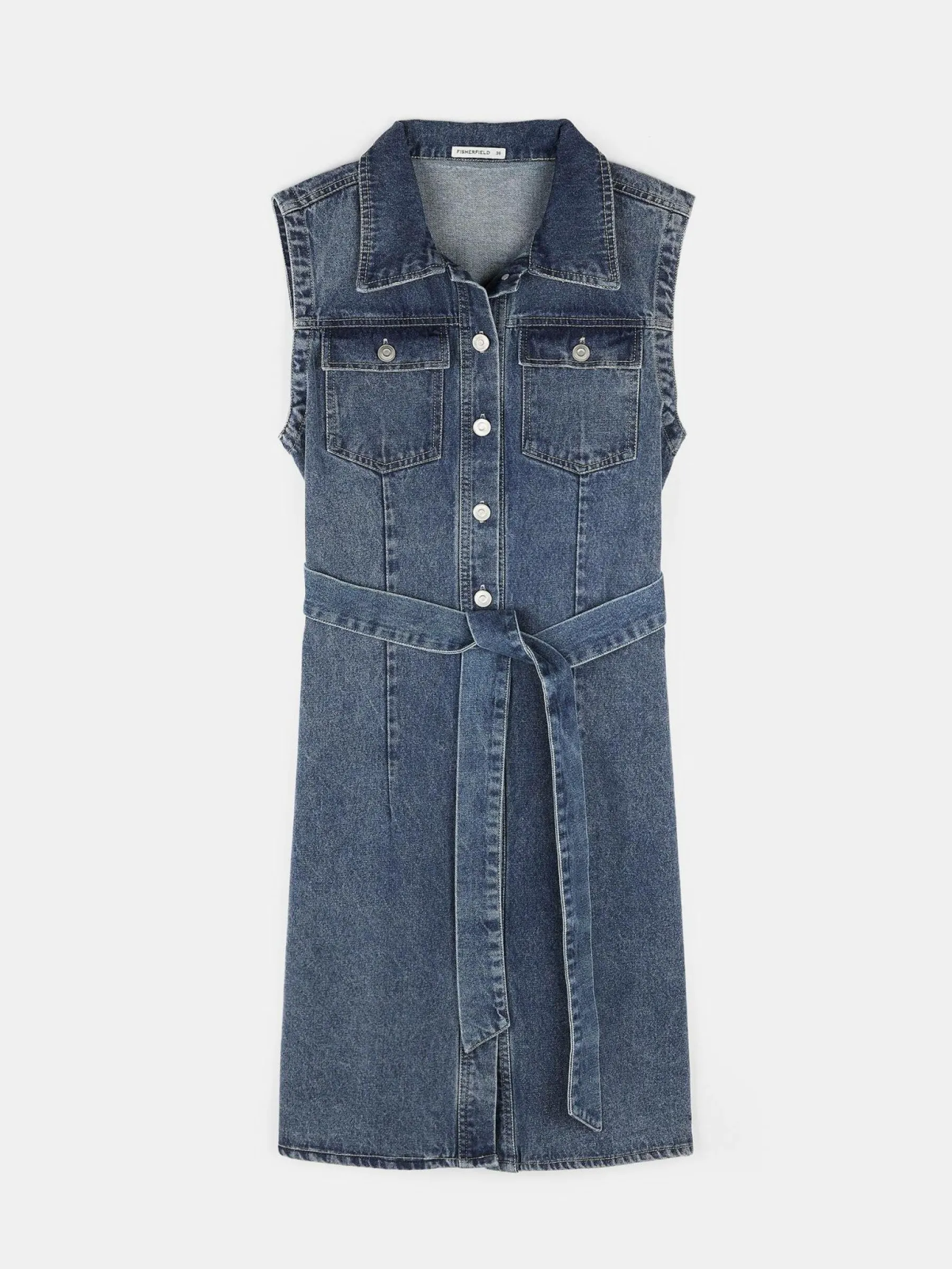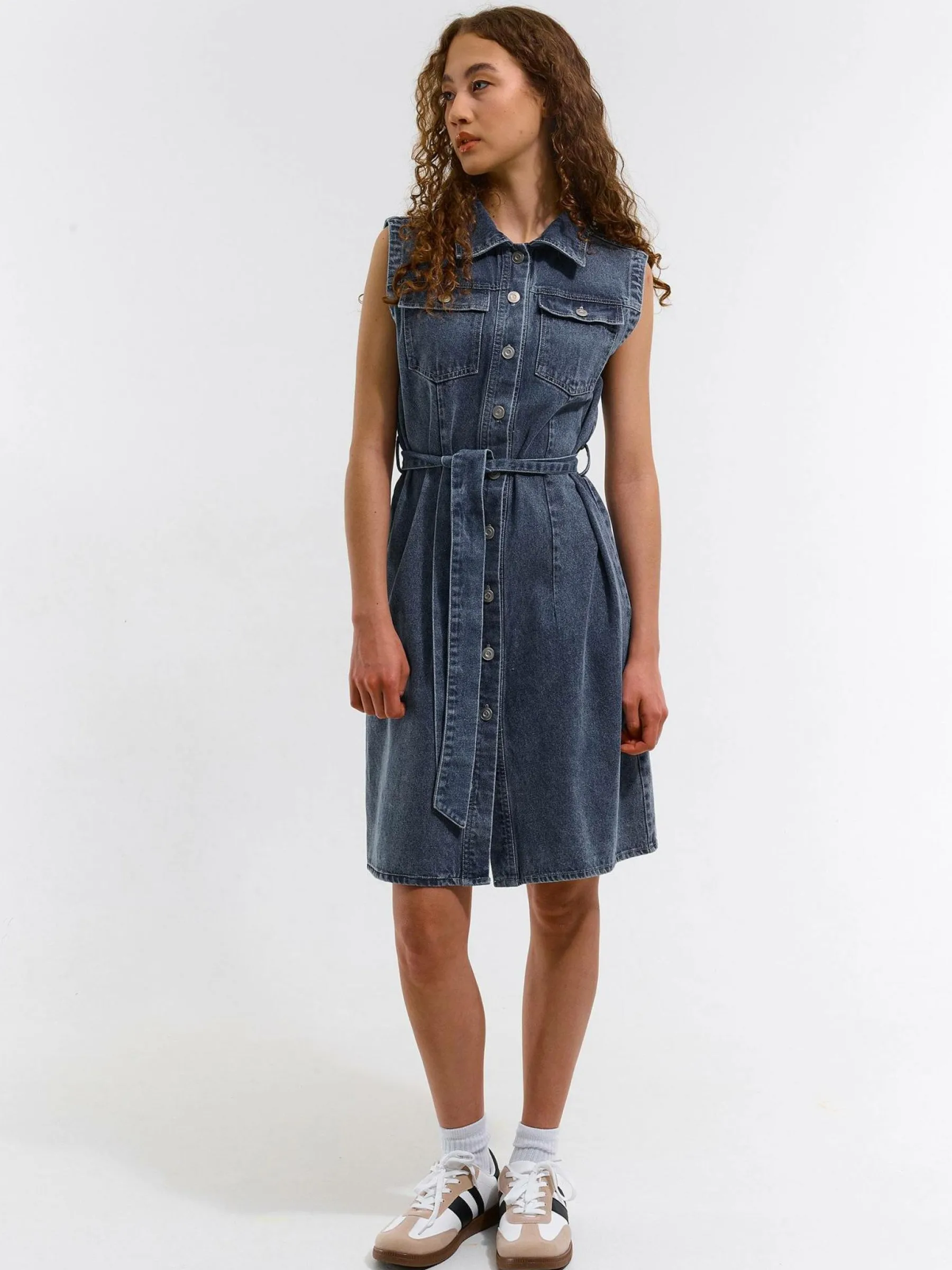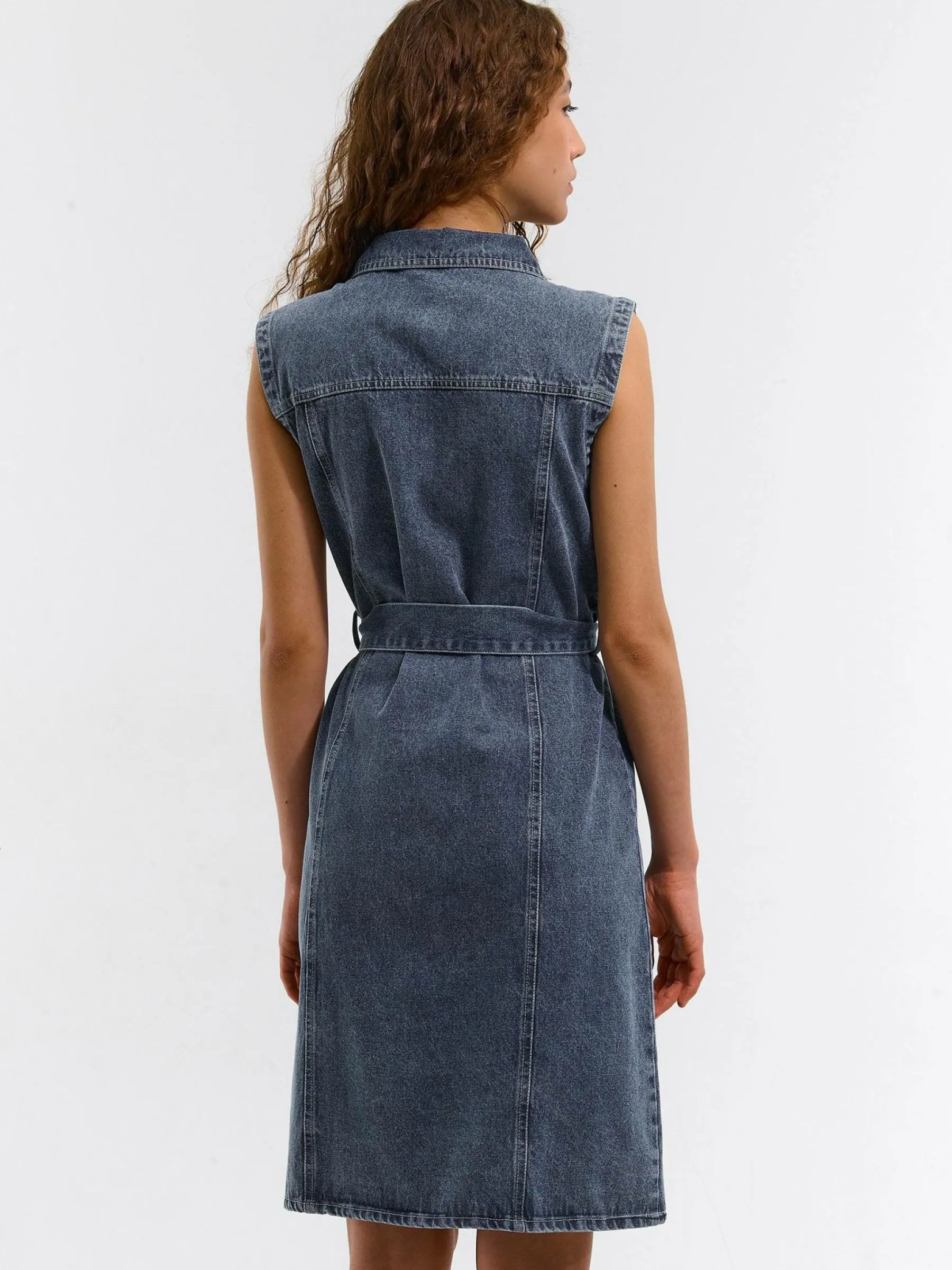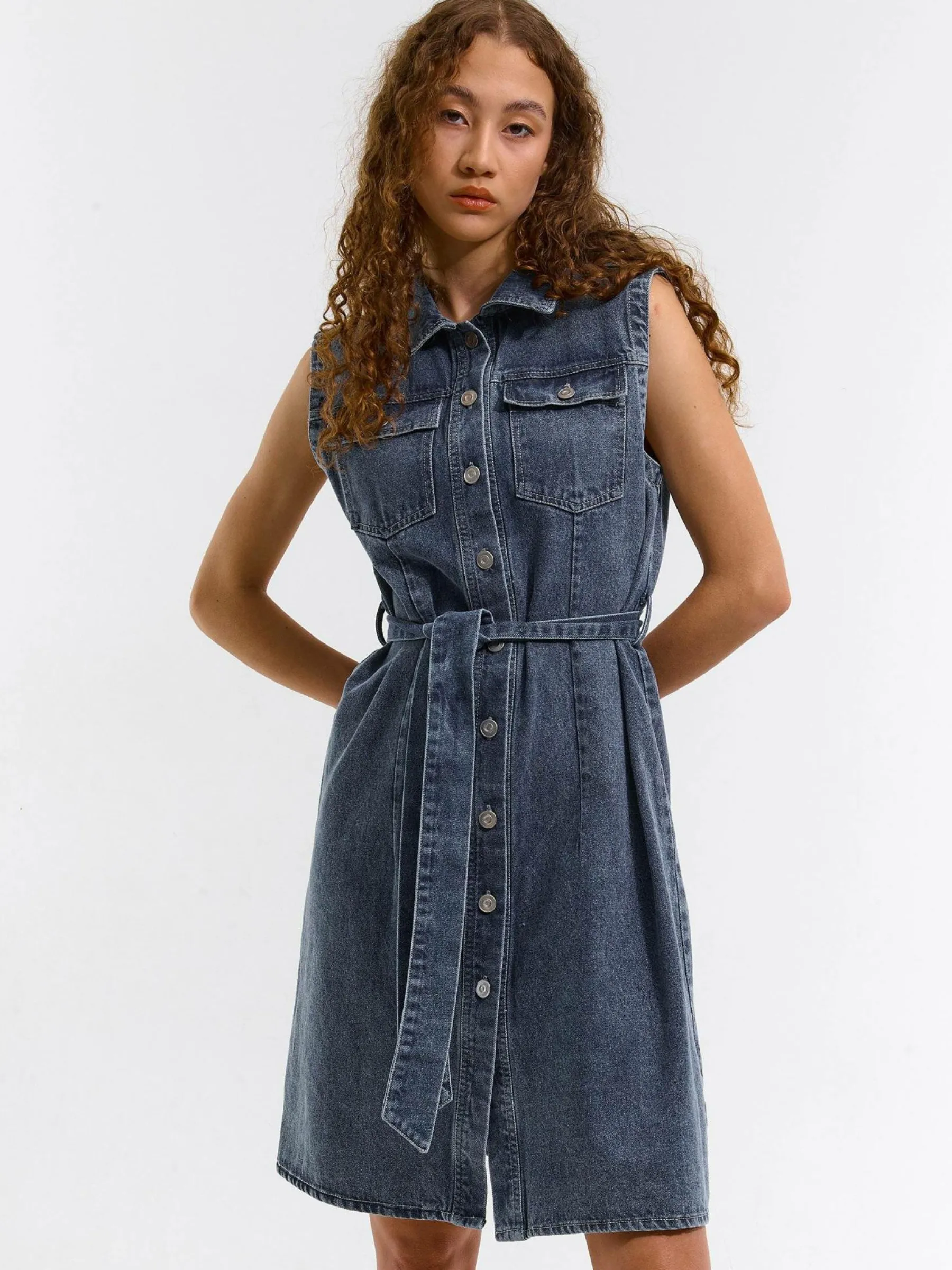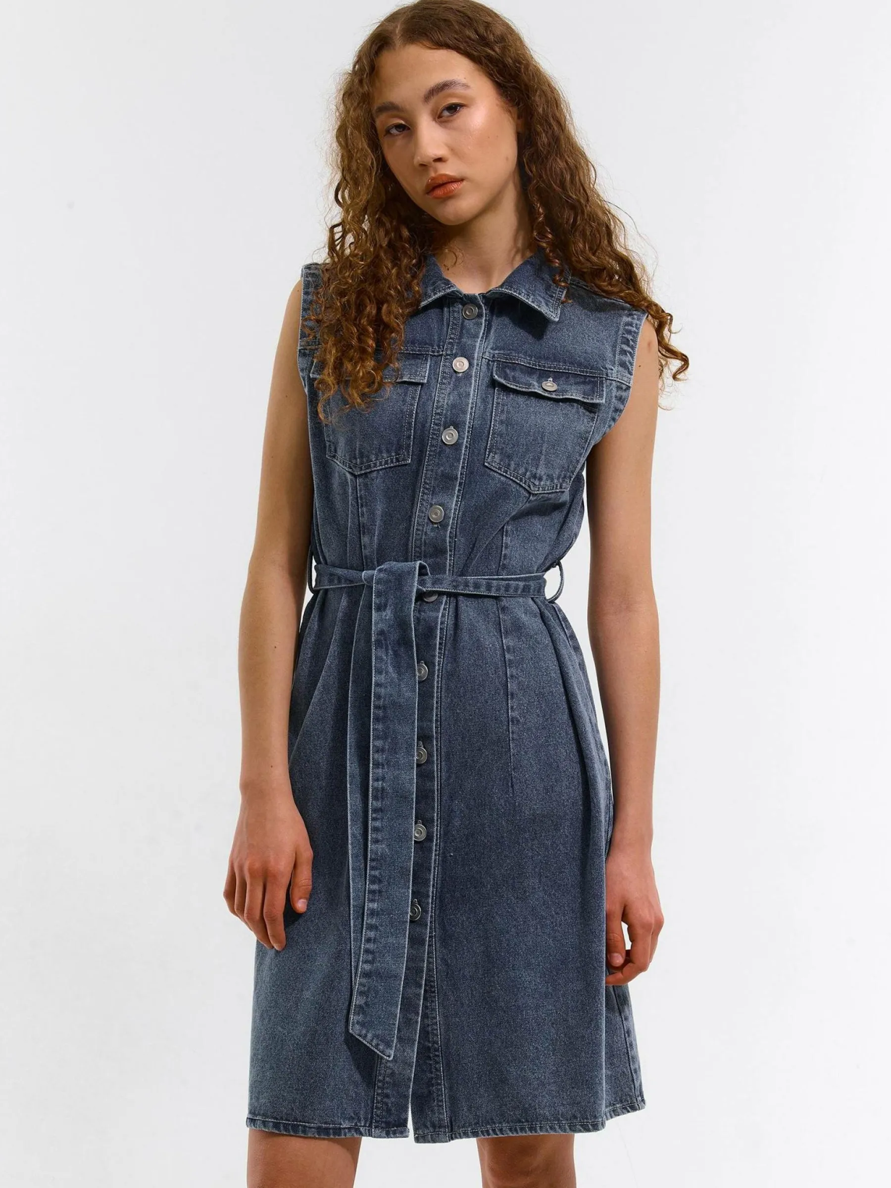 Kolor: niebieskiKrój: koszuloweTyp: sukienkaRekaw: bez rękawówDługość: miniPattern style: pojedynczy kolorDetal: z…