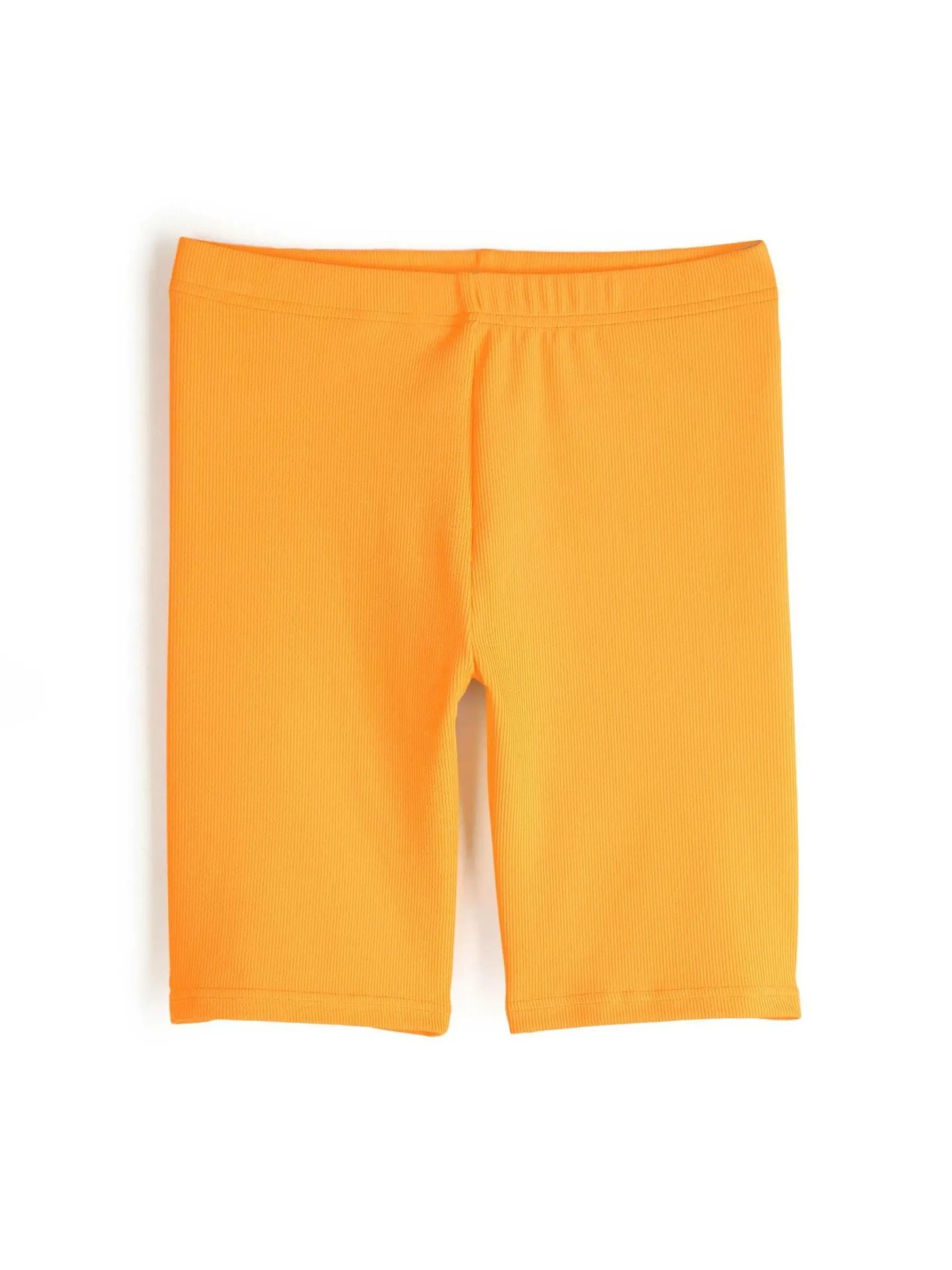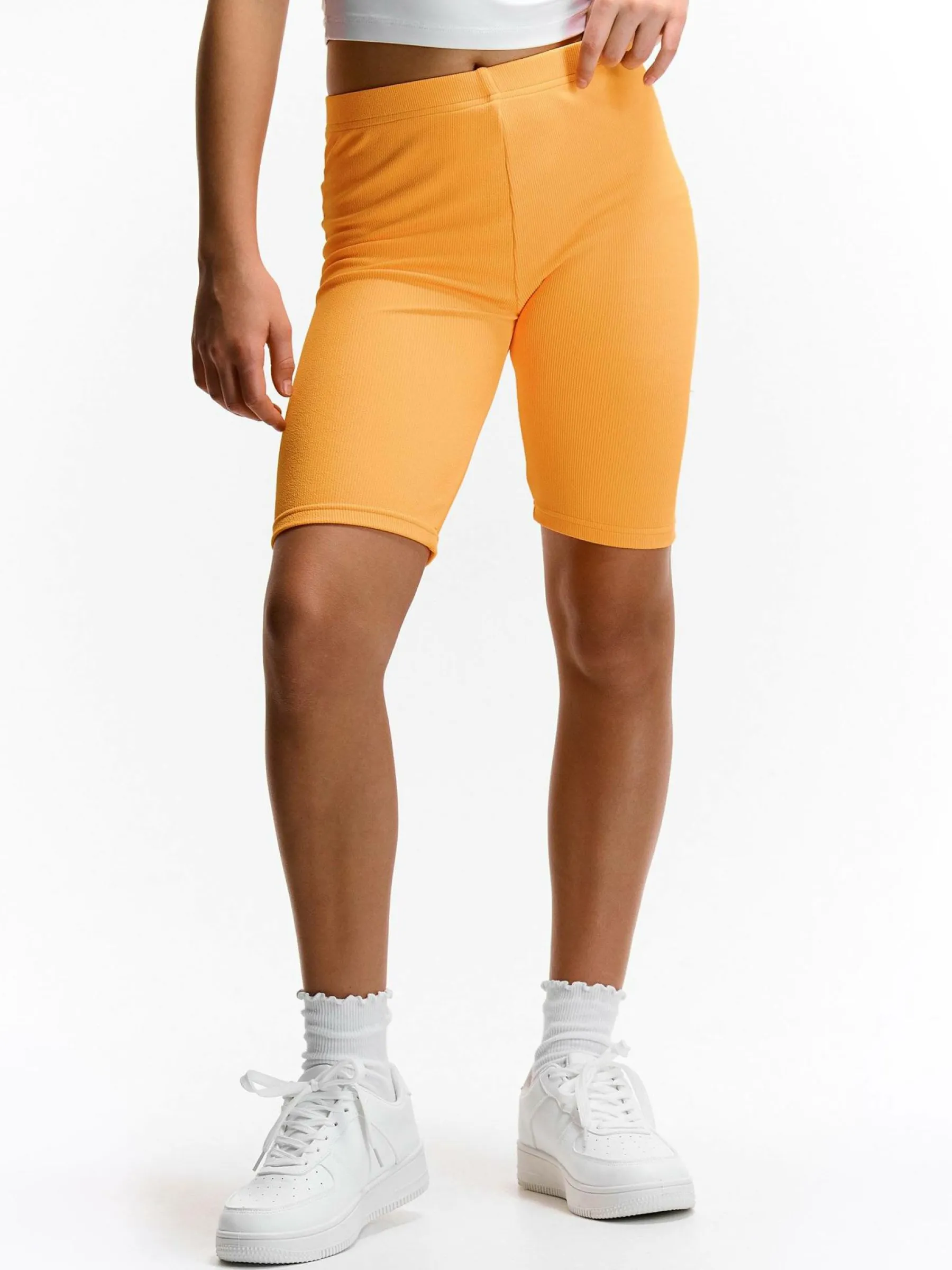 Kolor: pomarańczowyKrój: bikerTyp: spodenkiDługość: krótkiPattern style: pojedynczy kolor, żebrowanyDetal: z elas…