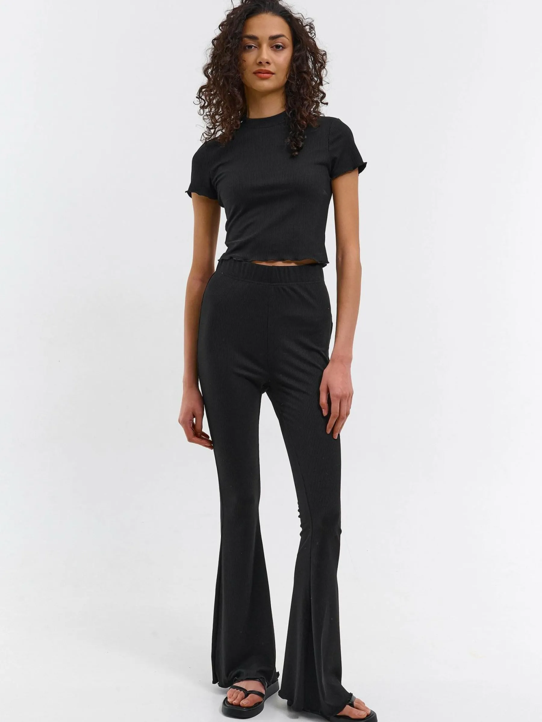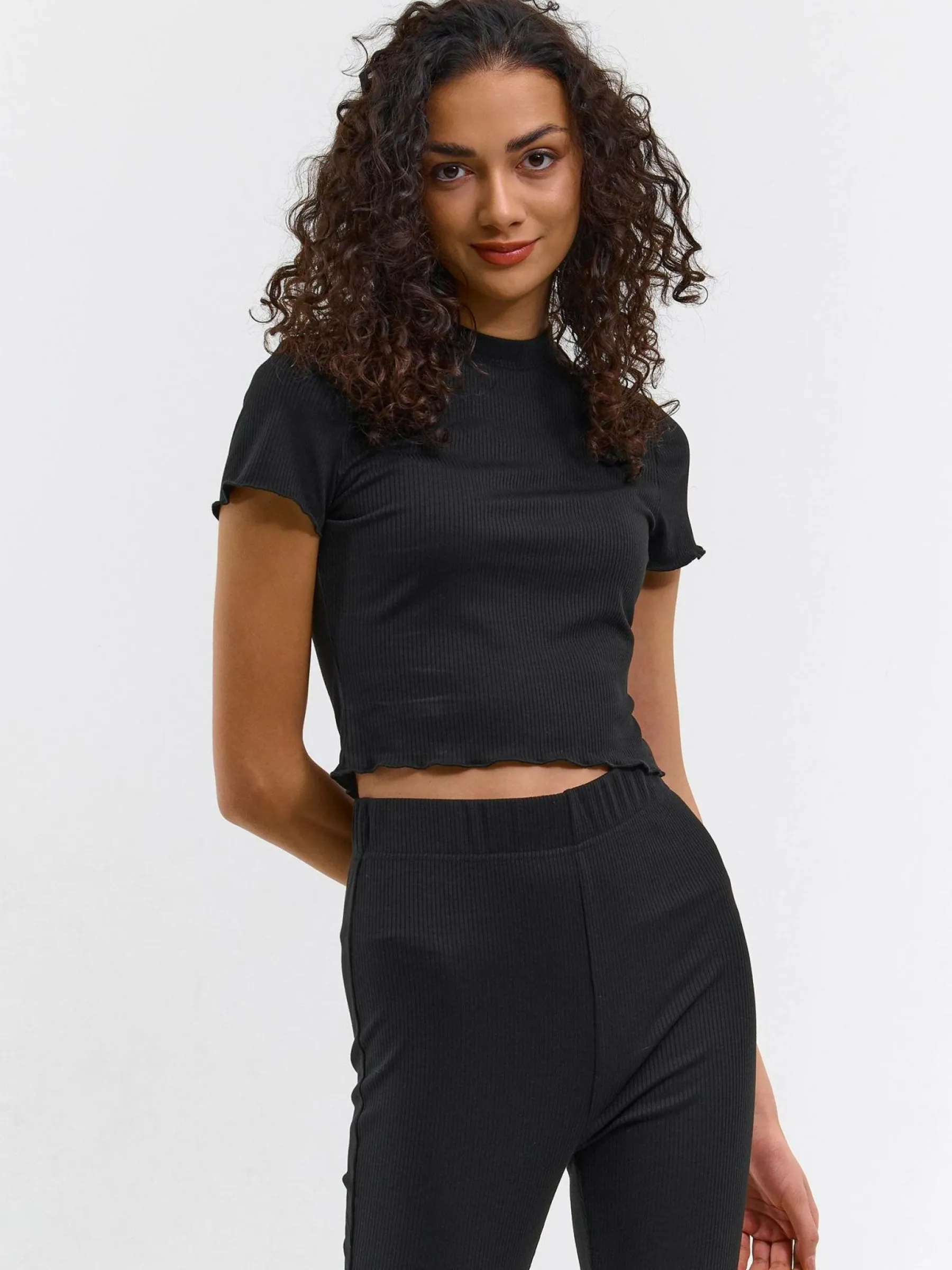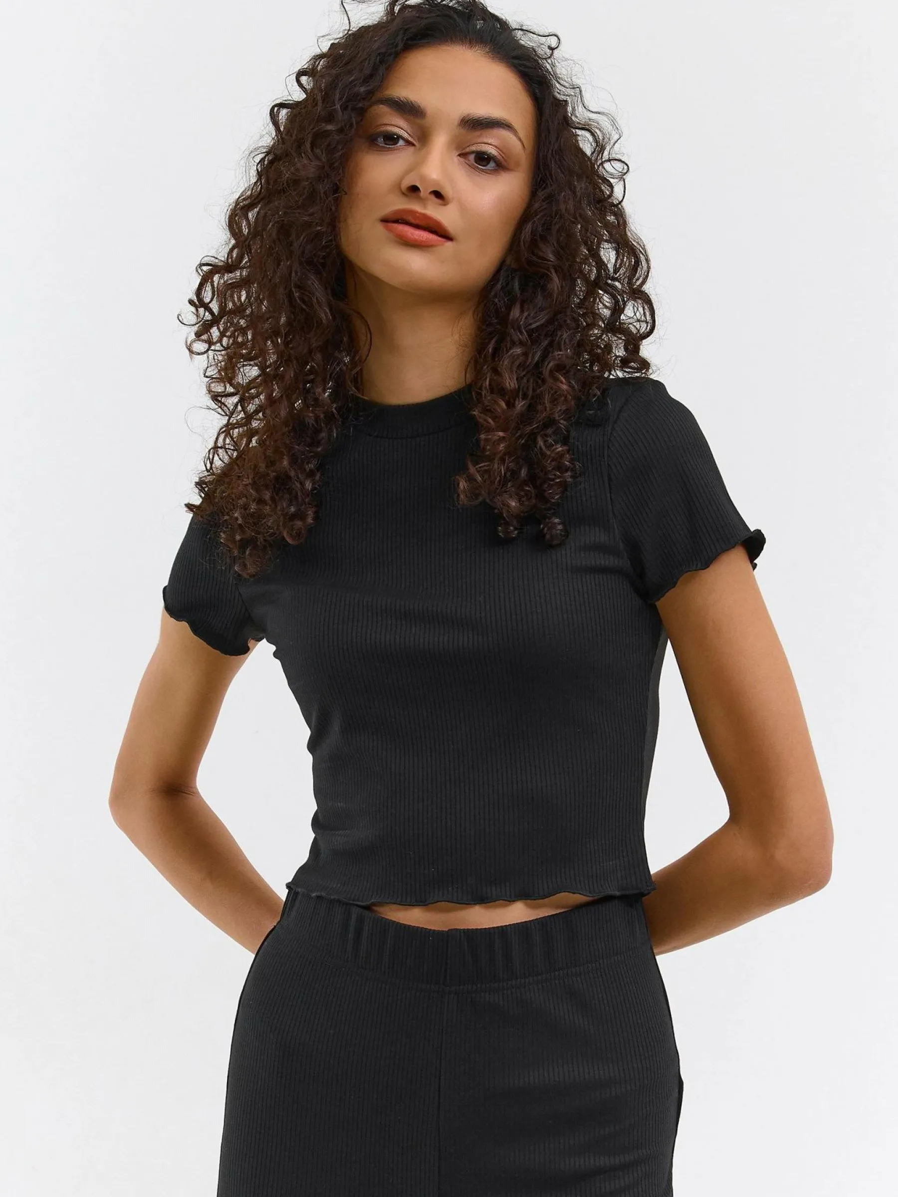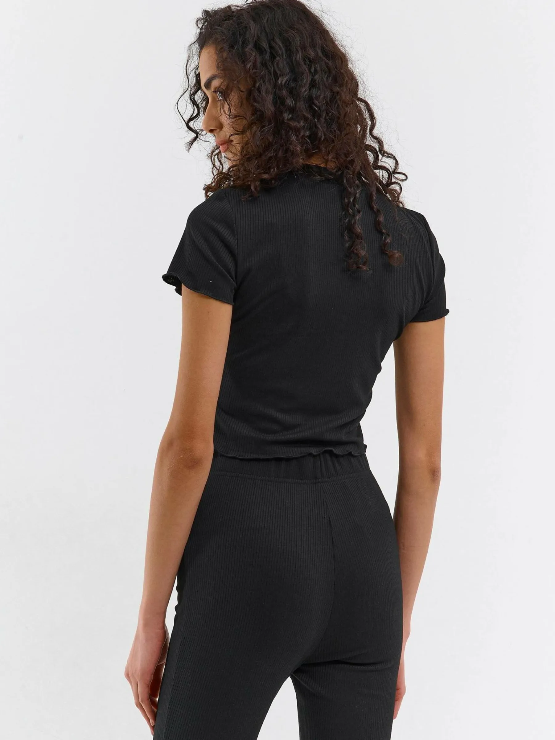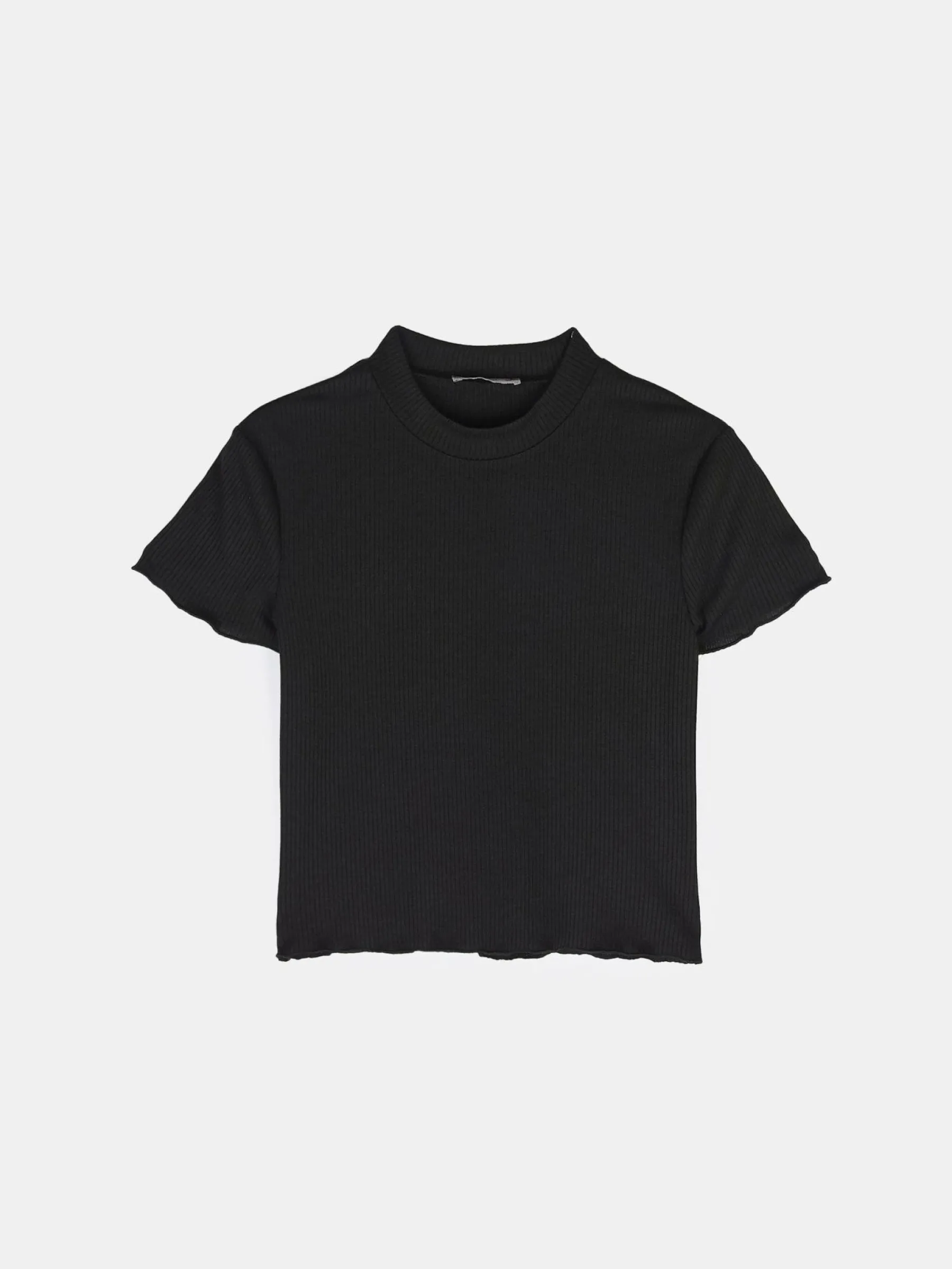 Kolor: czarnyKrój: regularTyp: koszulkaRekaw: krótki rękawDługość: krótkiPattern style: pojedynczy kolor, żebrow…