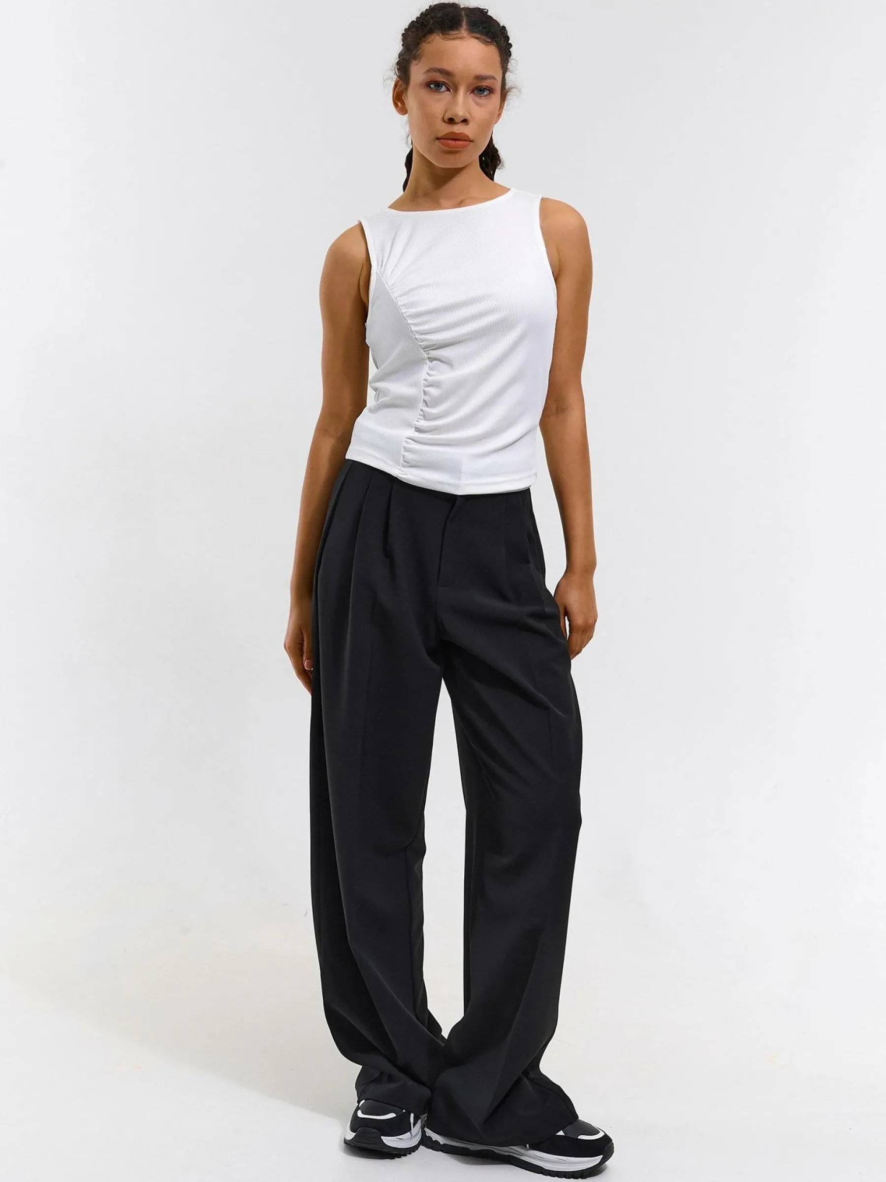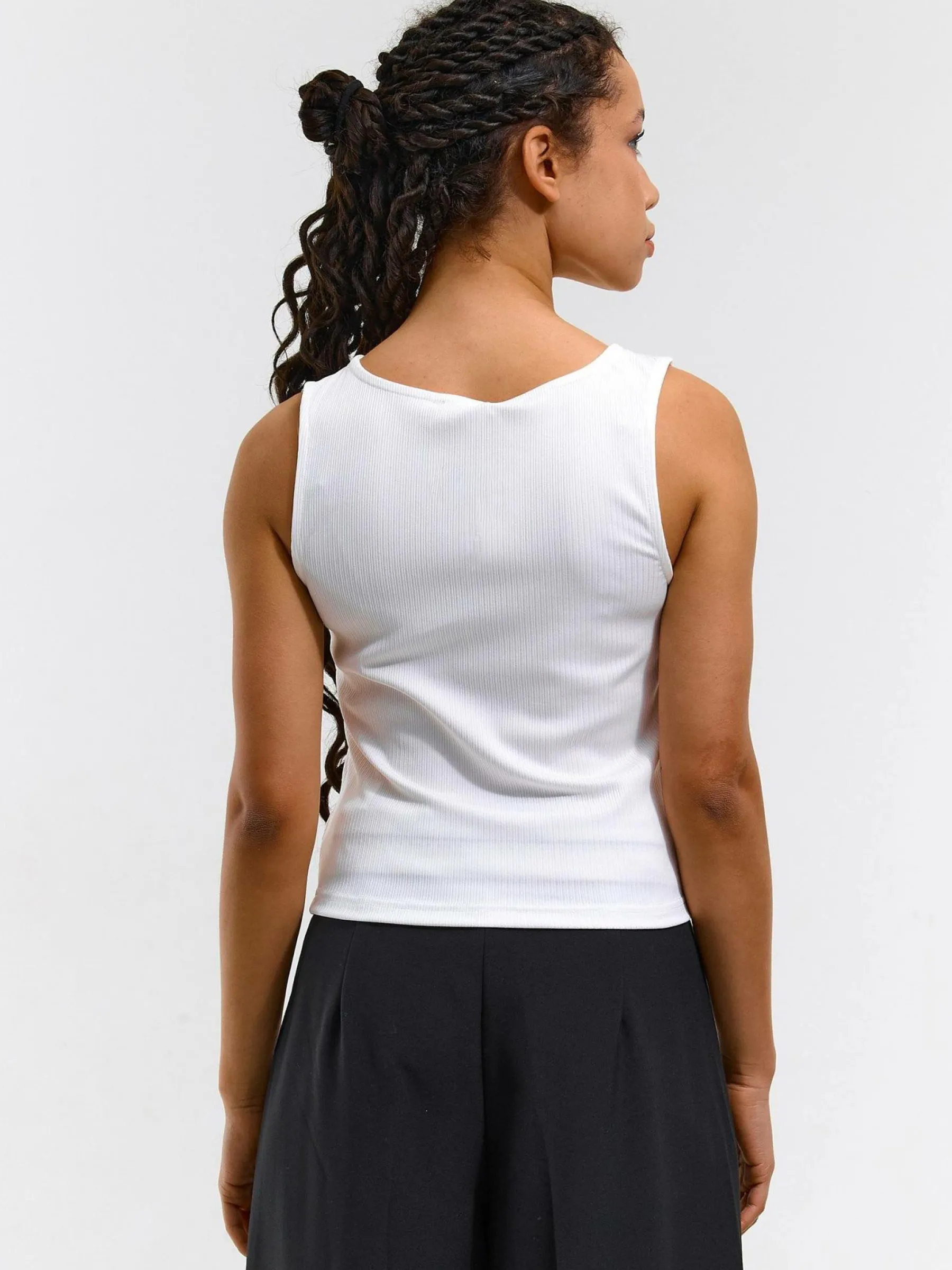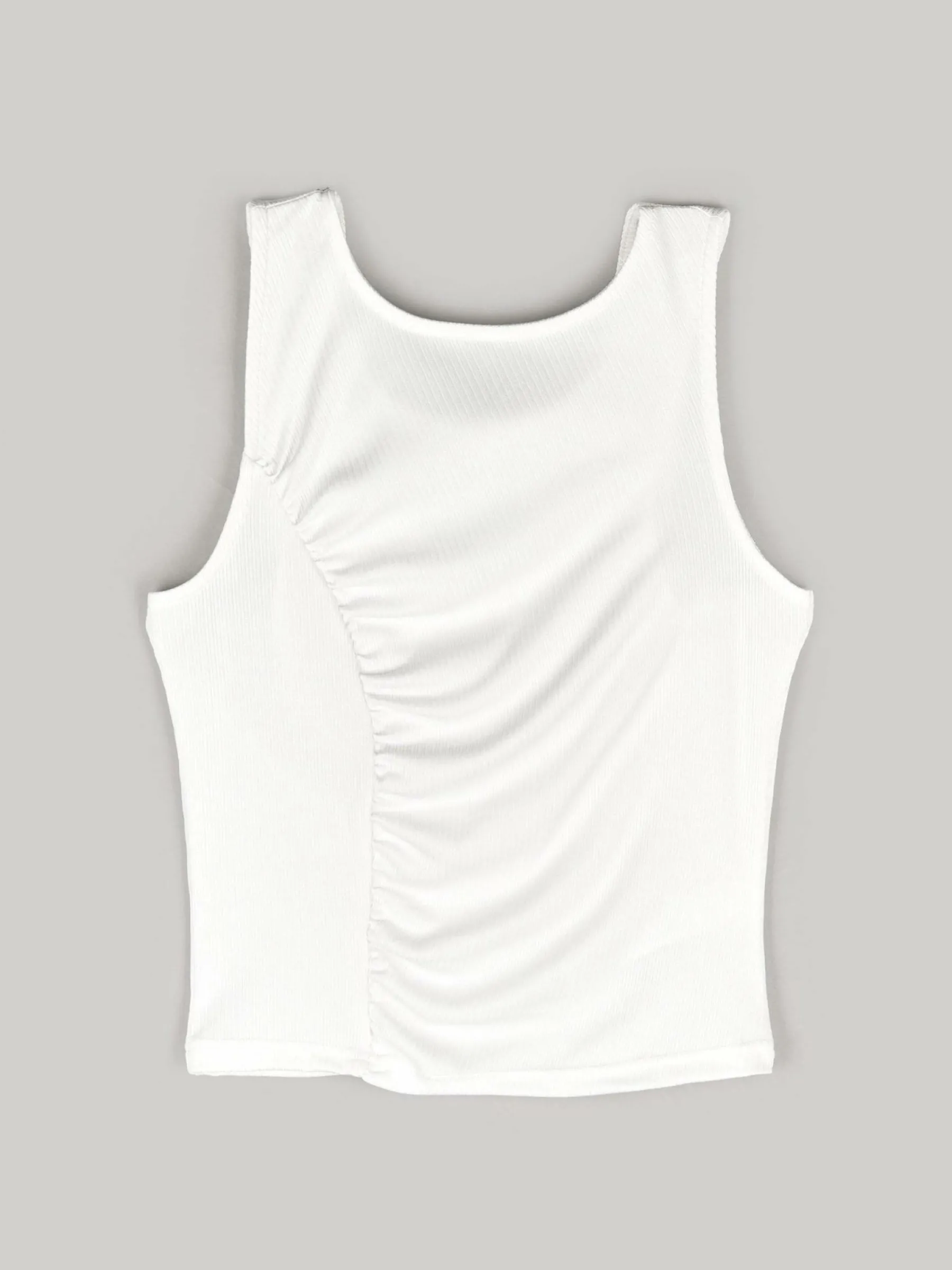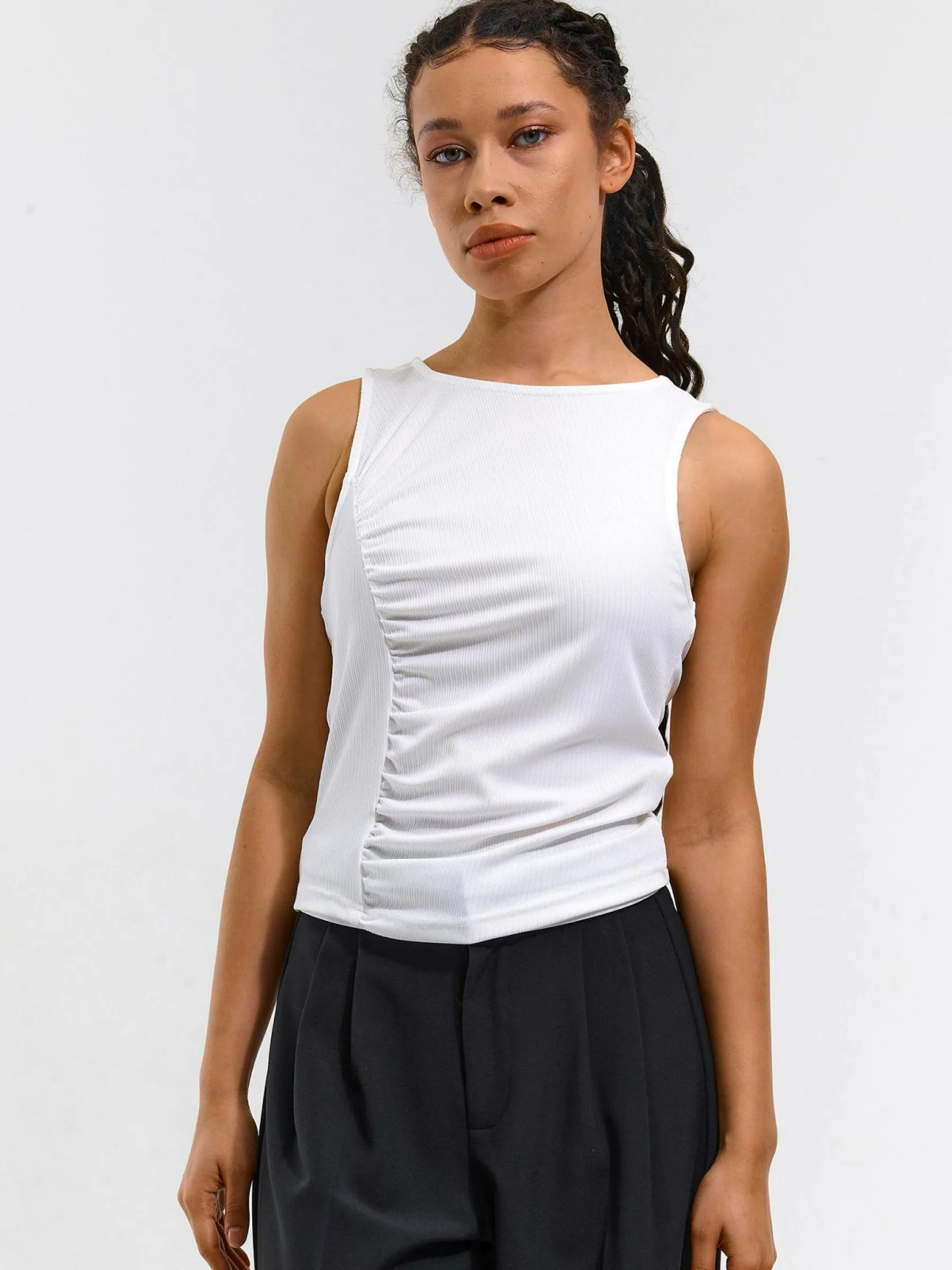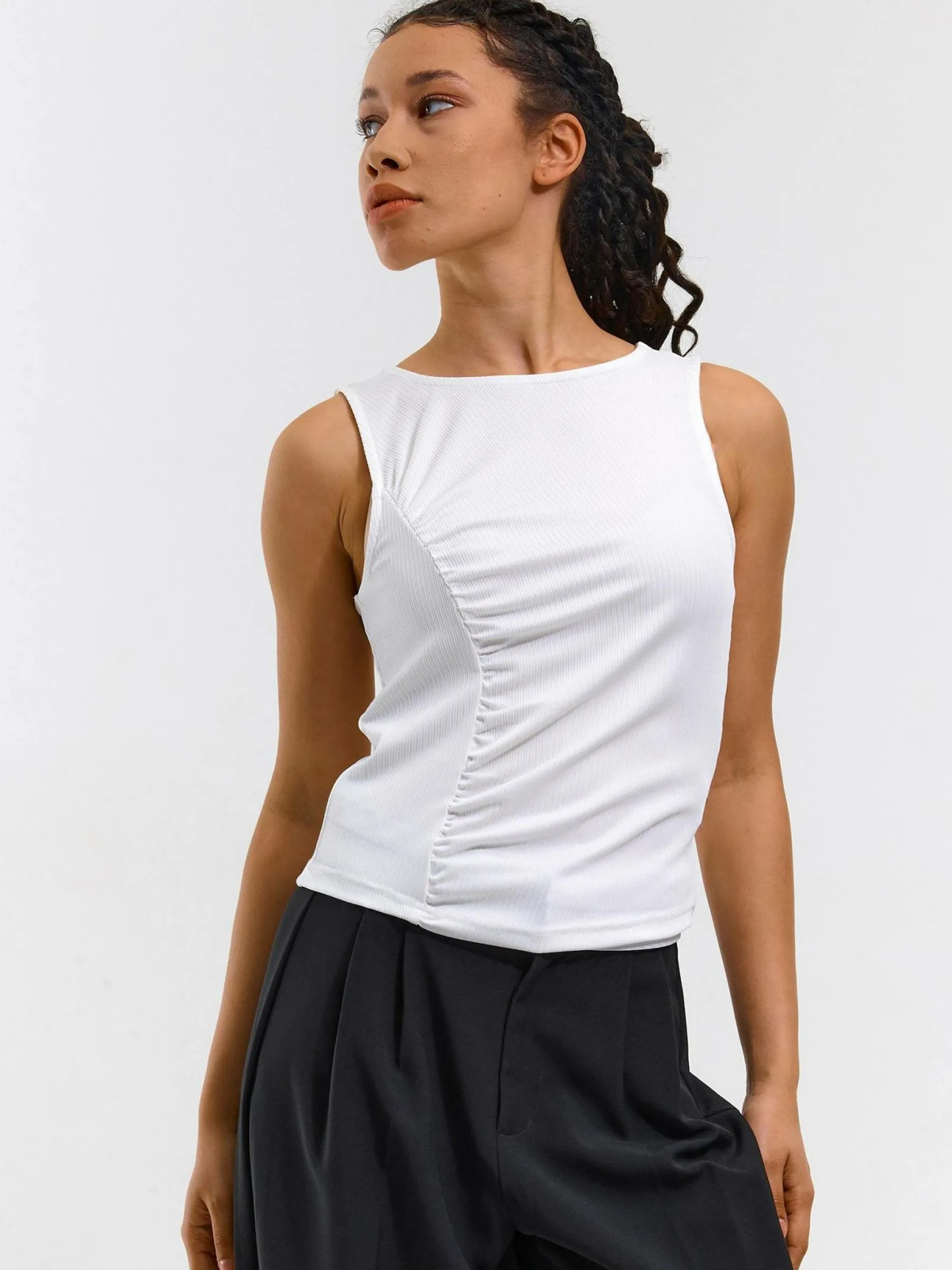 Kolor: białyKrój: z marszczeniemTyp: podkoszulekRekaw: bez rękawówDługość: krótkiPattern style: żebrowany, poje…