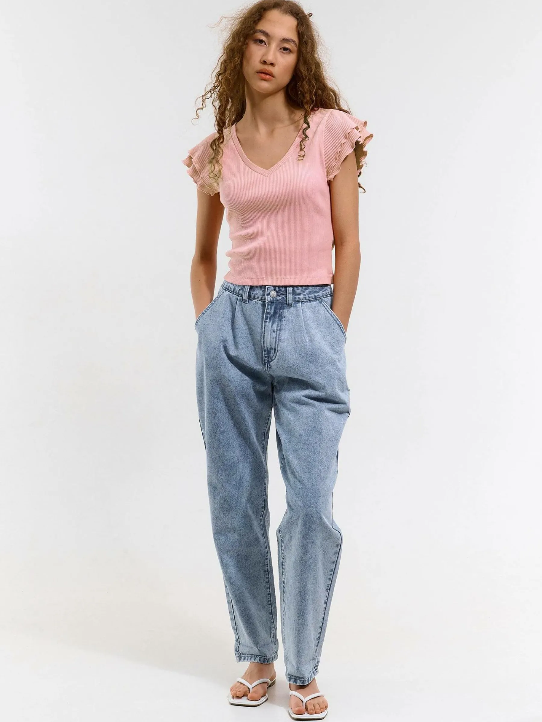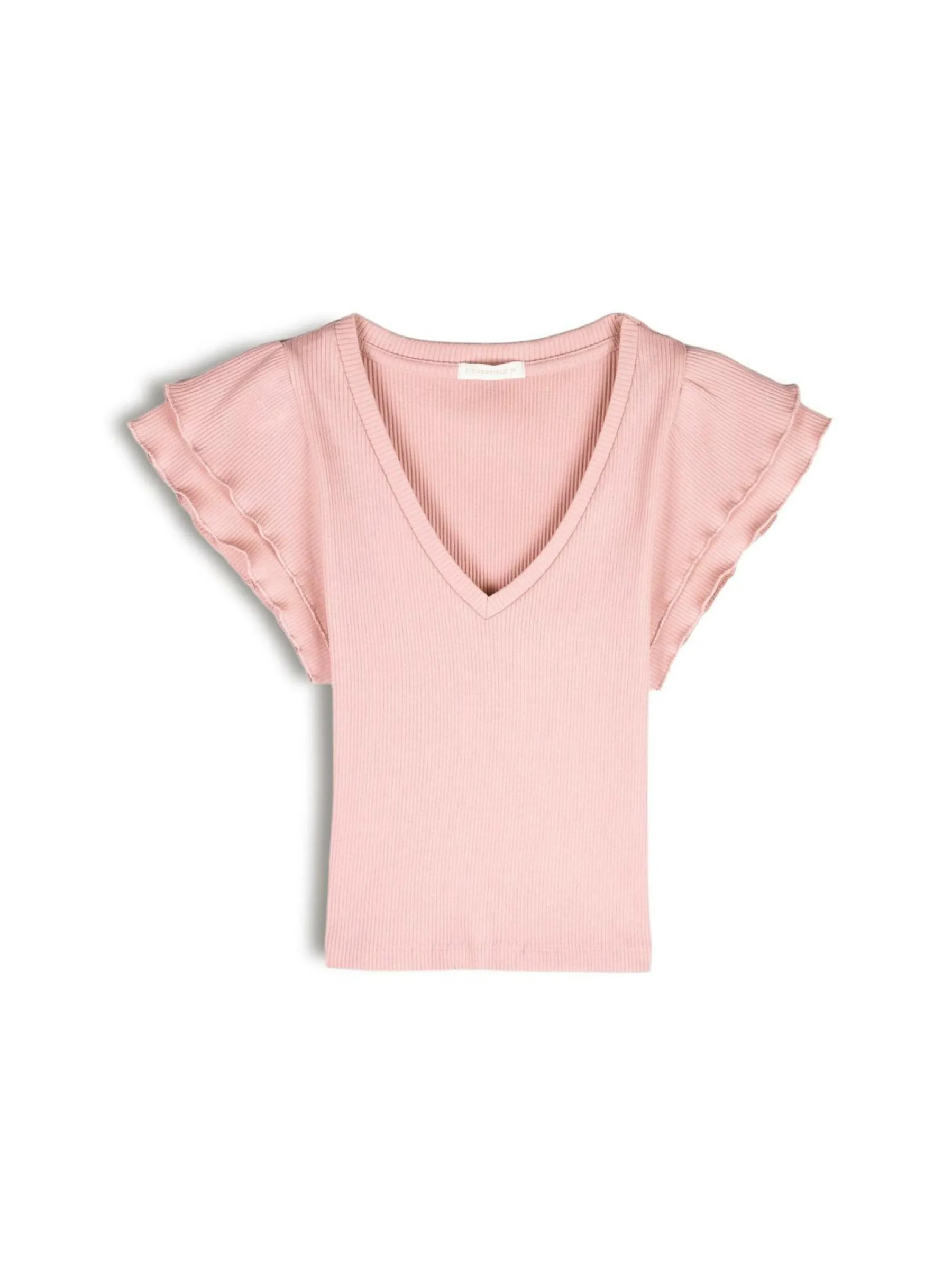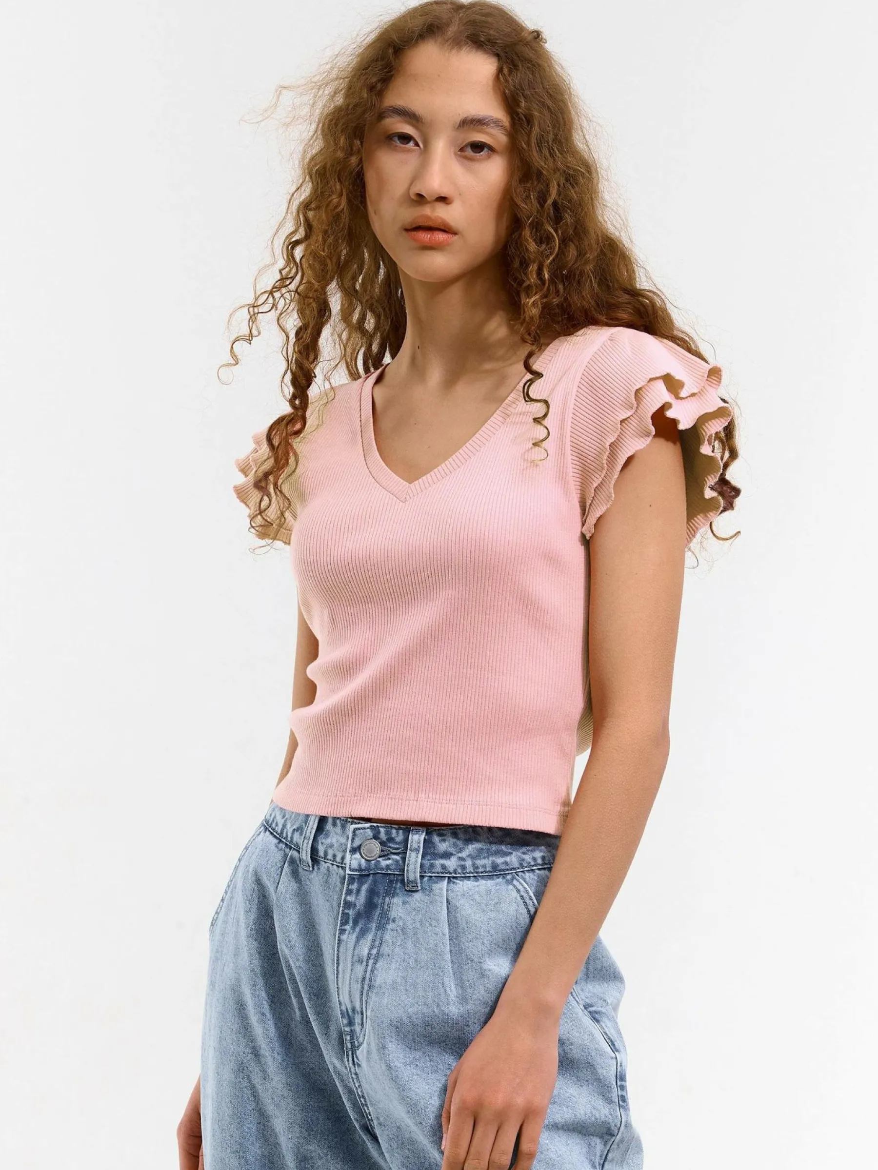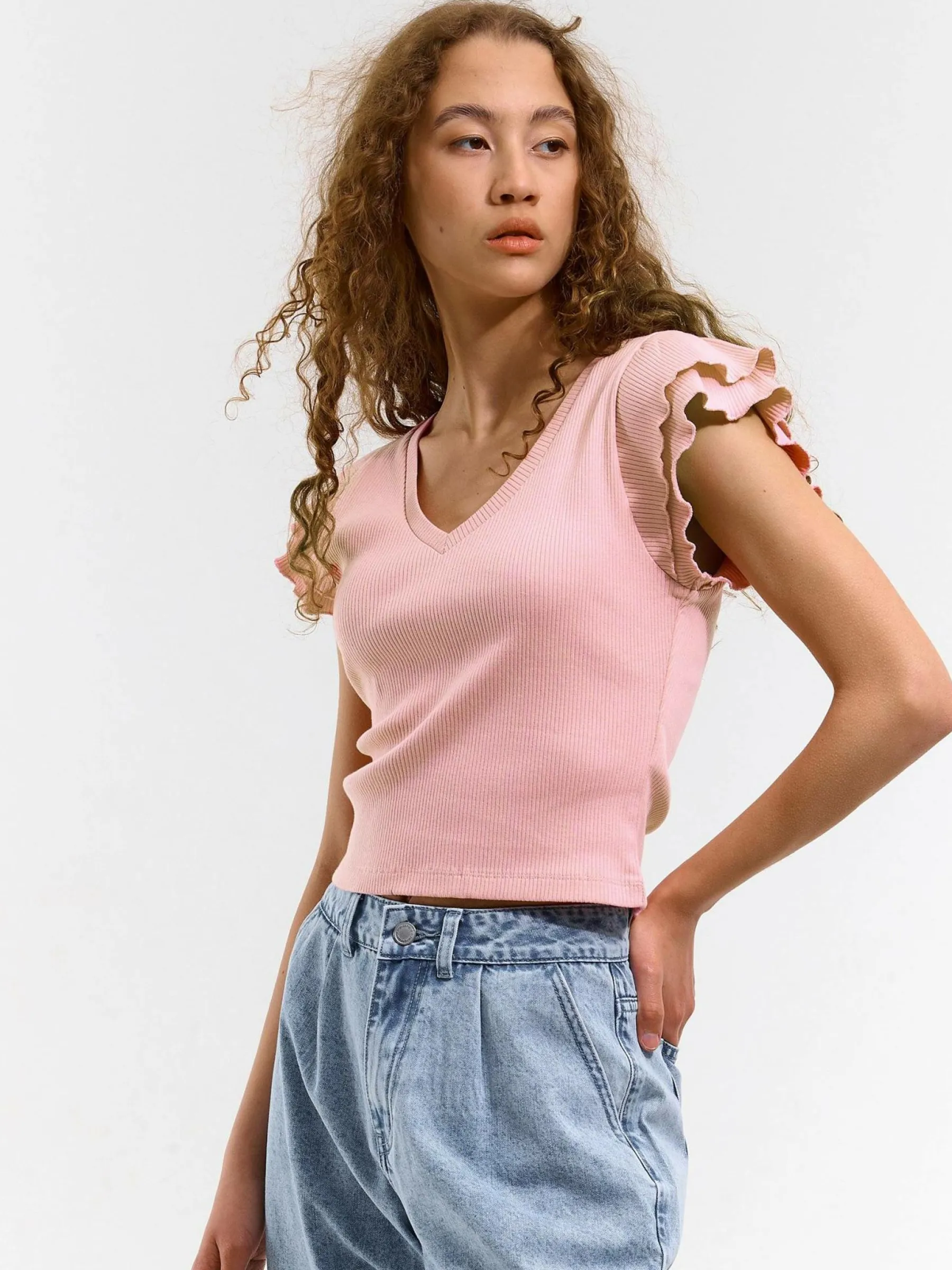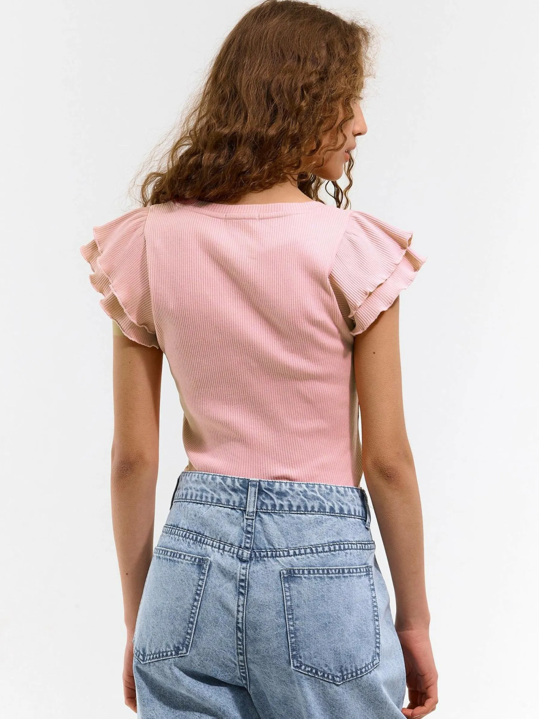 Kolor: różowyKrój: z falbanąTyp: topRekaw: krótki rękawDługość: krótkiPattern style: pojedynczy kolor, żebrow…