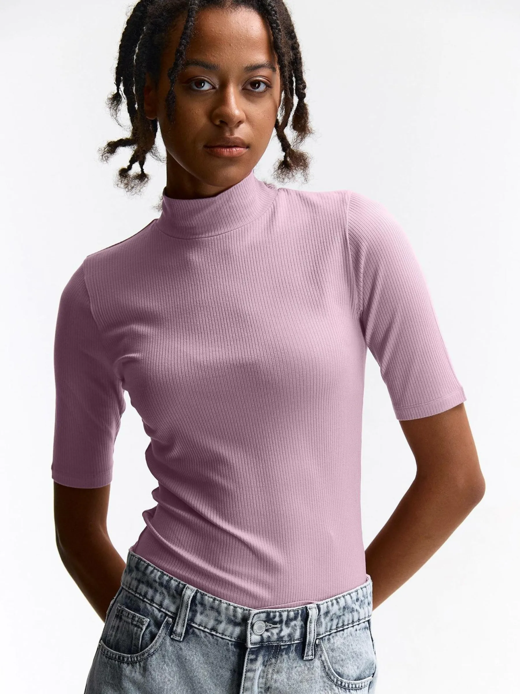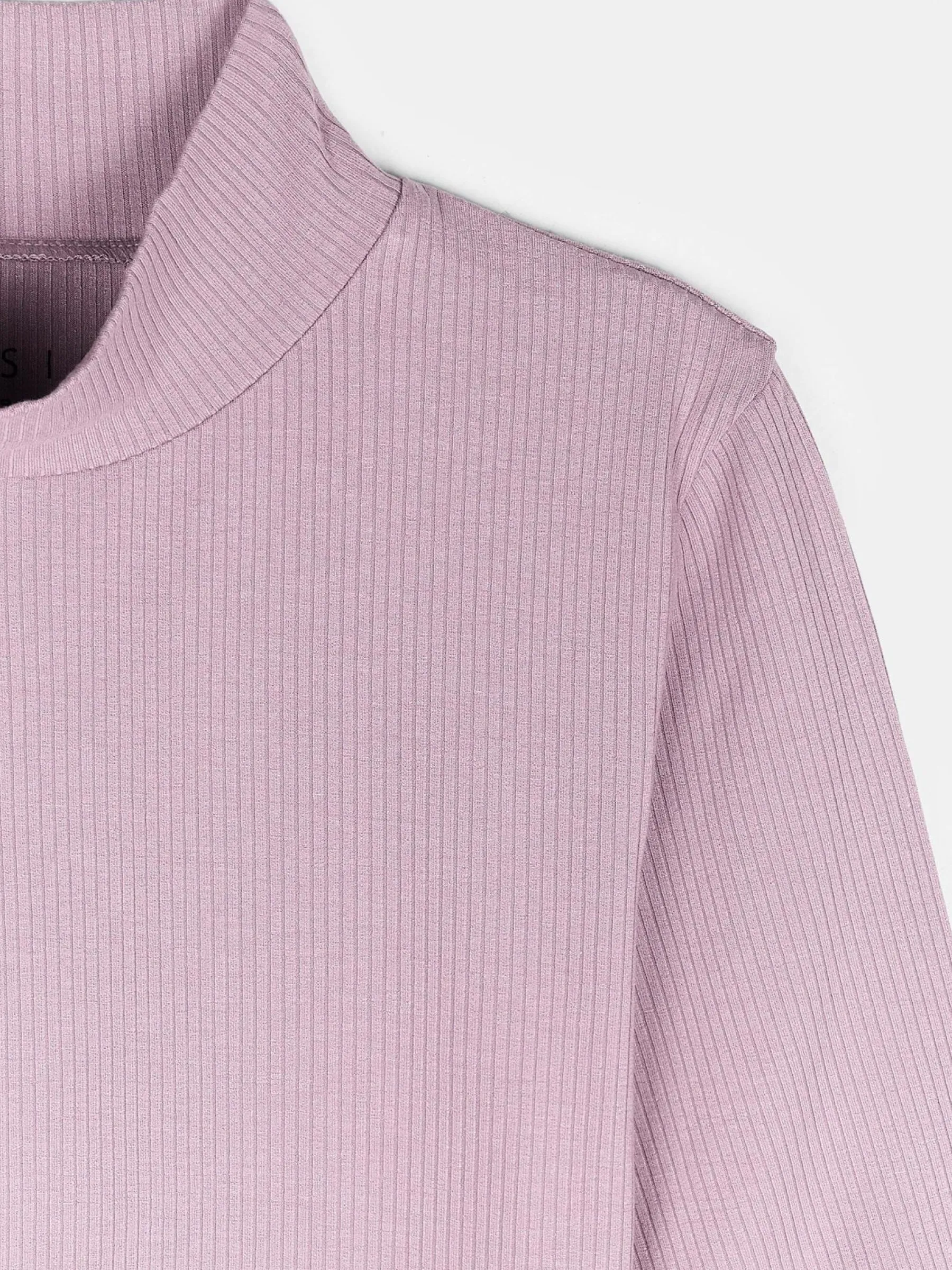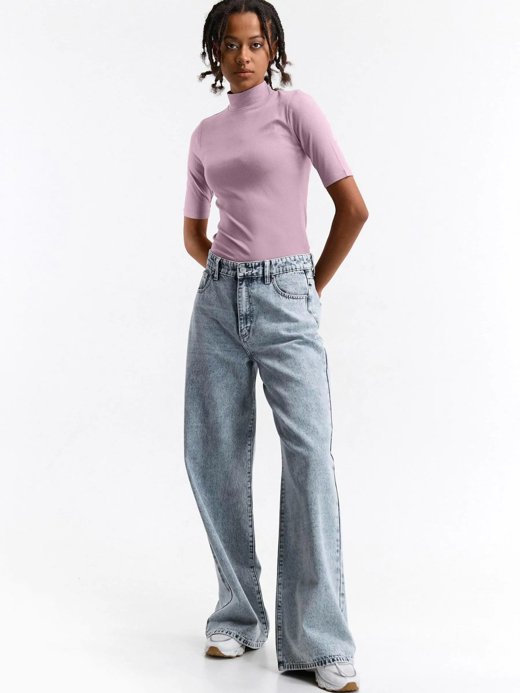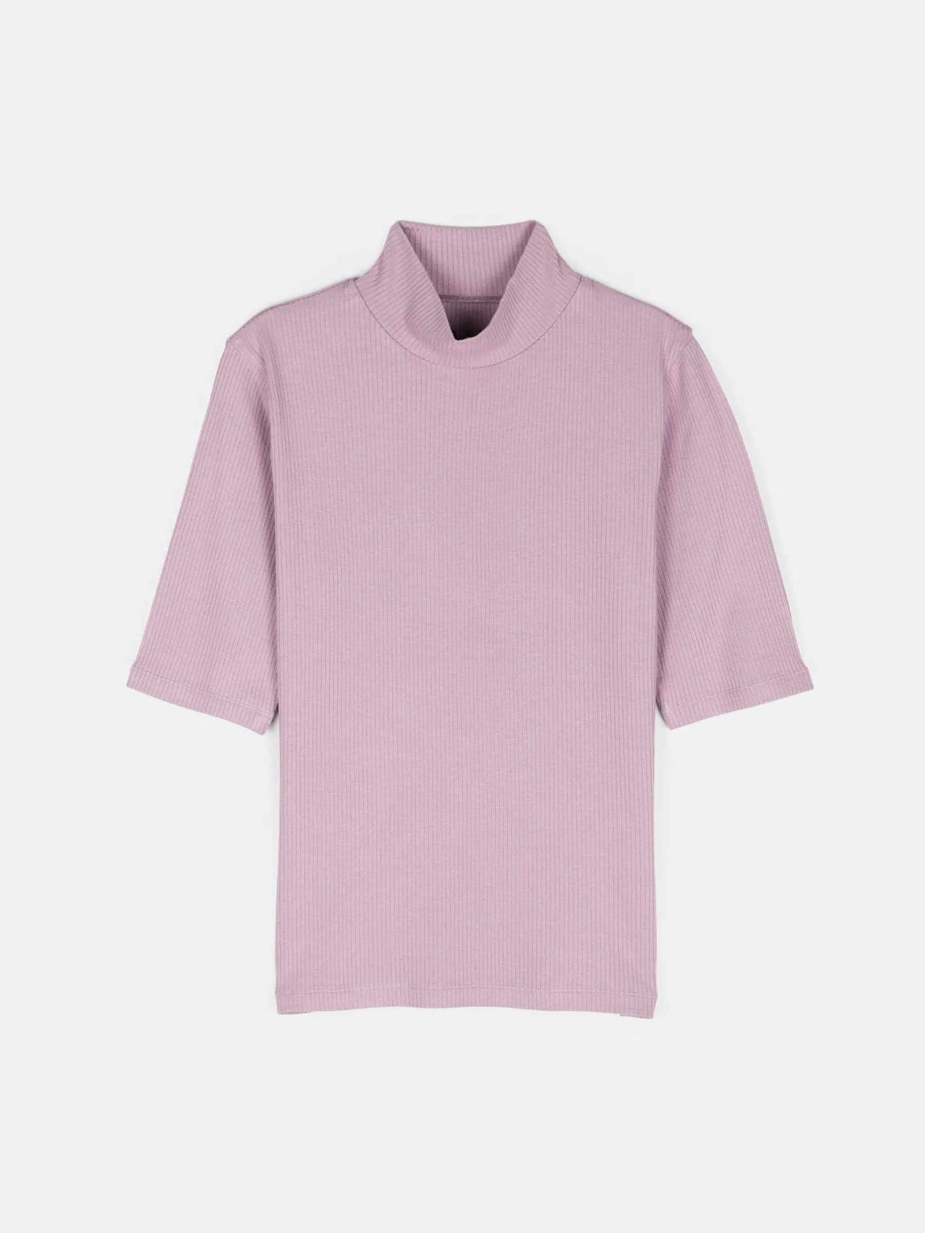 Kolor: purpurowyKrój: regularTyp: golf, topRekaw: rękaw 3/4Długość: krótkiPattern style: pojedynczy kolor, żebrow…