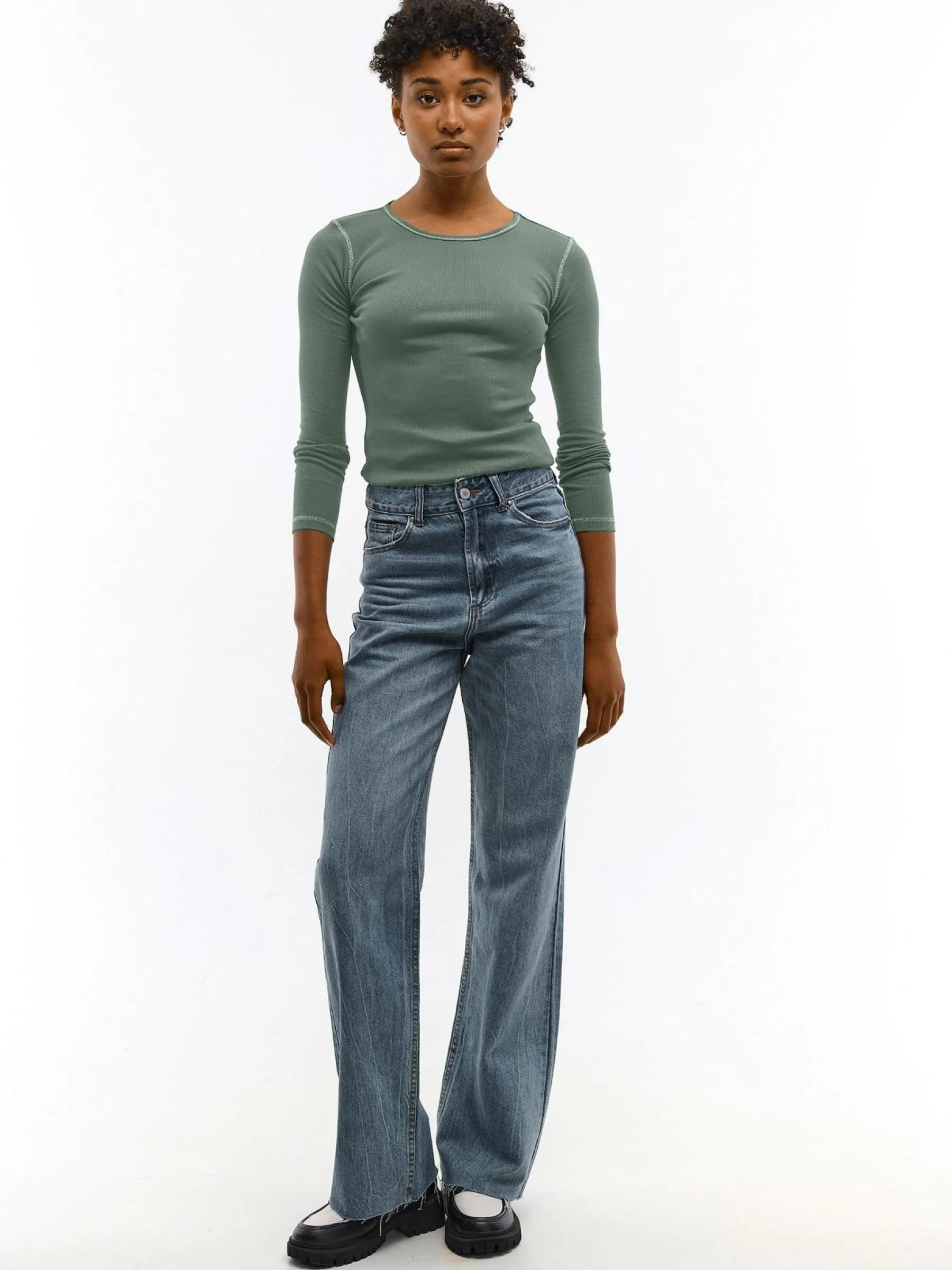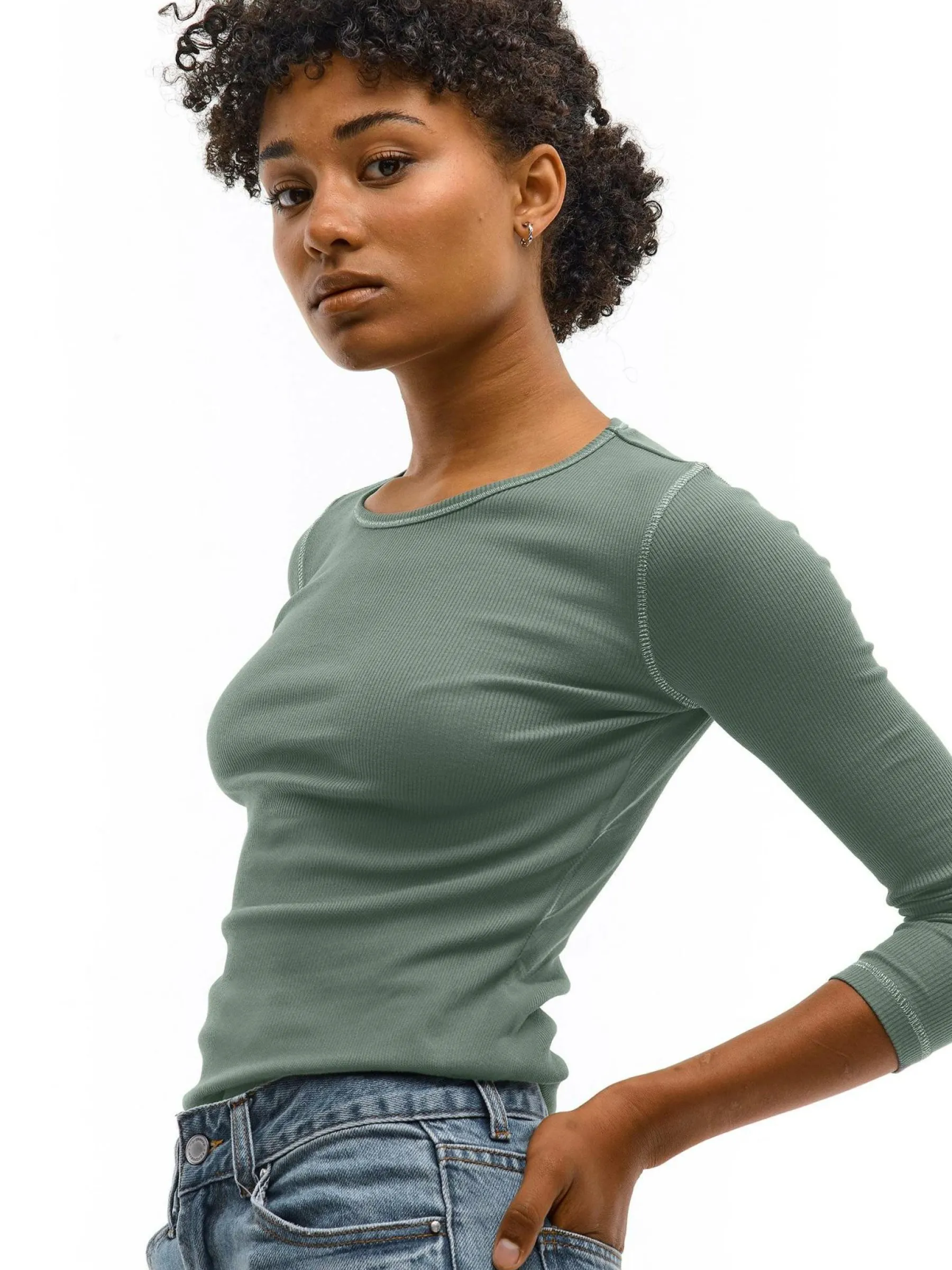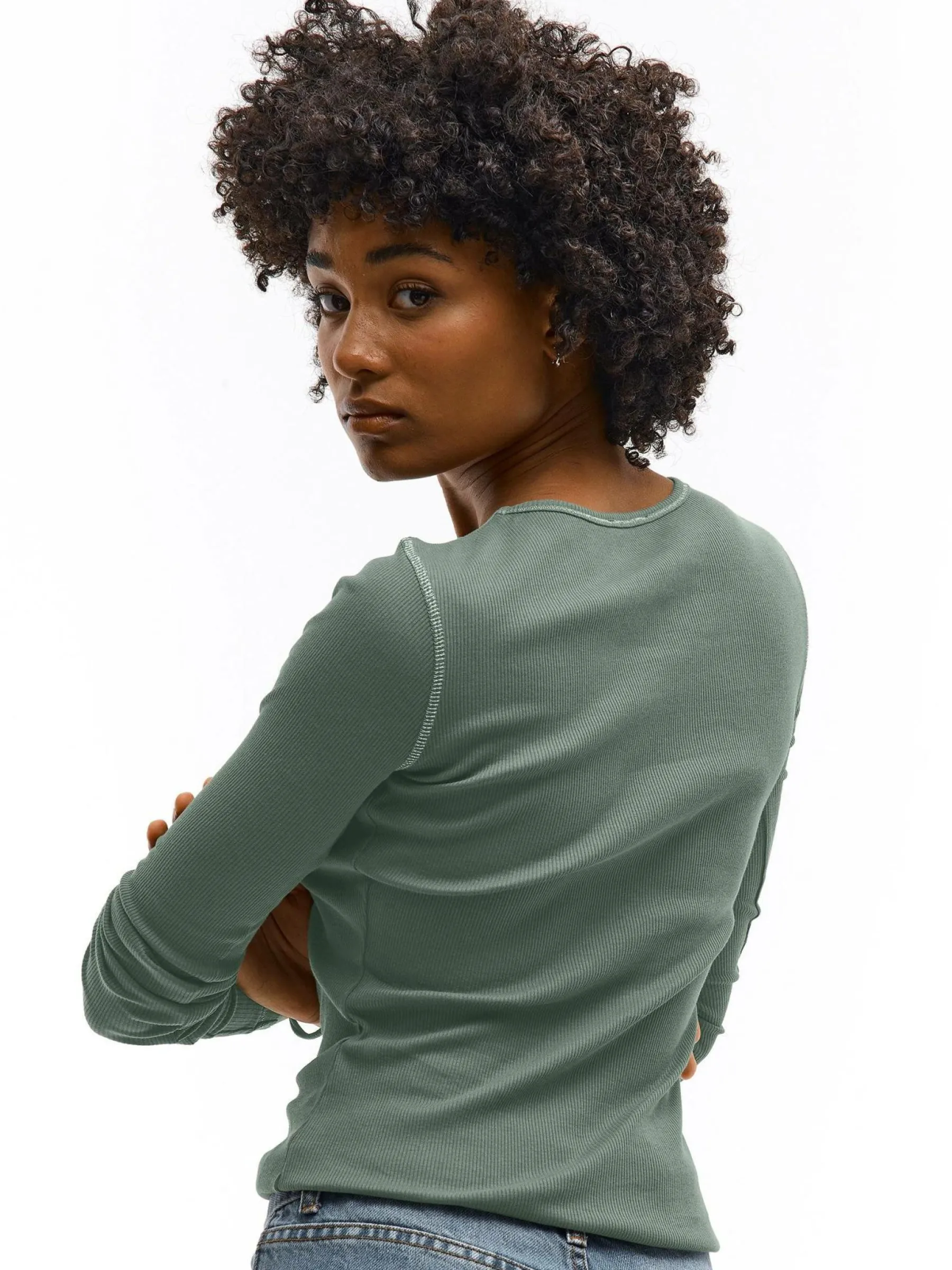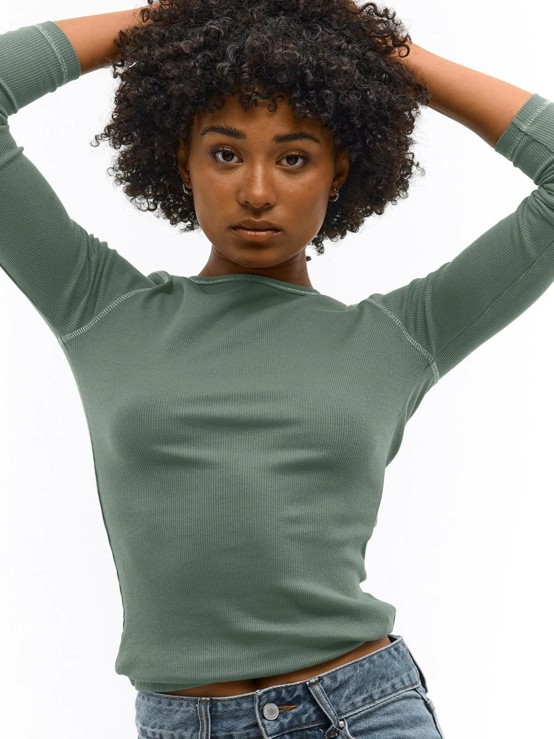 Kolor: zielonyKrój: regularTyp: topRekaw: długi rękawDługość: krótkiPattern style: pojedynczy kolor, żebrowany, …