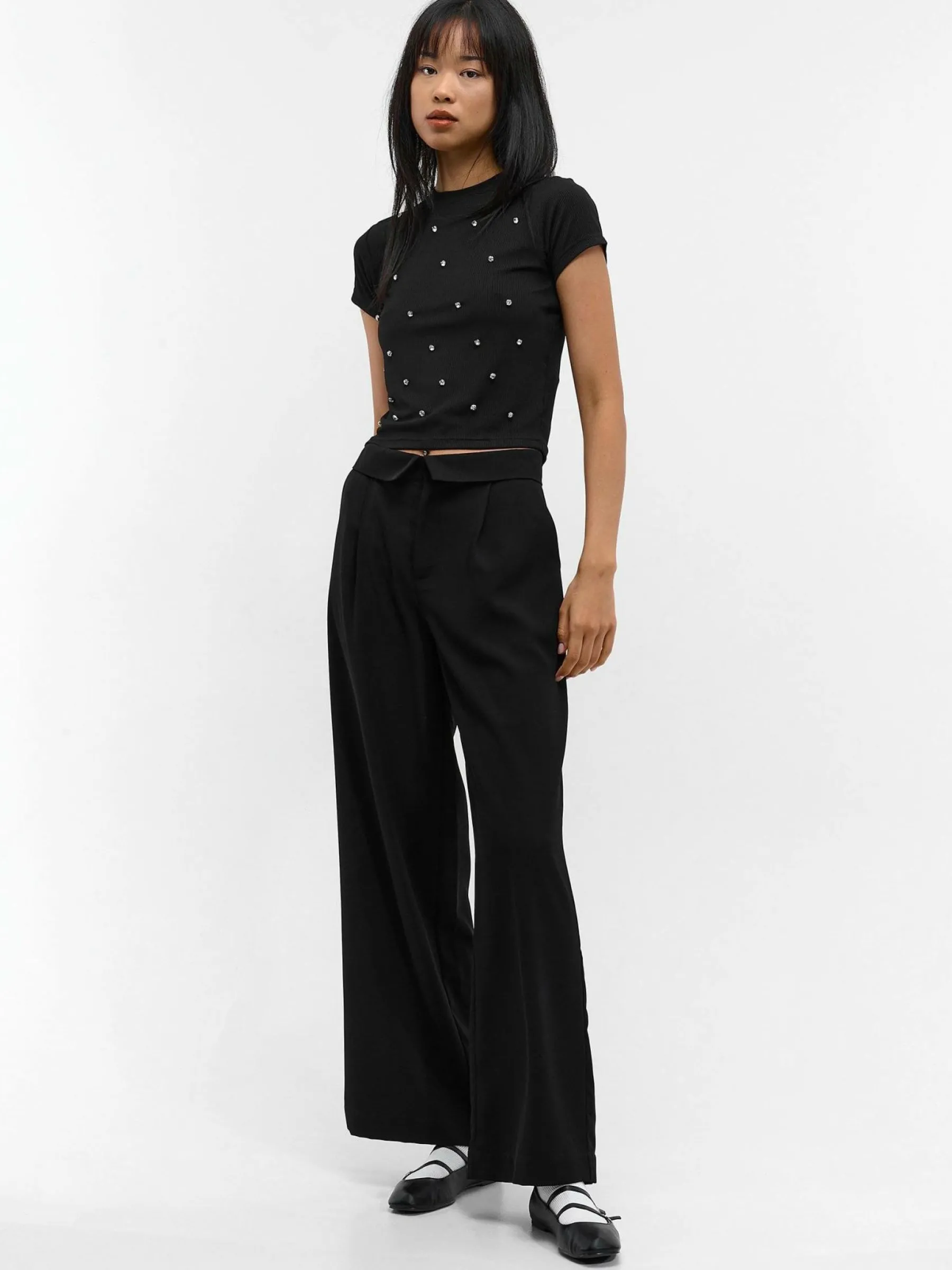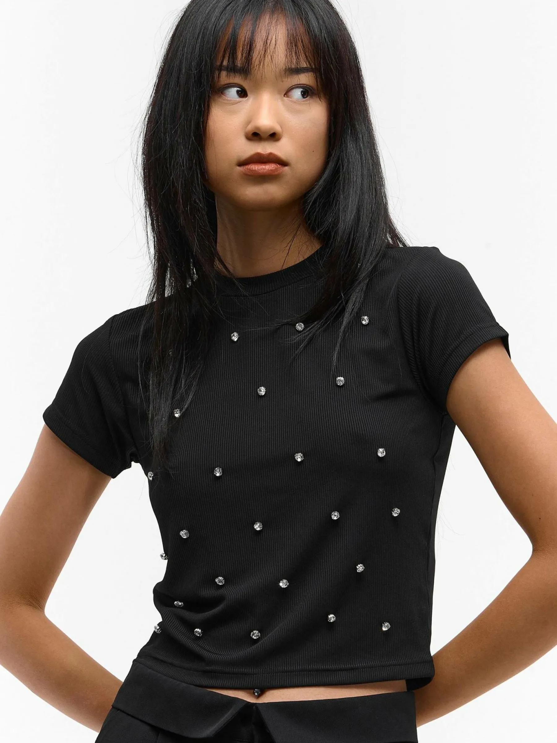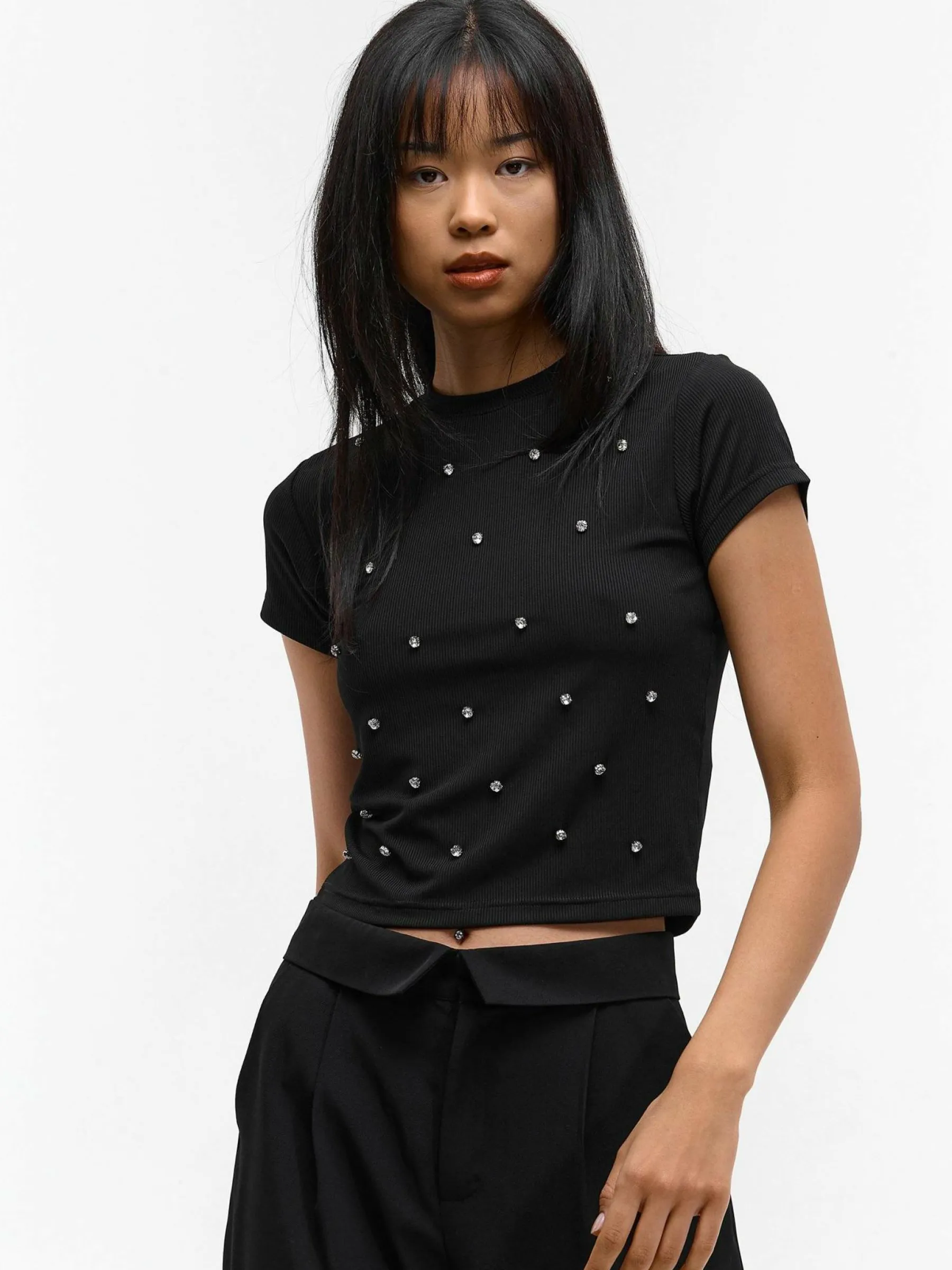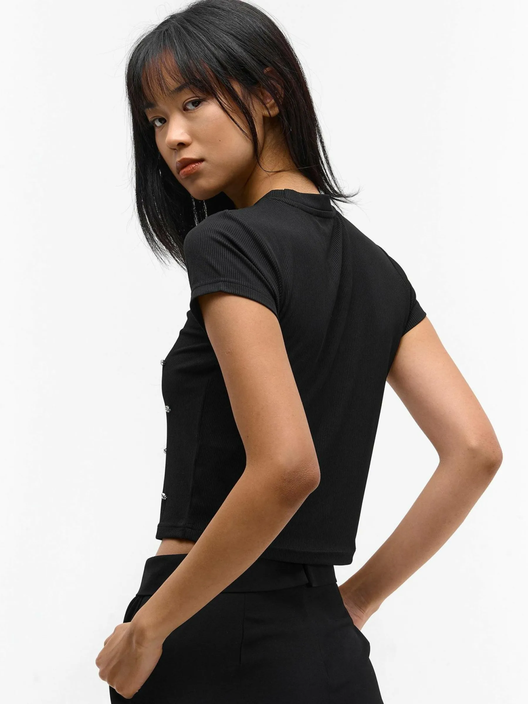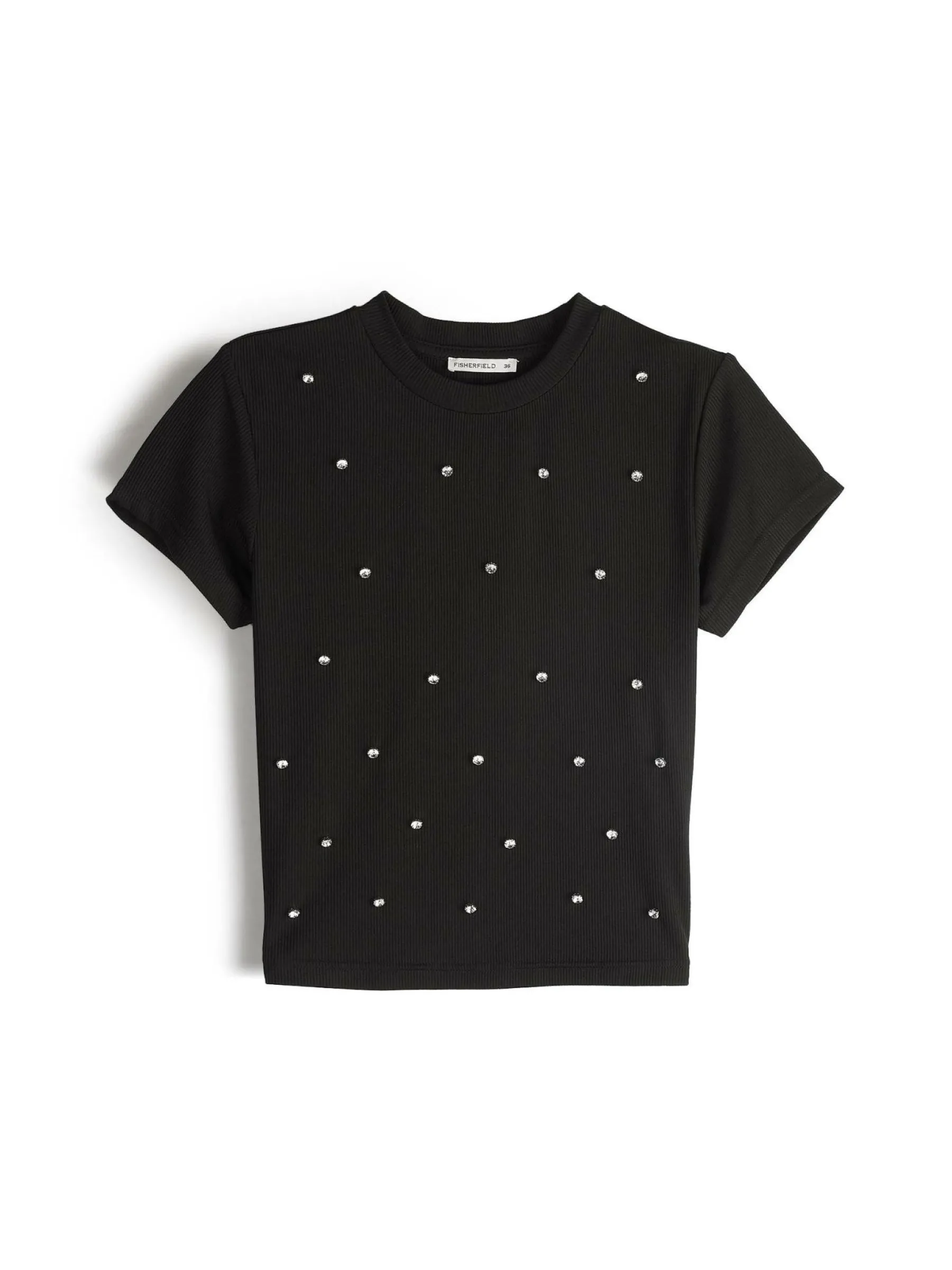 Kolor: czarnyKrój: regularTyp: topRekaw: krótki rękawDługość: krótkiPattern style: pojedynczy kolor, żebrowanyDe…