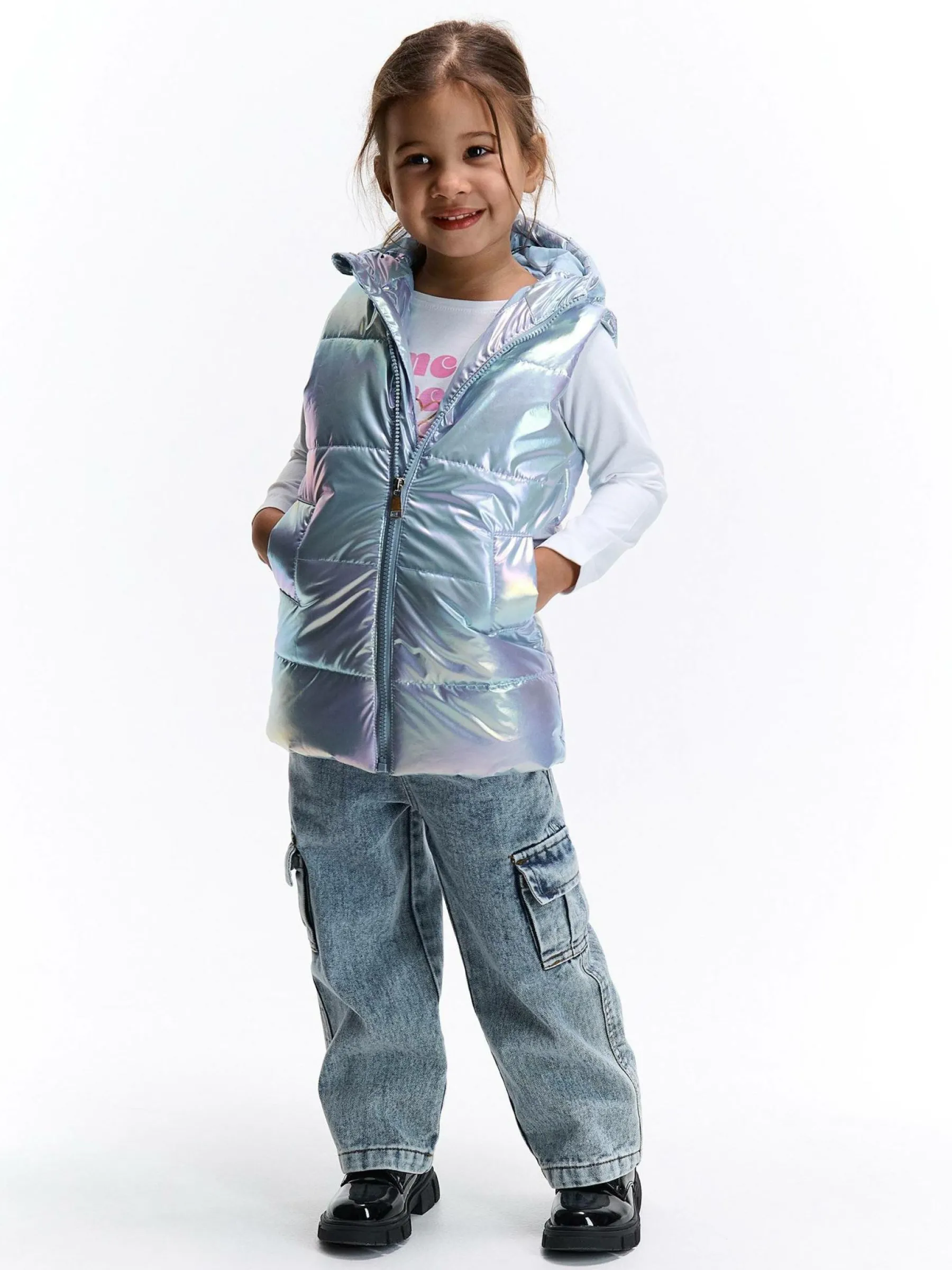 Kolor: niebieskiKrój: pikowaneTyp: kamizelkaRekaw: bez rękawówDługość: krótkiPattern style: pojedynczy kolorDetal…