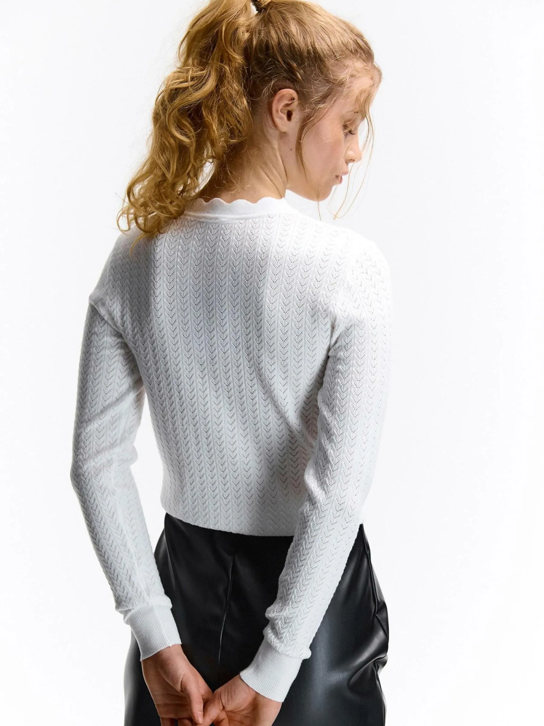 Kolor: białyKrój: regularTyp: swetryRekaw: długi rękawDługość: krótkiPattern style: pojedynczy kolor, strukturow…