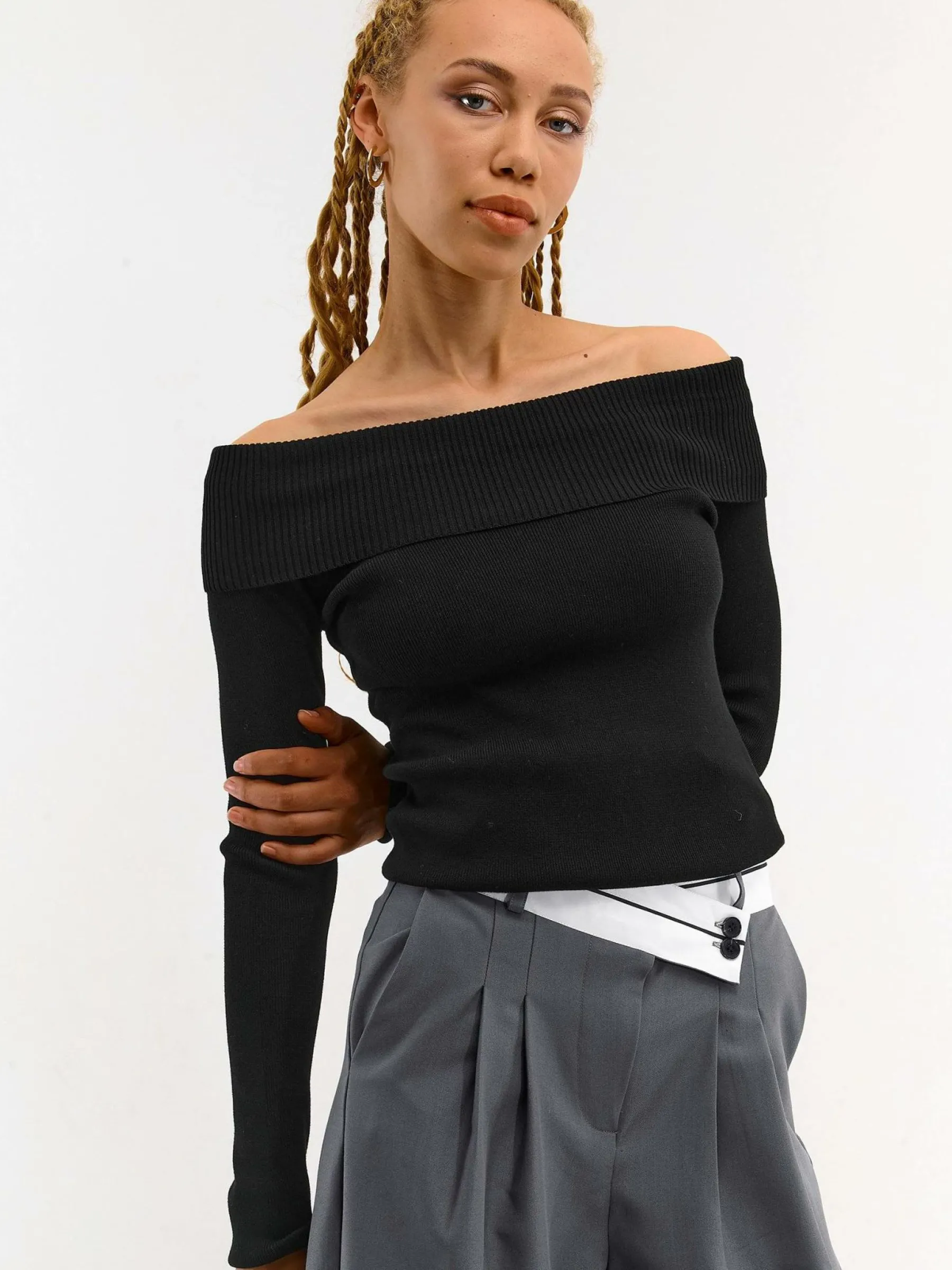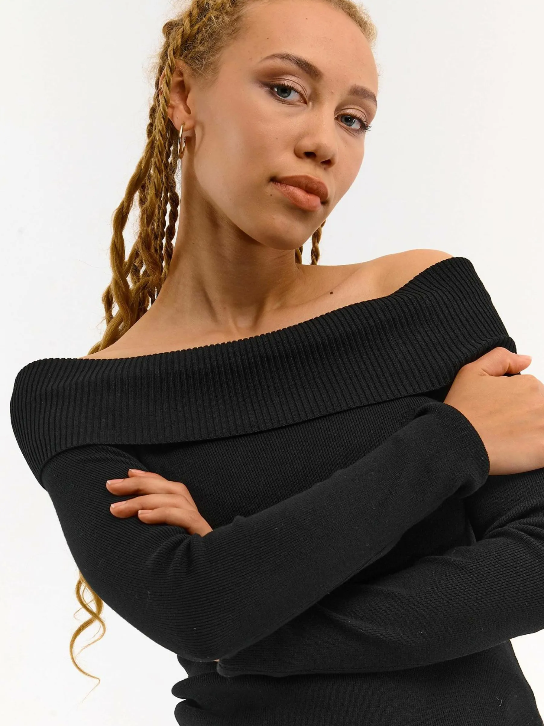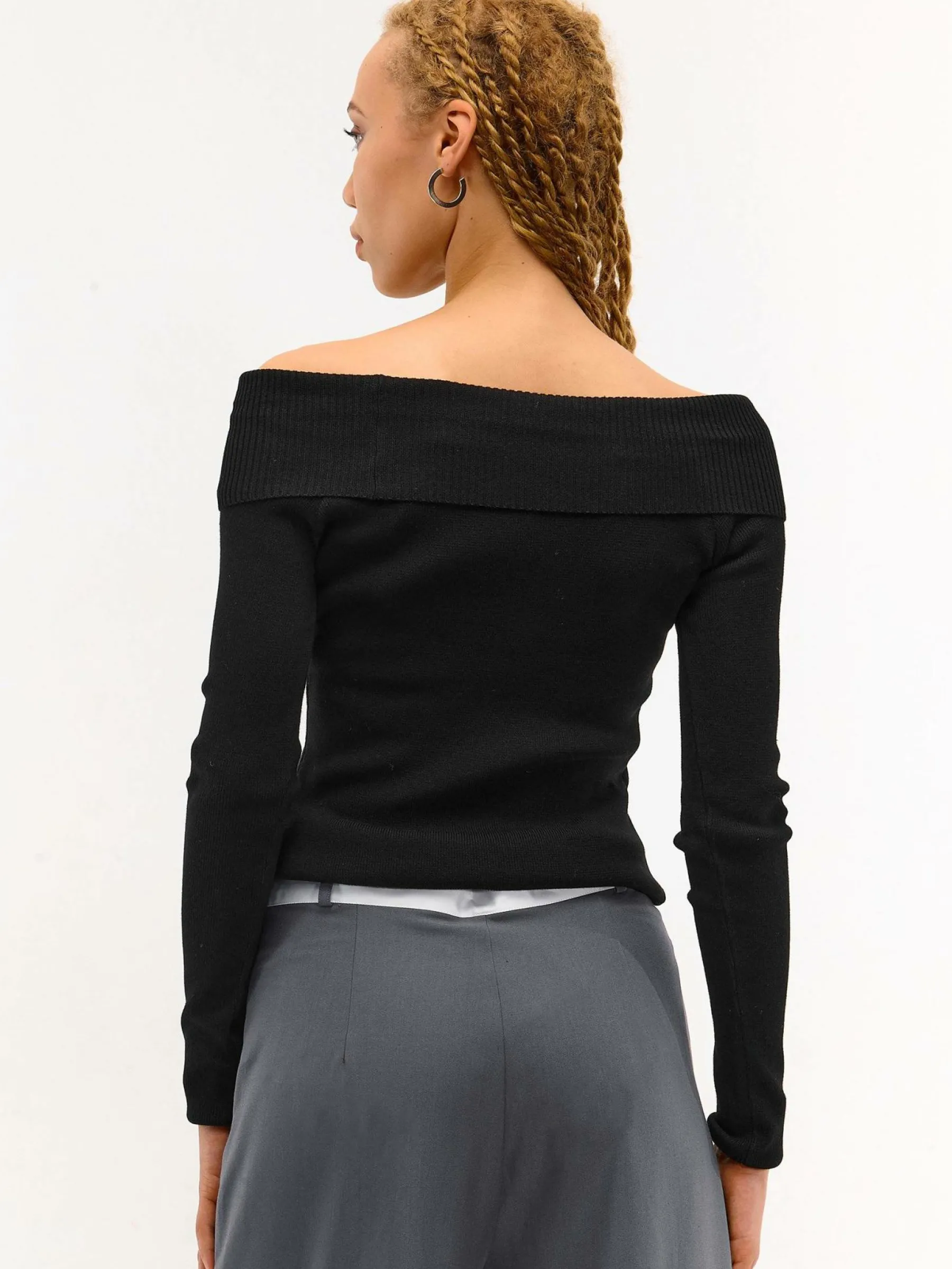 Kolor: czarnyKrój: z odkrytymi ramionamiTyp: swetryRekaw: długi rękawDługość: krótkiPattern style: pojedynczy kol…