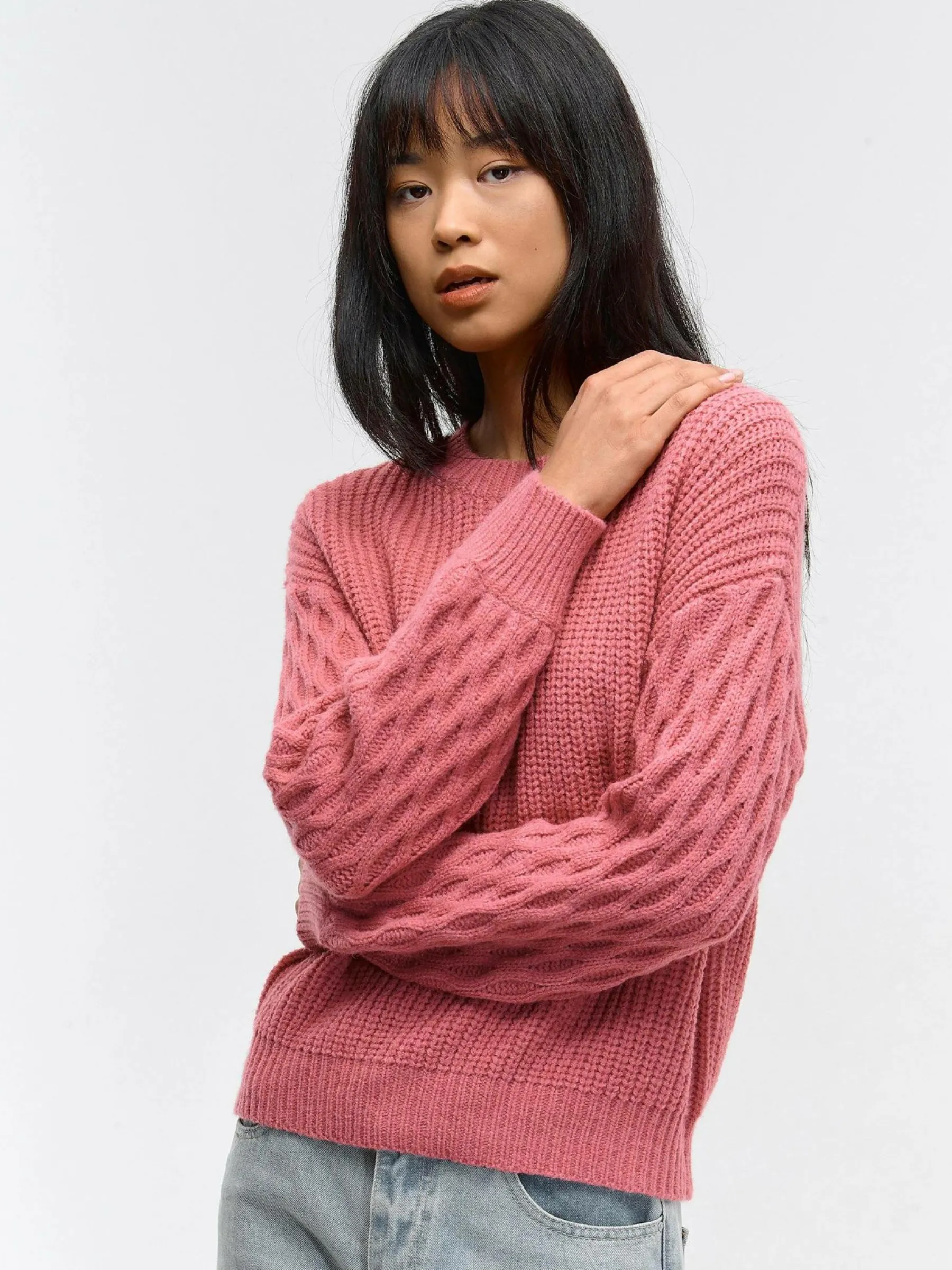 Kolor: różowyKrój: regularTyp: swetryRekaw: długi rękawDługość: krótkiPattern style: pojedynczy kolor, struktur…