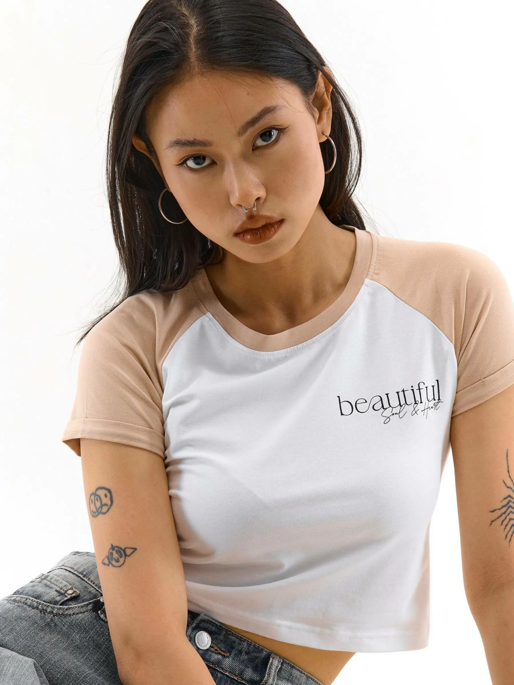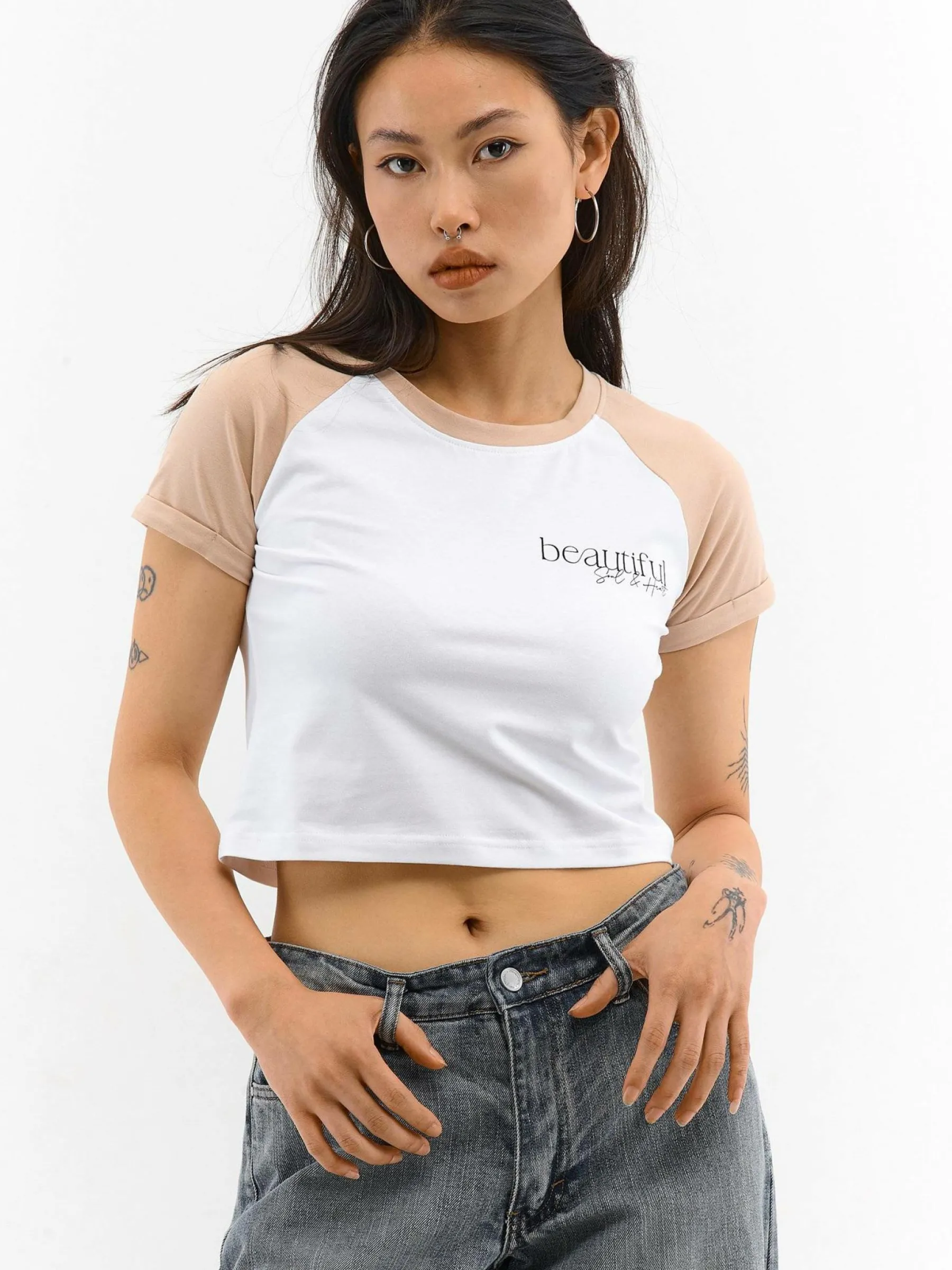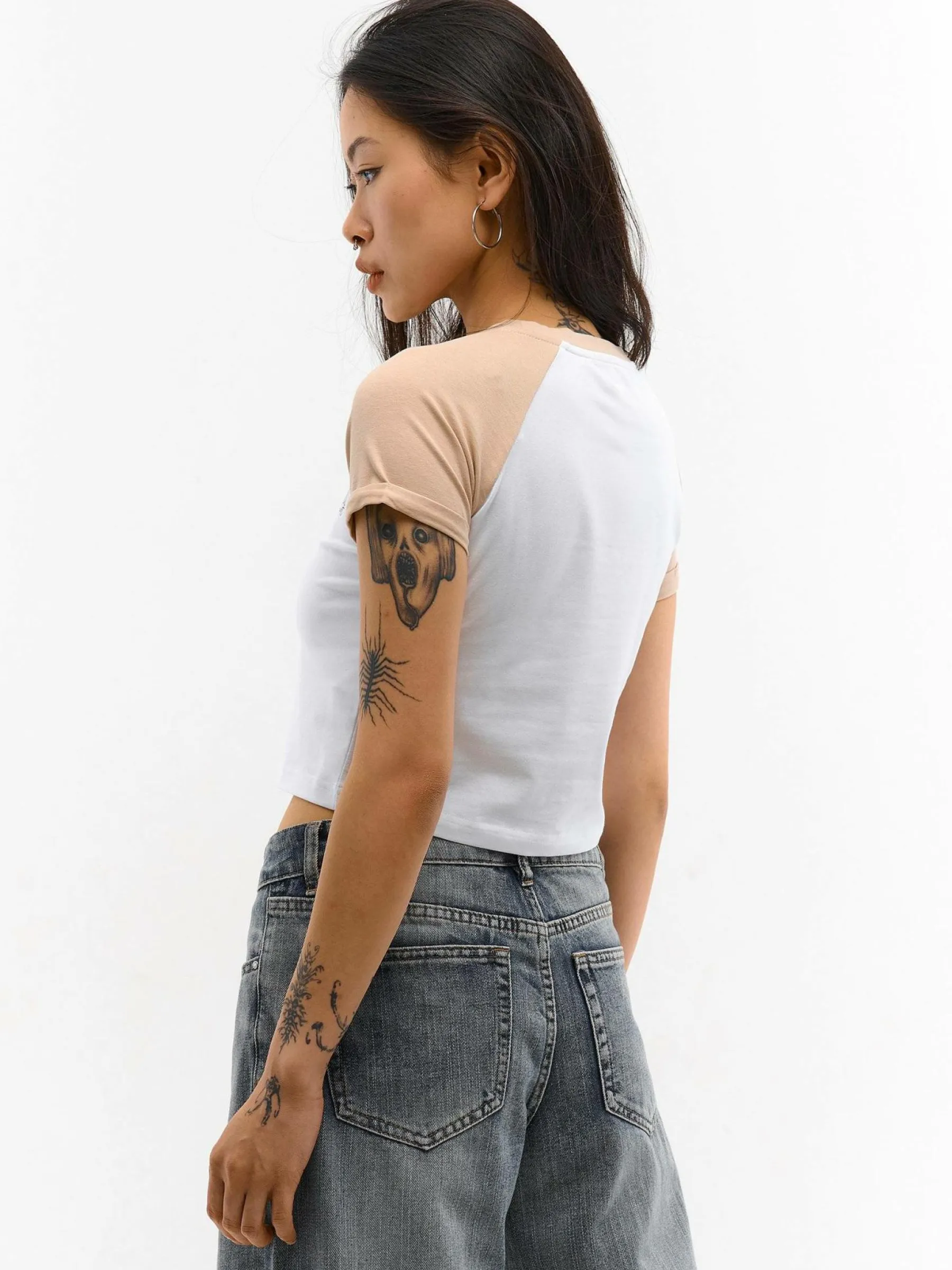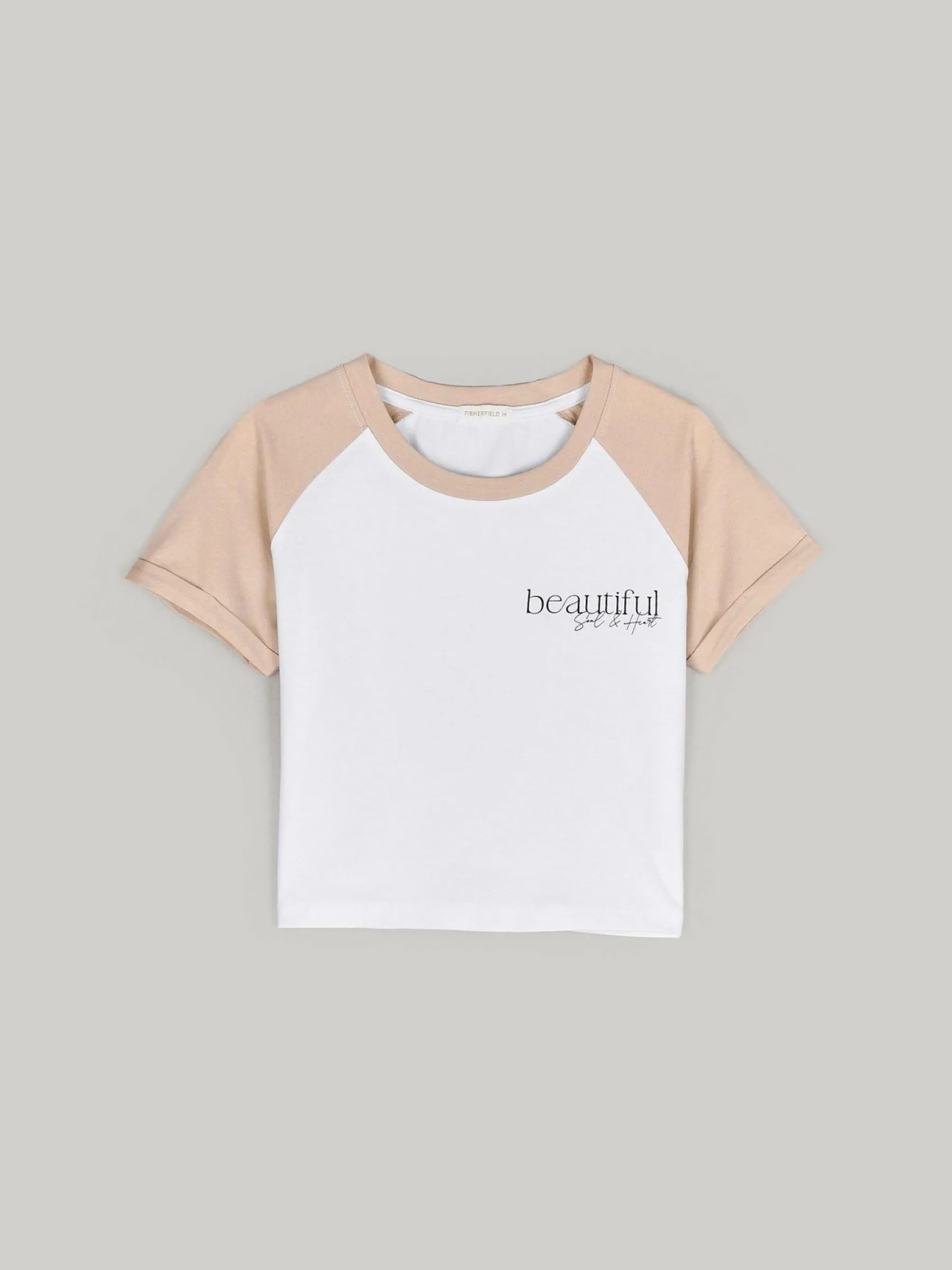 Kolor: białyKrój: regularTyp: koszulkaRekaw: krótki rękaw, rękaw raglanowyDługość: krótki topPattern style: z n…