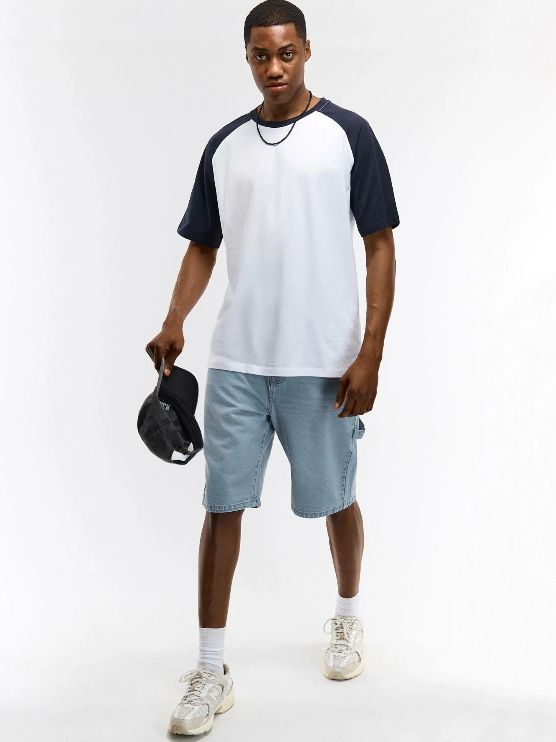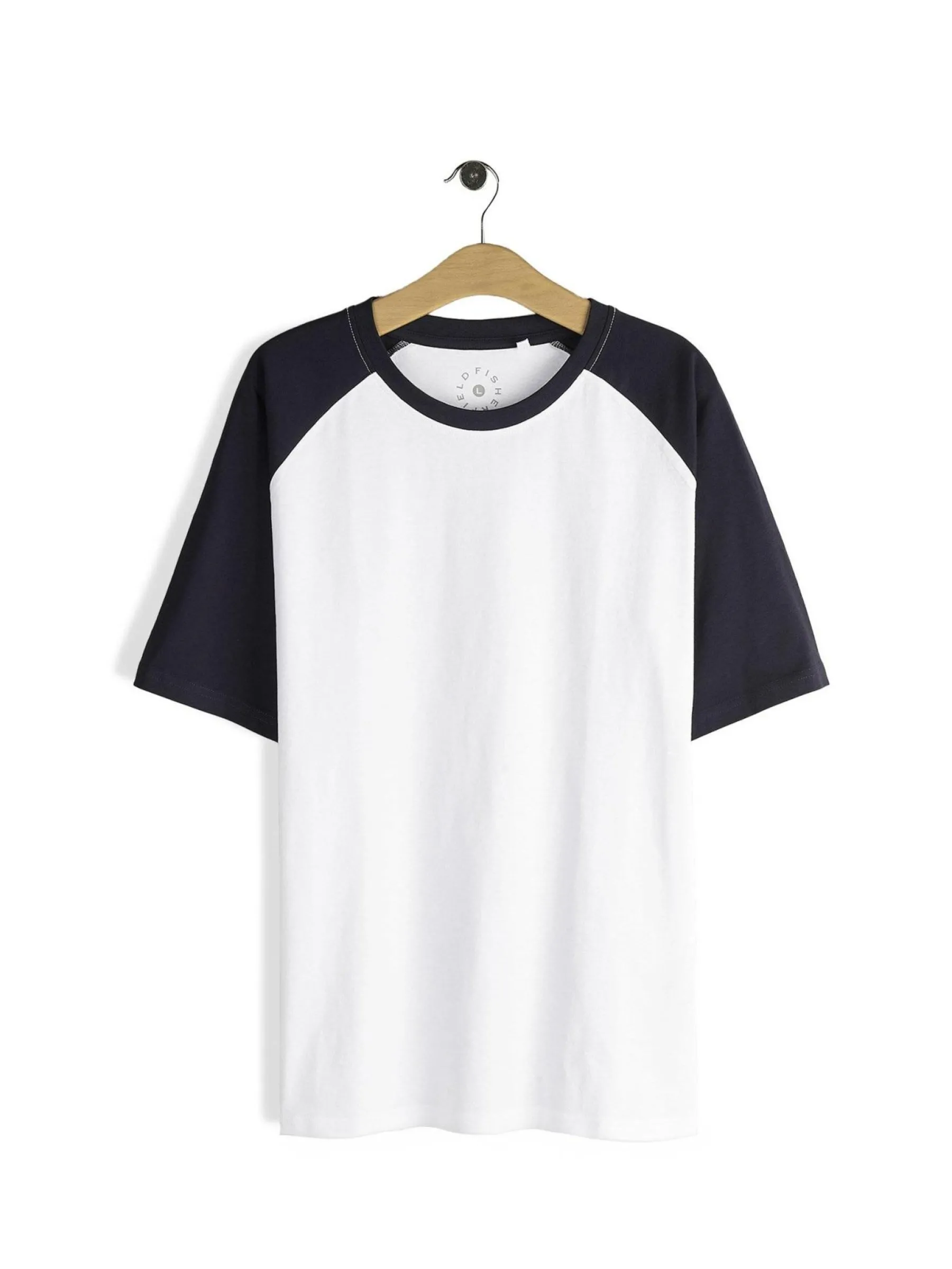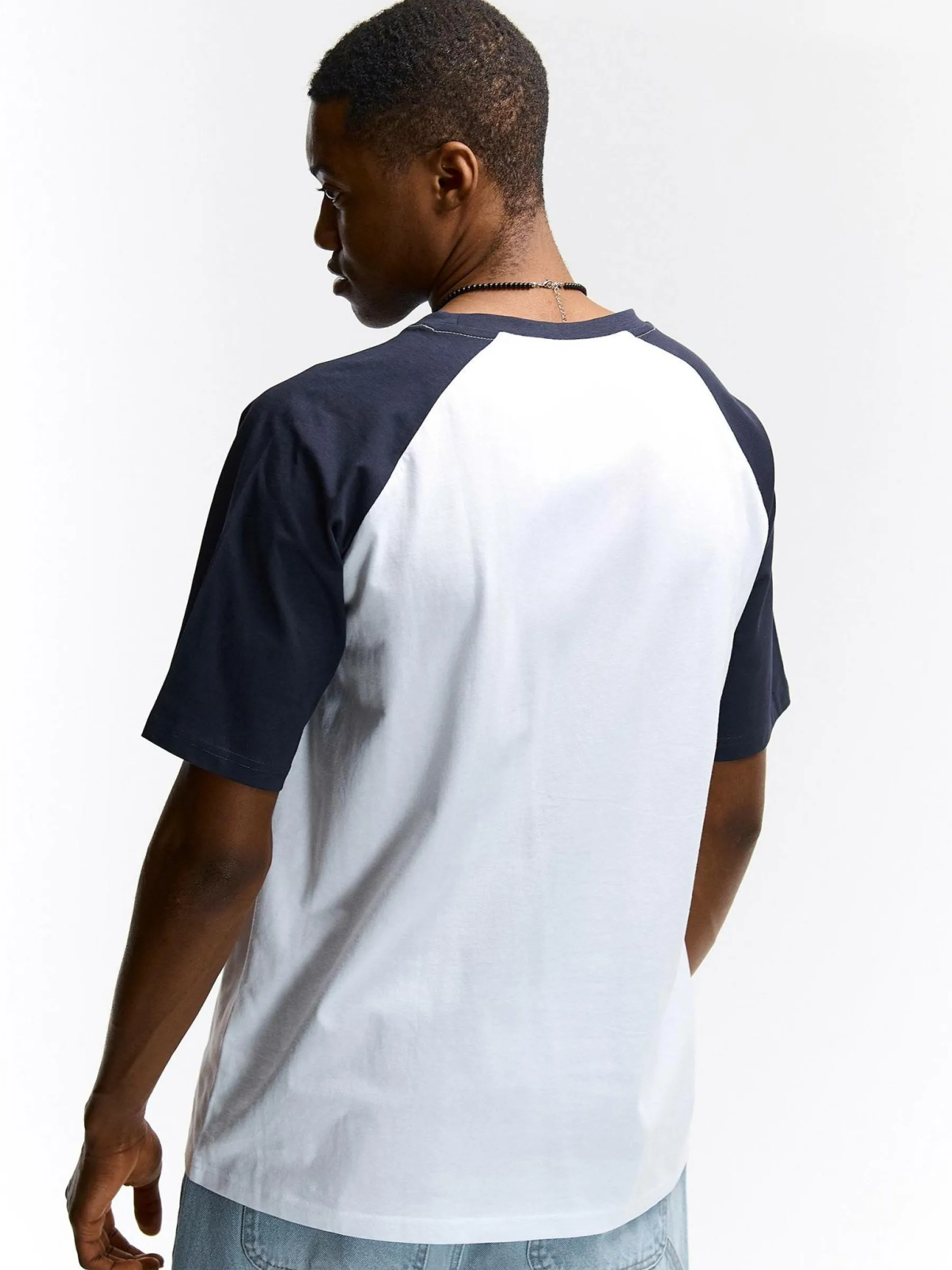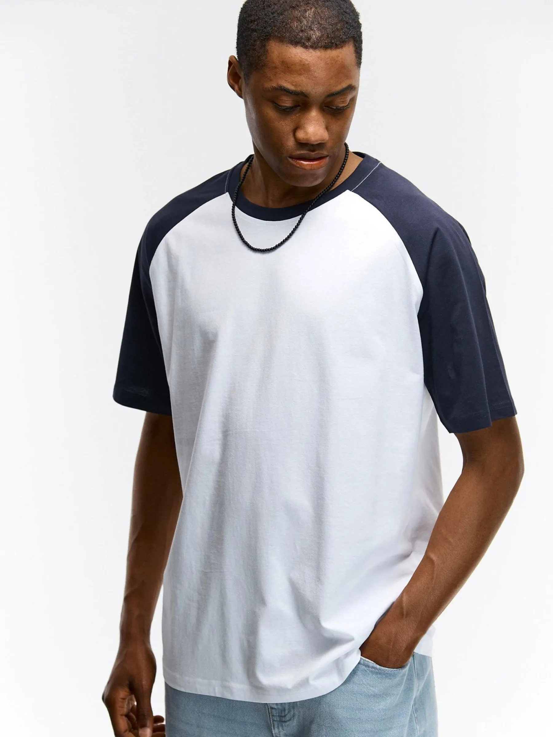 Kolor: granatowyKrój: regularTyp: koszulkaRekaw: krótki rękawPattern style: z kontrastowymi rękawamiDetal: nad głow…