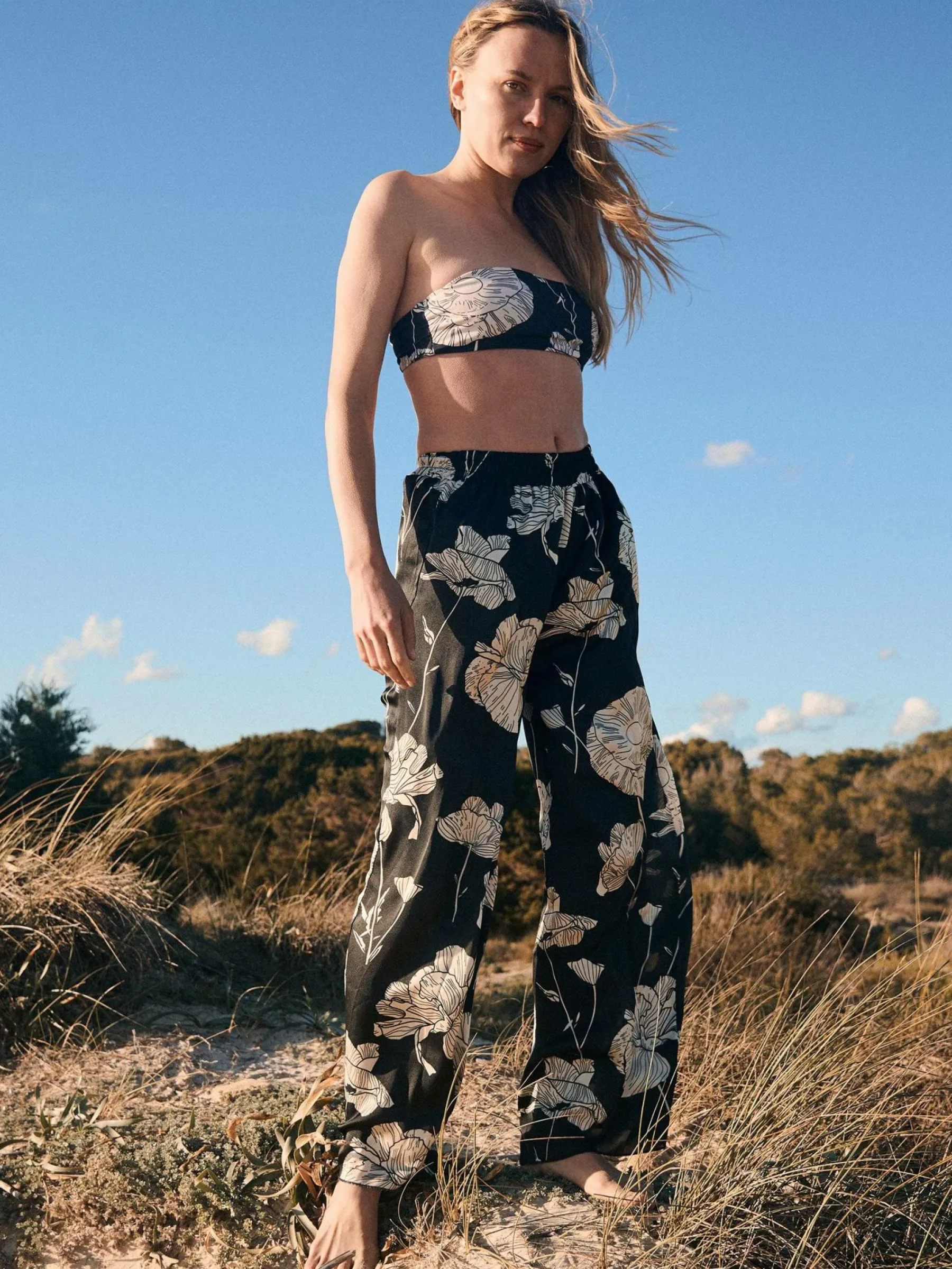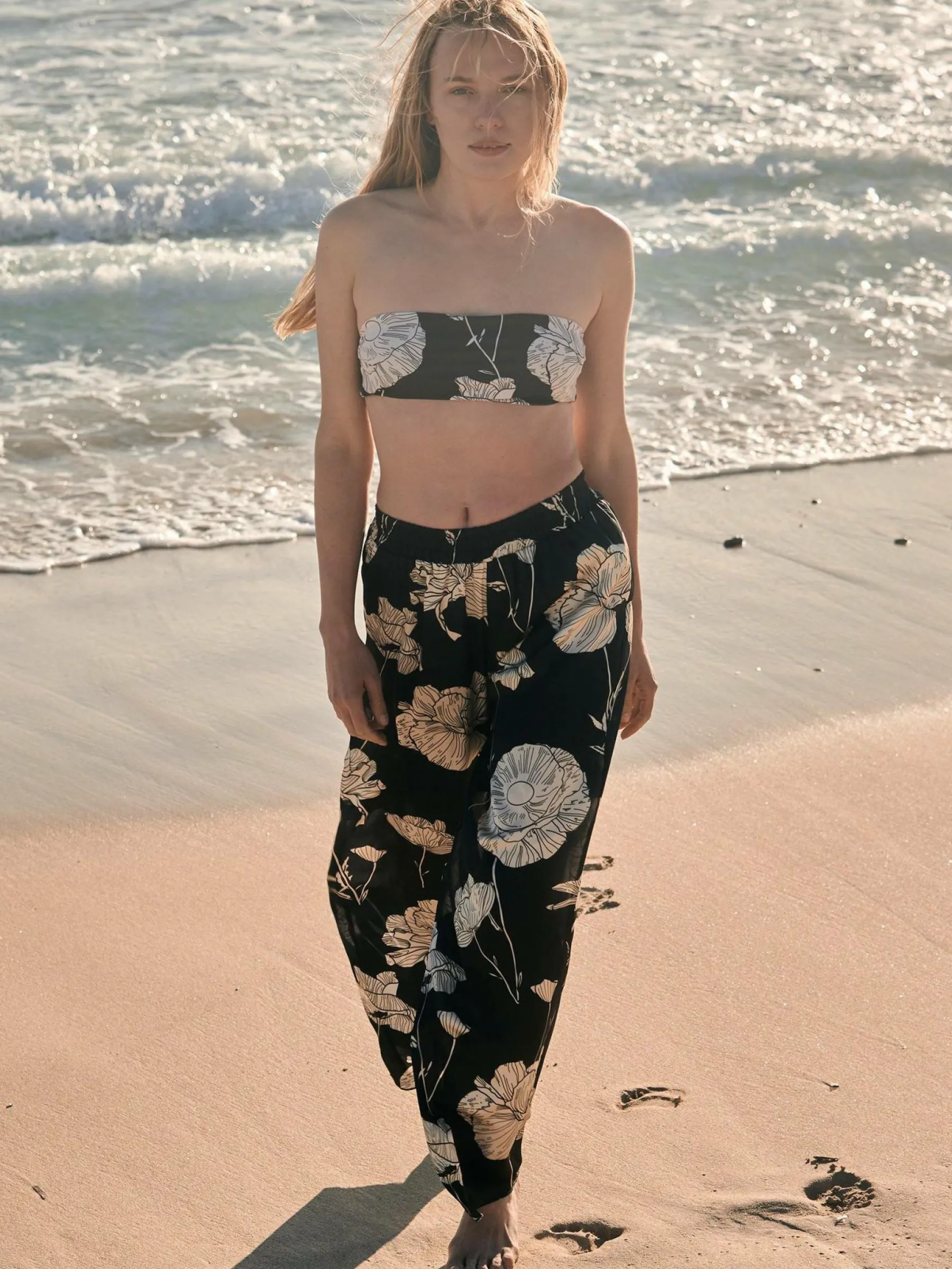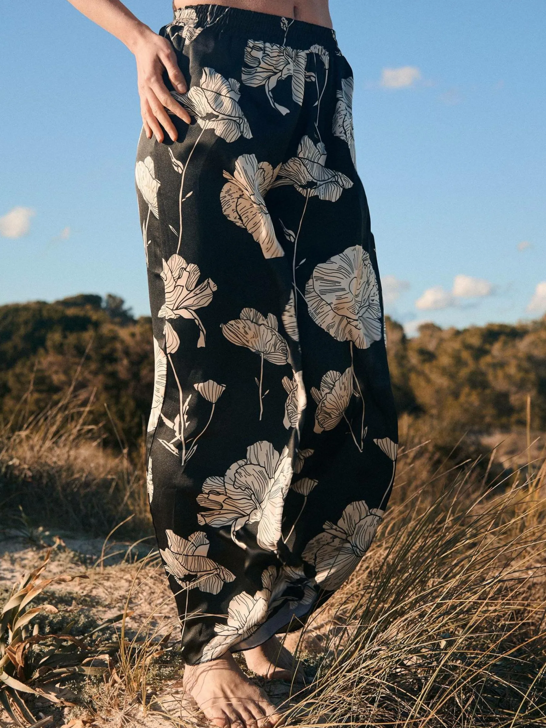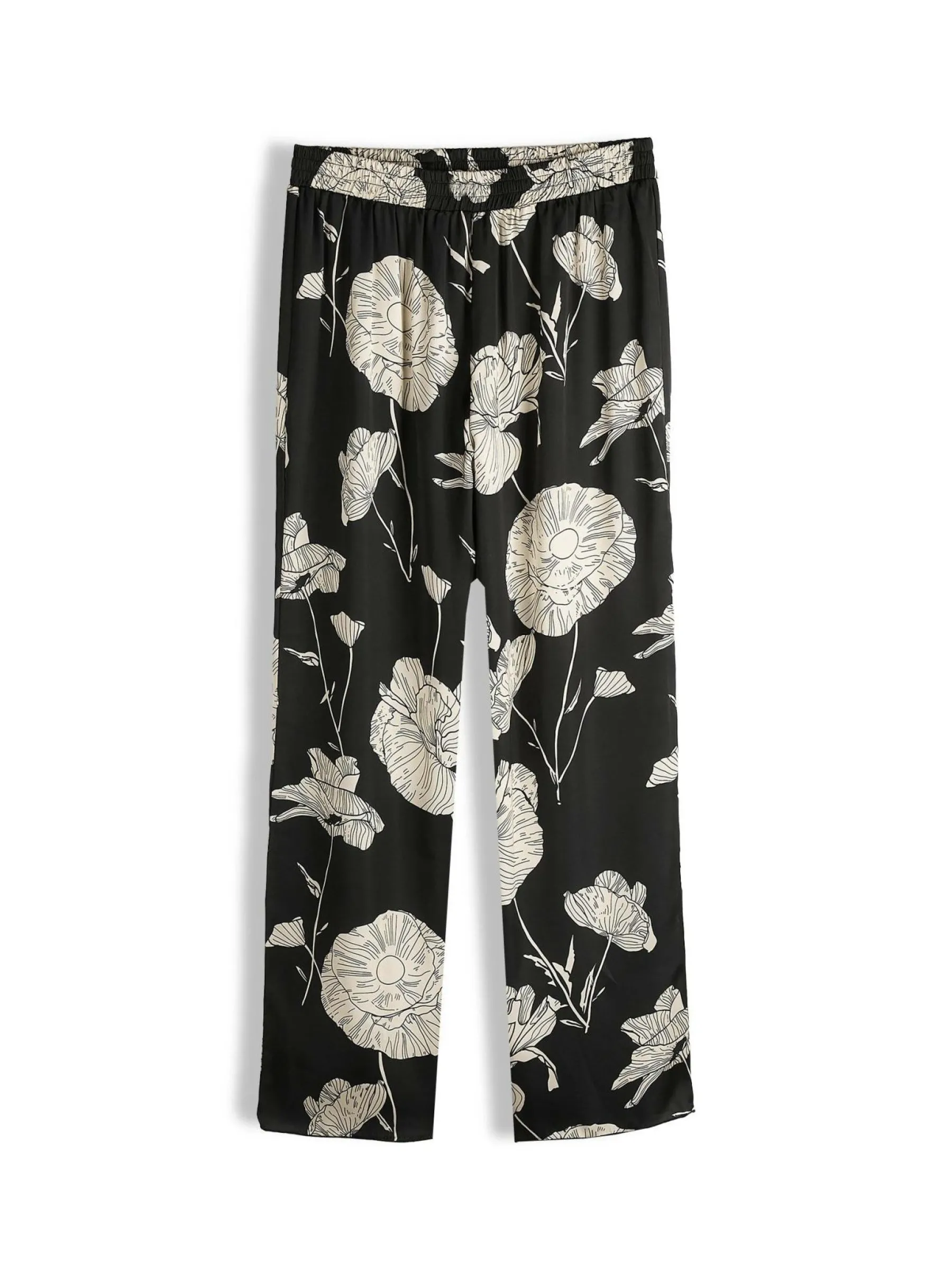 Kolor: czarnyKrój: szerokieTyp: spodnieDługość: dlugiePattern style: kwiatoweDetal: z elastyczną opaskąMateriał: …