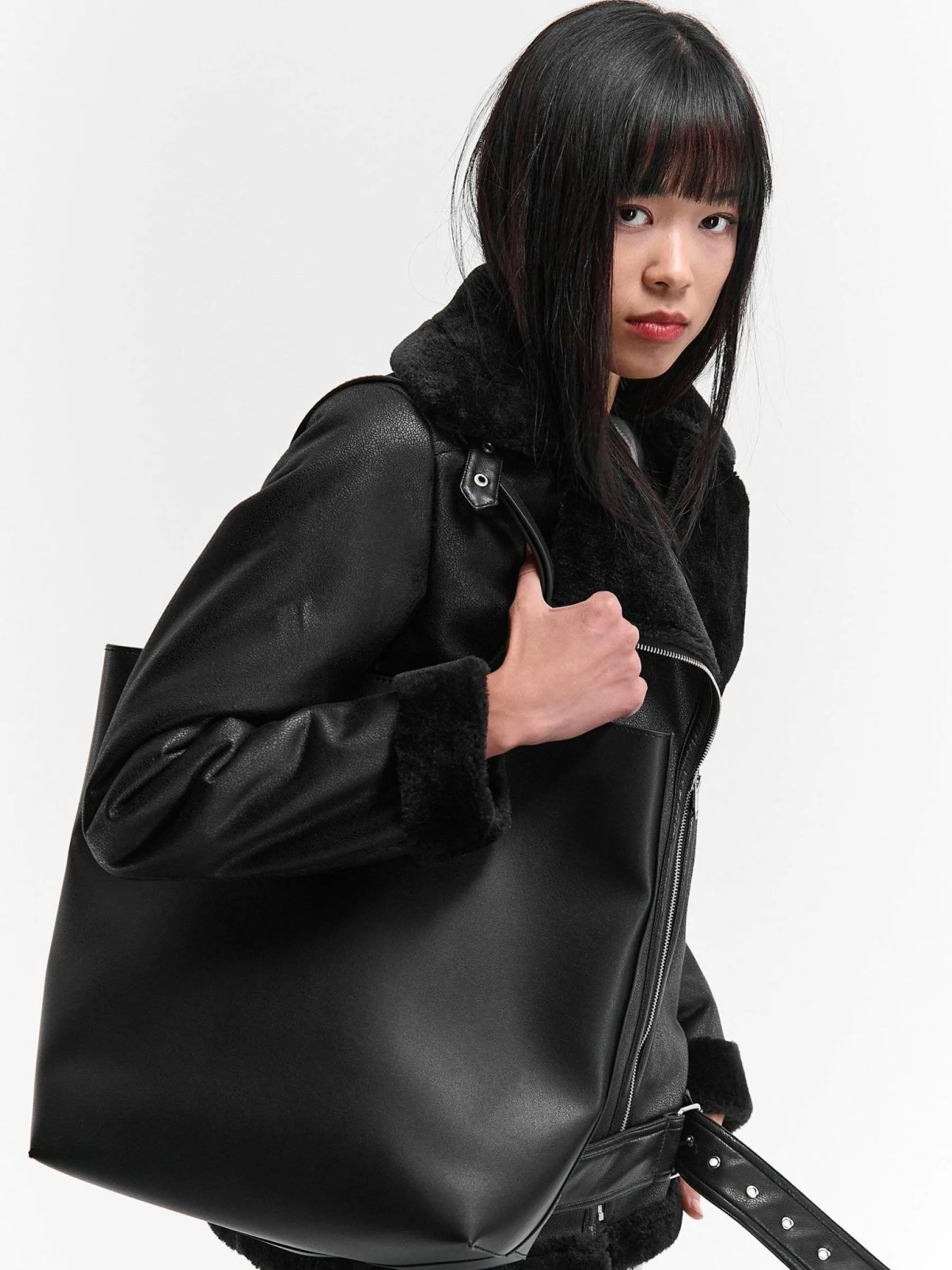 Kolor: czarnyKrój: shopperTyp: torebkaPattern style: pojedynczy kolorDetal: na zamekMateriał: sztuczna skóraPłeć: k…