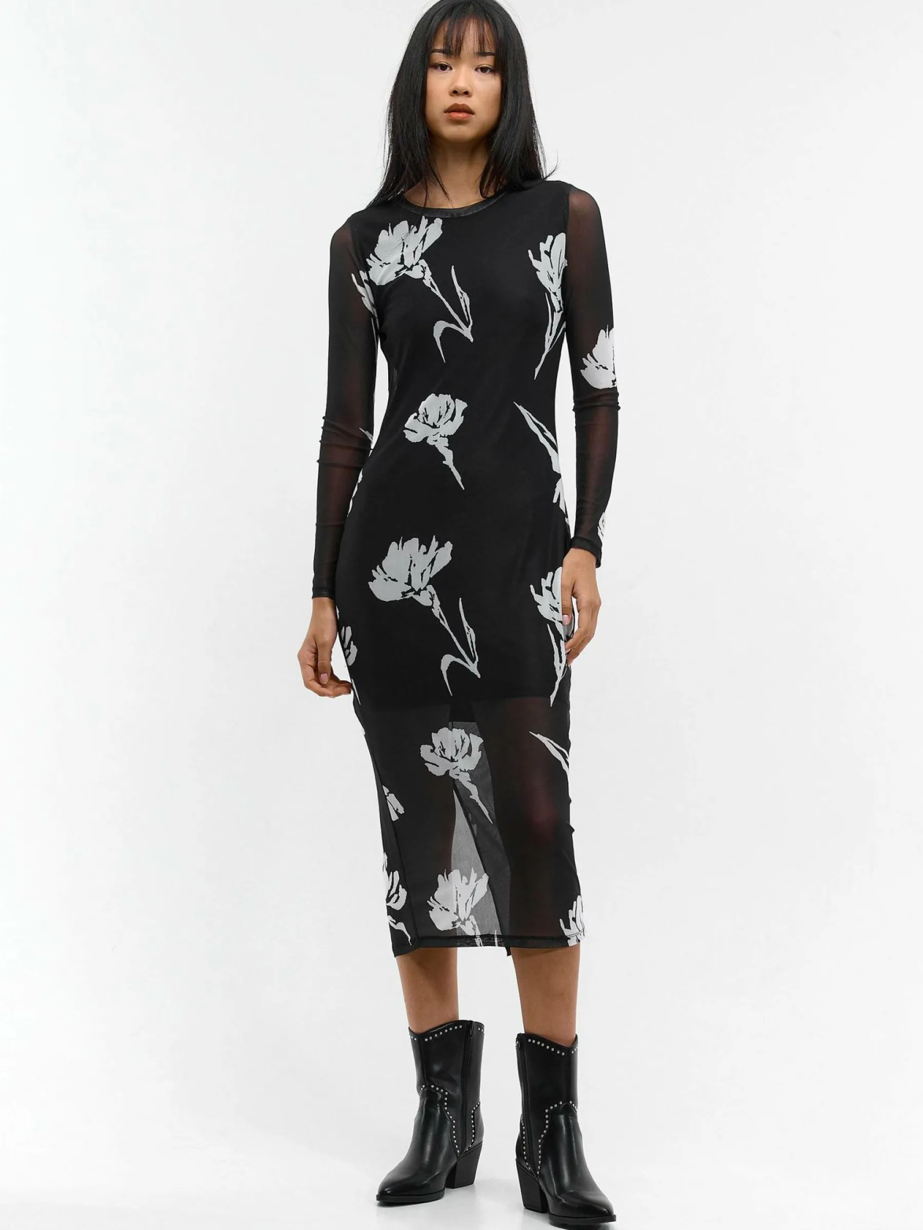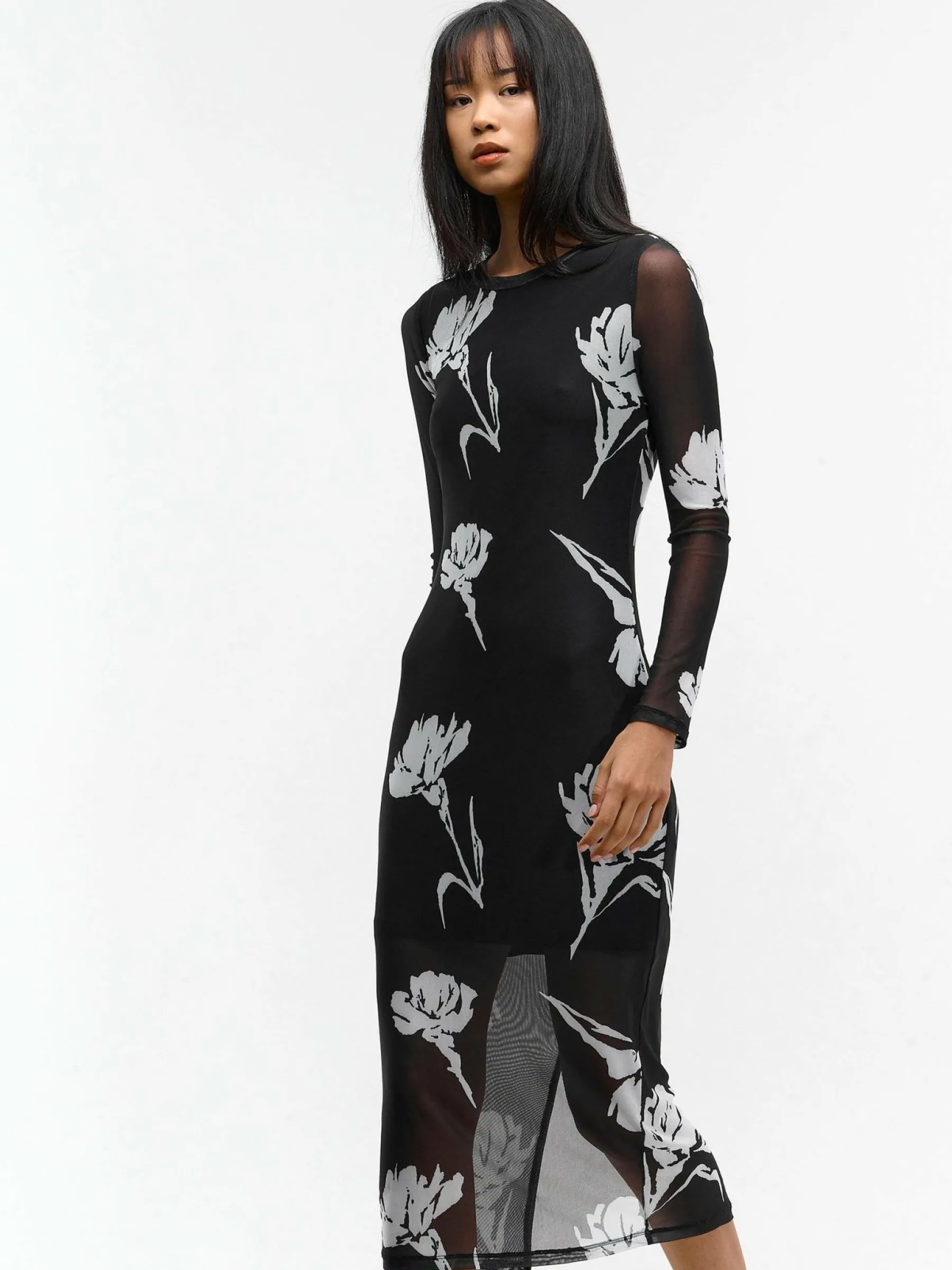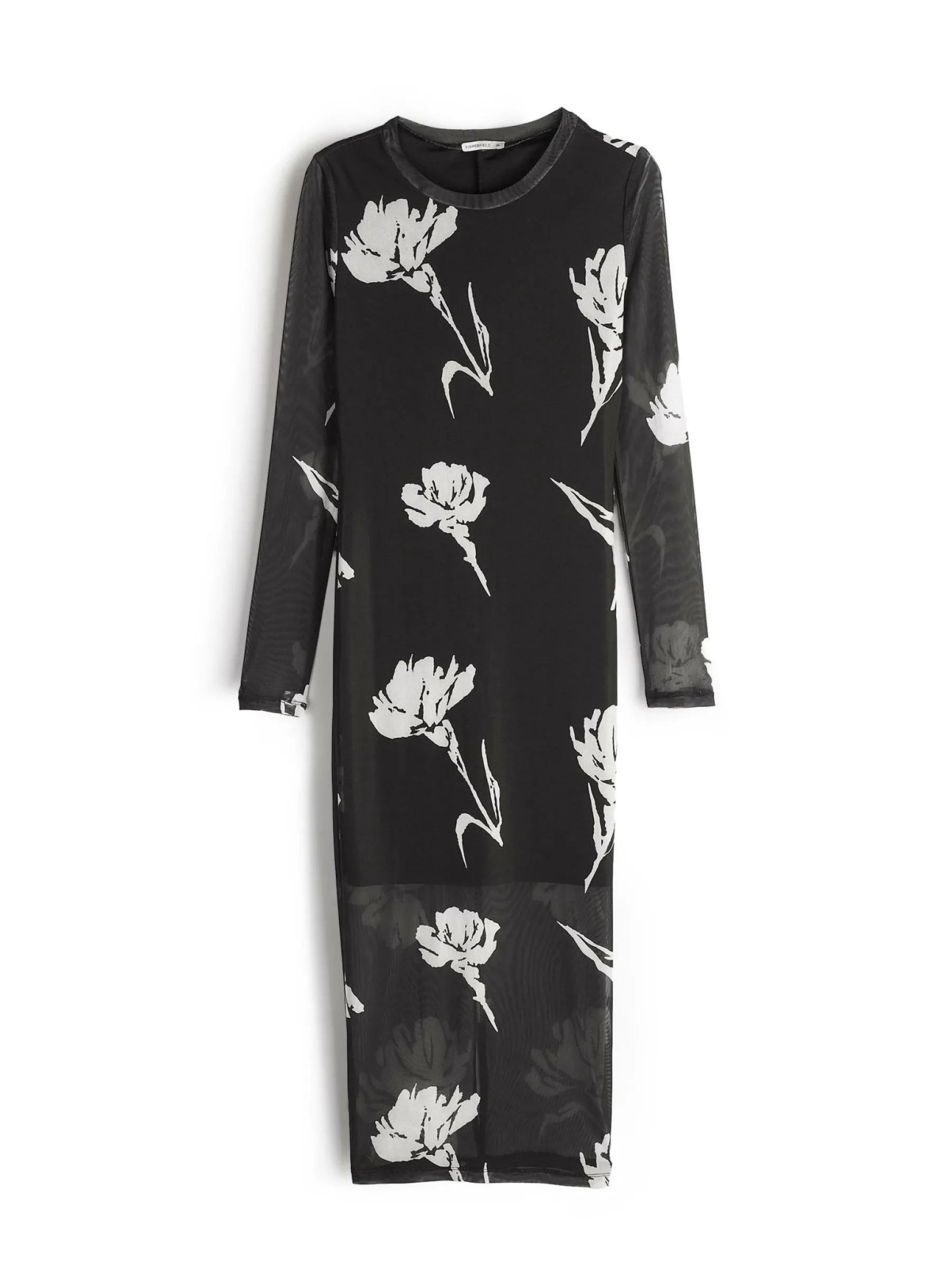 Kolor: czarnyKrój: regularTyp: sukienkaRekaw: długi rękawDługość: midiPattern style: kwiatowe, z nadrukiemDetal: z…