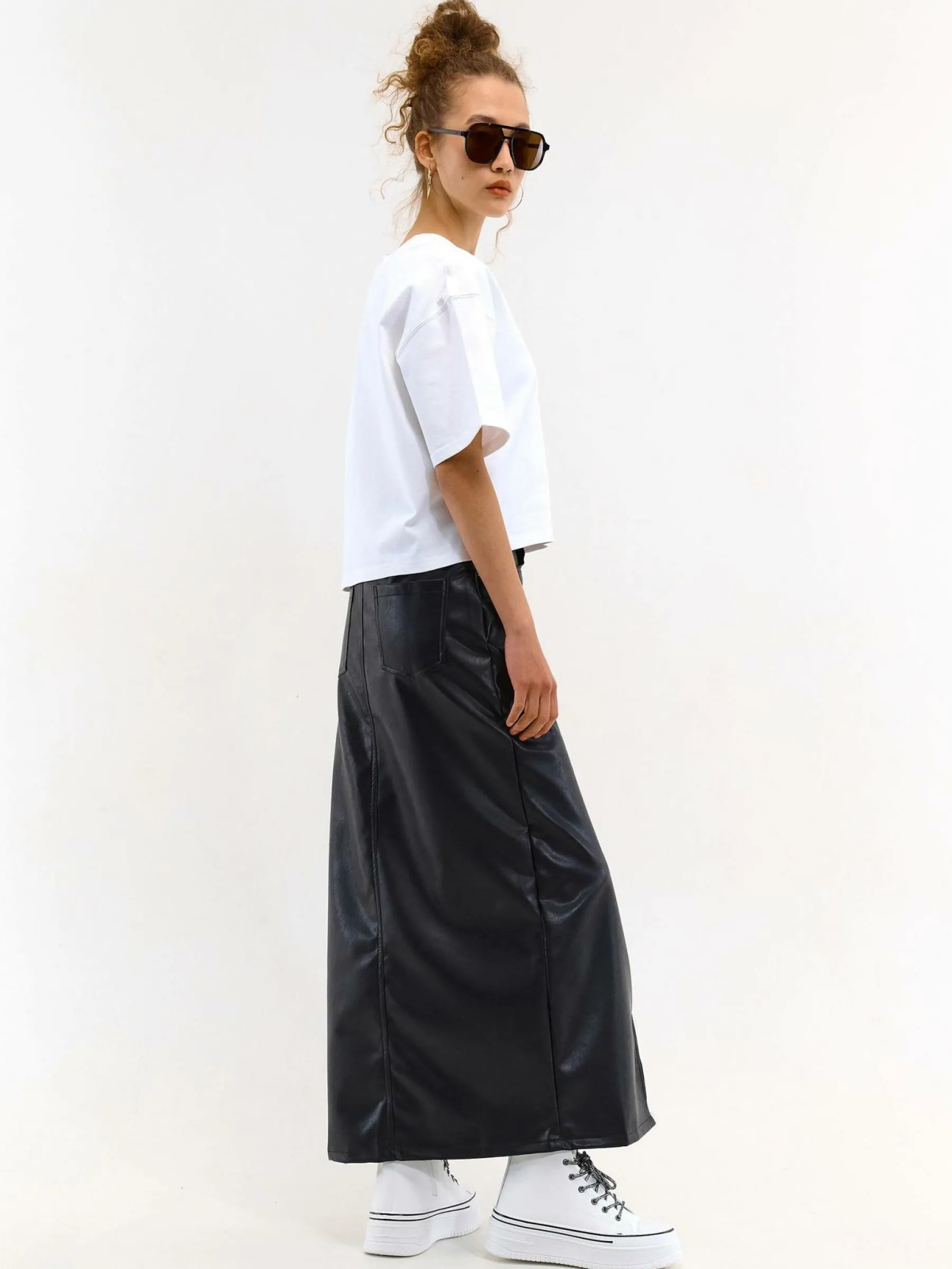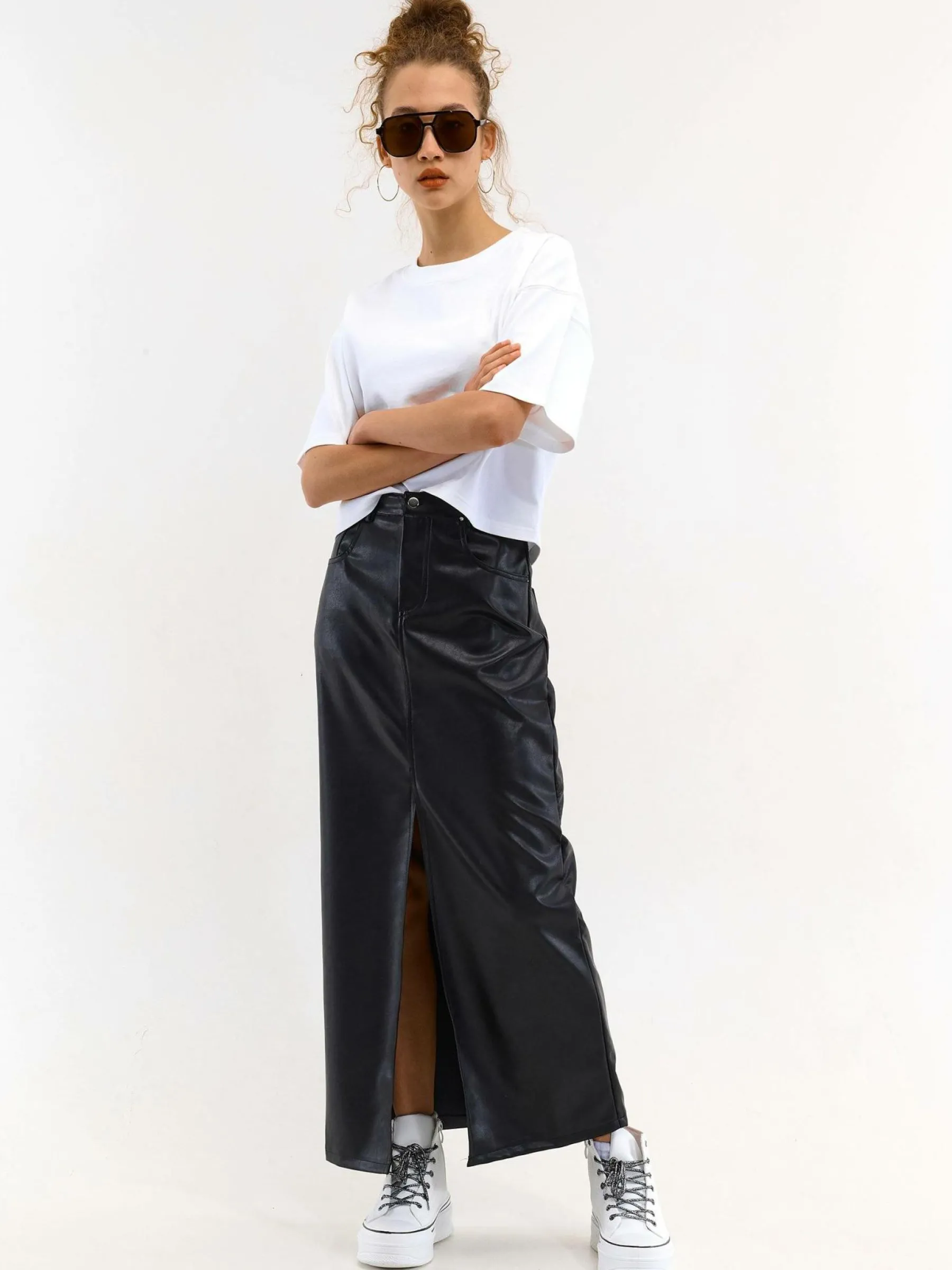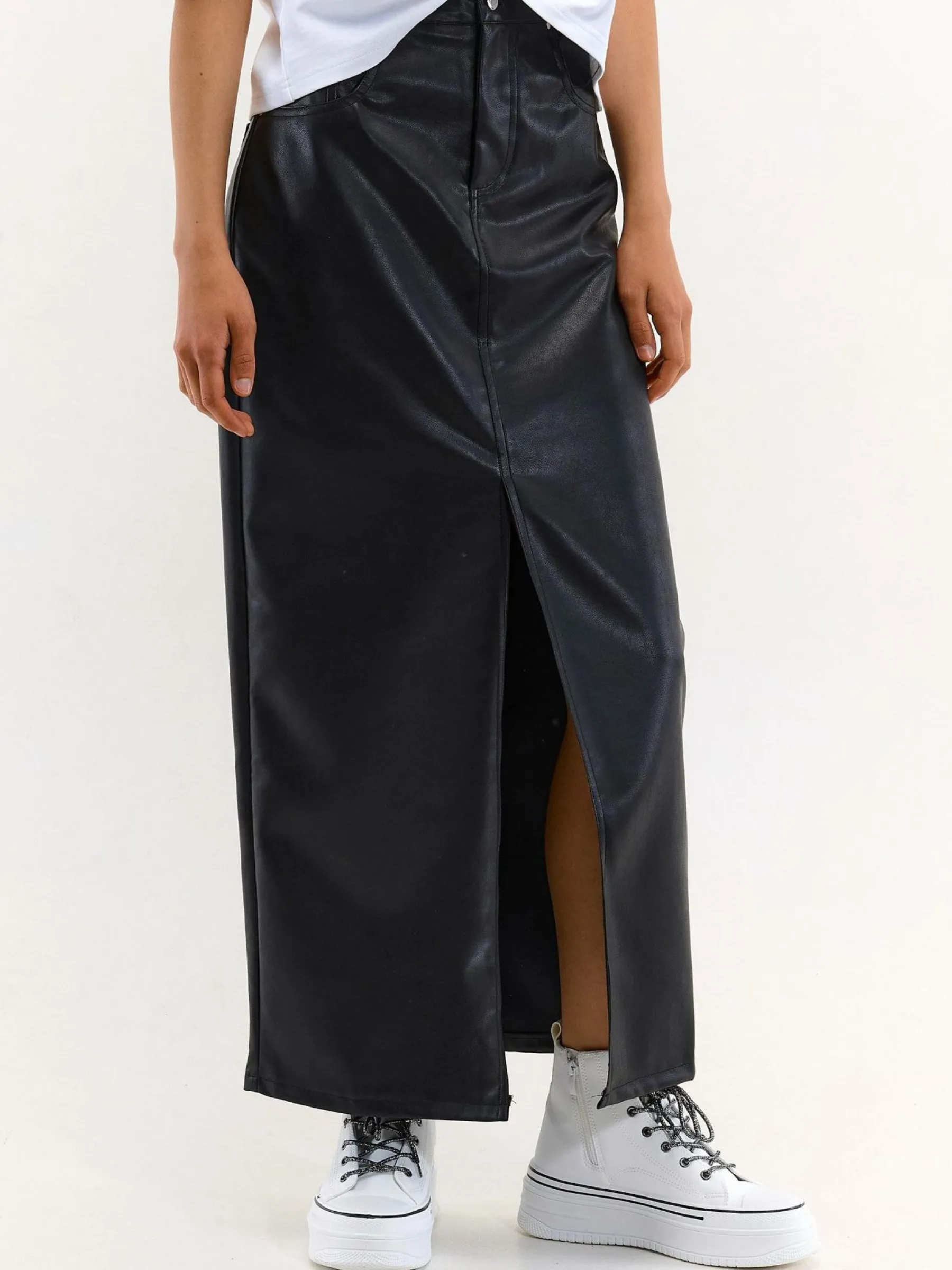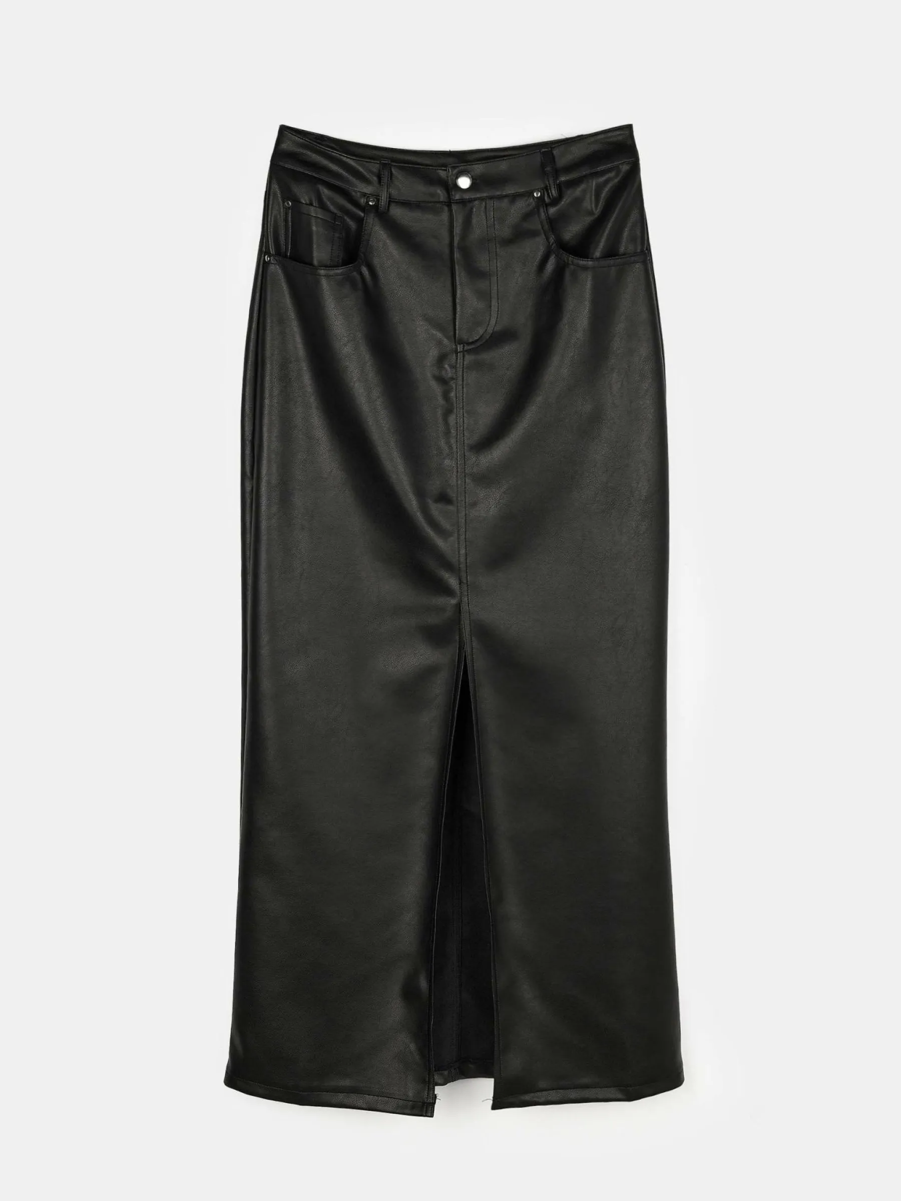 Kolor: czarnyKrój: podstawowyTyp: spódnicaDługość: midiPattern style: pojedynczy kolorDetal: z rozcięciem, na zame…