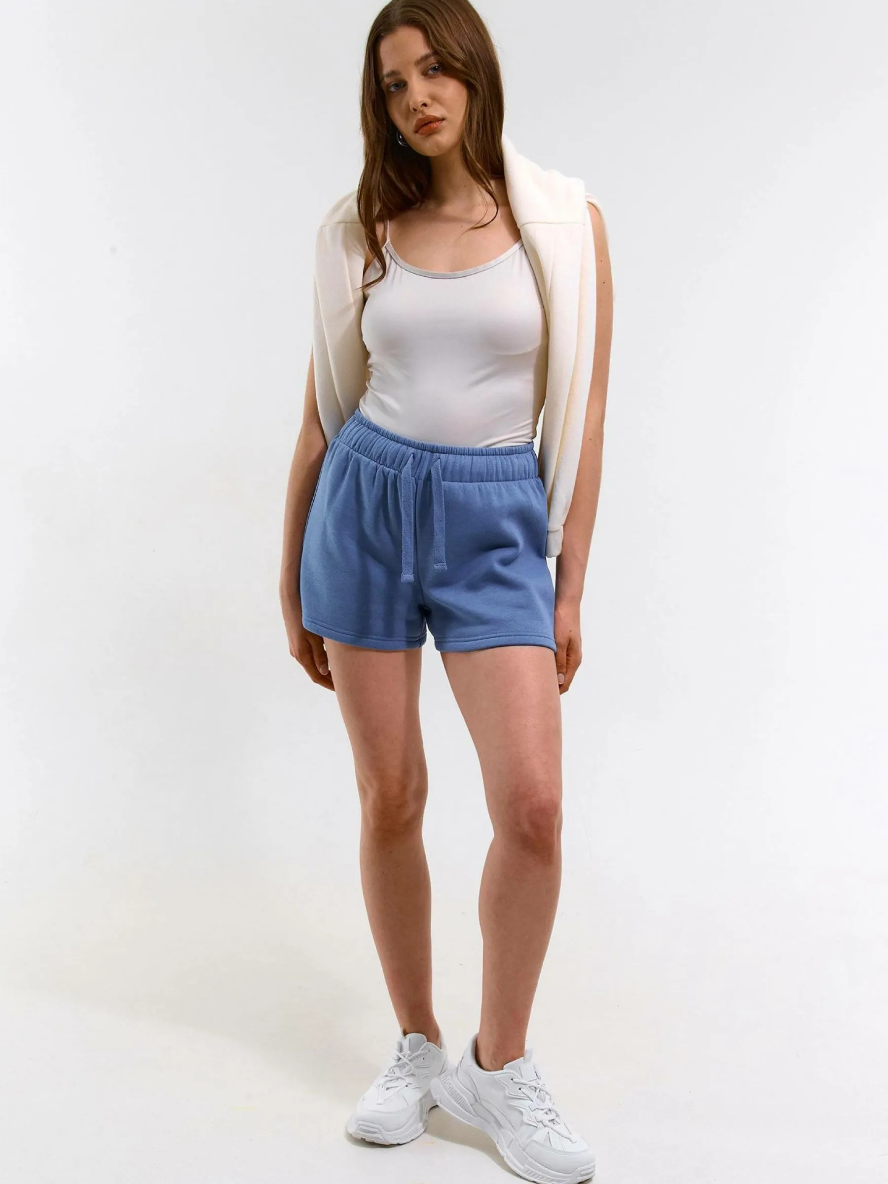 Kolor: niebieskiKrój: straightTyp: spodenkiDługość: krótkiPattern style: pojedynczy kolorDetal: ze sznurowaniemMate…