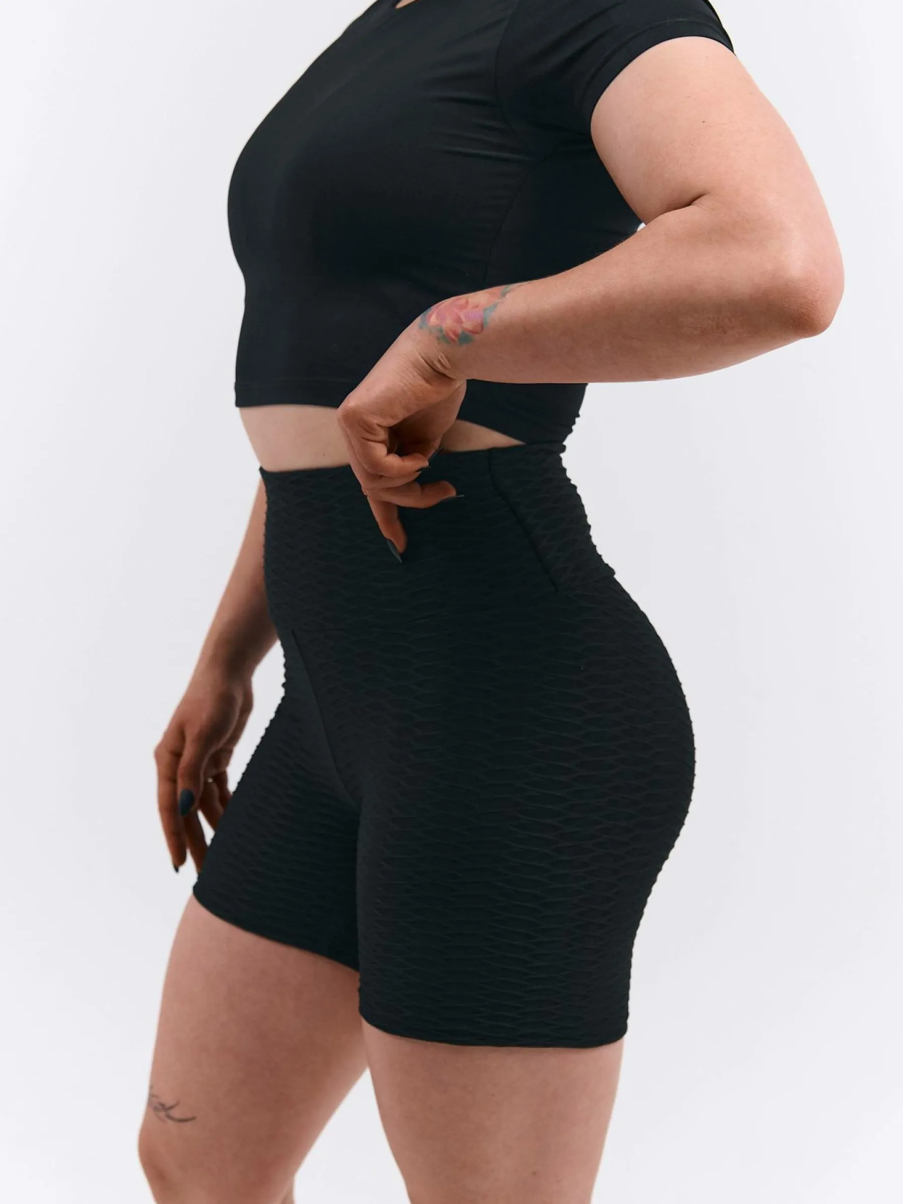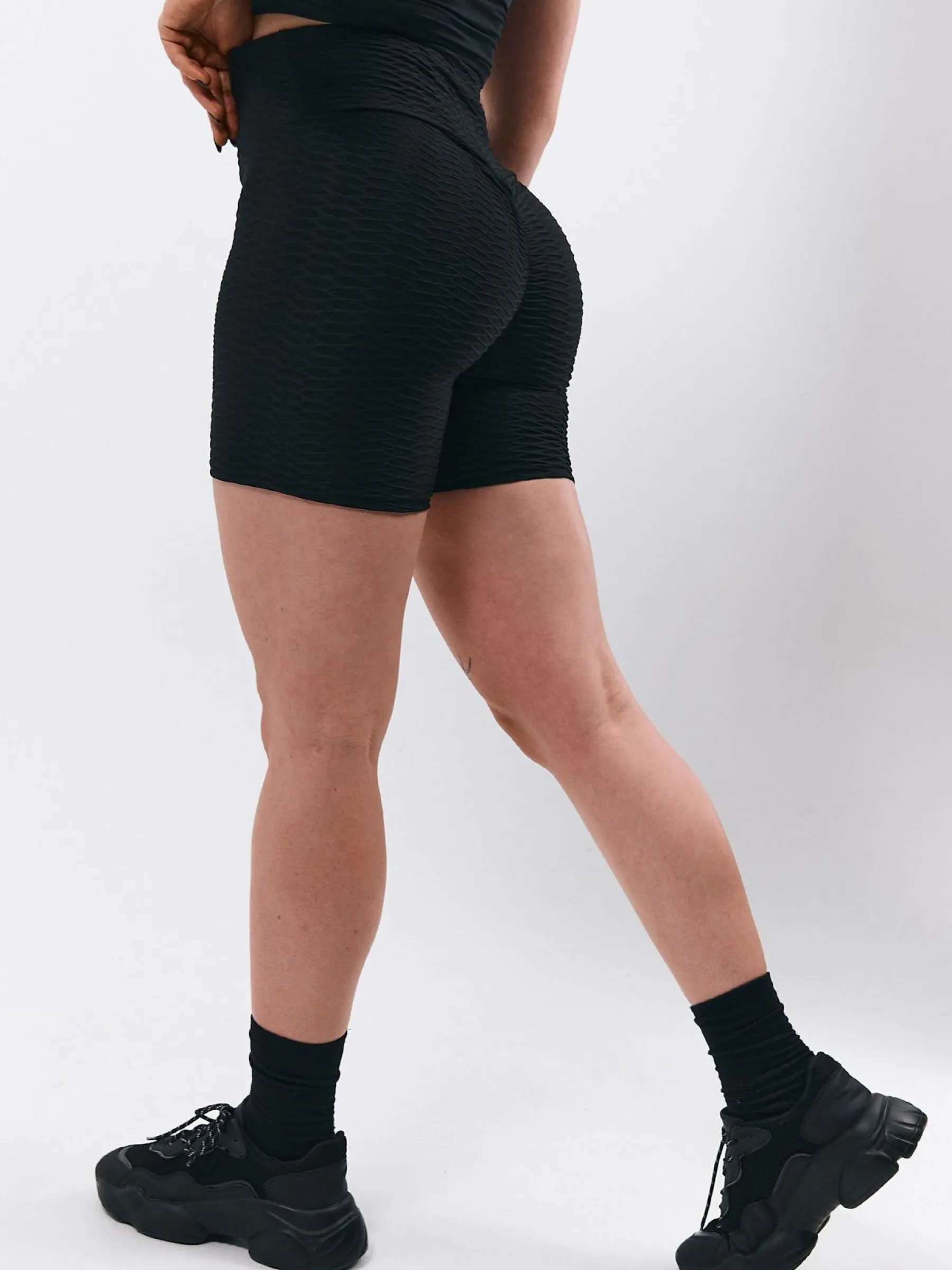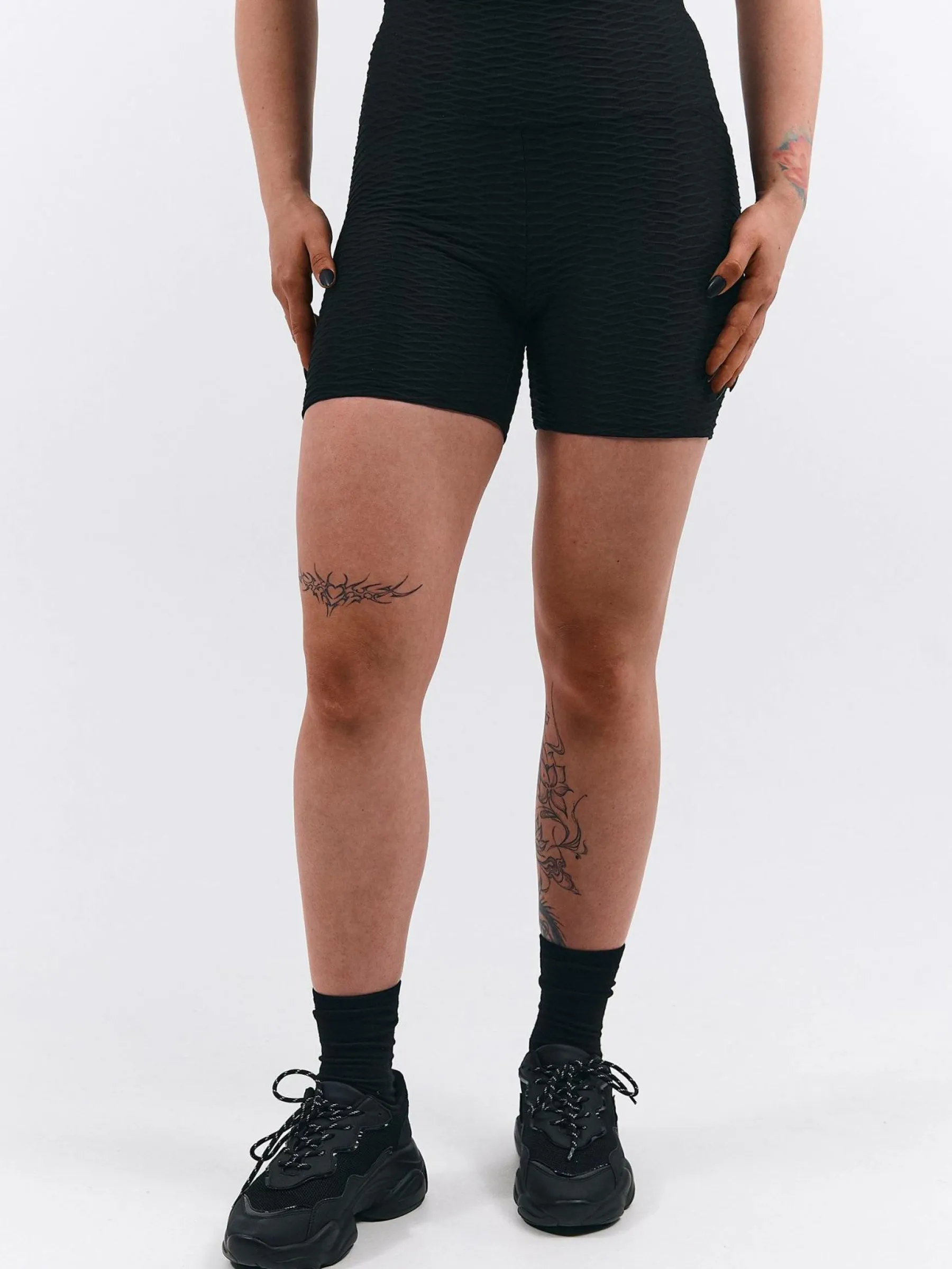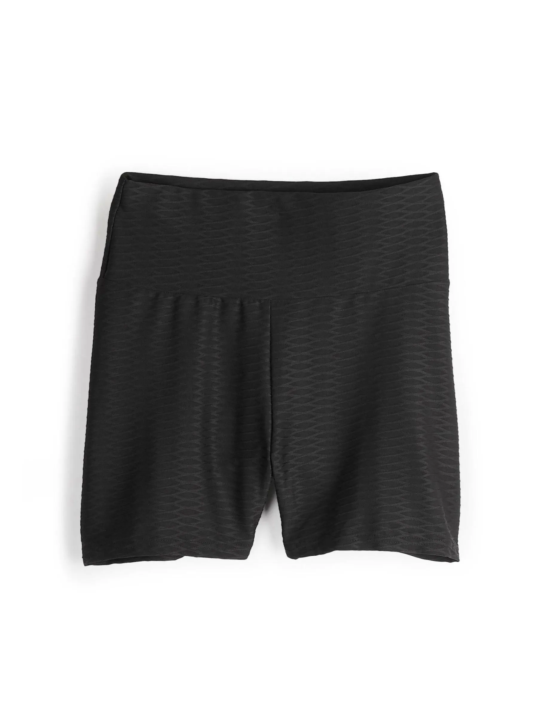 Kolor: czarnyKrój: push-upTyp: spodenkiDługość: krótkiPattern style: pojedynczy kolor, strukturowaneDetal: z elasty…