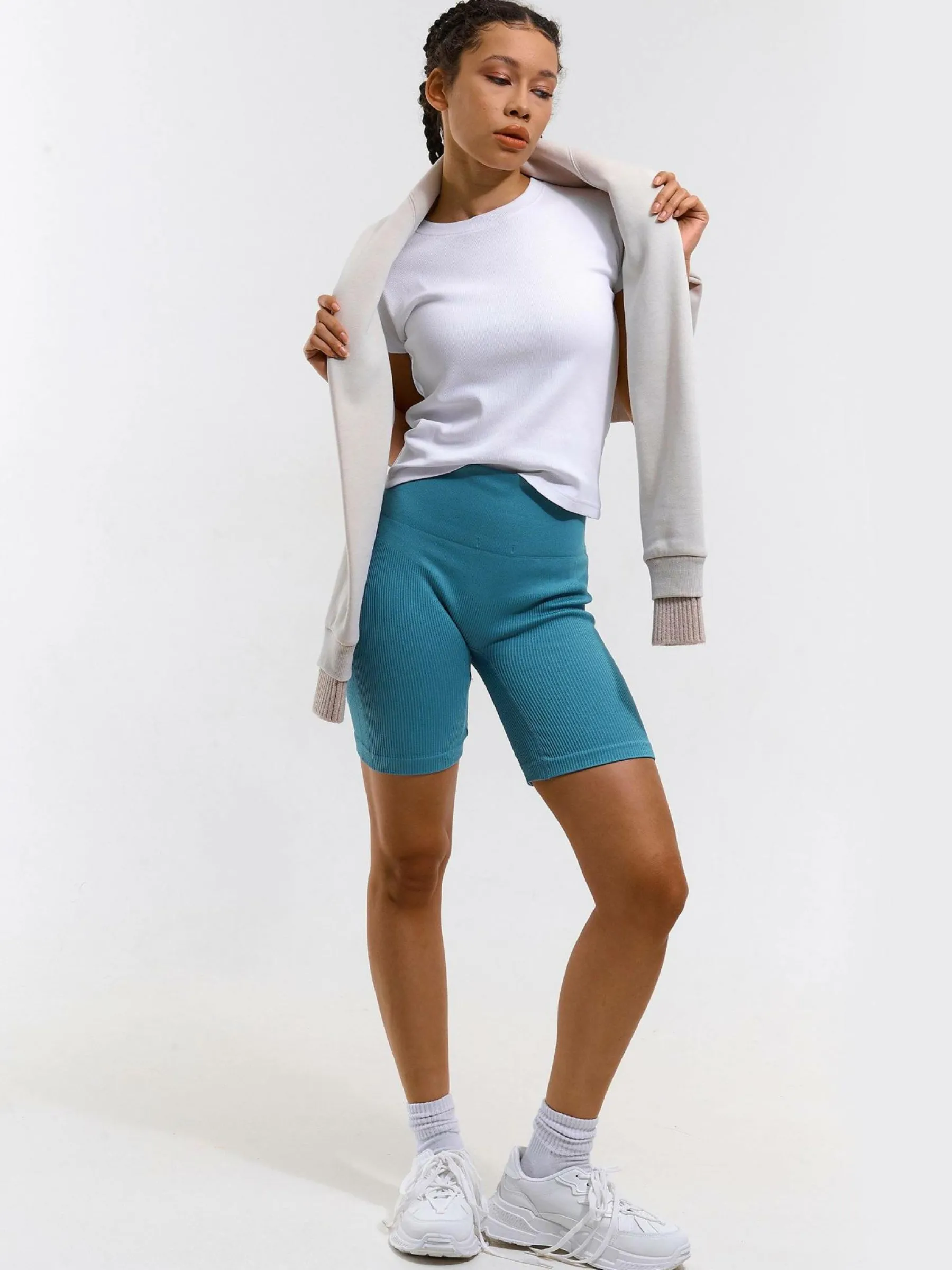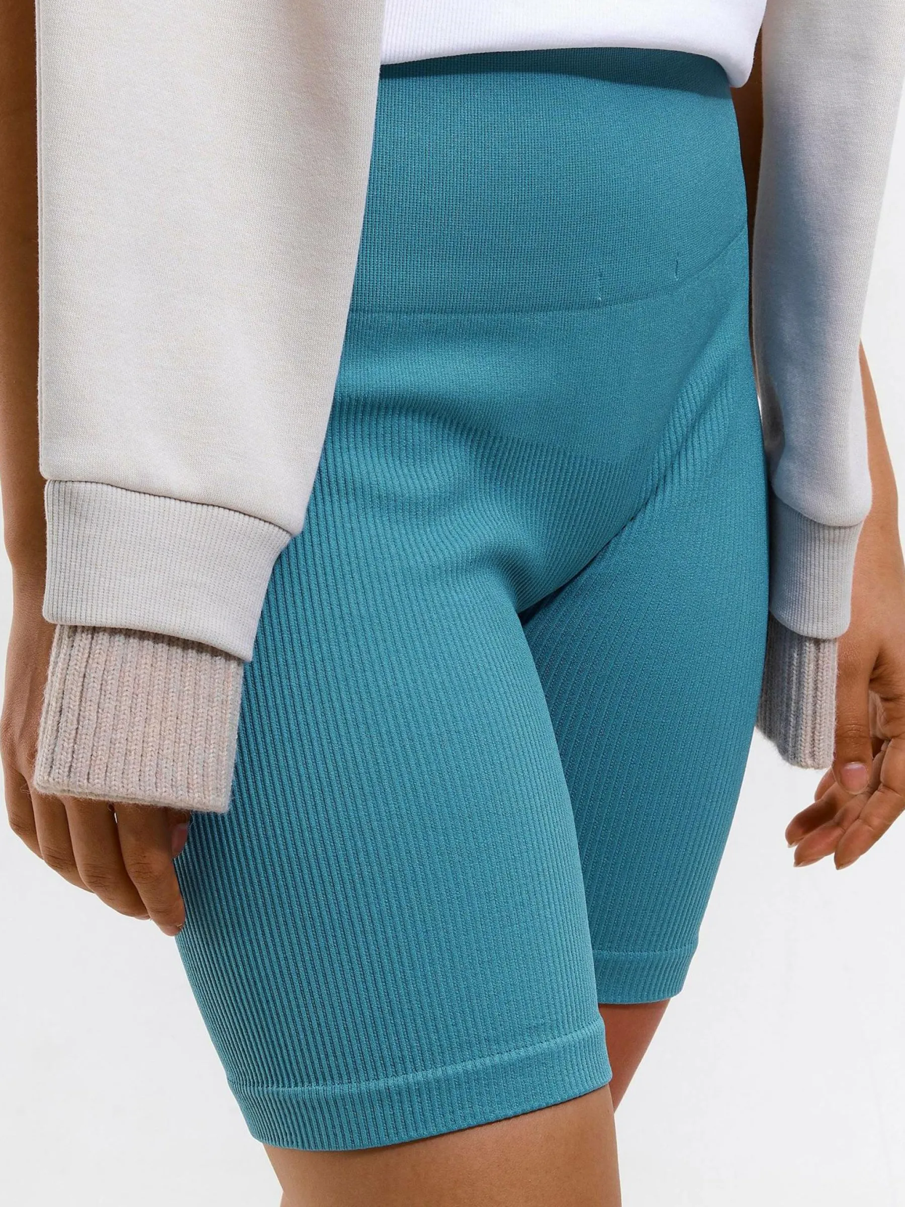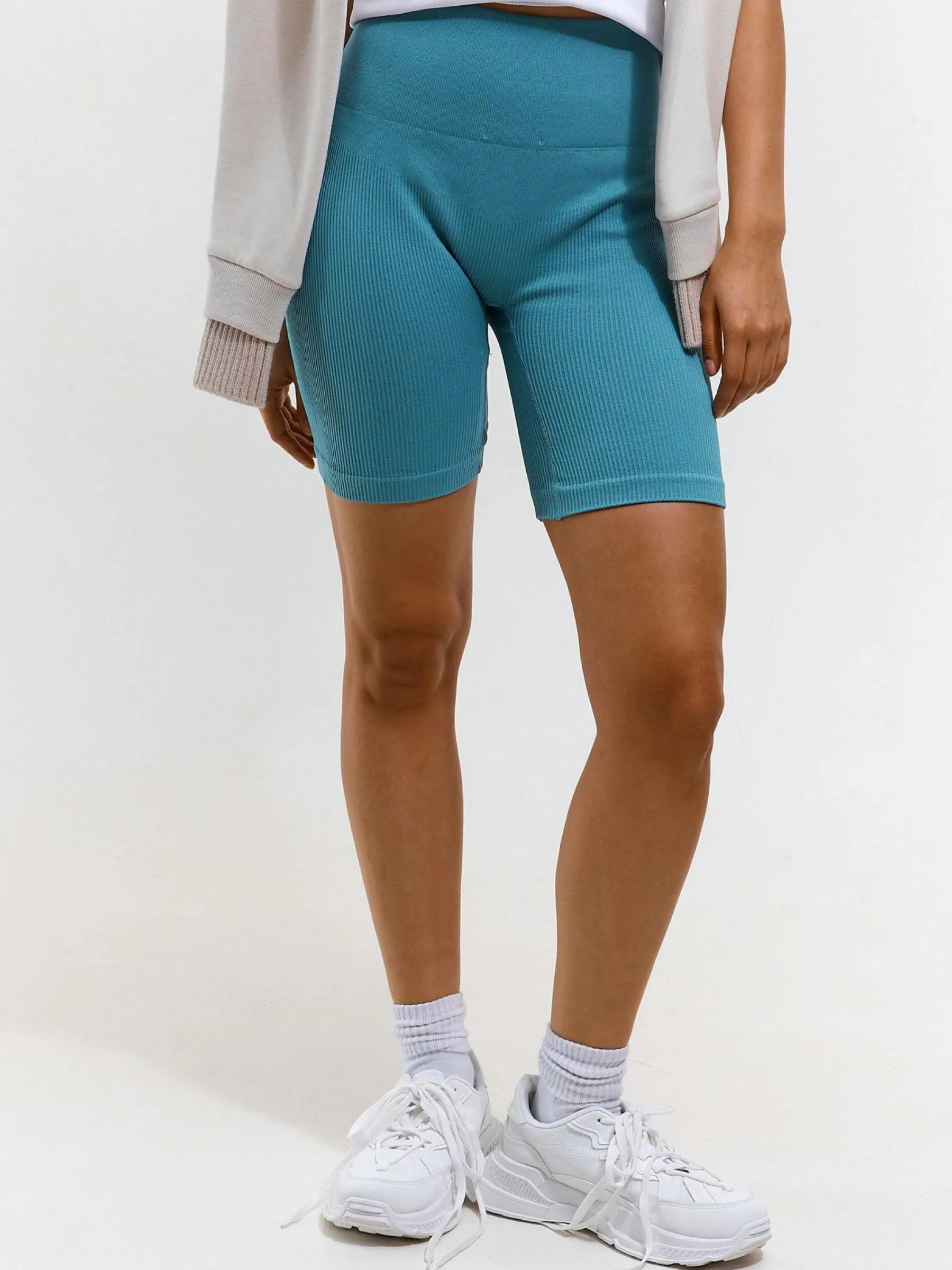 Kolor: niebieskiKrój: bikerTyp: spodenkiDługość: krótkiPattern style: pojedynczy kolor, żebrowanyMateriał: syntet…