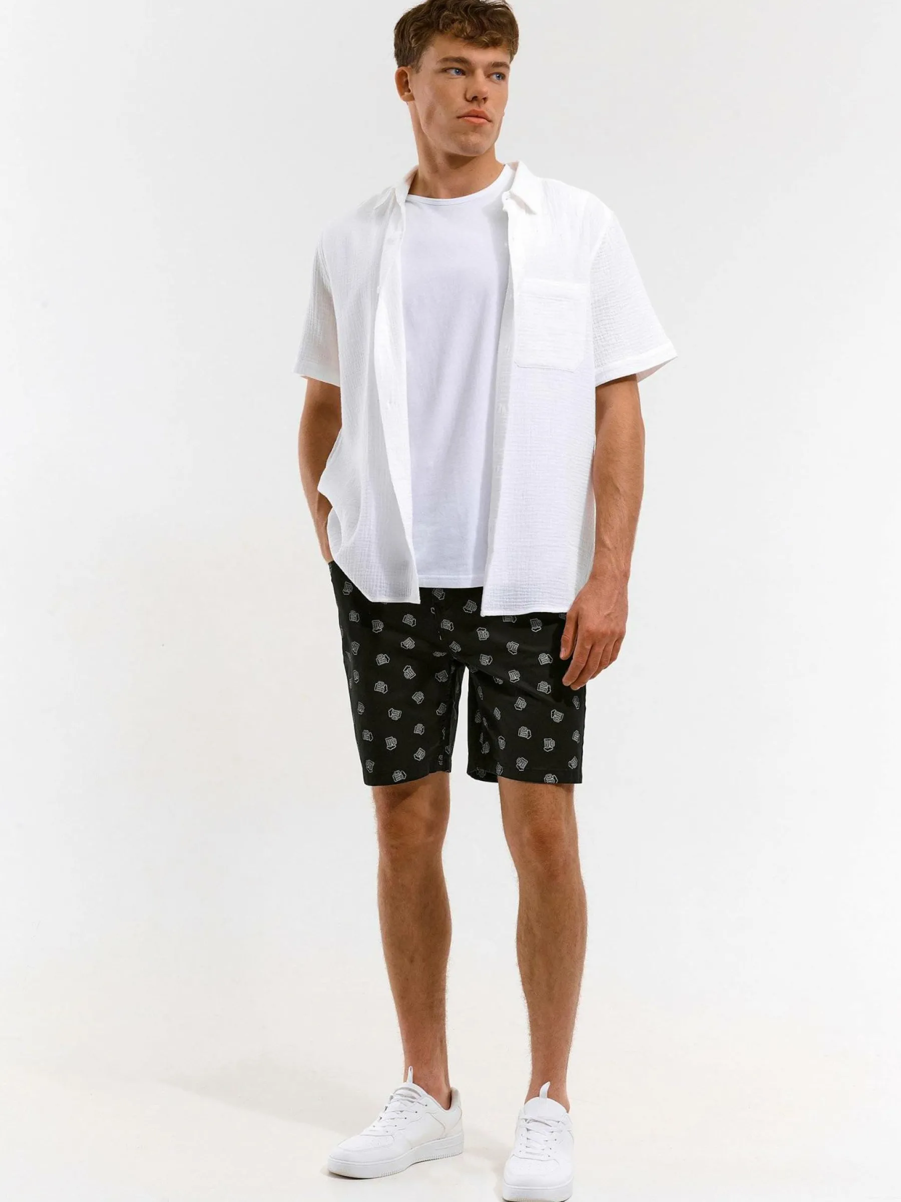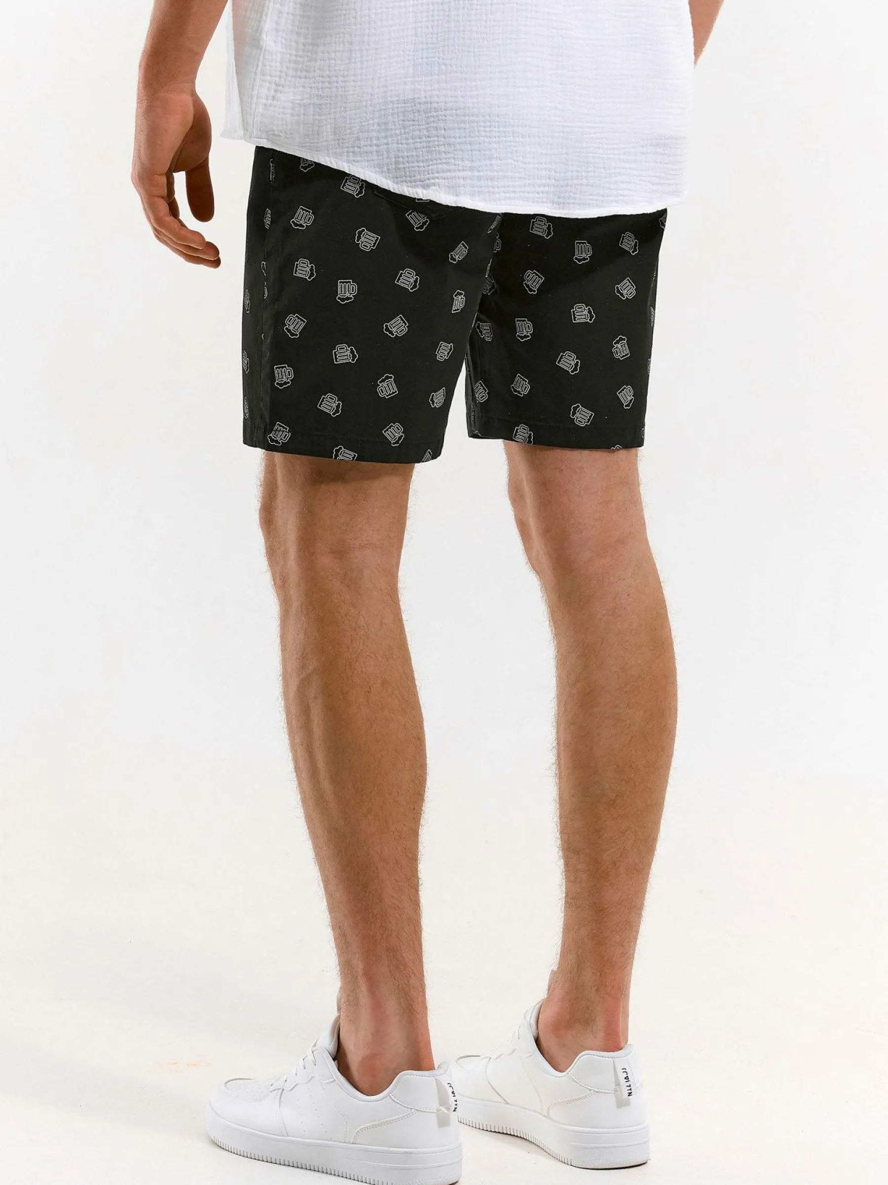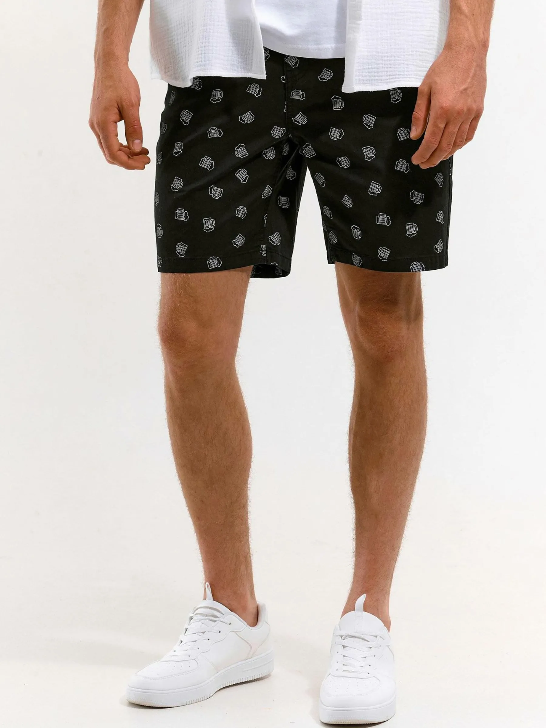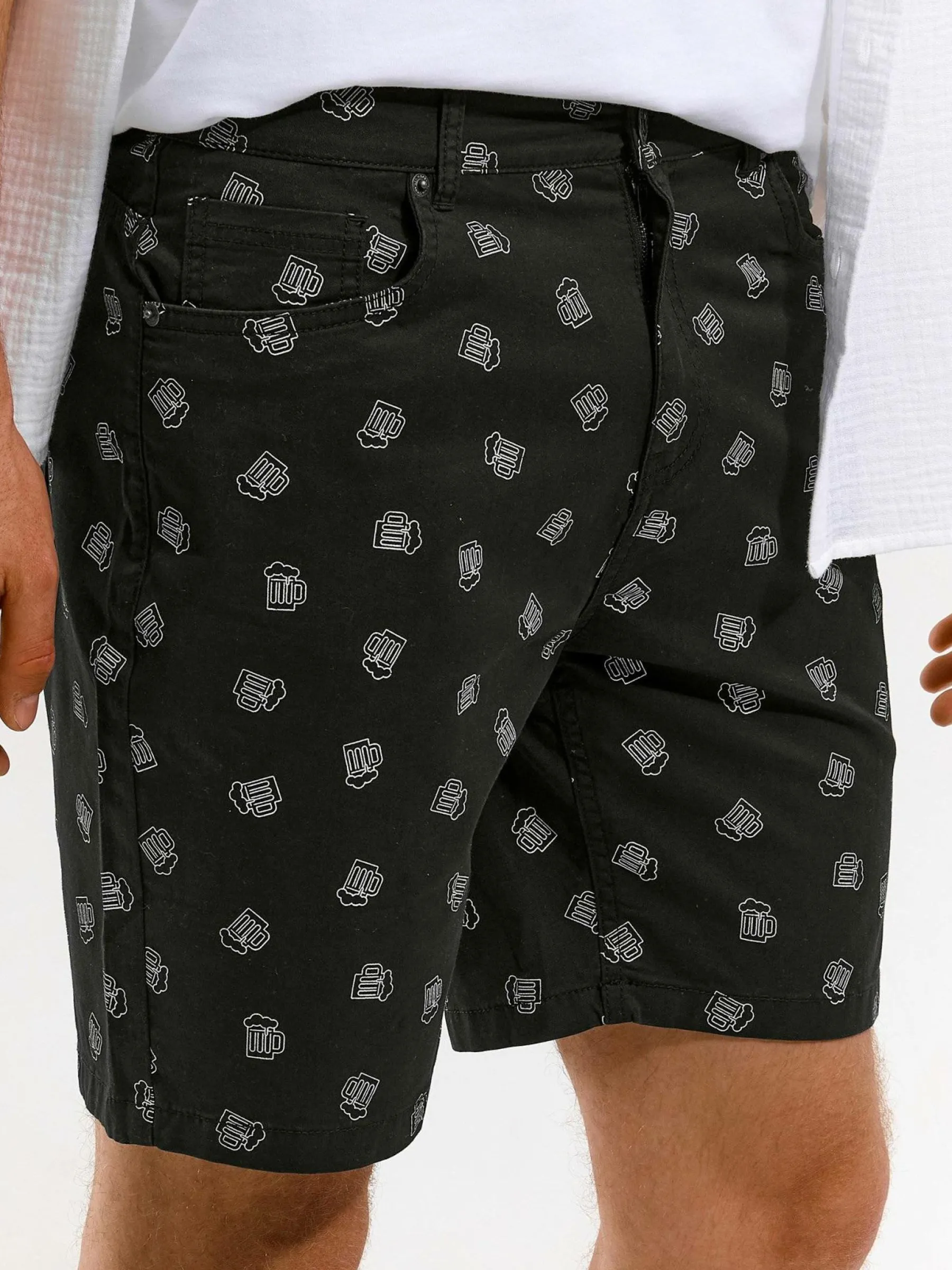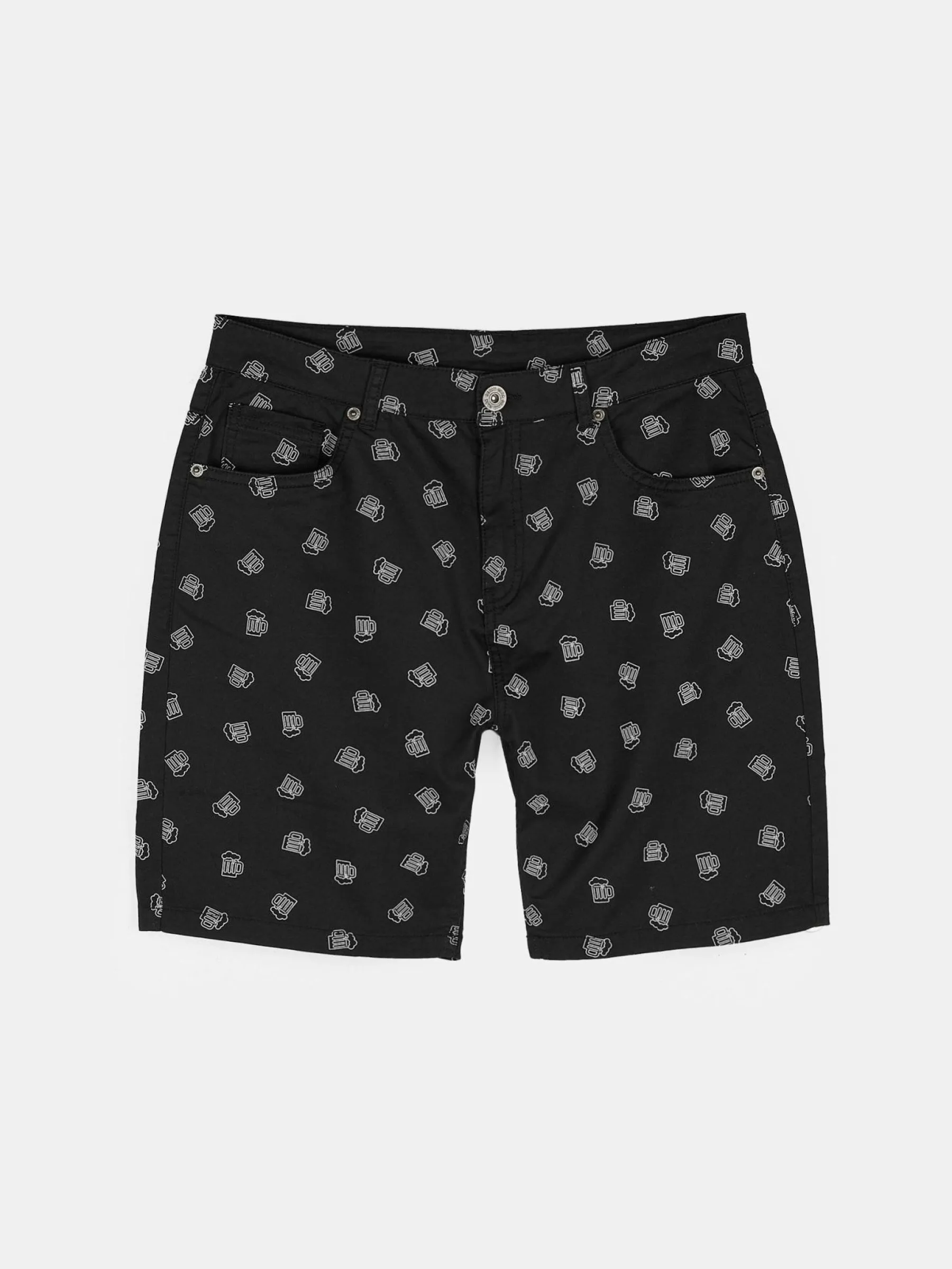 Kolor: czarnyKrój: straightTyp: spodenkiDługość: krótkiPattern style: z nadrukiemDetal: na zamek, z kieszeniamiMate…