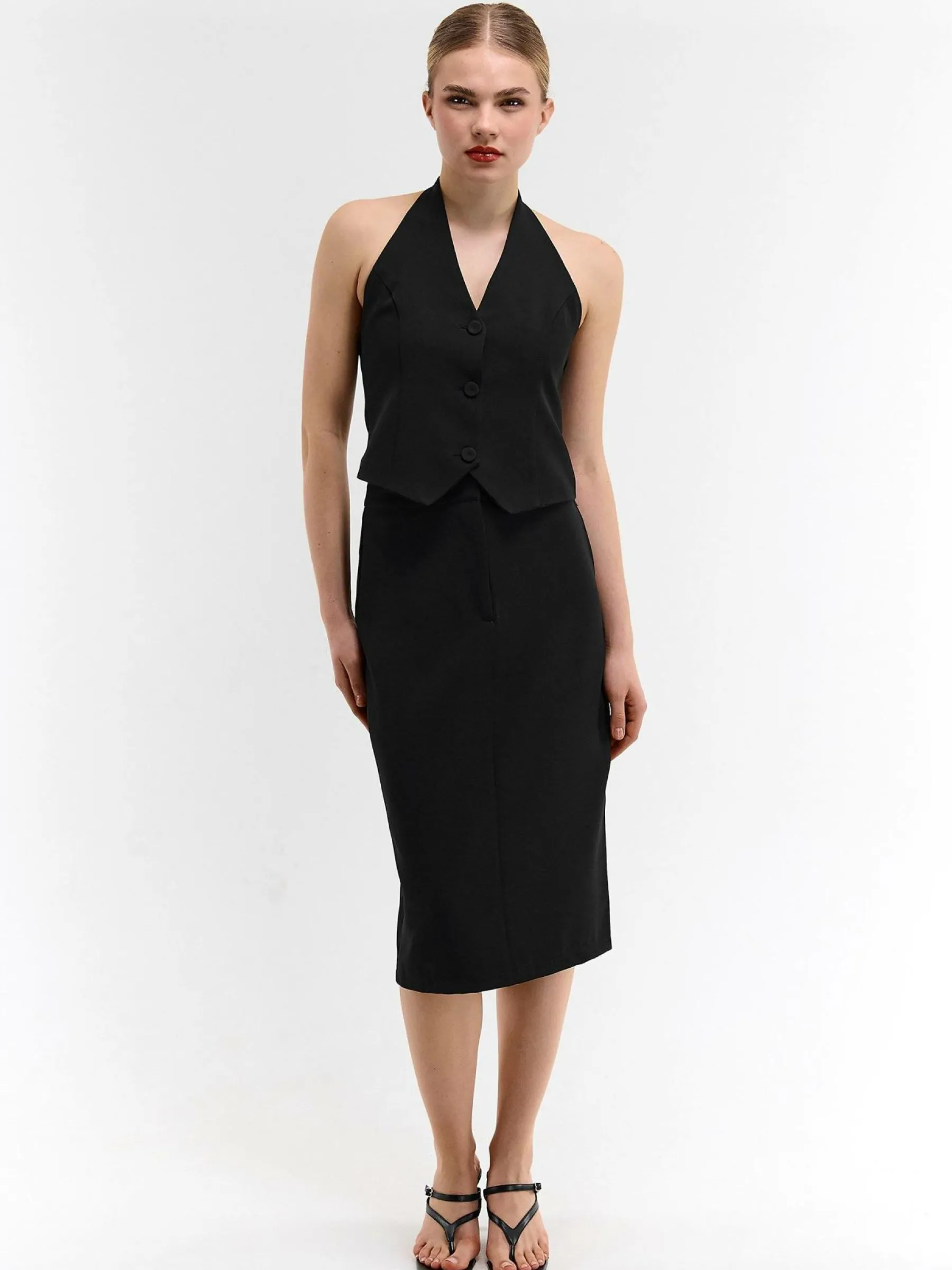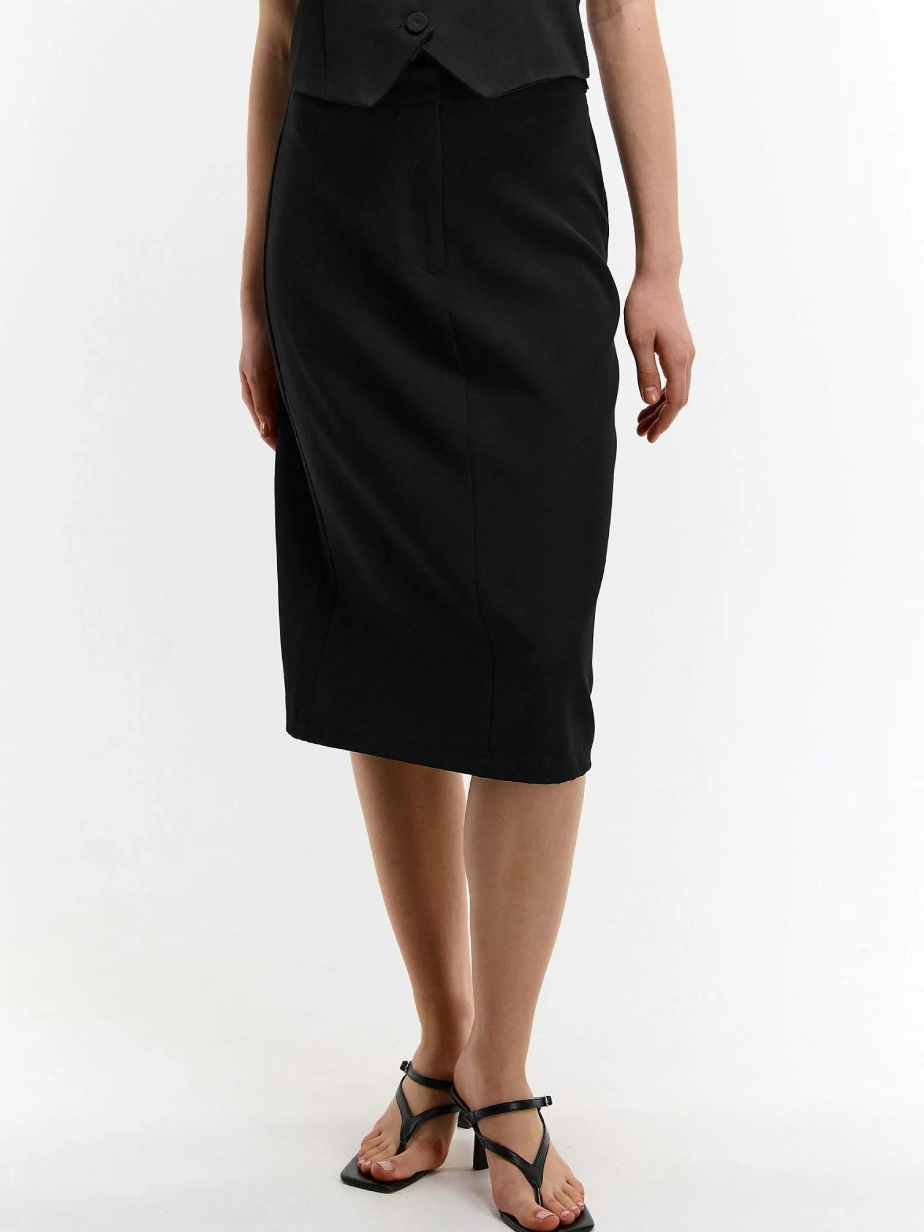 Kolor: czarnyKrój: ołówkoweTyp: spódnicaDługość: midiPattern style: pojedynczy kolorDetal: z rozcięciemMateriał…
