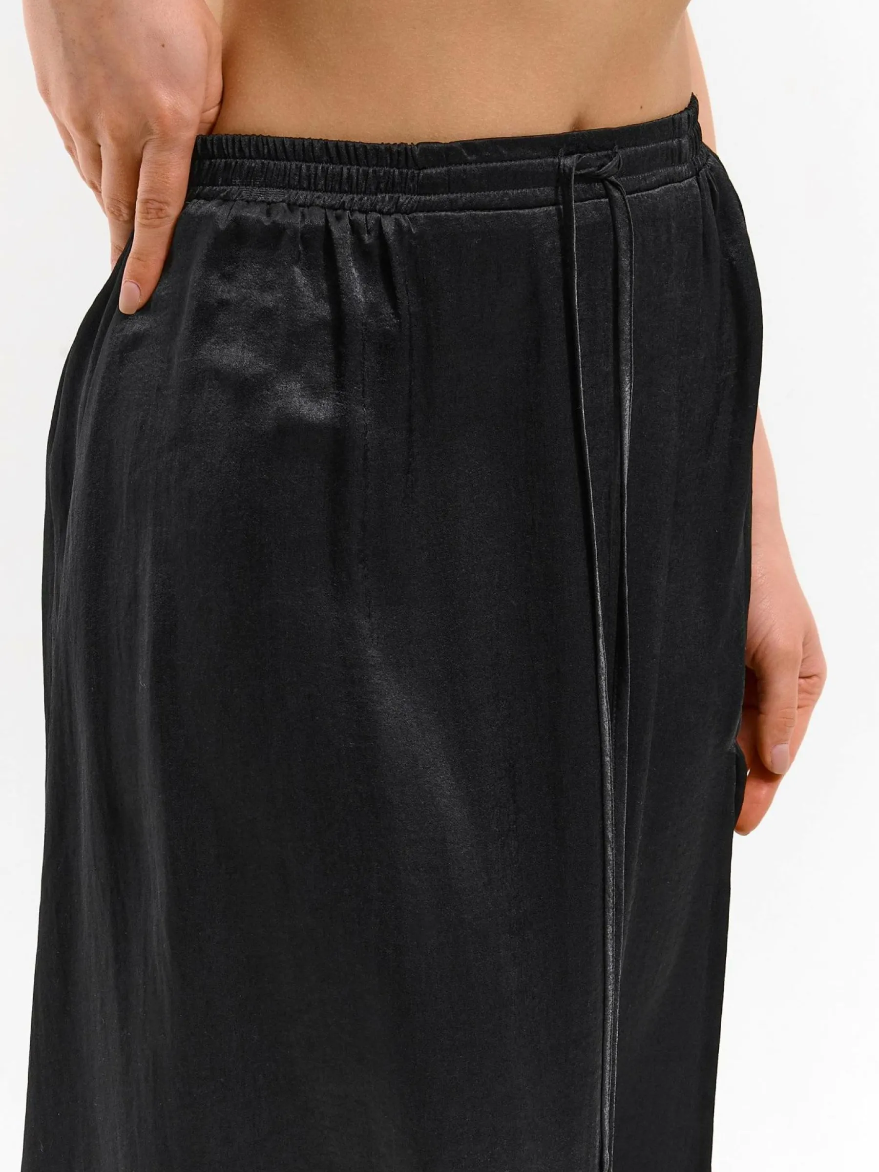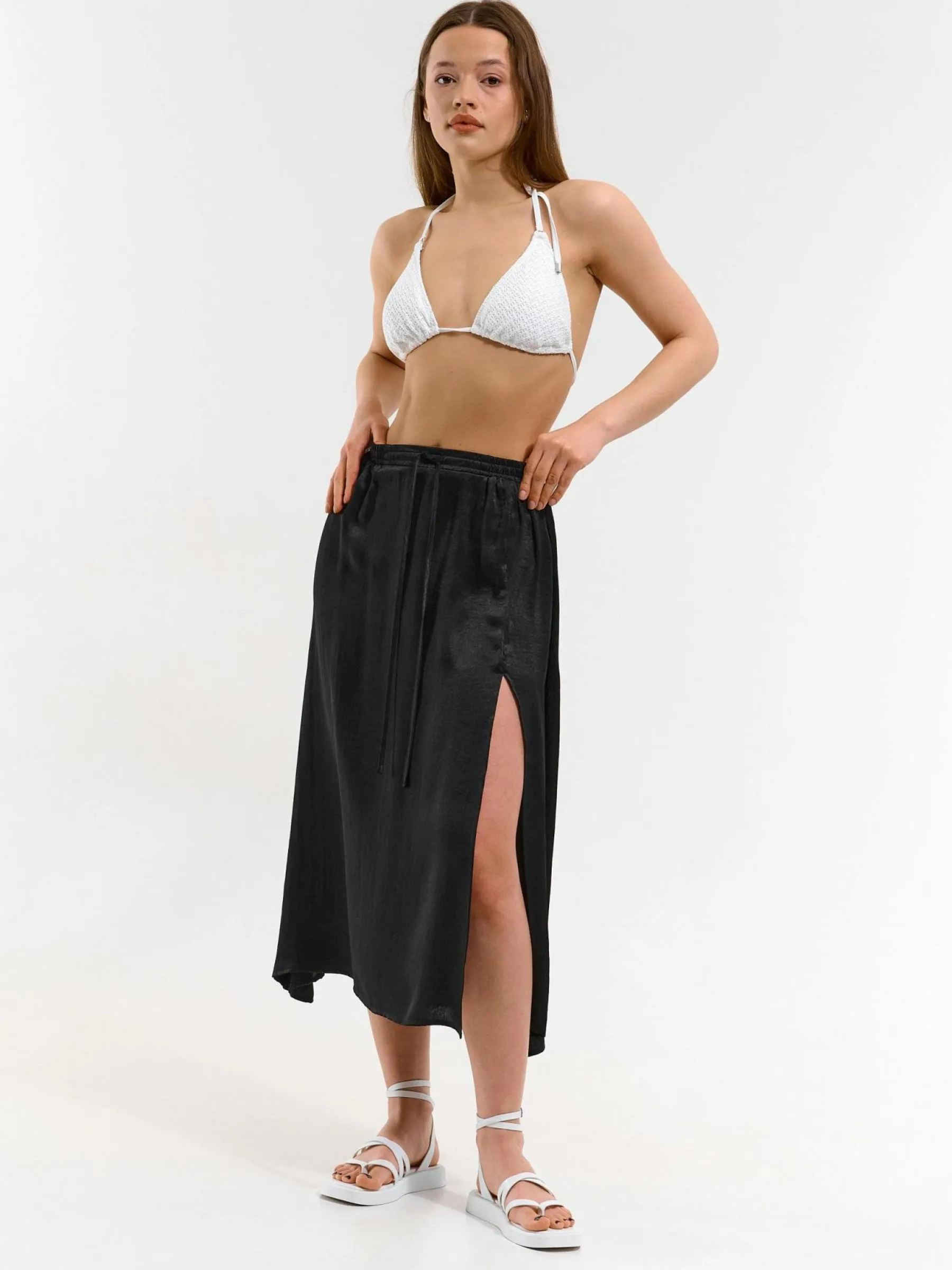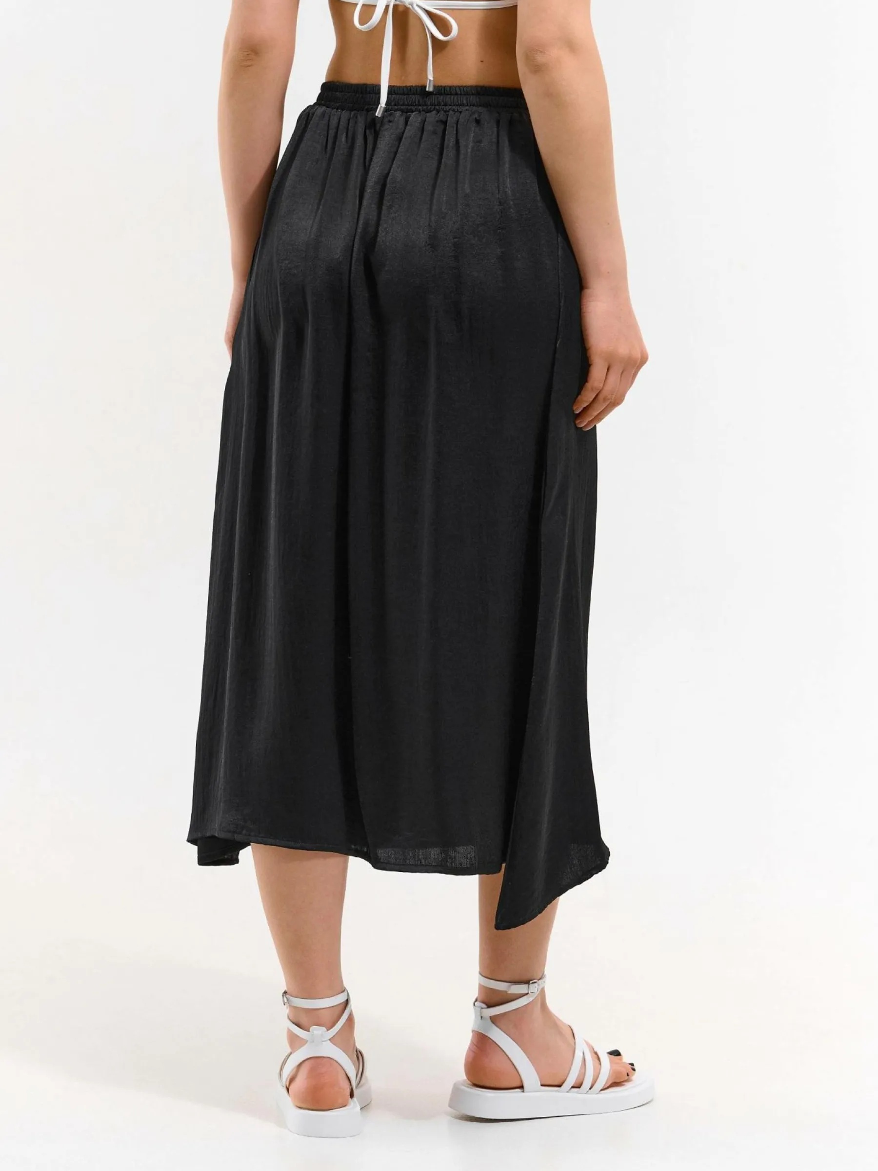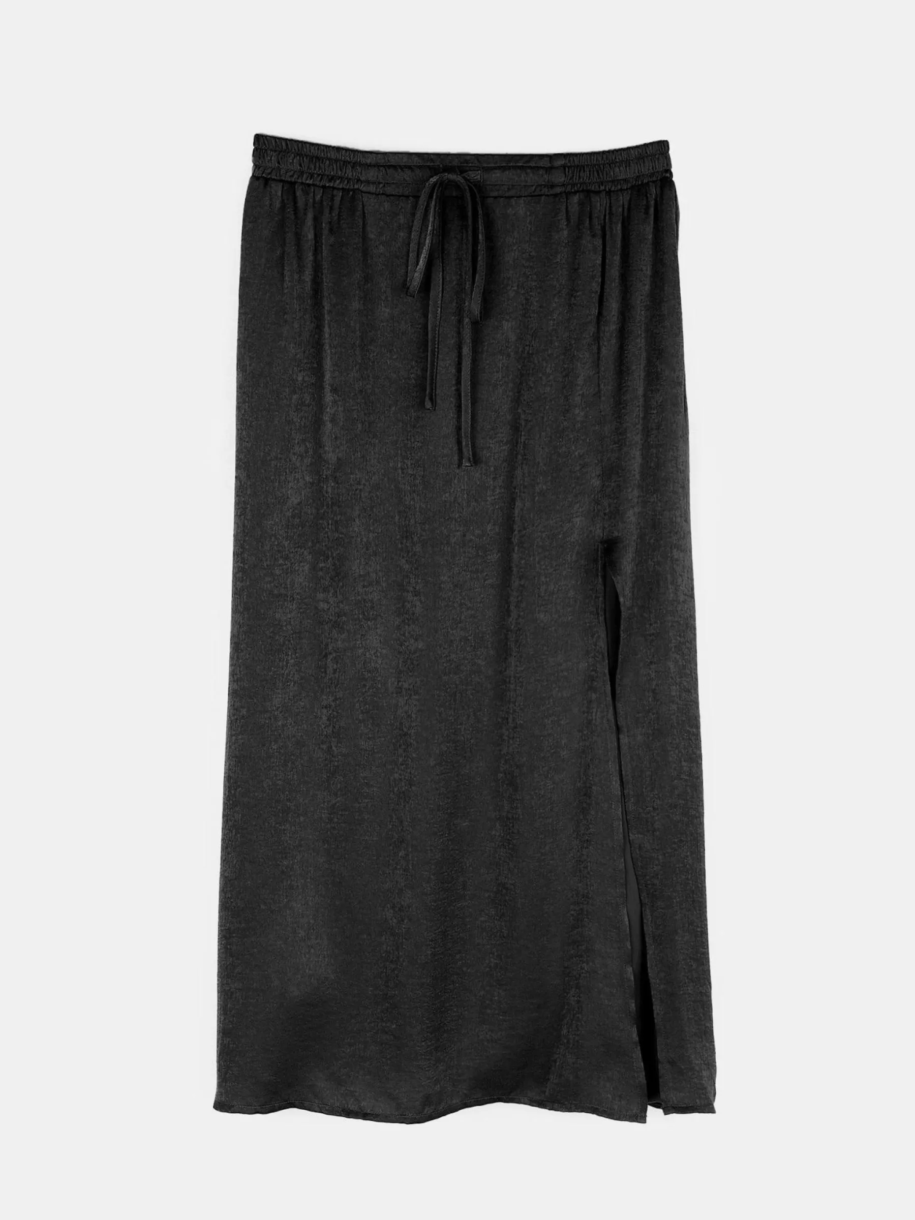 Kolor: czarnyKrój: regularTyp: spódnicaDługość: midiPattern style: pojedynczy kolorDetal: z rozcięciem, ze sznurow…