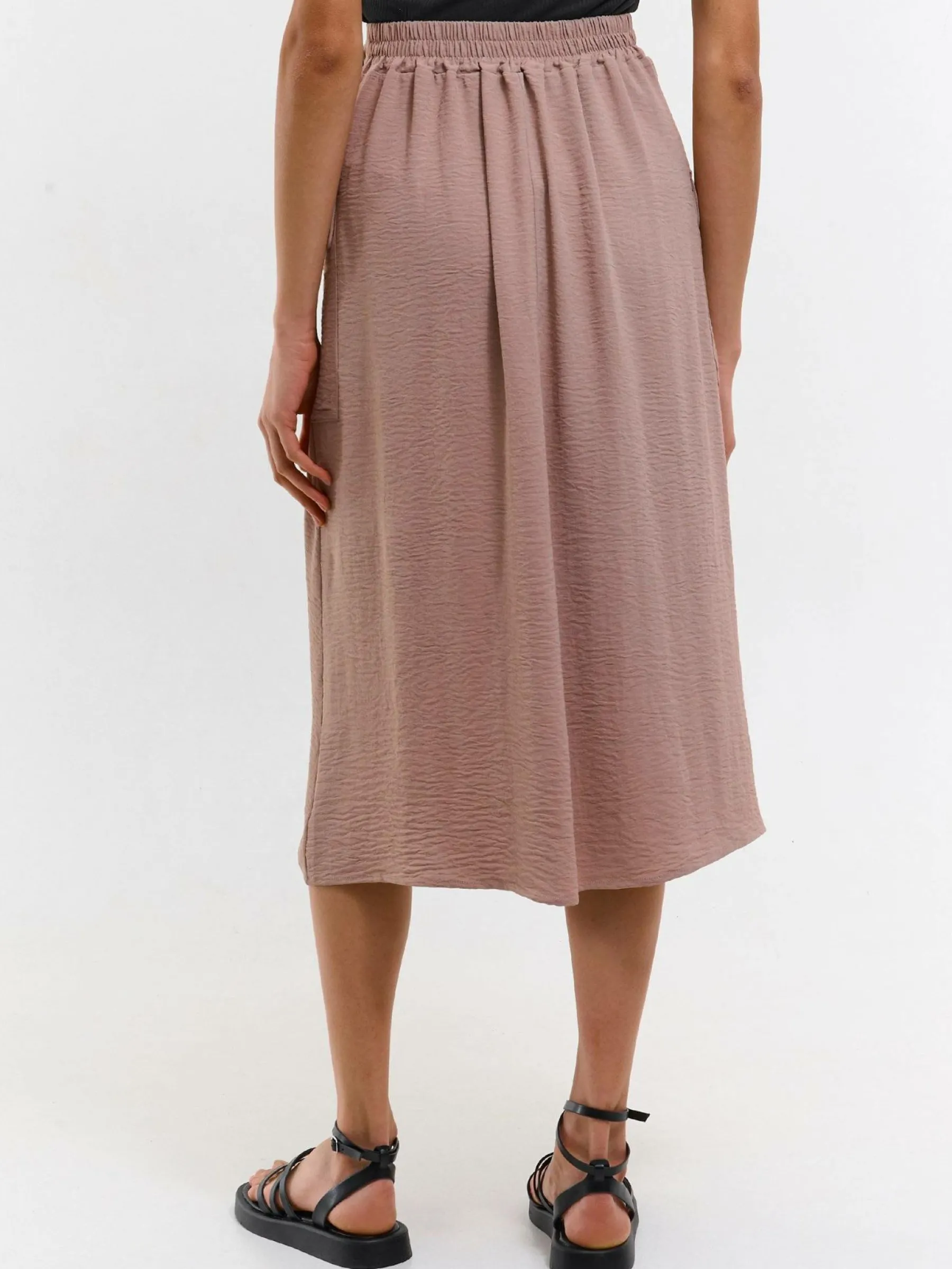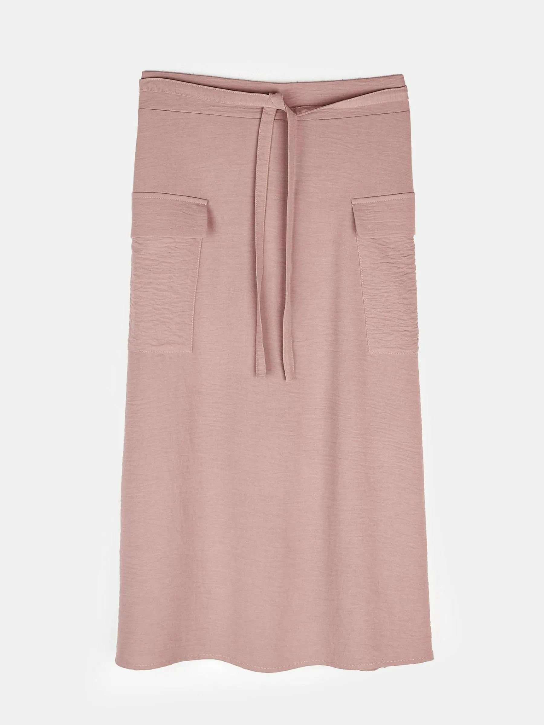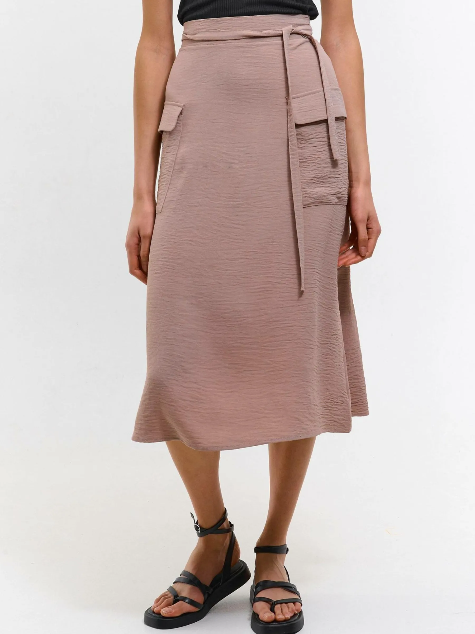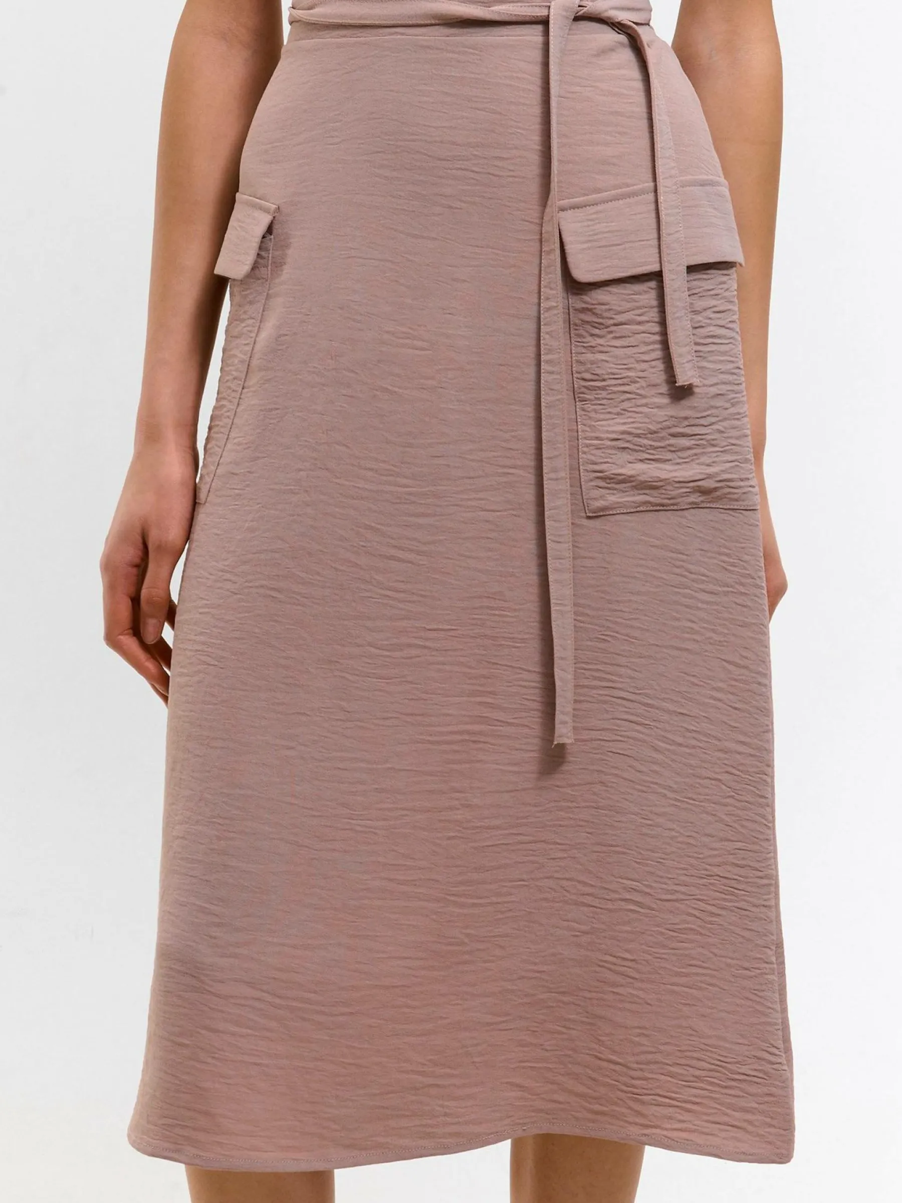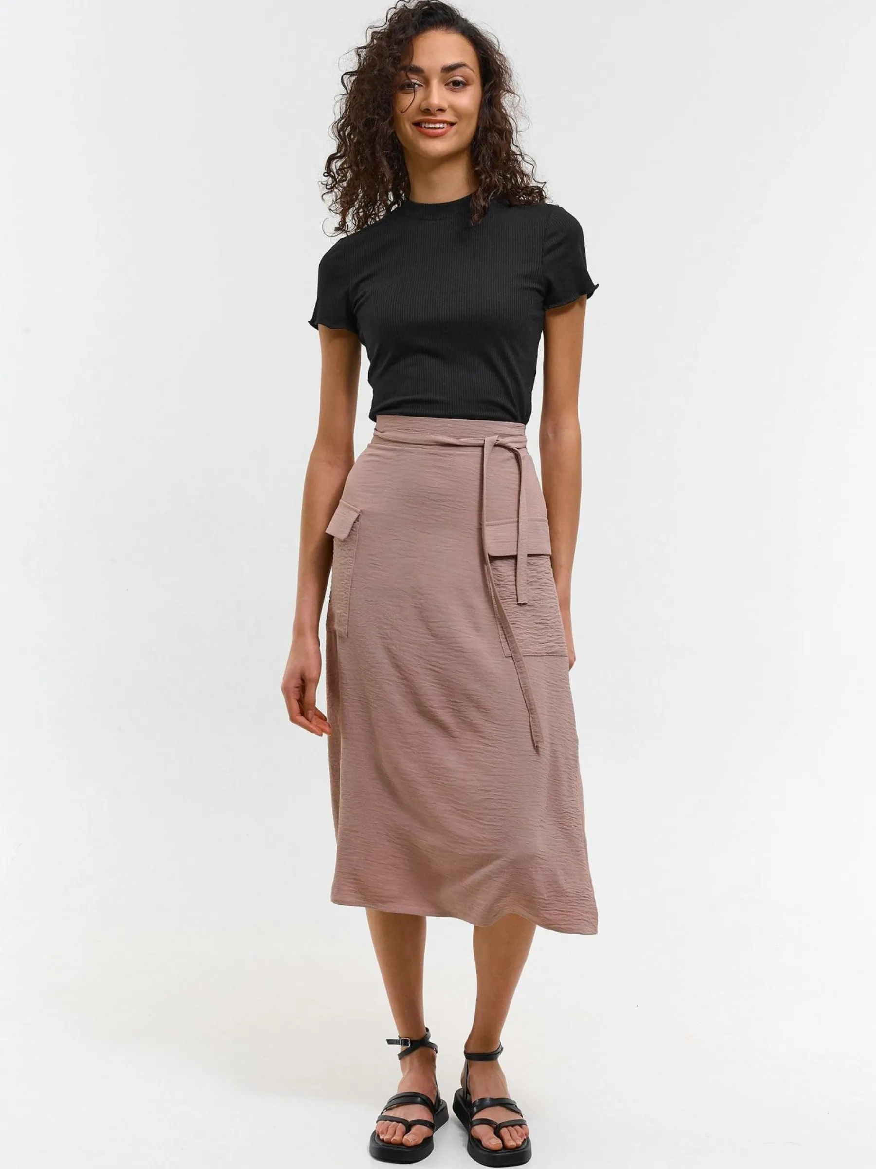 Kolor: beżowy, brązowyKrój: regularTyp: spódnicaDługość: midiPattern style: pojedynczy kolorDetal: z paskiemMater…