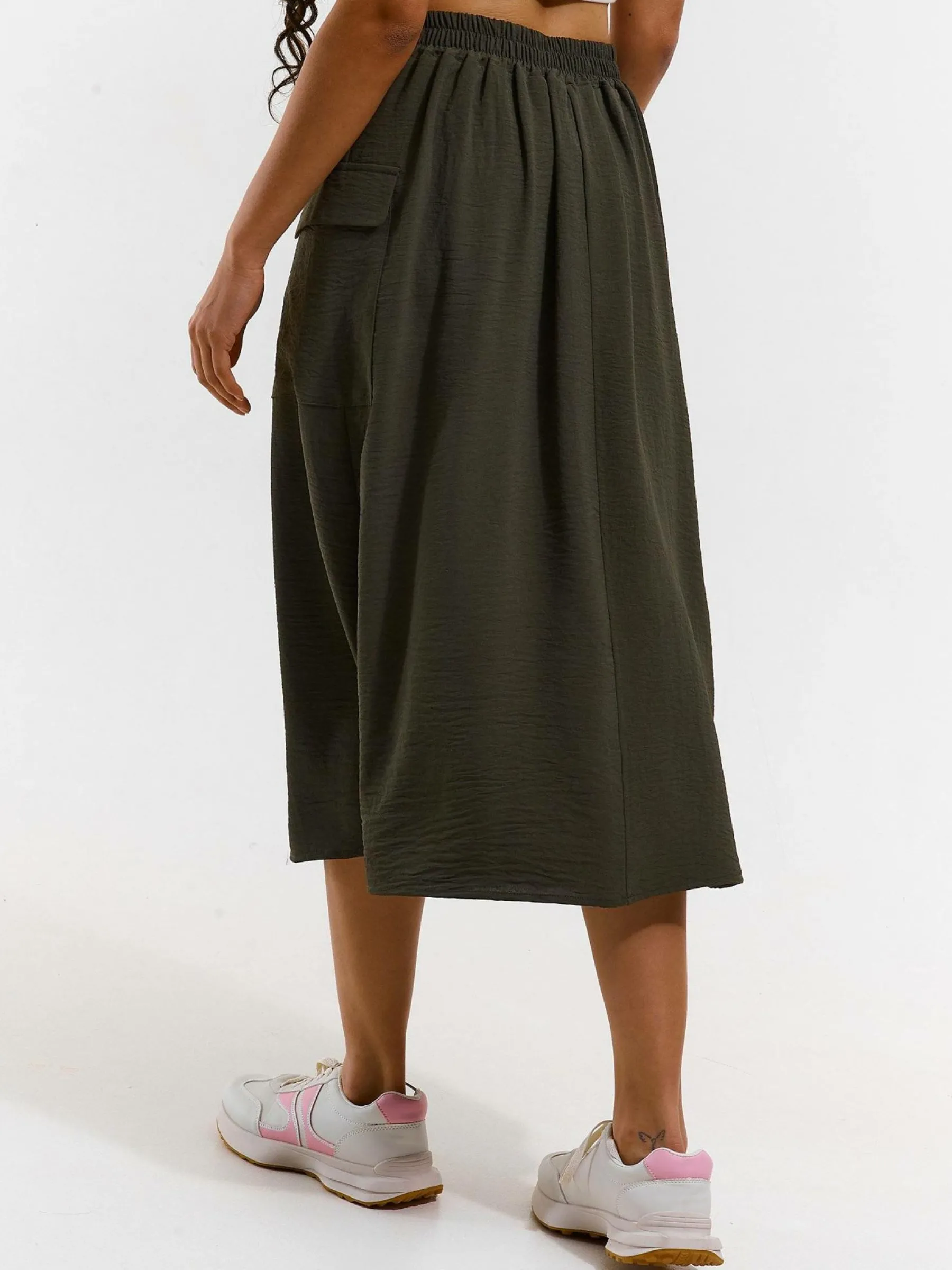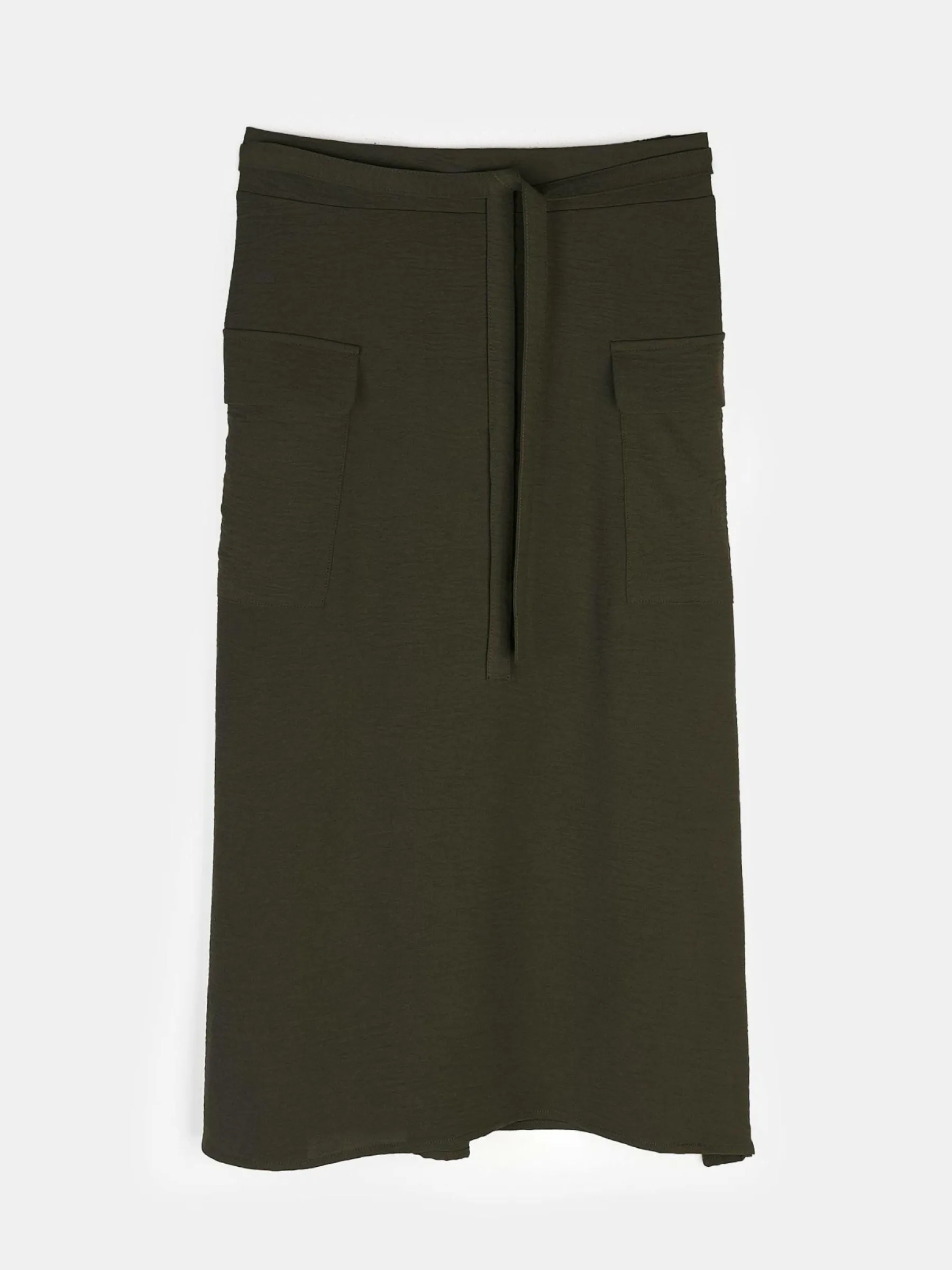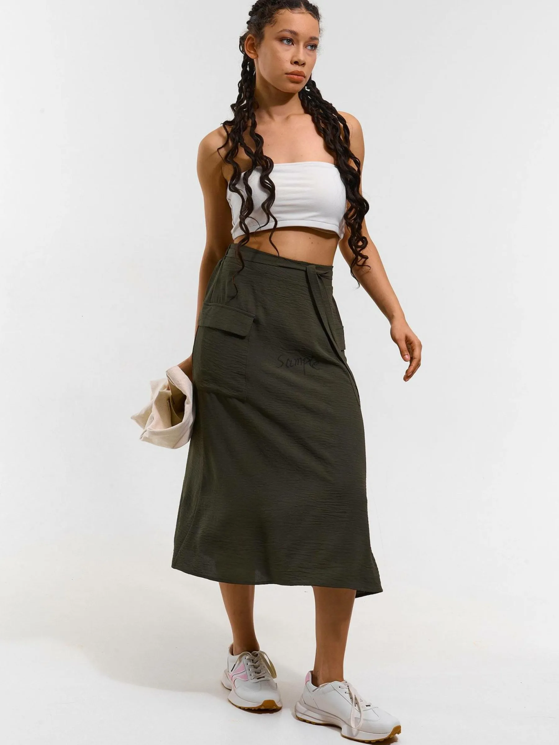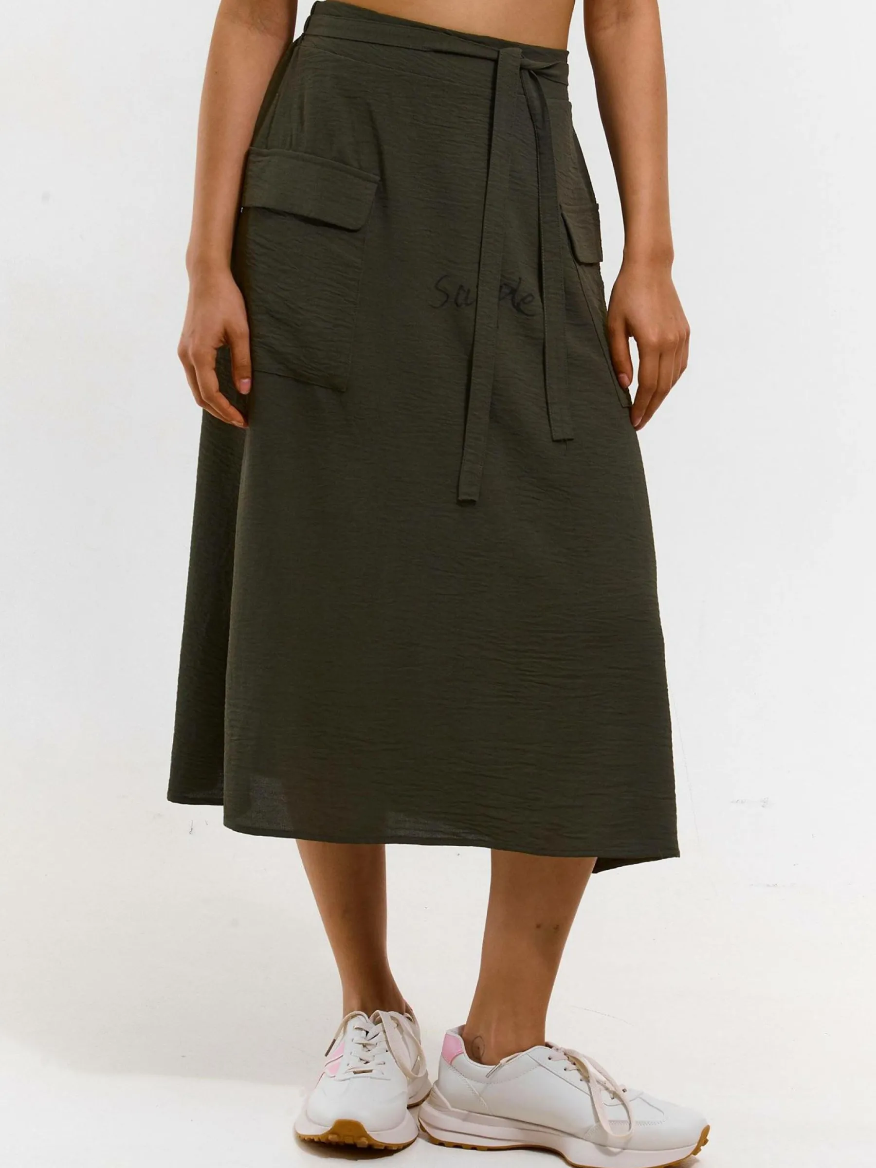 Kolor: khakiKrój: regularTyp: spódnicaDługość: midiPattern style: pojedynczy kolorDetal: z paskiemMateriał: syntet…
