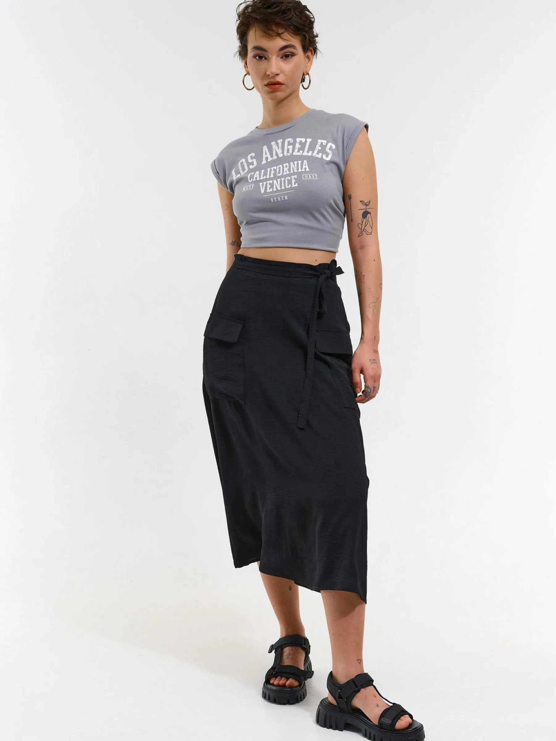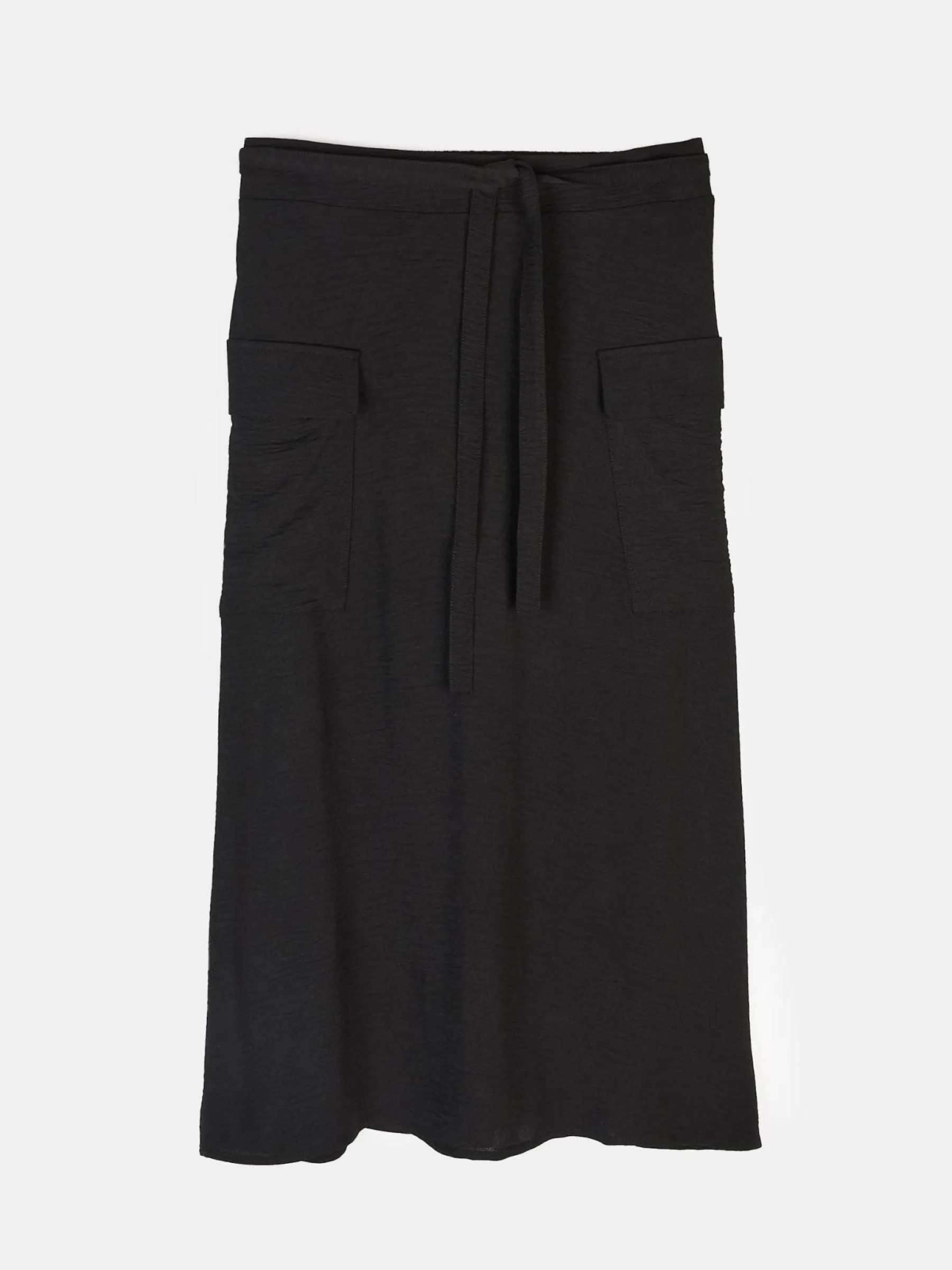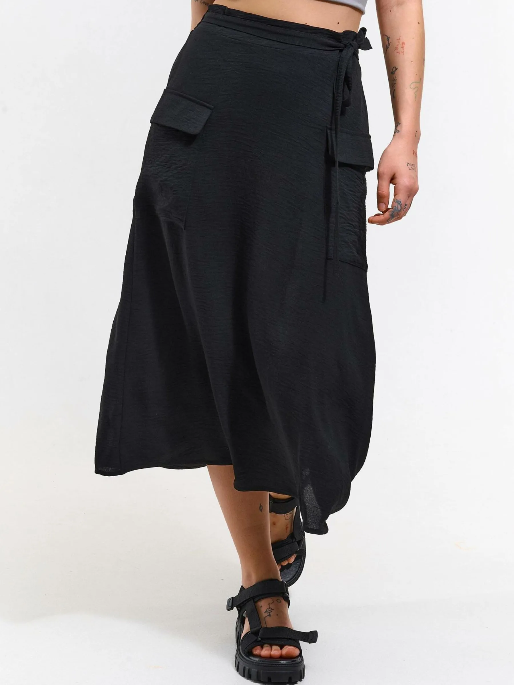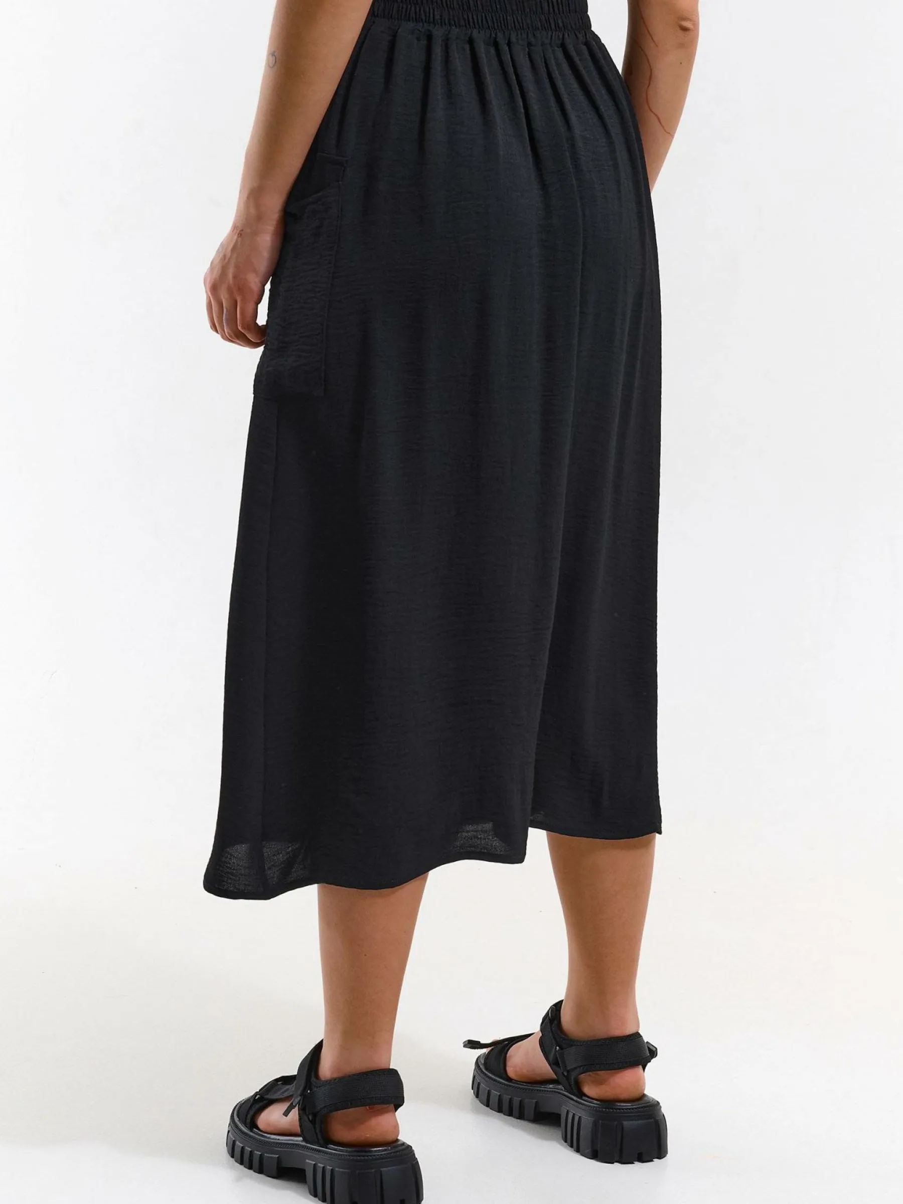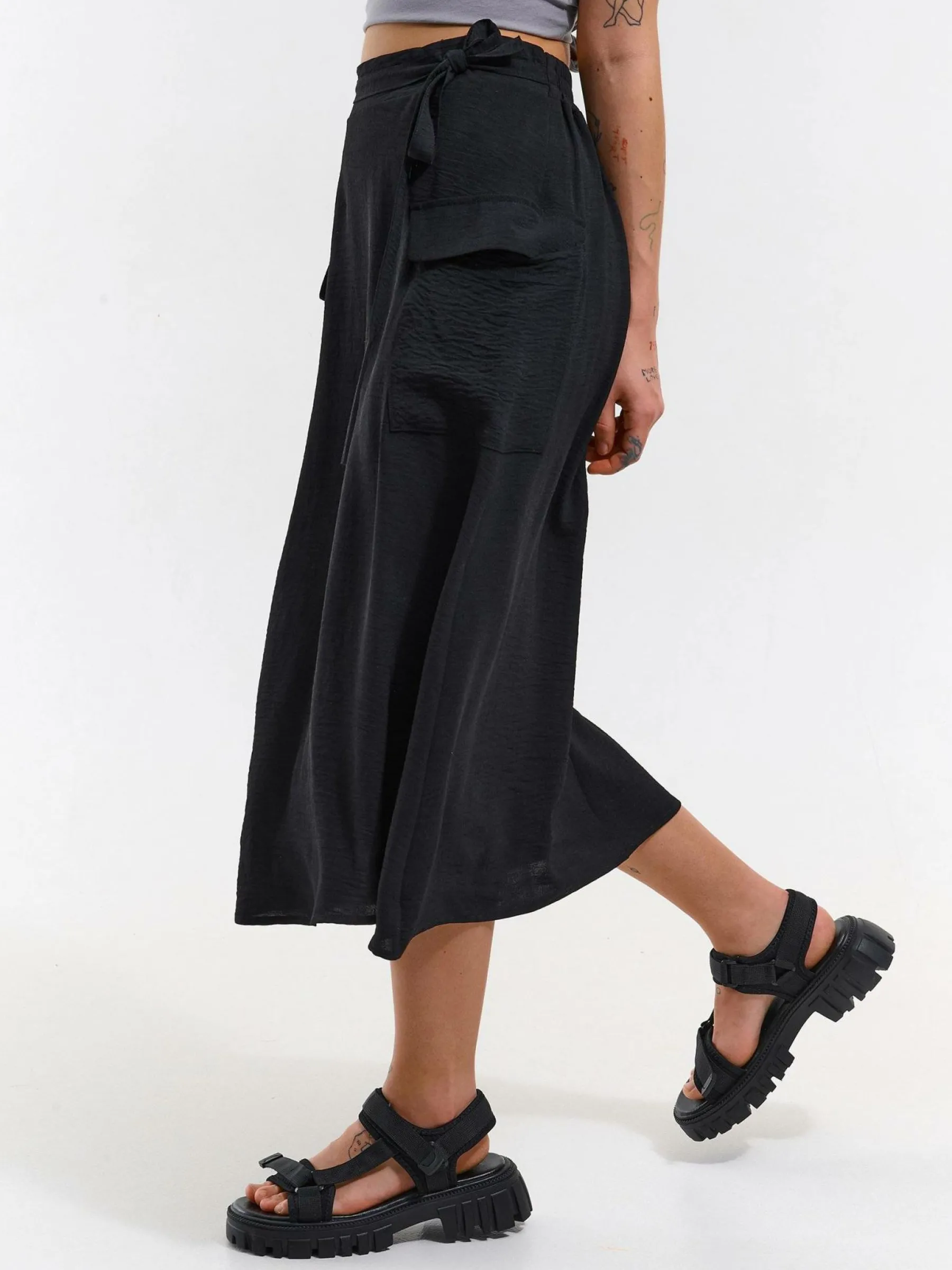 Kolor: czarnyKrój: regularTyp: spódnicaDługość: midiPattern style: pojedynczy kolorDetal: z paskiemMateriał: synte…