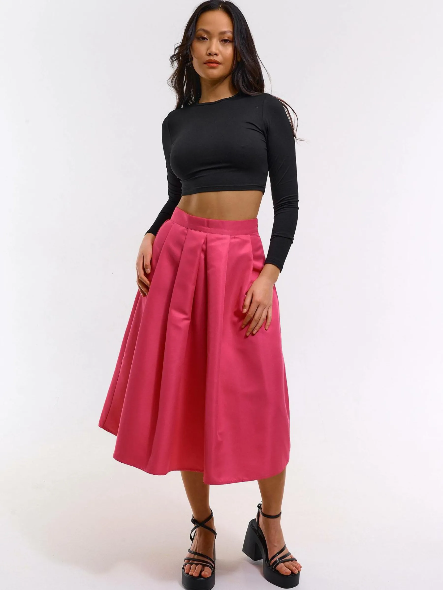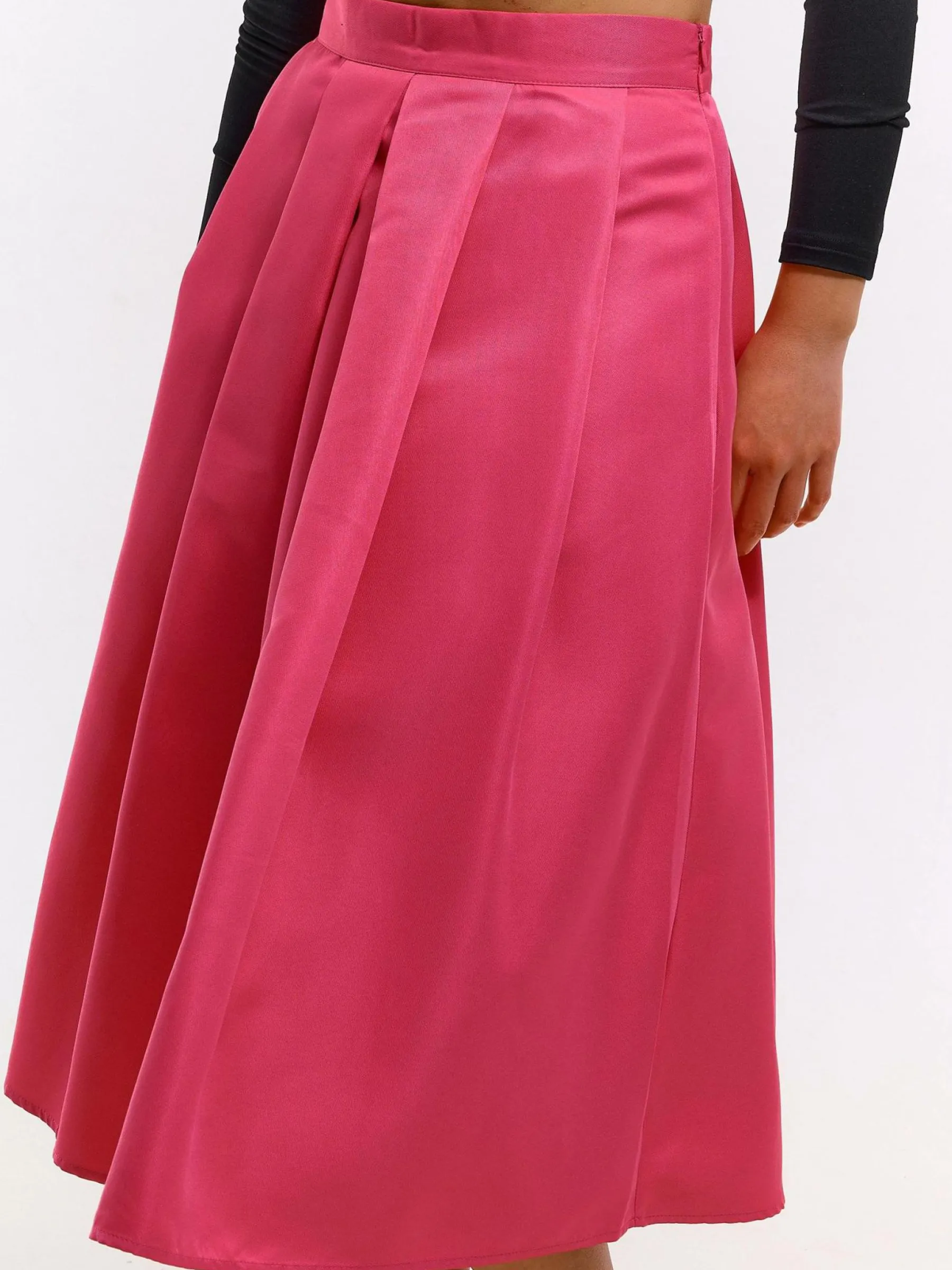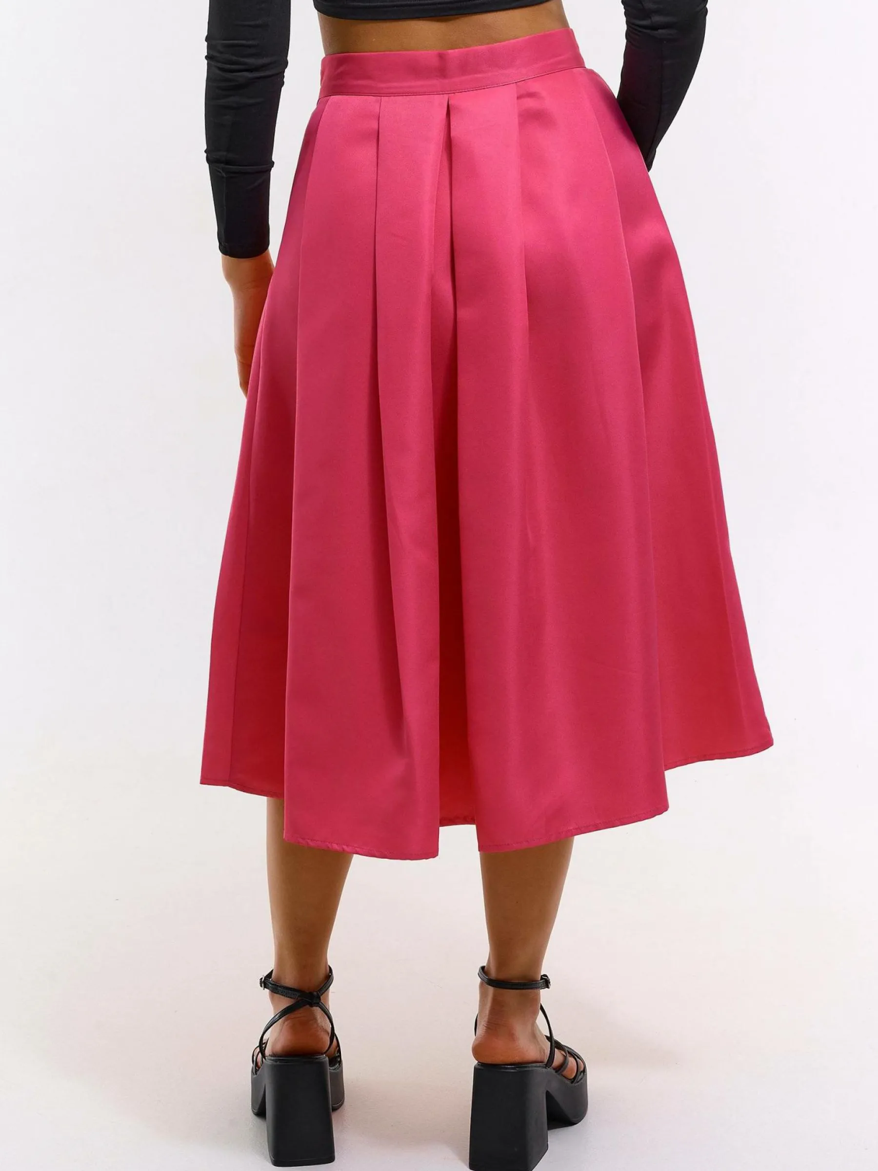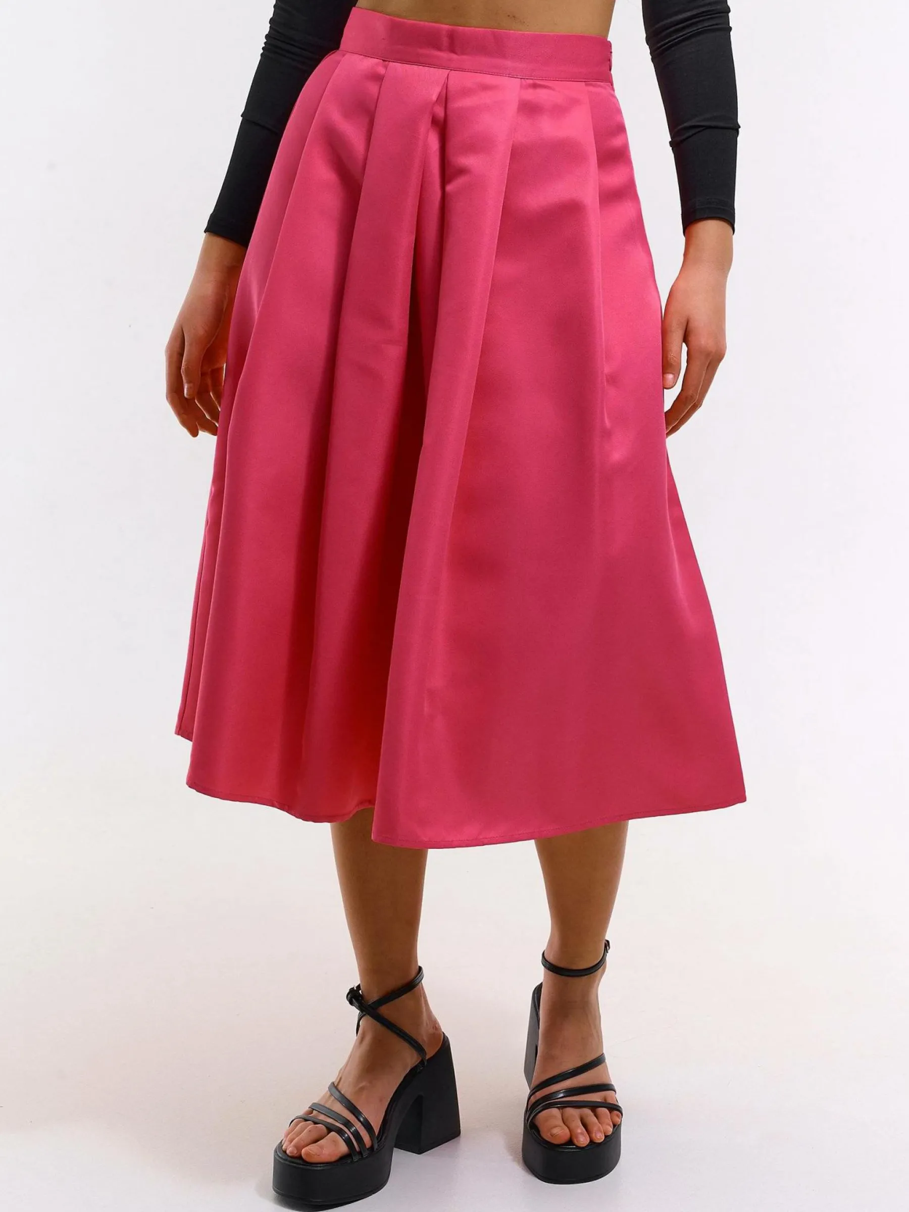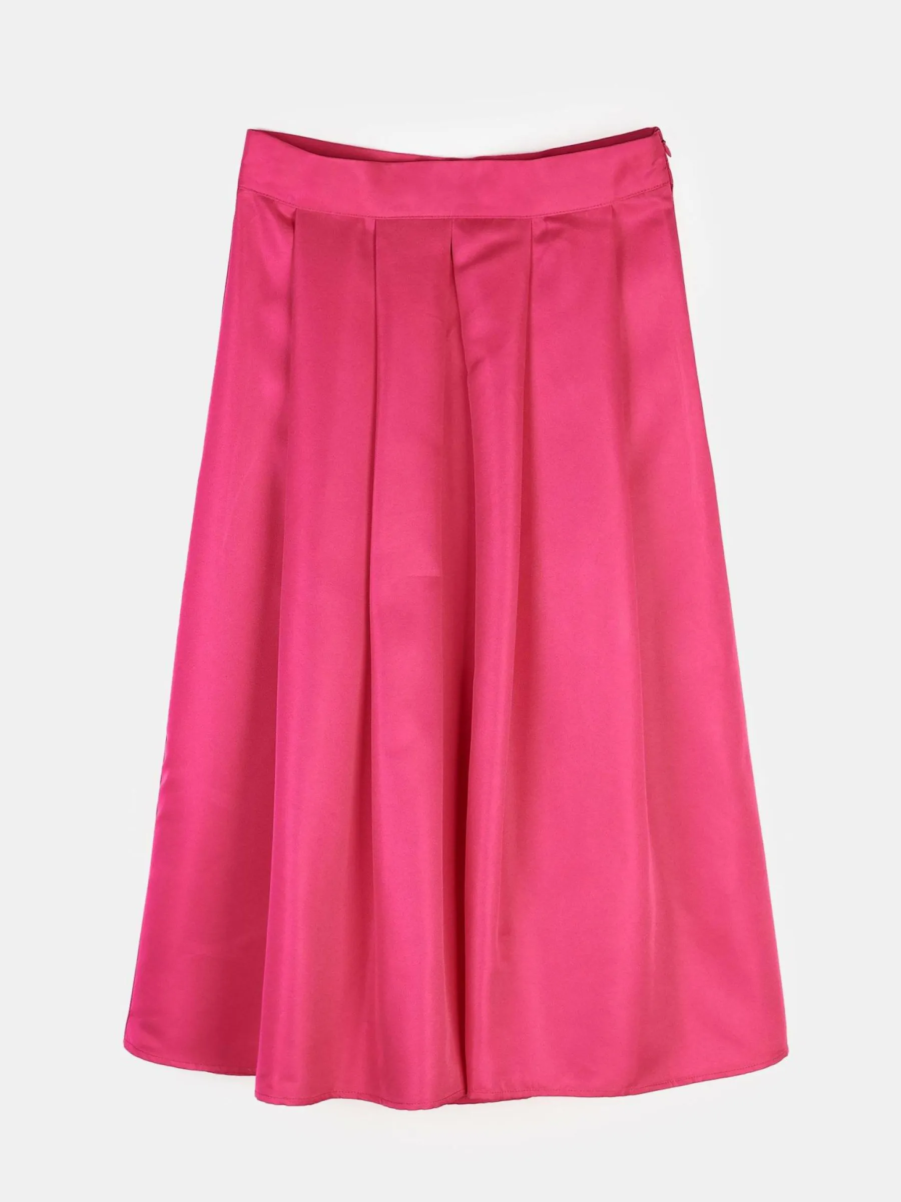 Kolor: różowyKrój: dzwonTyp: spódnicaDługość: midiPattern style: pojedynczy kolorDetal: na zamekMateriał: syntet…