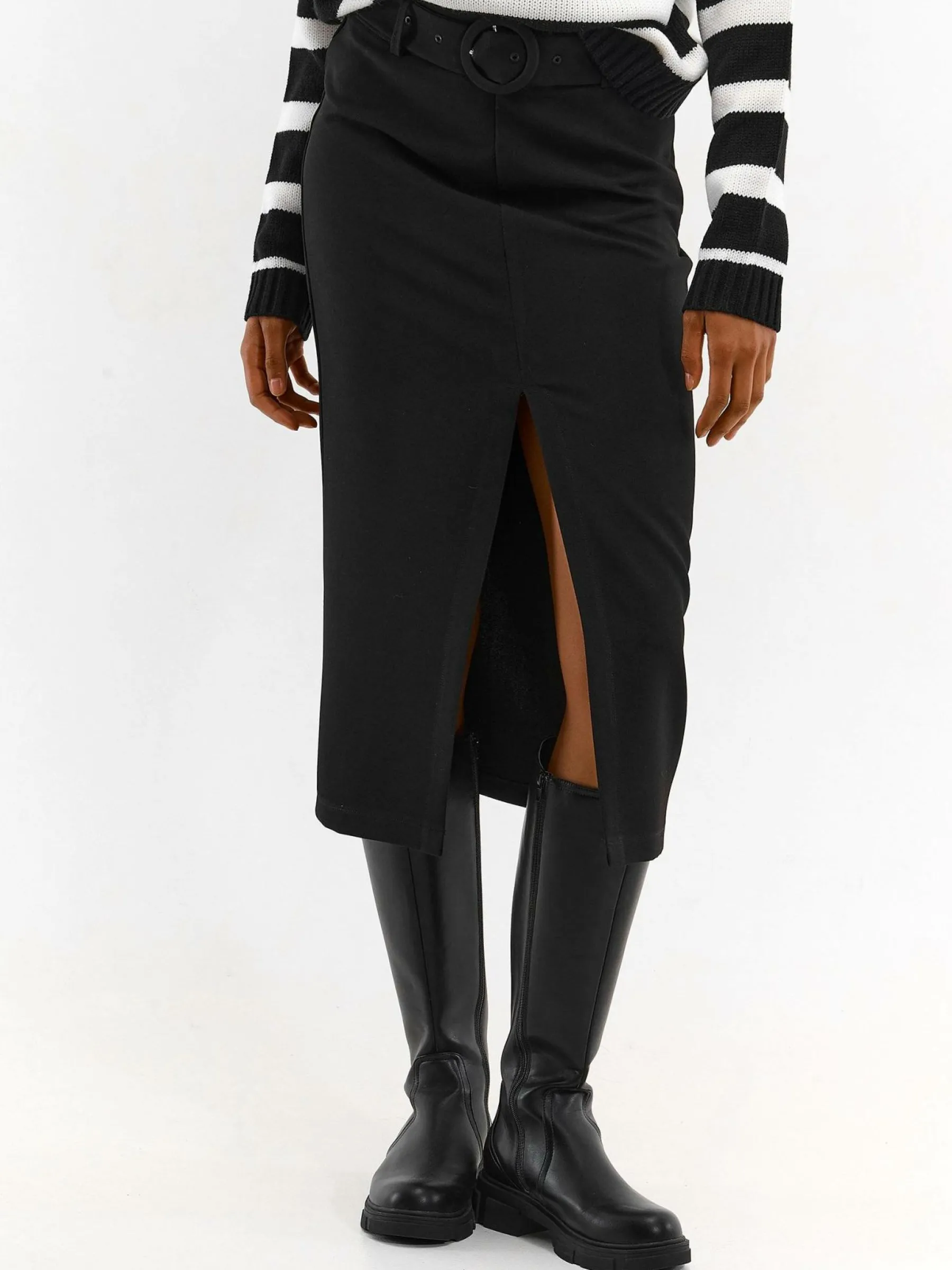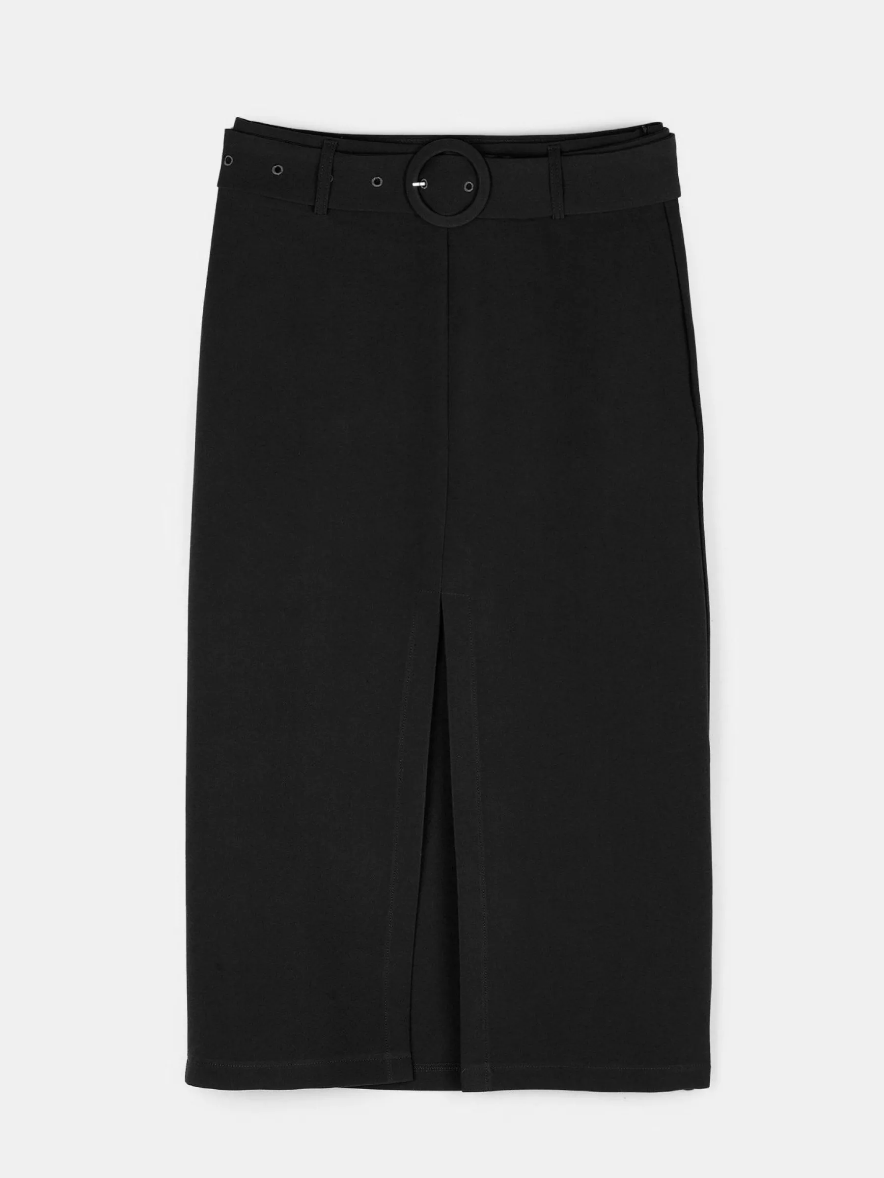 Kolor: czarnyKrój: z wysokim stanemTyp: spódnicaDługość: midiPattern style: pojedynczy kolorDetal: z paskiem, na za…
