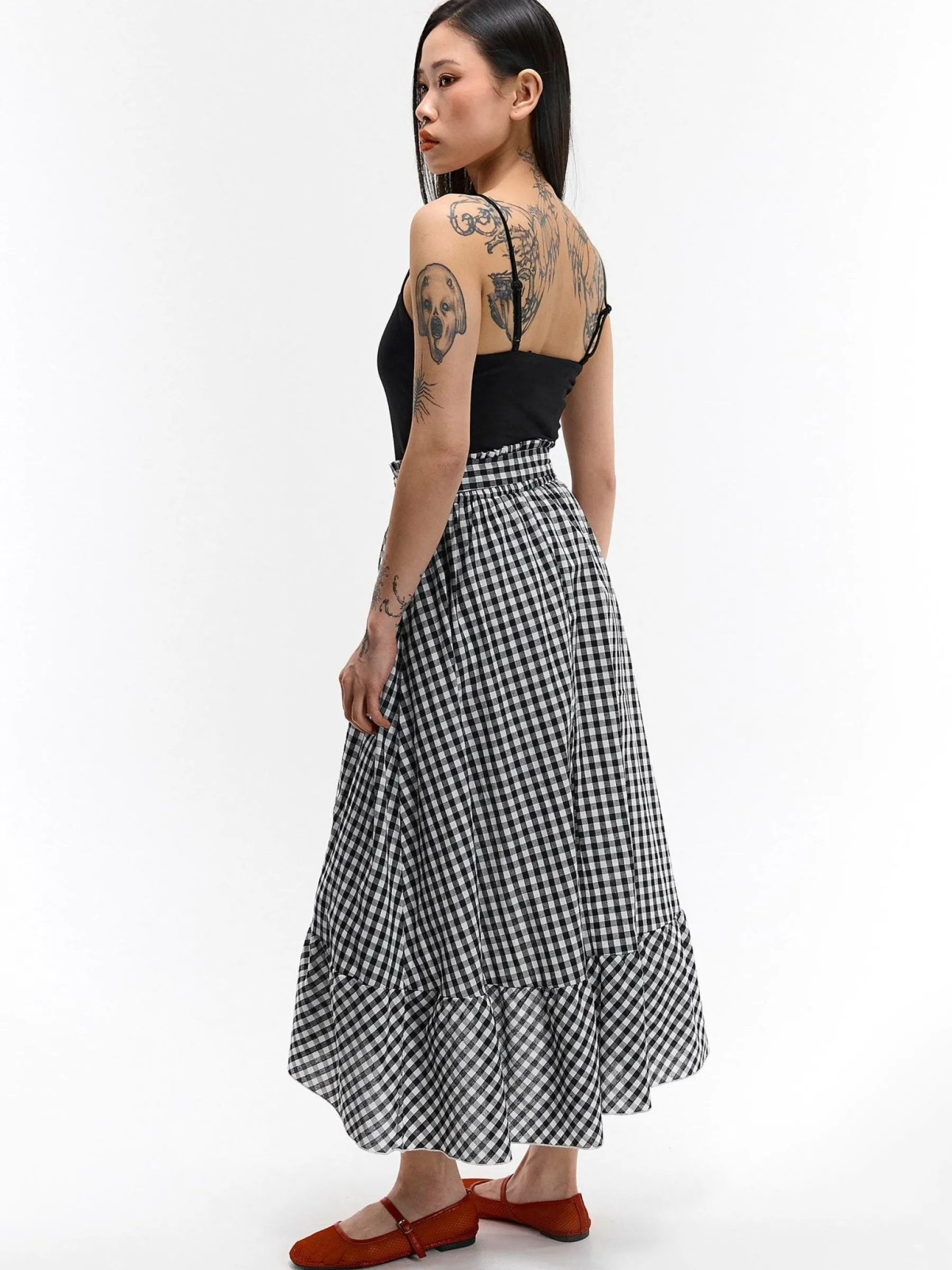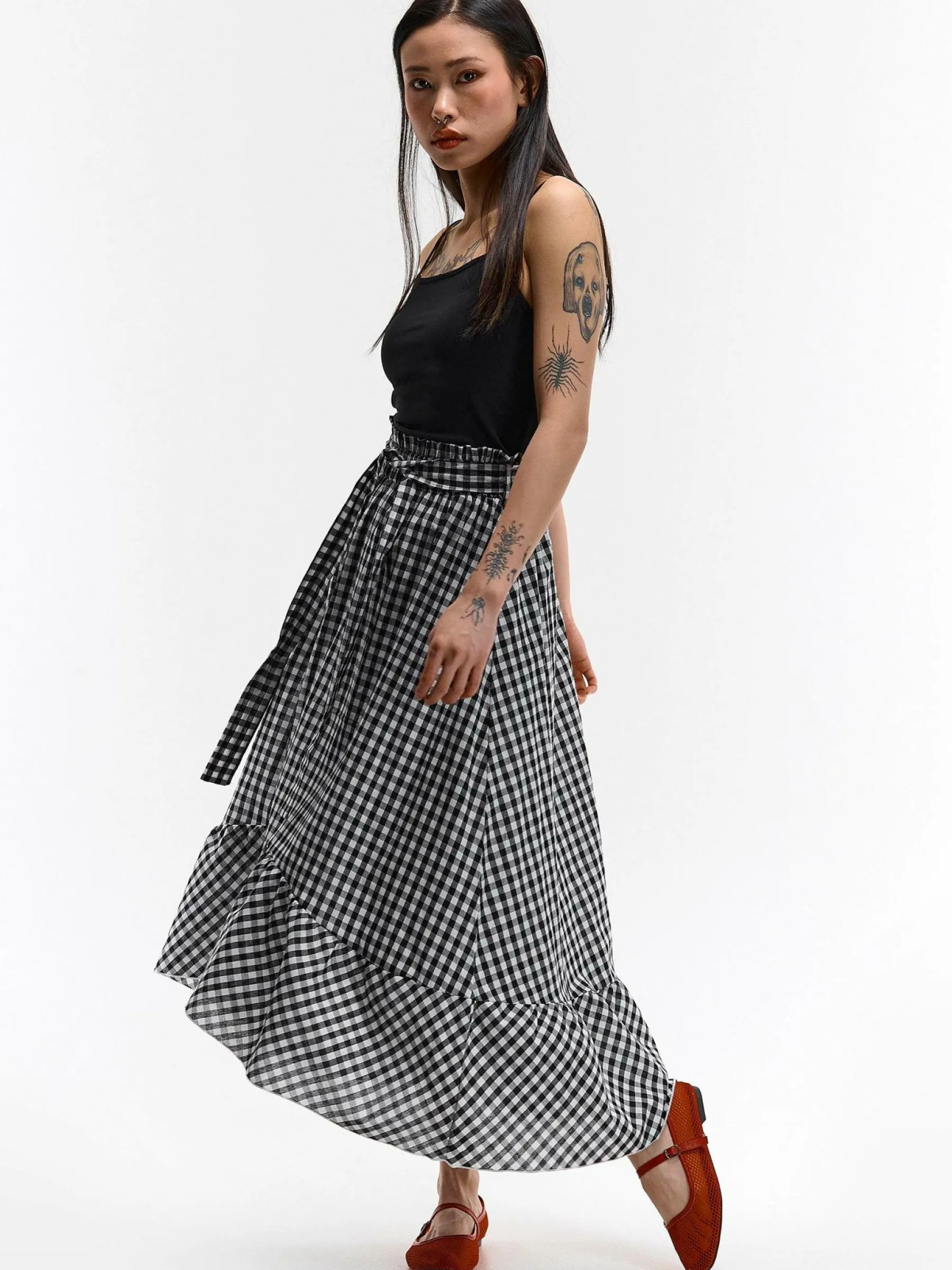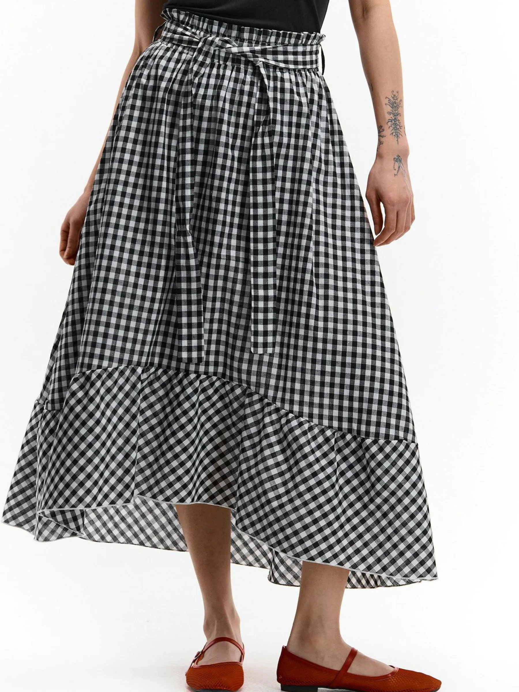 Kolor: czarnyKrój: z falbaną, asymetryczneTyp: spódnicaDługość: midiPattern style: w kratkęDetal: z paskiem, z el…