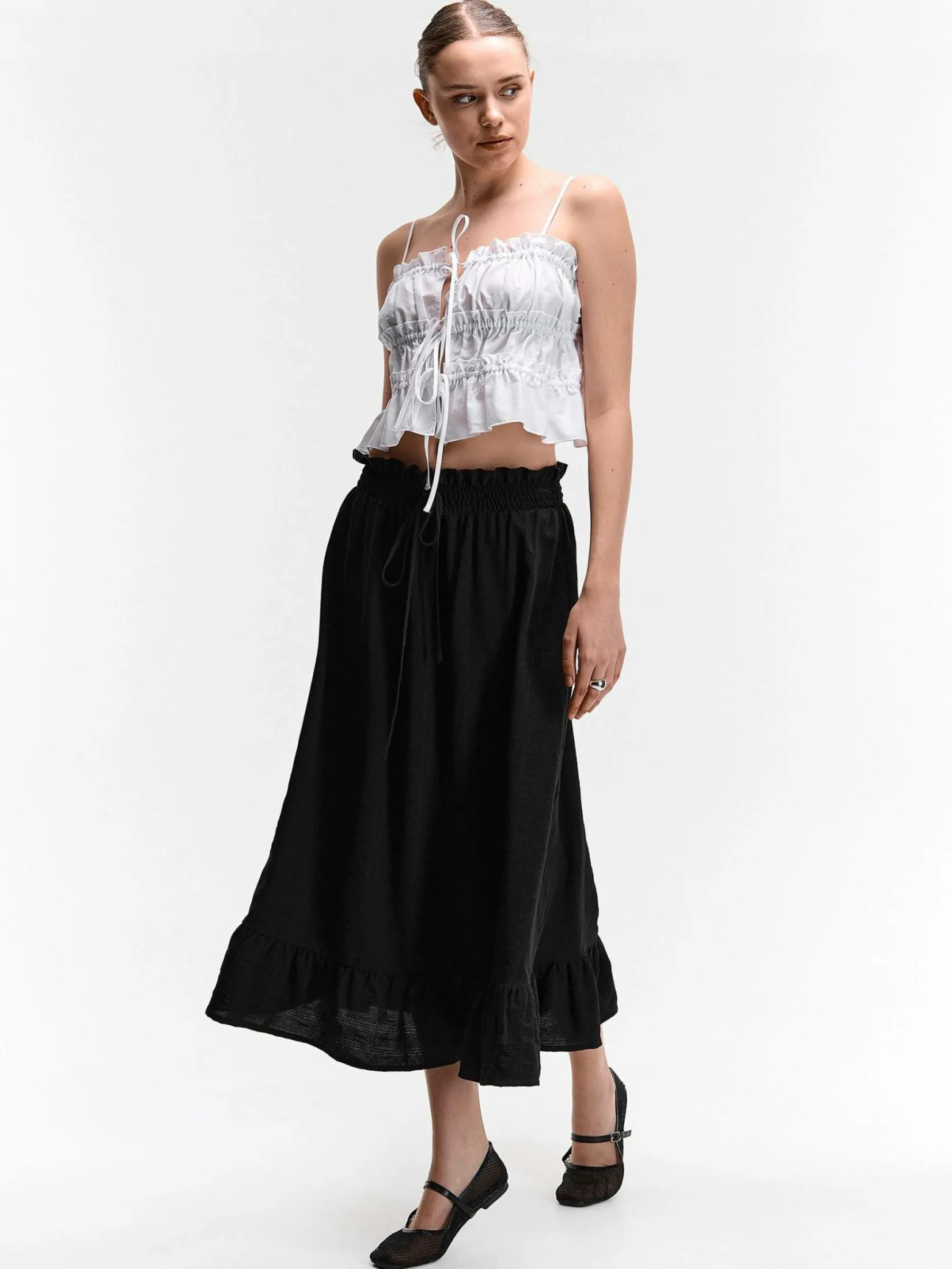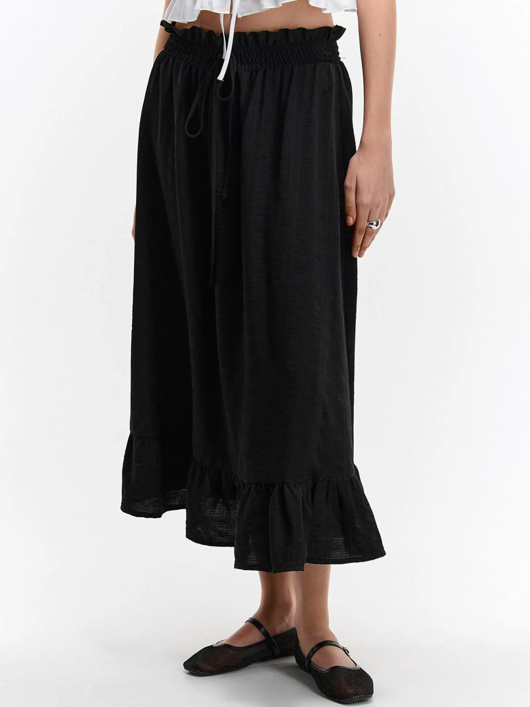 Kolor: czarnyKrój: z falbanąTyp: spódnicaDługość: midiPattern style: pojedynczy kolorDetal: z elastyczną opaskąM…