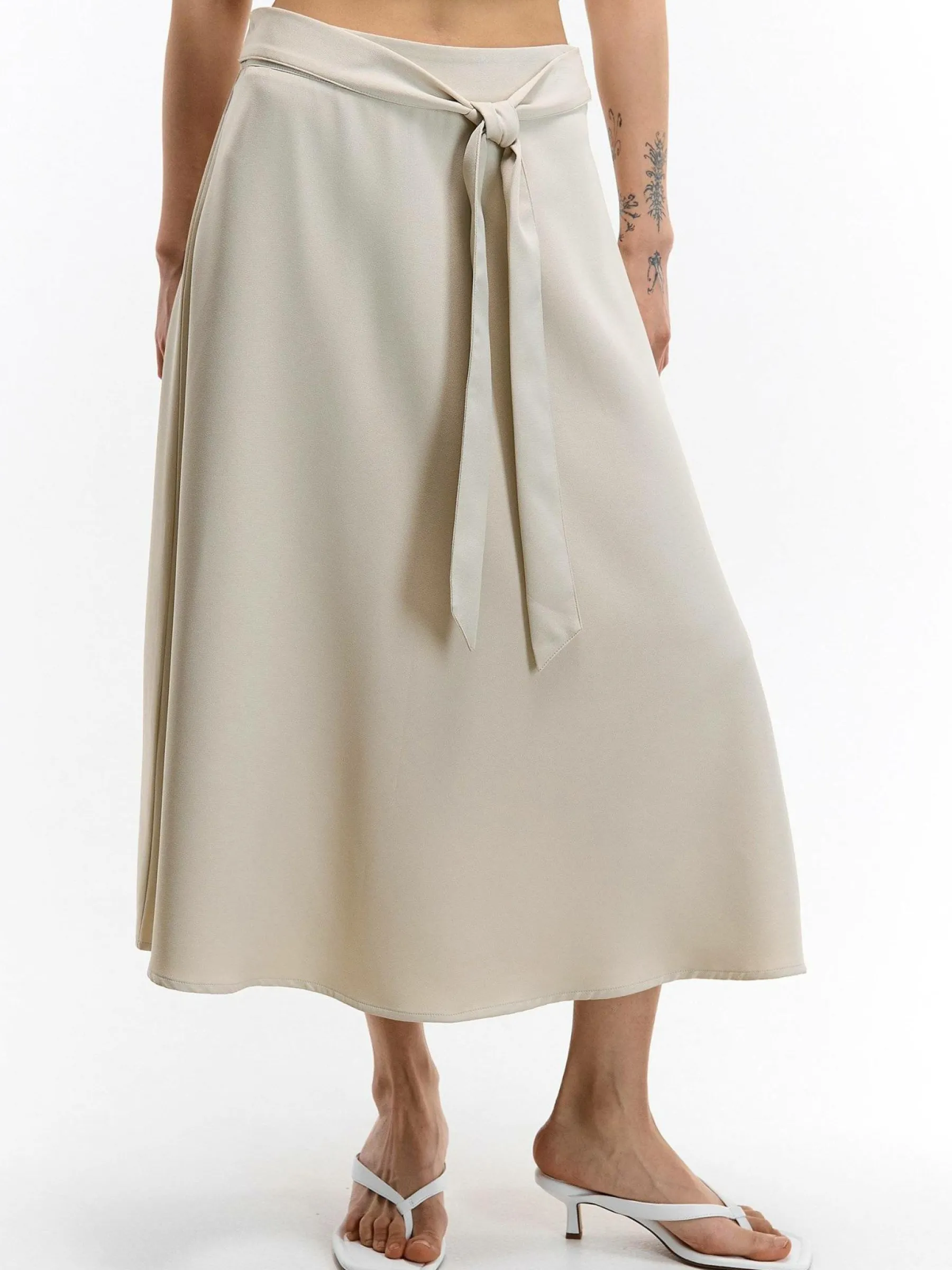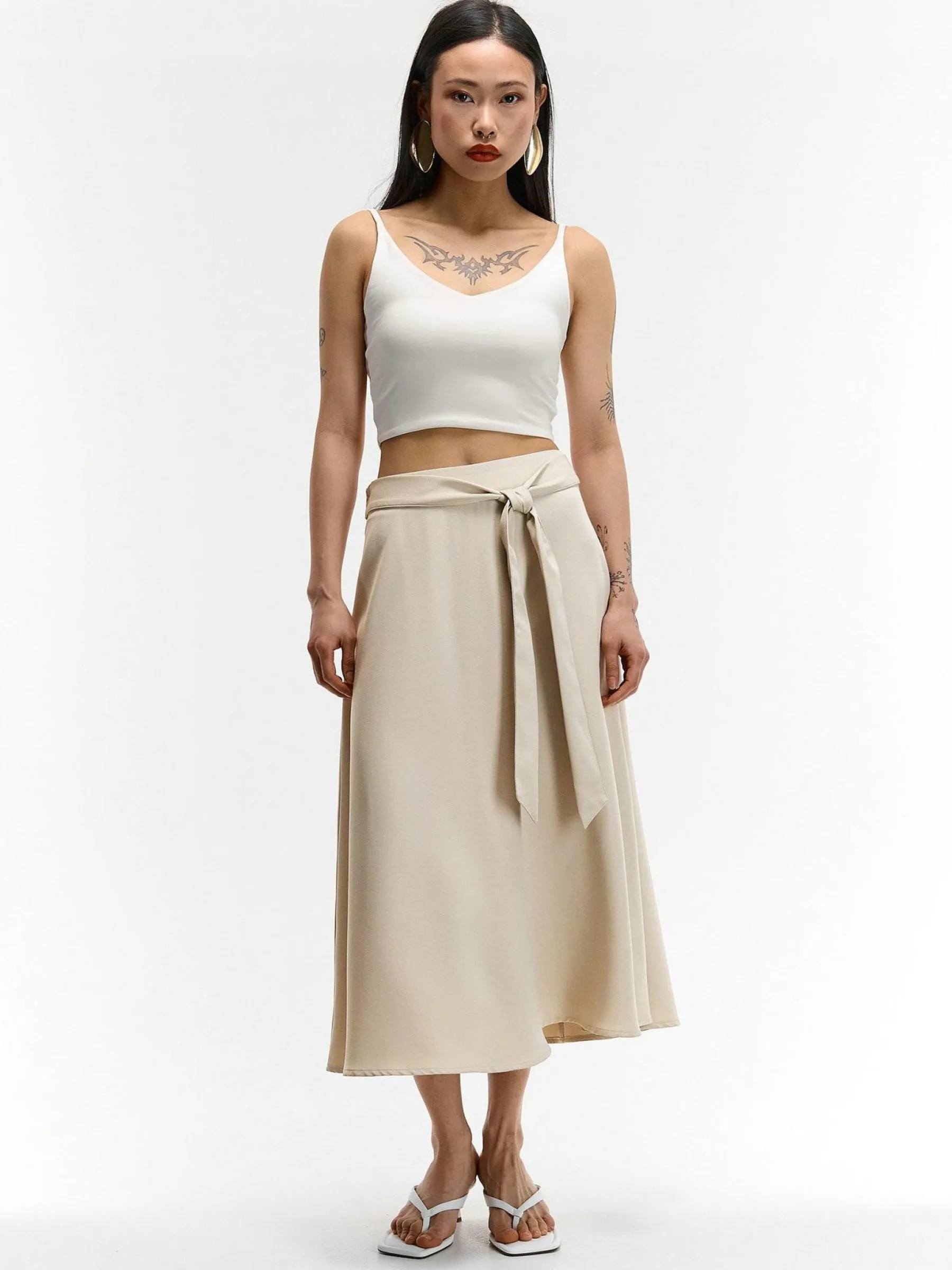 Kolor: beżowyKrój: asyTyp: spódnicaDługość: midiPattern style: pojedynczy kolorDetal: na zamek, z kokardkąMateria…