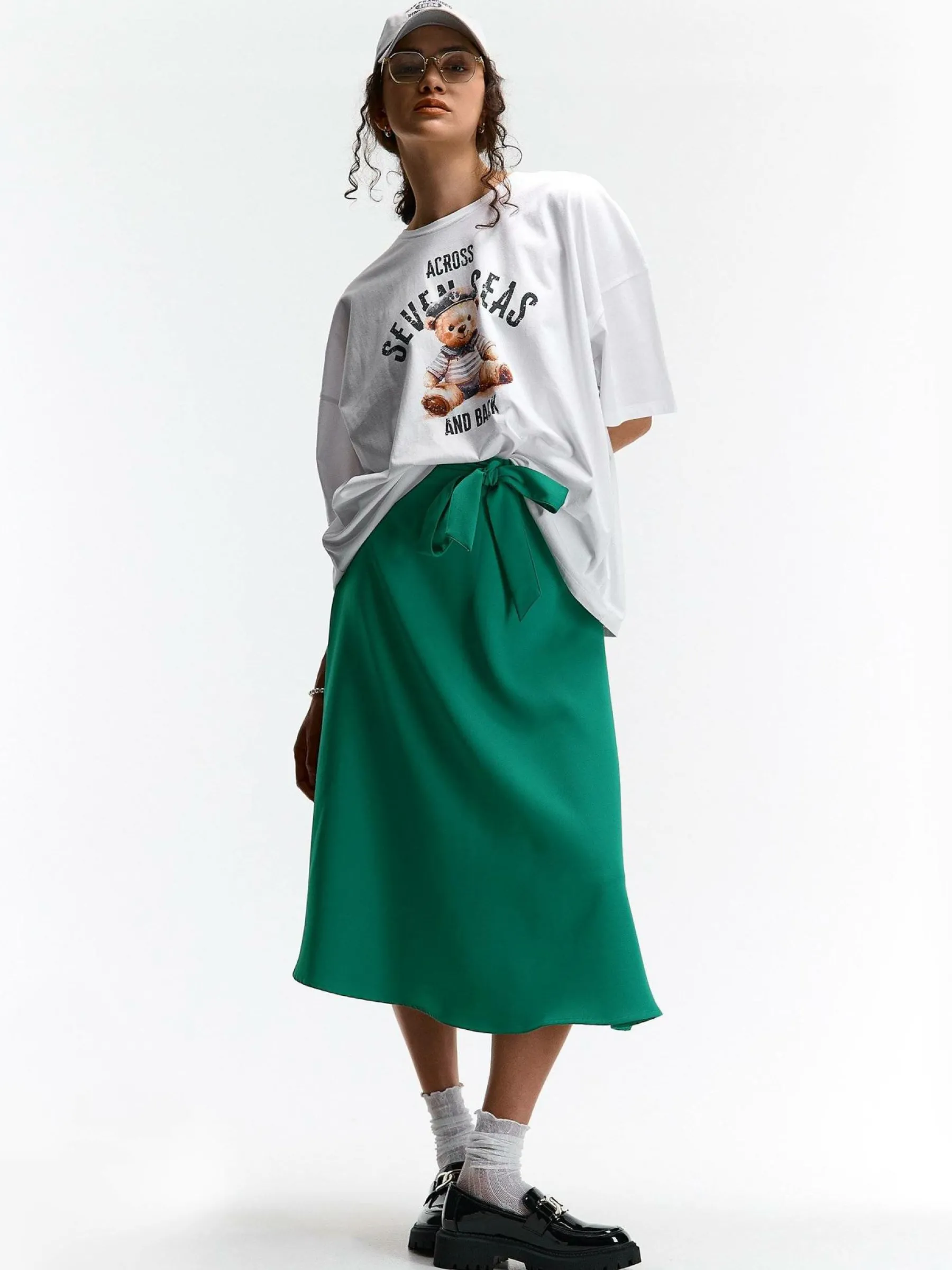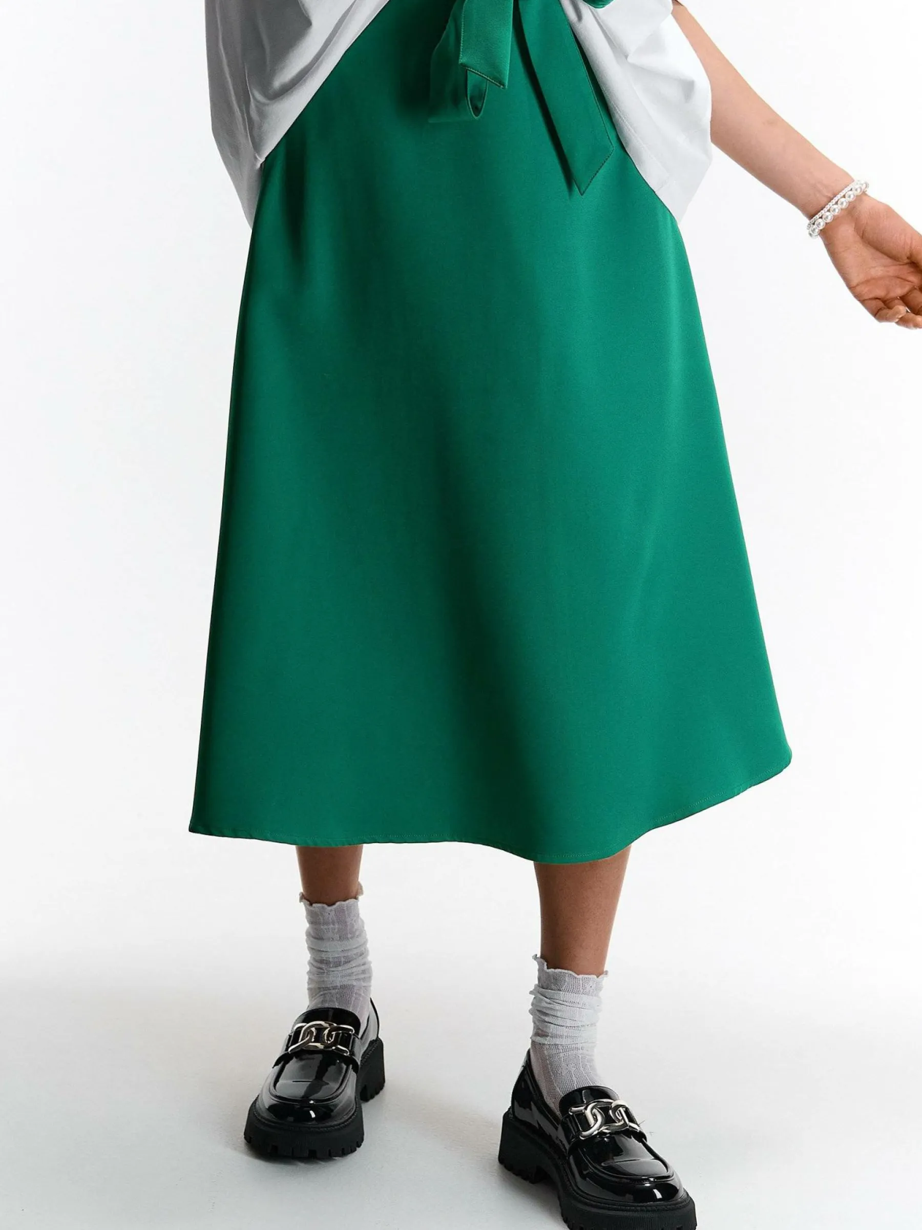 Kolor: zielonyKrój: asyTyp: spódnicaDługość: midiPattern style: pojedynczy kolorDetal: na zamek, z kokardkąMateria…