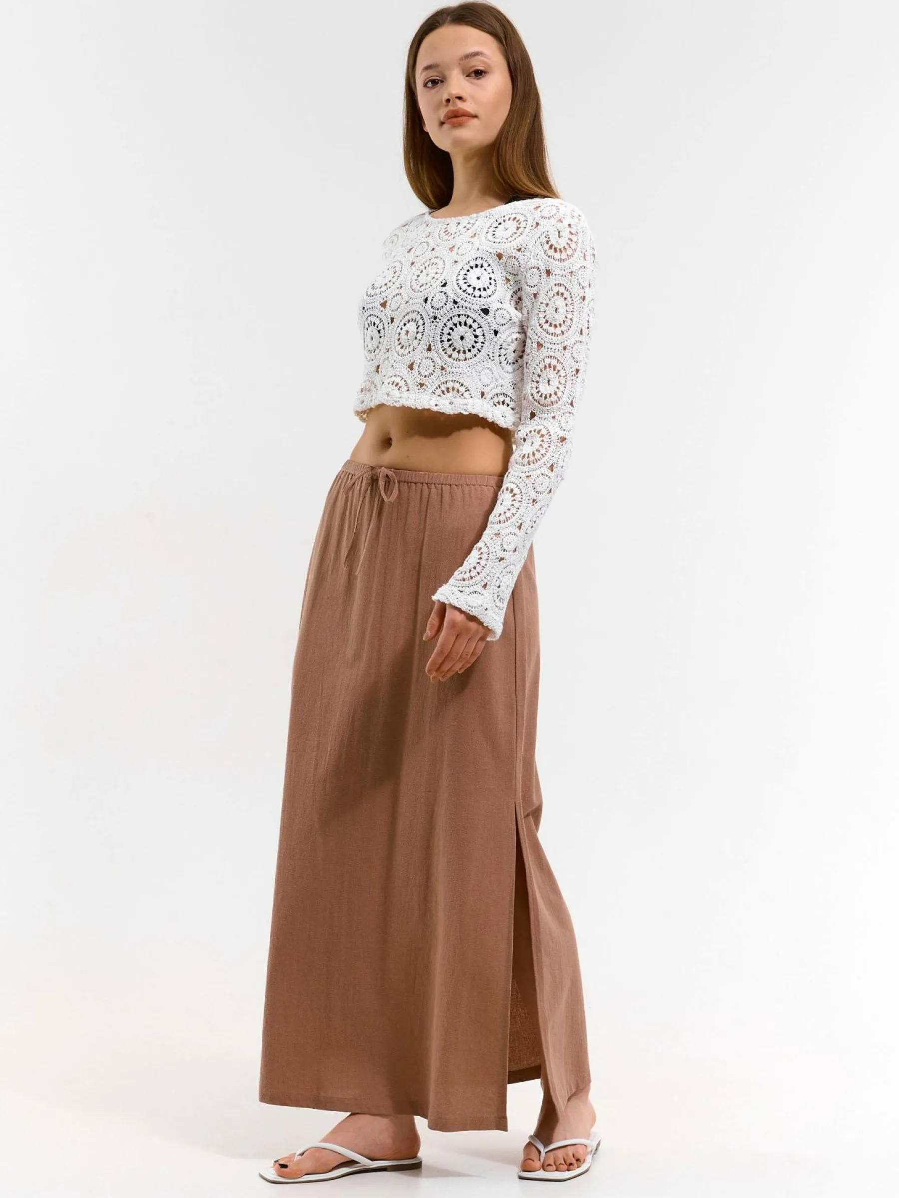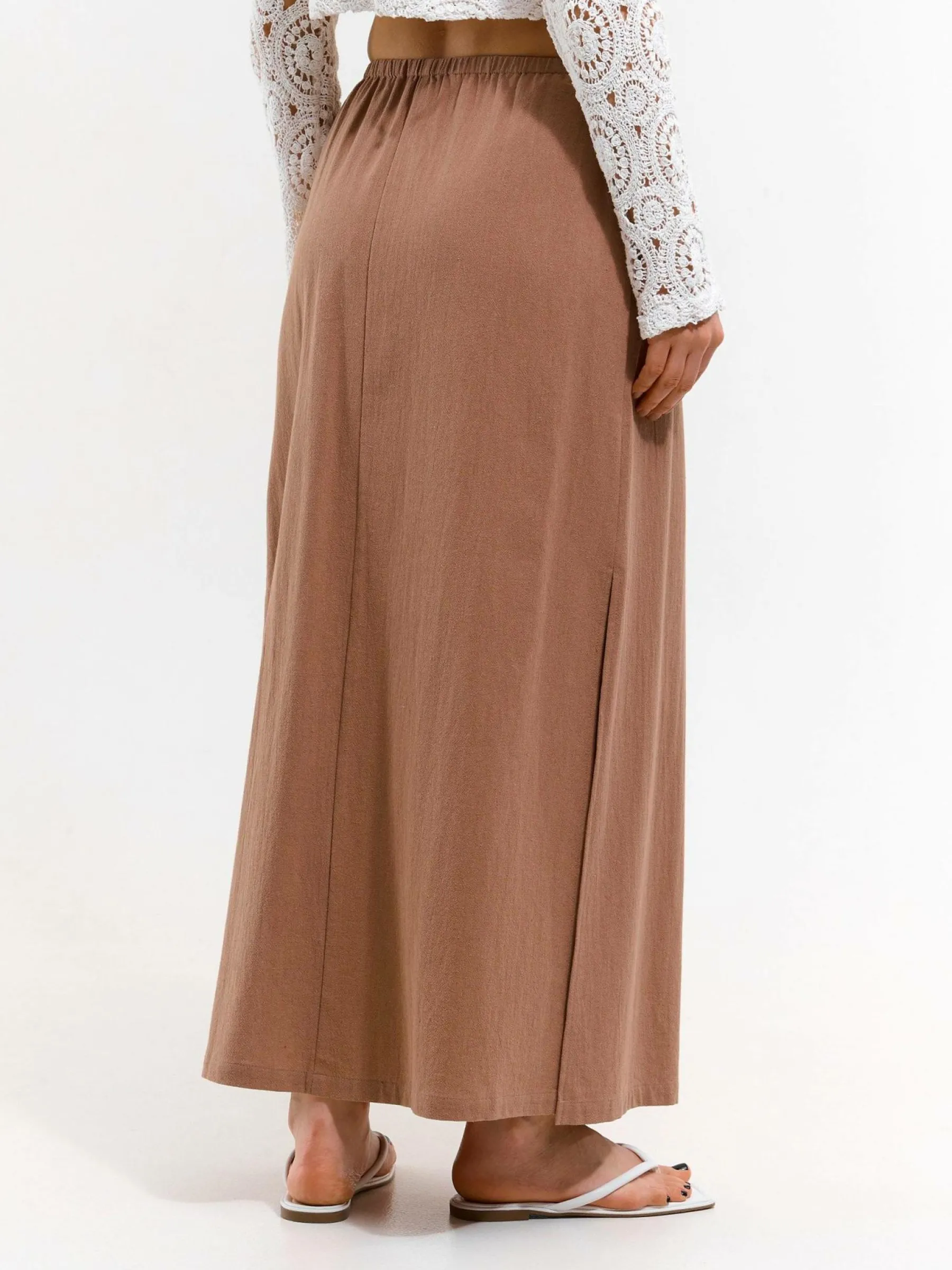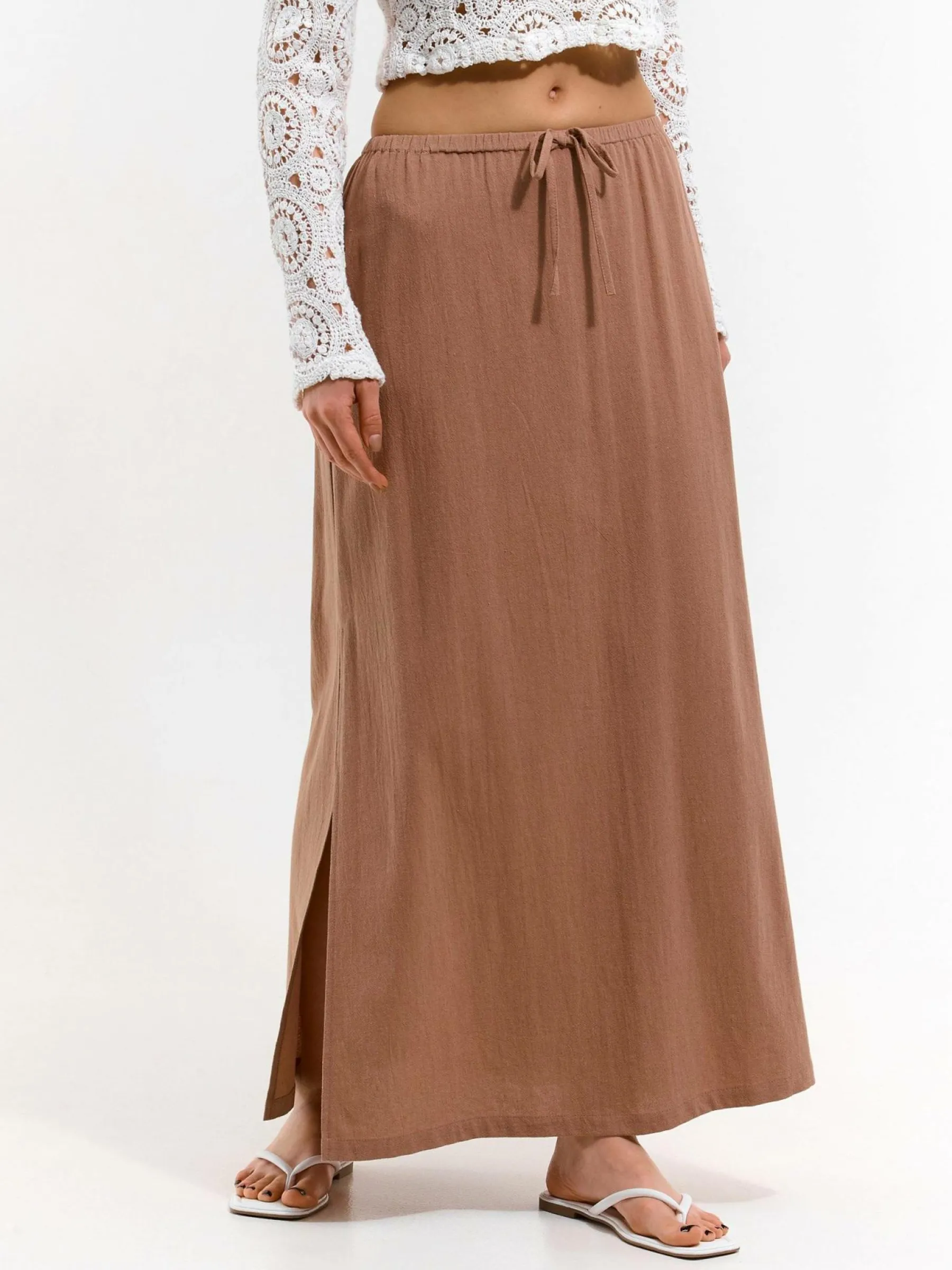 Kolor: beżowy, brązowyKrój: regularTyp: spódnicaDługość: maxiPattern style: pojedynczy kolorDetal: ze sznurowanie…