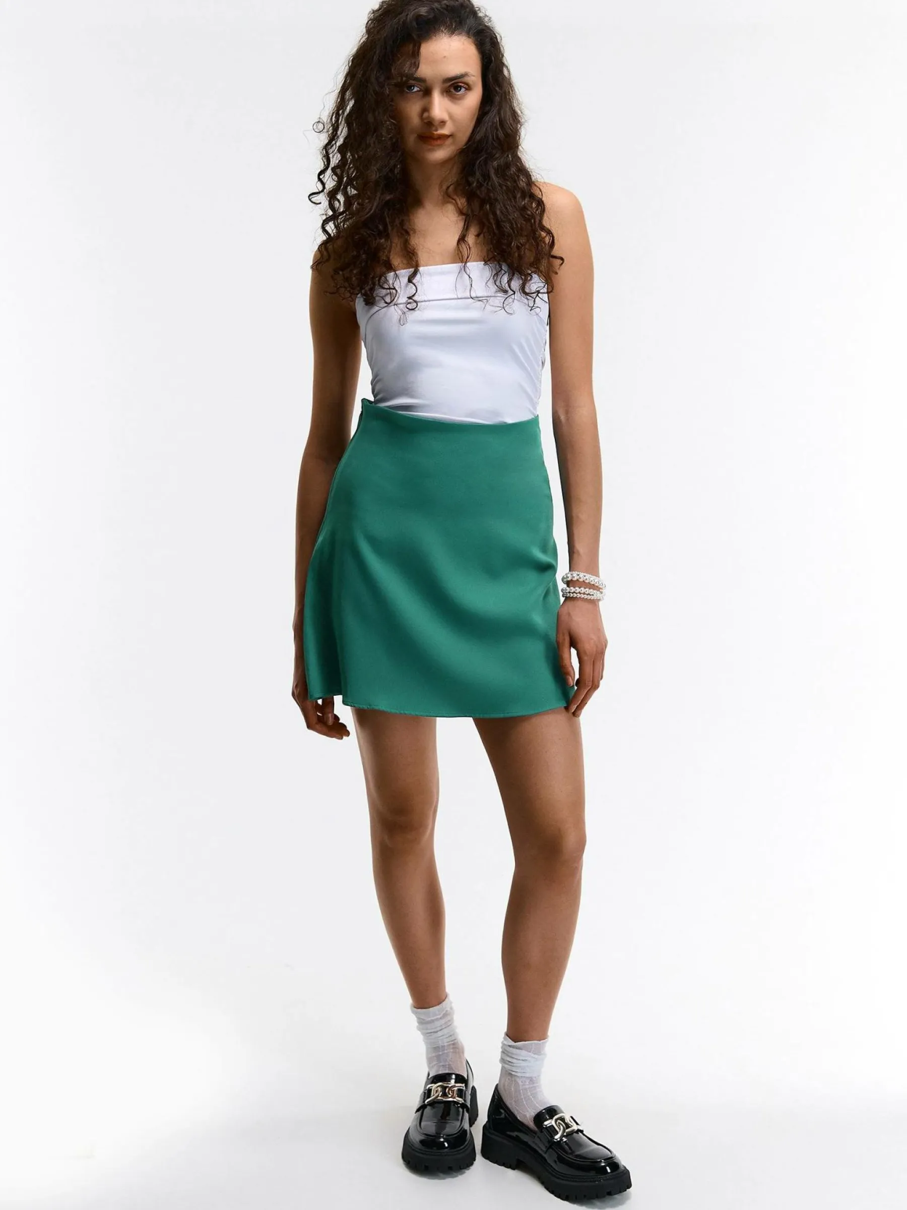 Kolor: zielonyKrój: asyTyp: spódnicaDługość: miniPattern style: pojedynczy kolorDetal: na zamekMateriał: syntetycz…