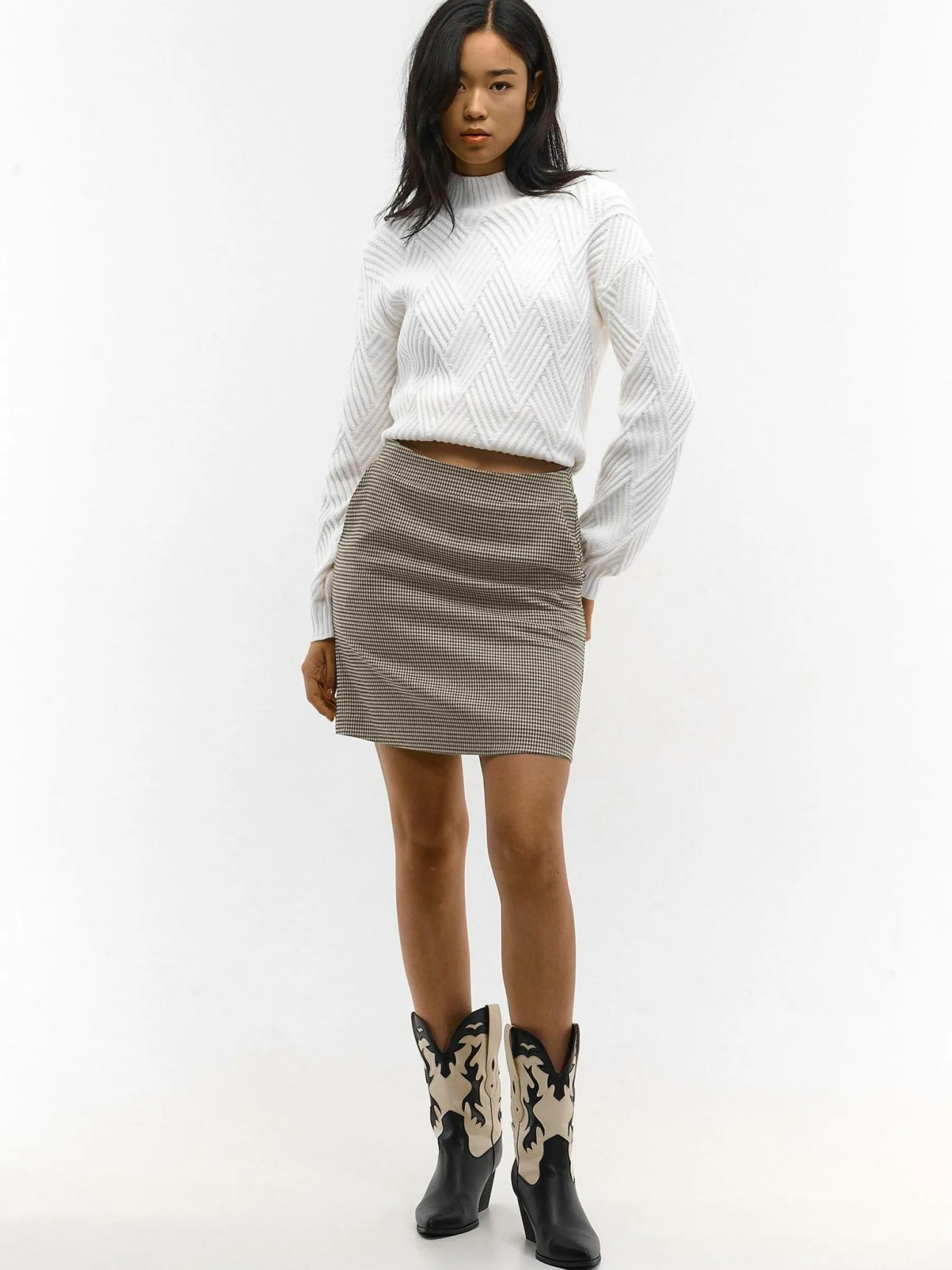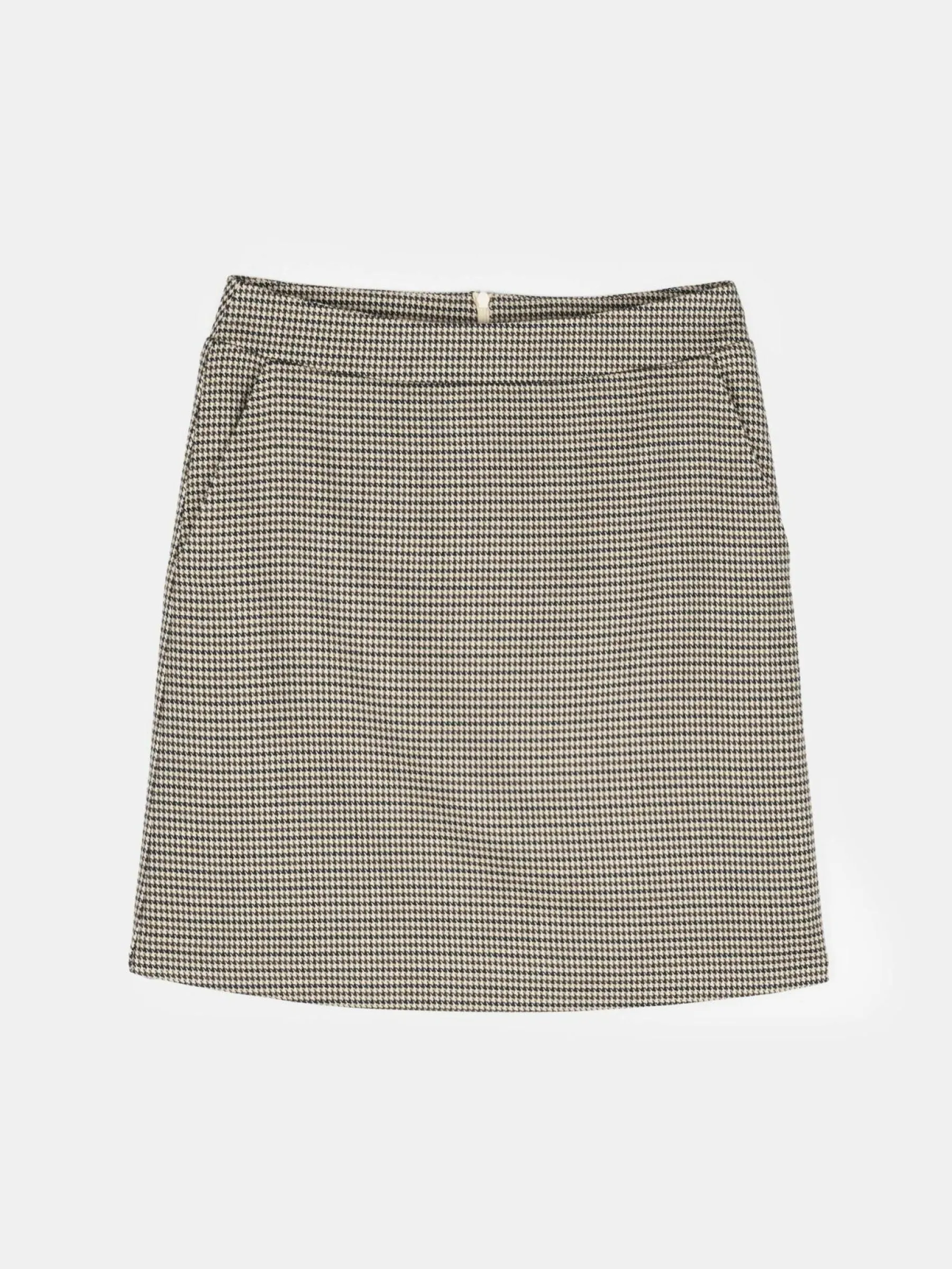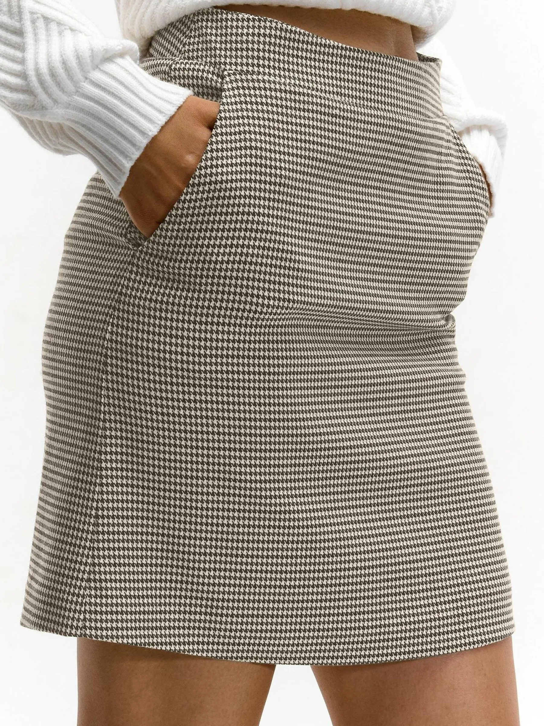 Kolor: brązowyKrój: podstawowyTyp: spódnicaDługość: miniPattern style: houndstoothDetal: z kieszeniami, na zamekMa…
