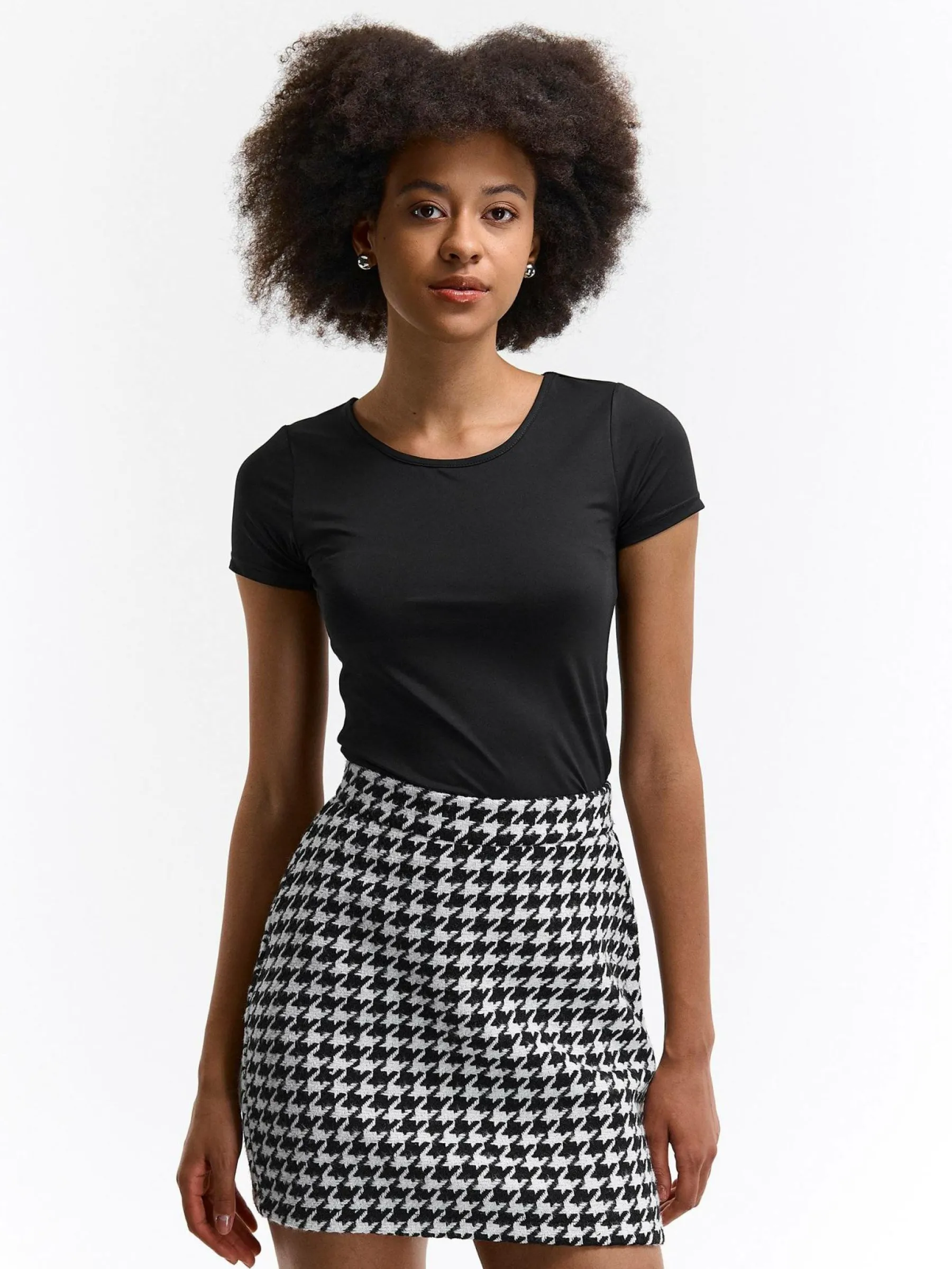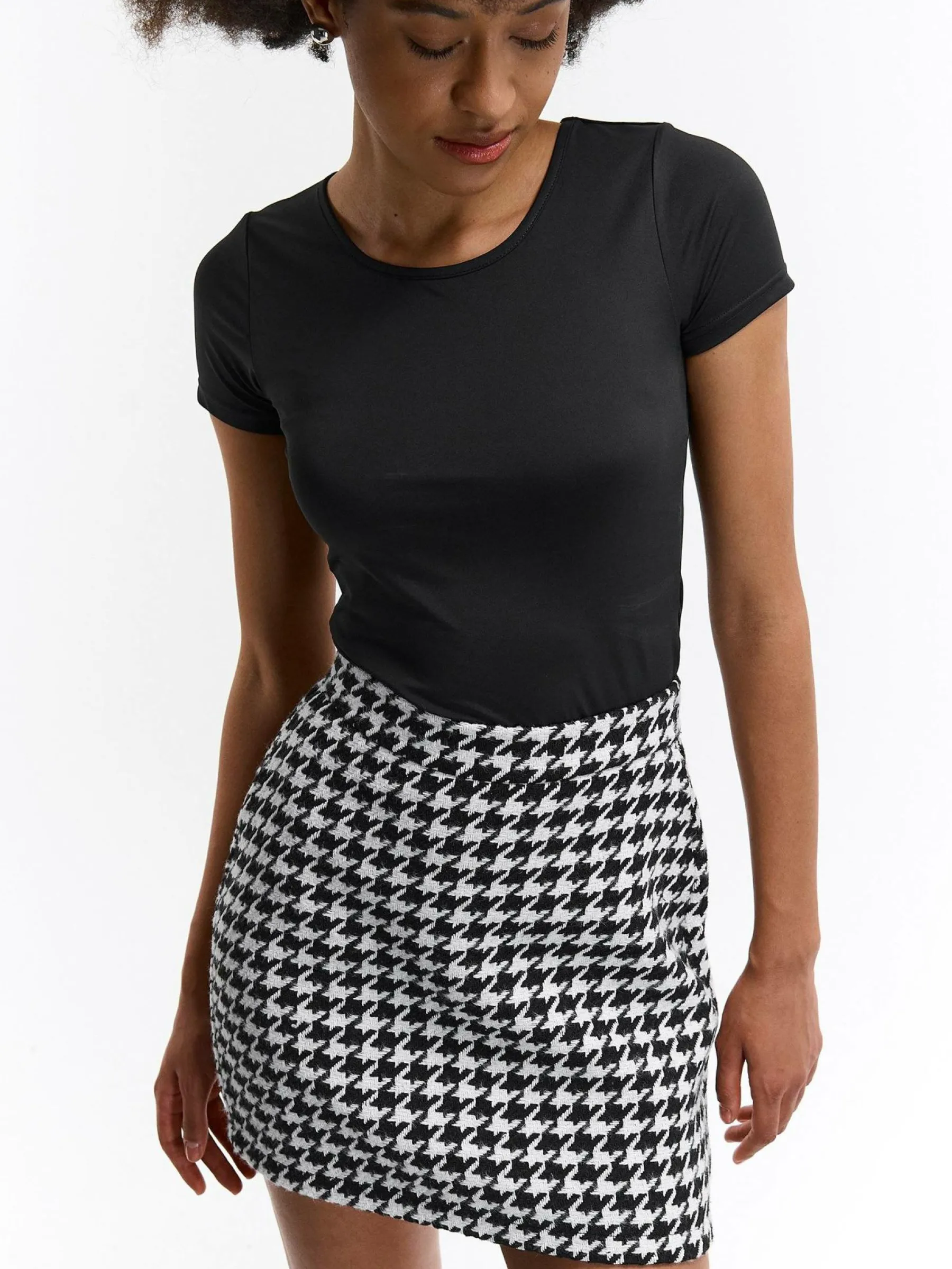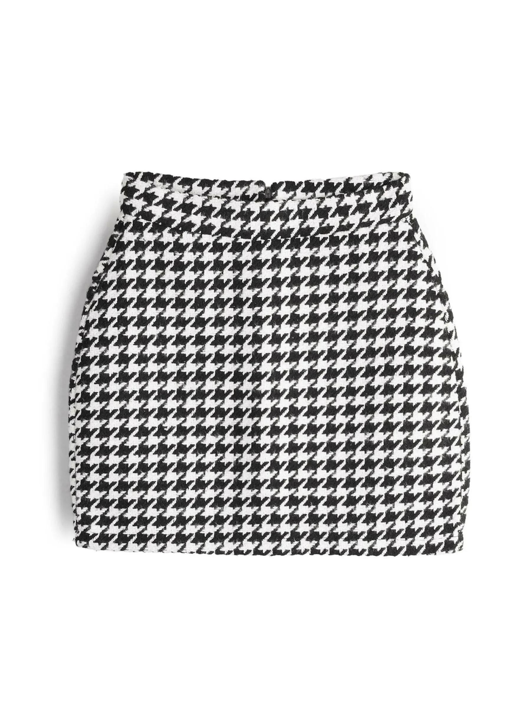 Kolor: czarnyKrój: ołówkoweTyp: spódnicaDługość: miniPattern style: z wzorem pepitaDetal: na zamekMateriał: synt…