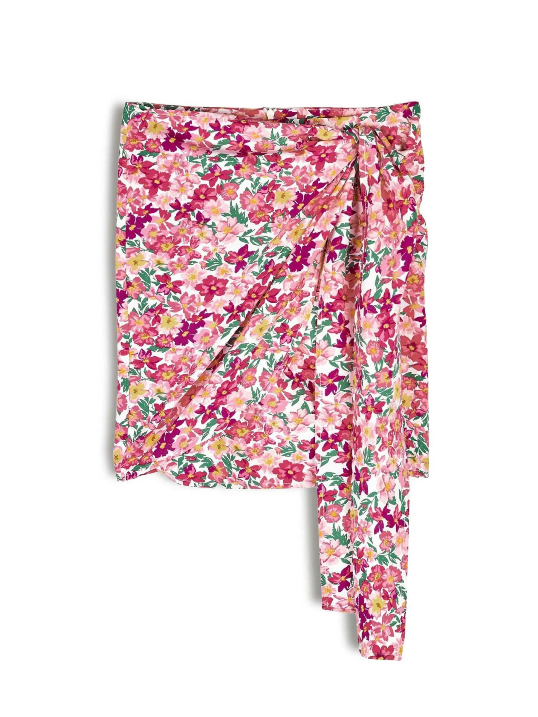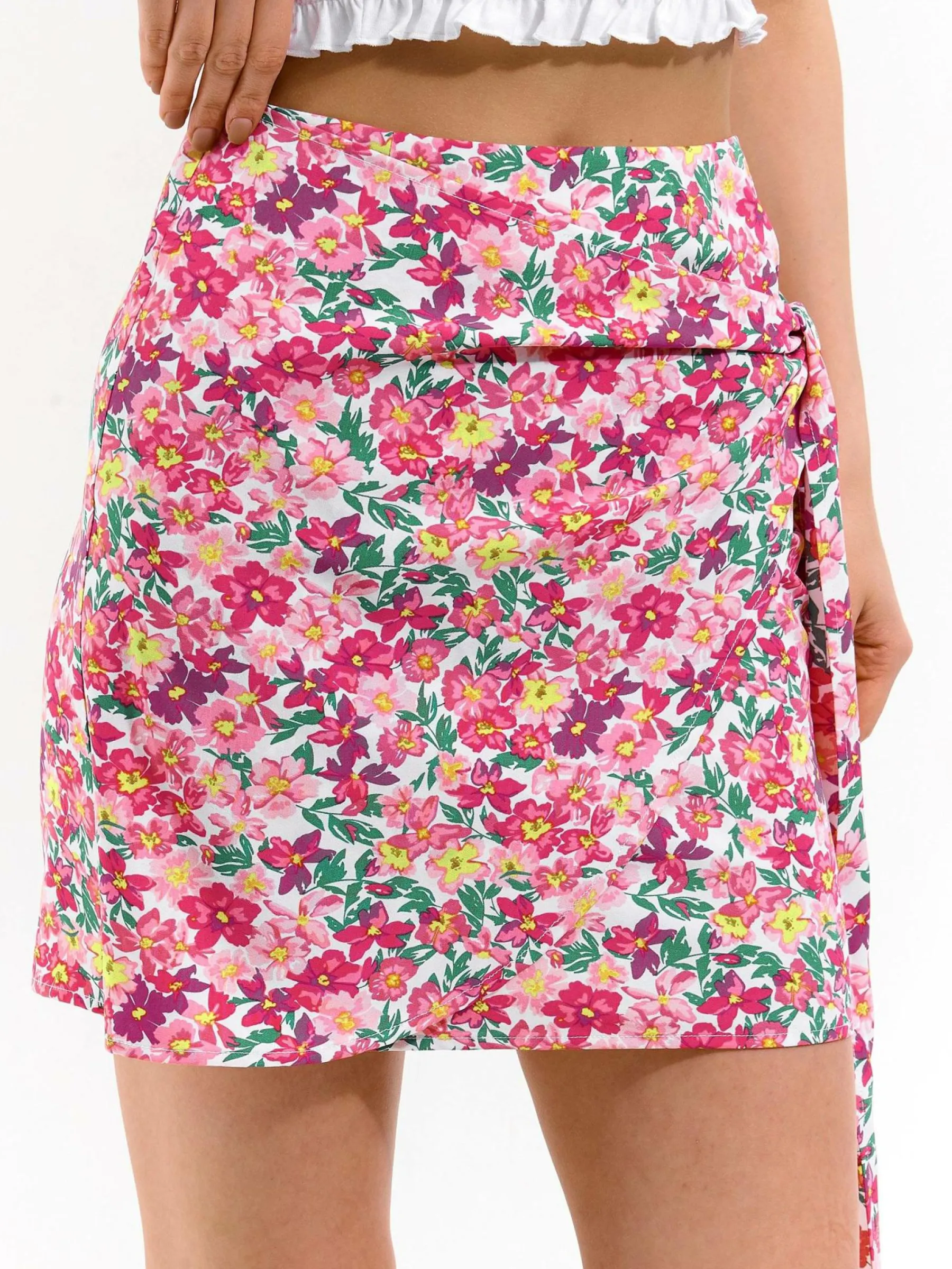 Kolor: różowyKrój: z marszczeniemTyp: spódnicaDługość: miniPattern style: kwiatoweDetal: z węzłem, na zamekMate…