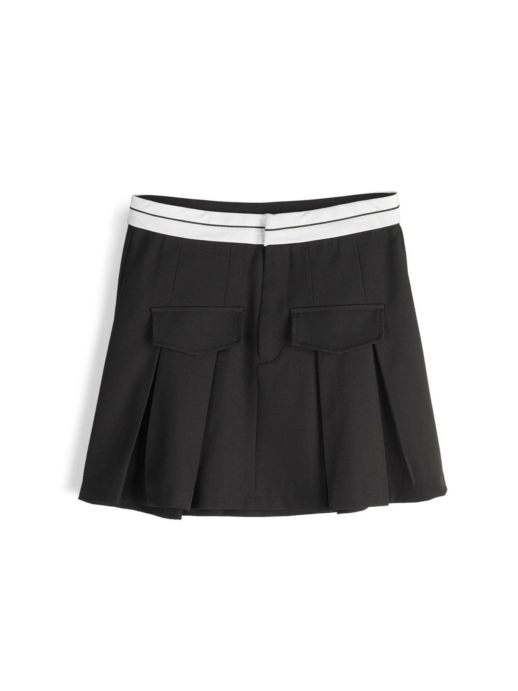 Kolor: czarnyKrój: plisowanyTyp: spódnicaDługość: miniPattern style: pojedynczy kolorDetal: z fałszywymi kieszenia…