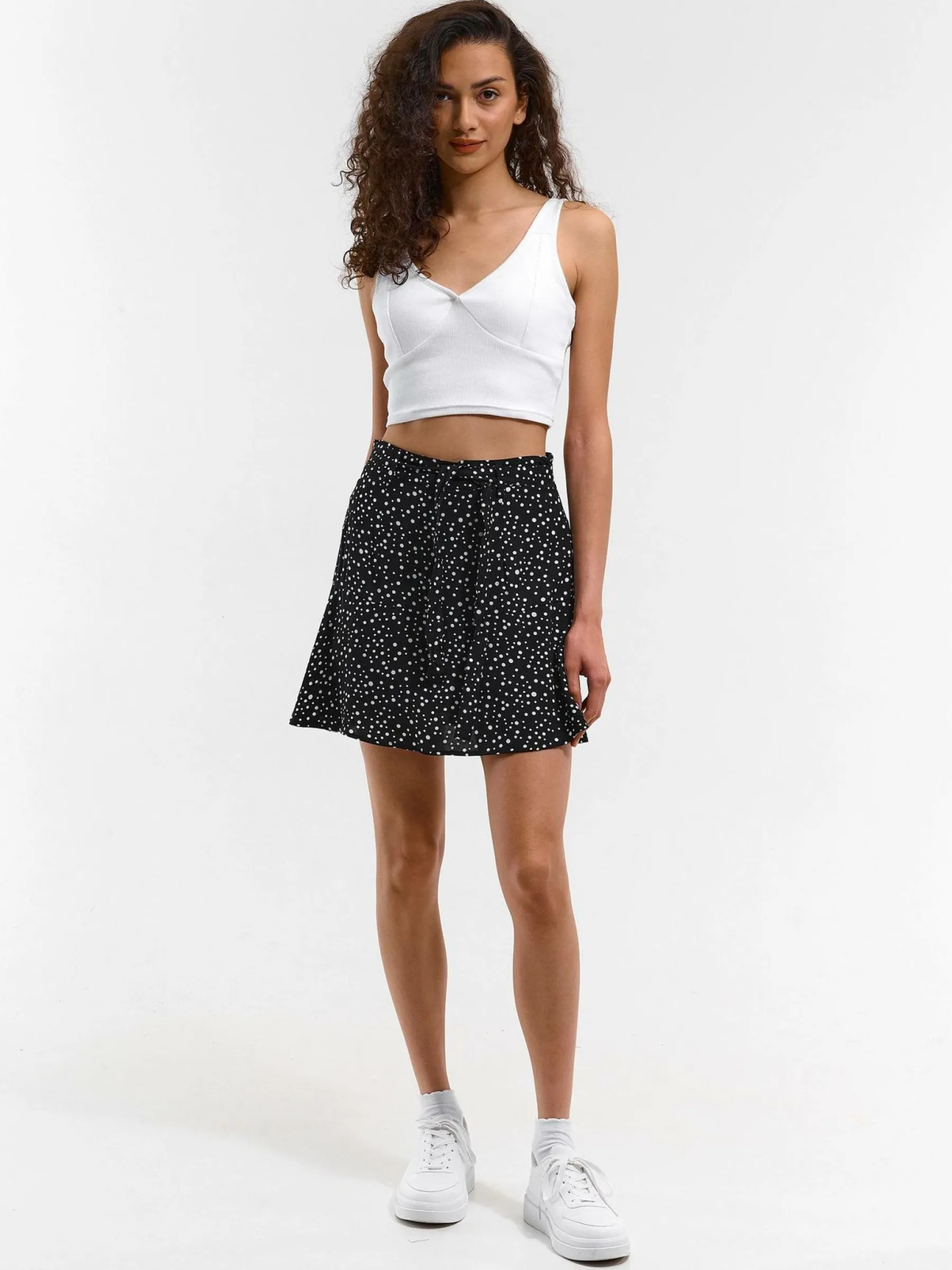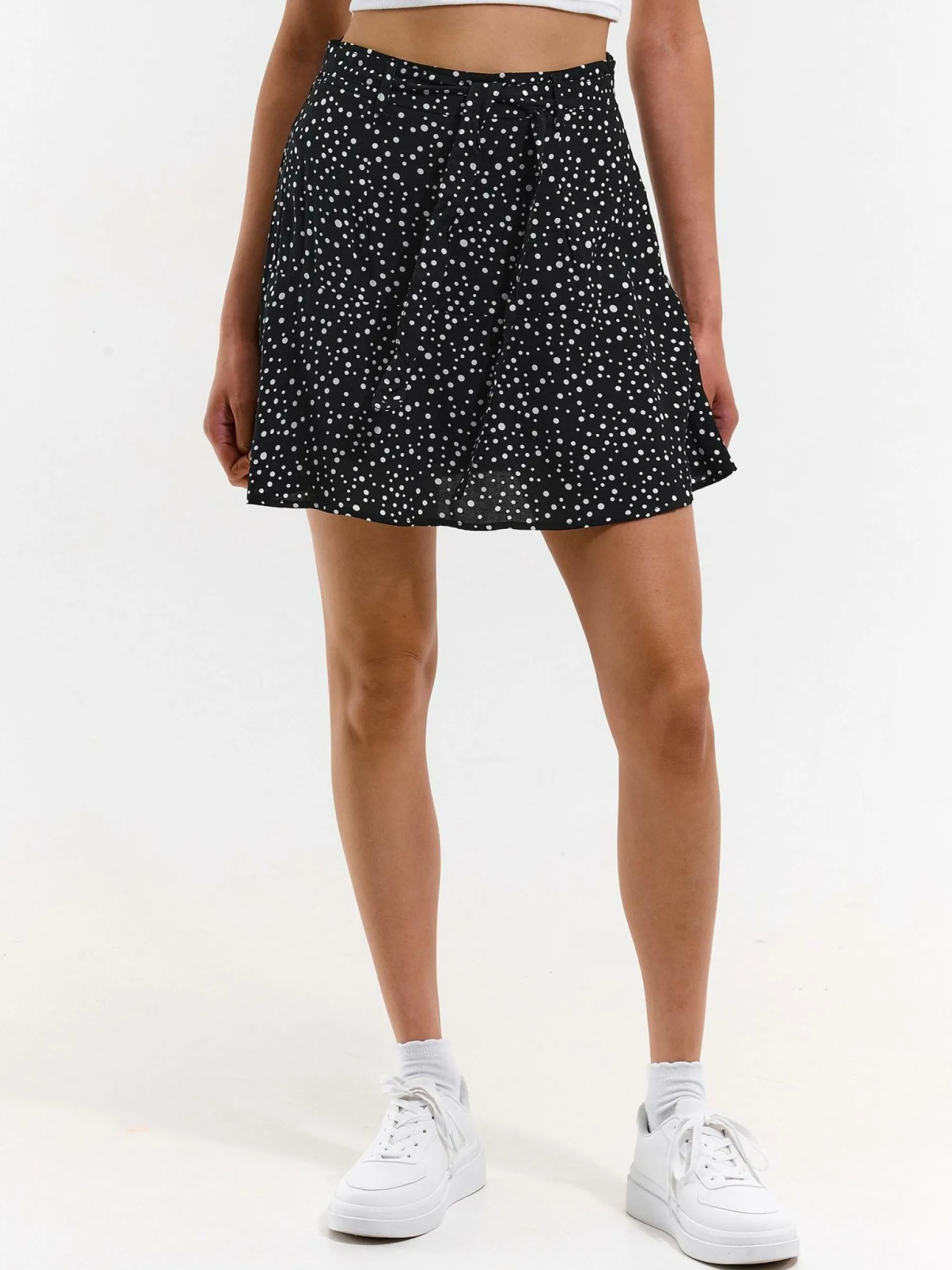 Kolor: czarnyKrój: skaterTyp: spódnicaDługość: miniPattern style: w grochyDetal: na zamek, z paskiemMateriał: wisk…