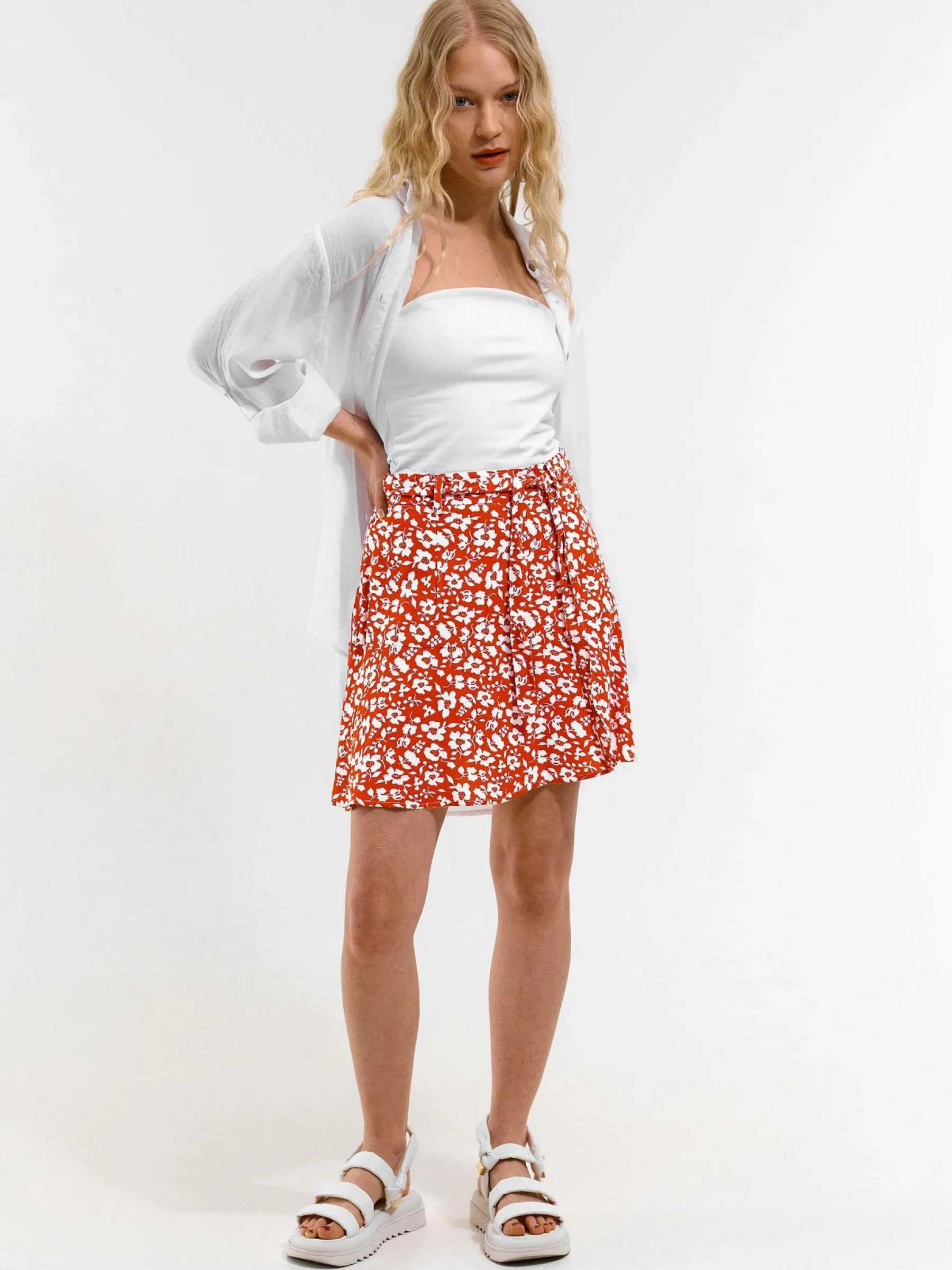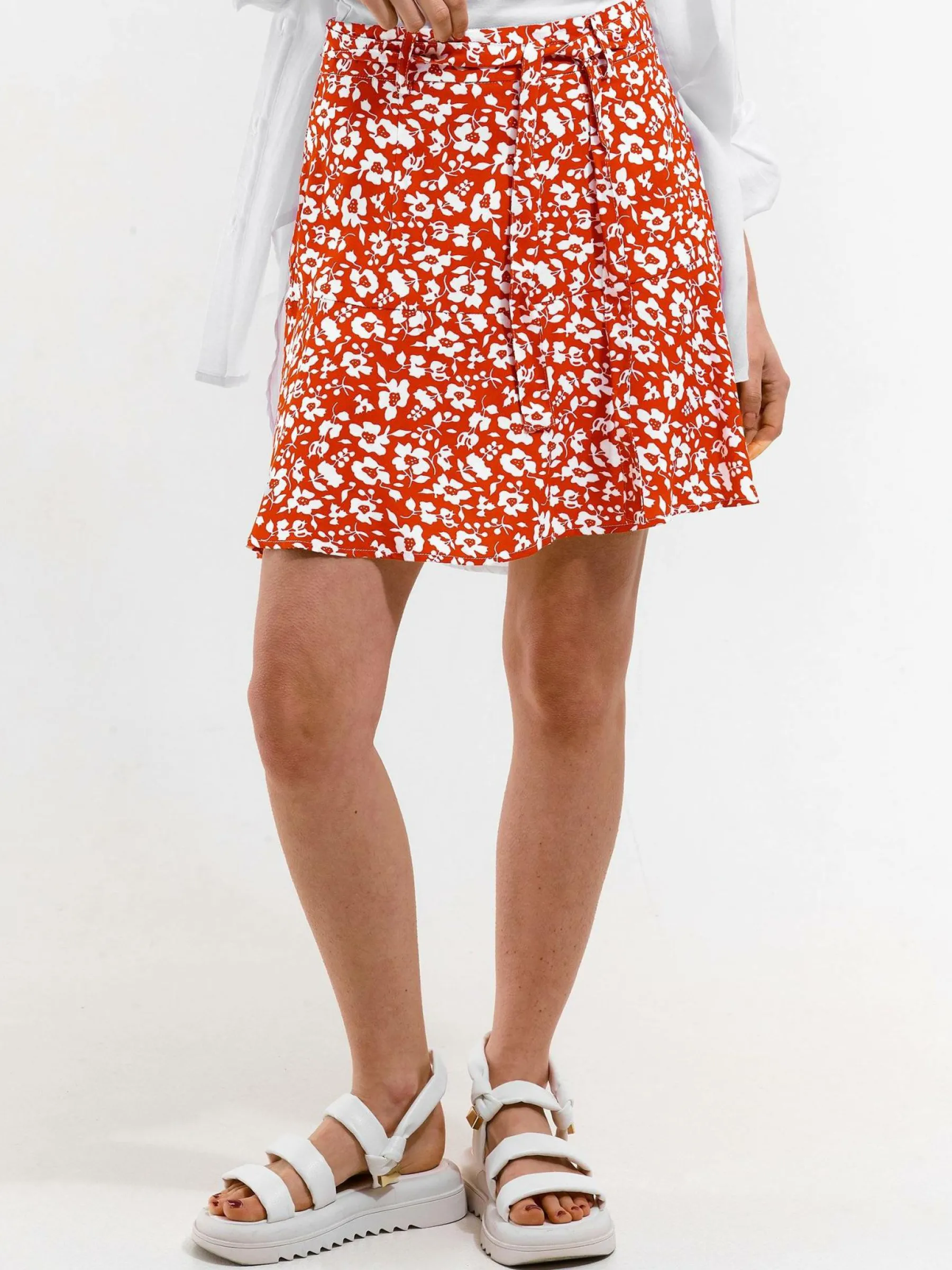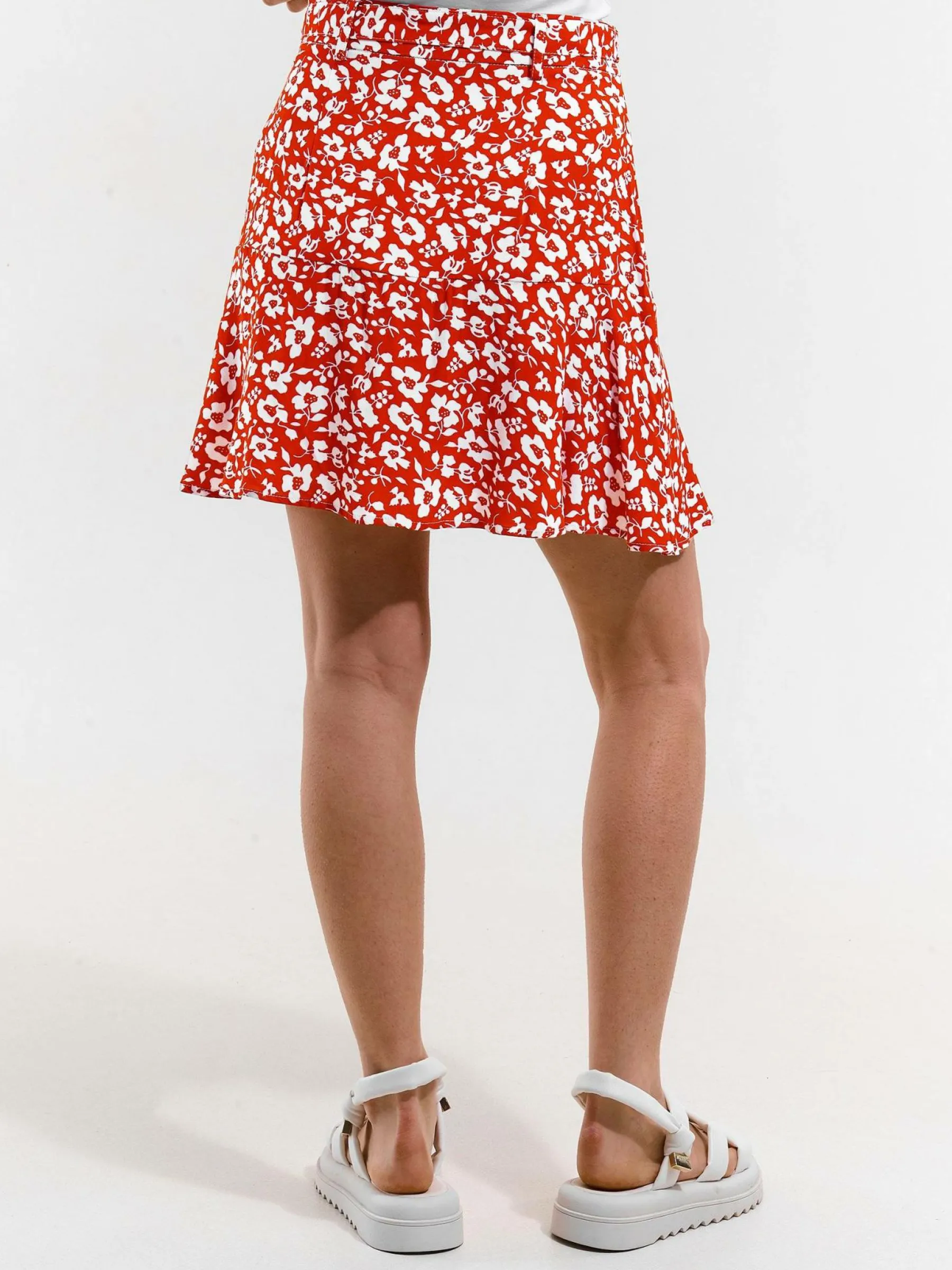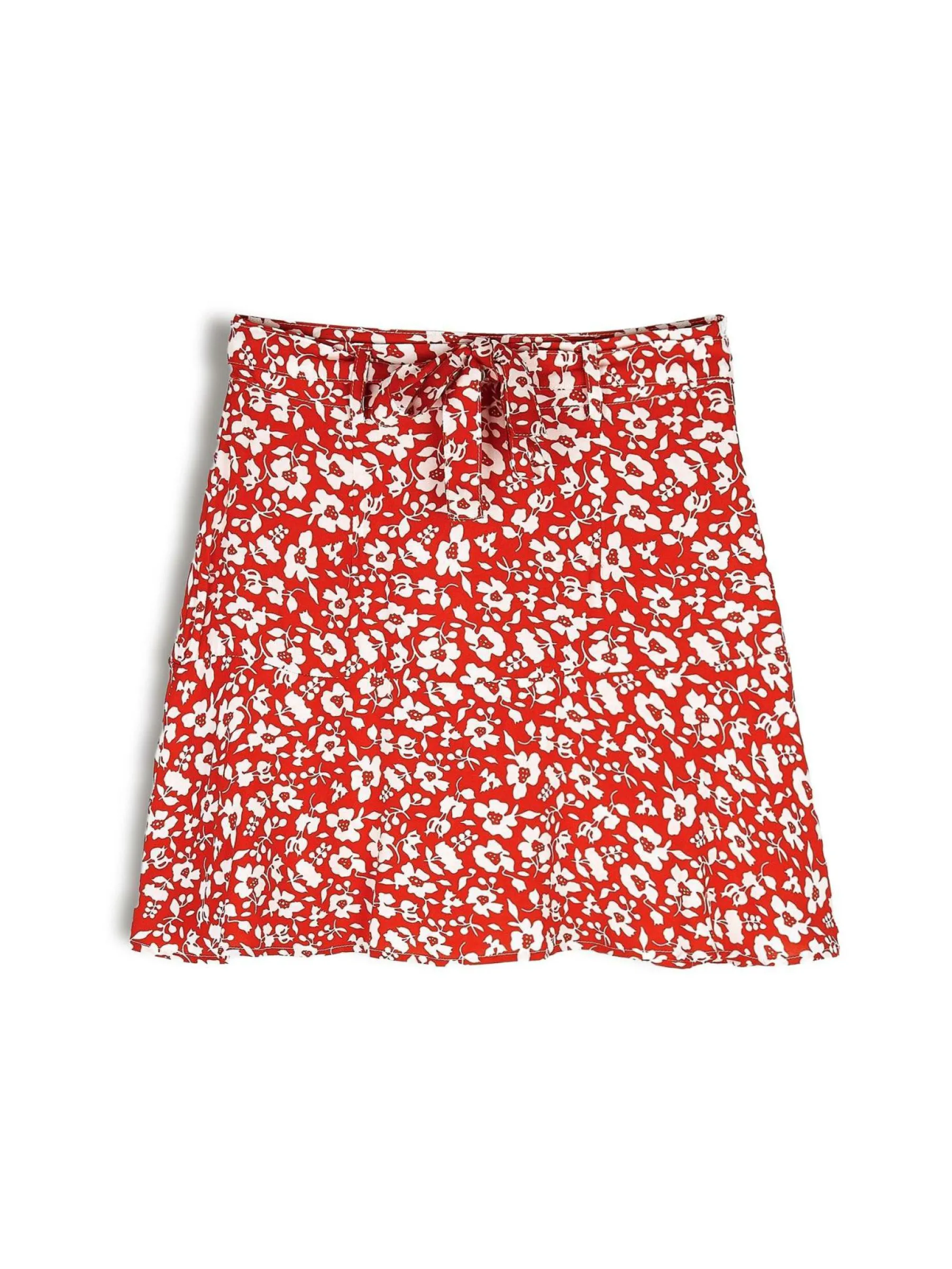 Kolor: czerwonyKrój: skaterTyp: spódnicaDługość: miniPattern style: kwiatoweDetal: na zamek, z paskiemMateriał: wi…