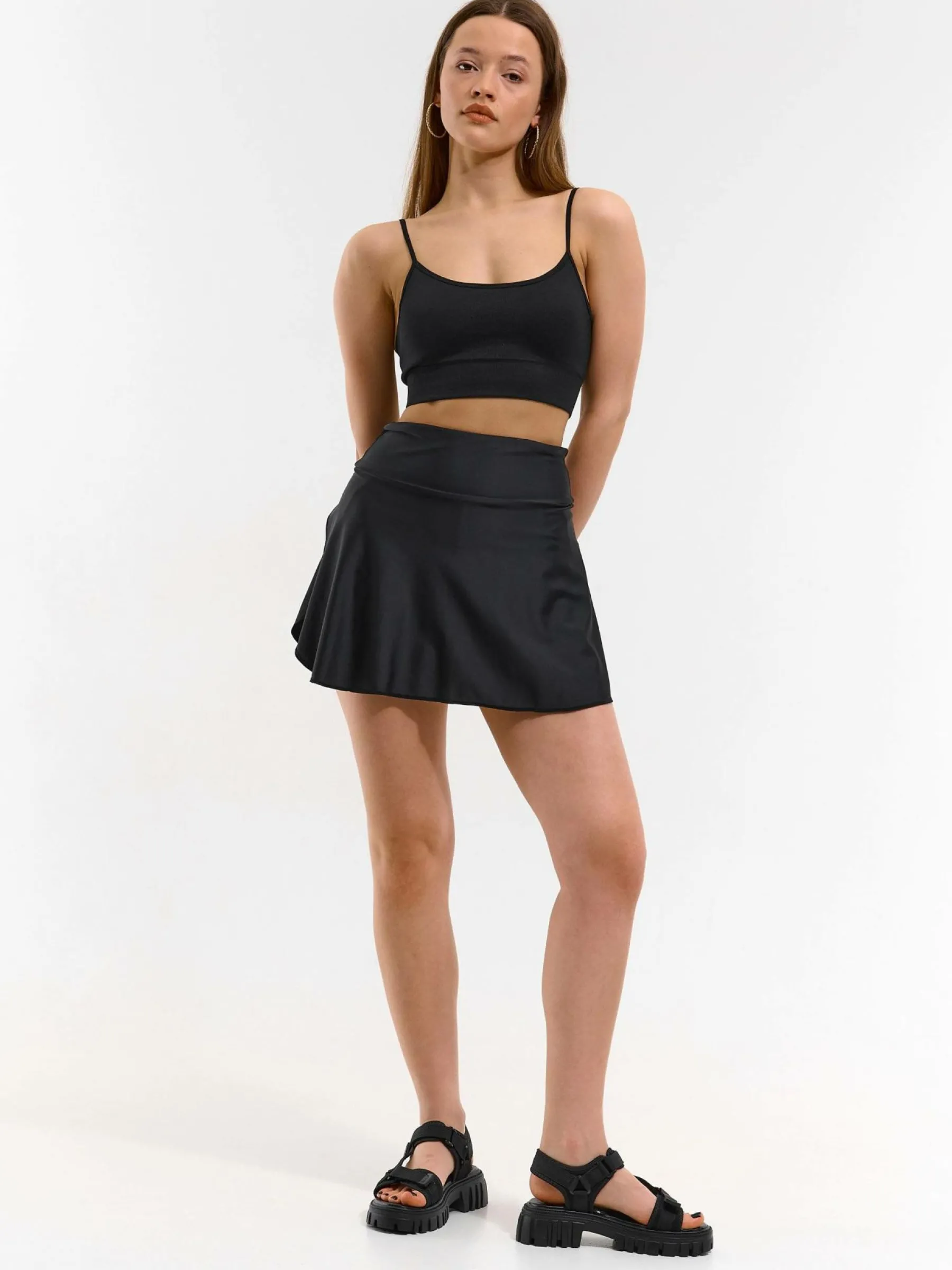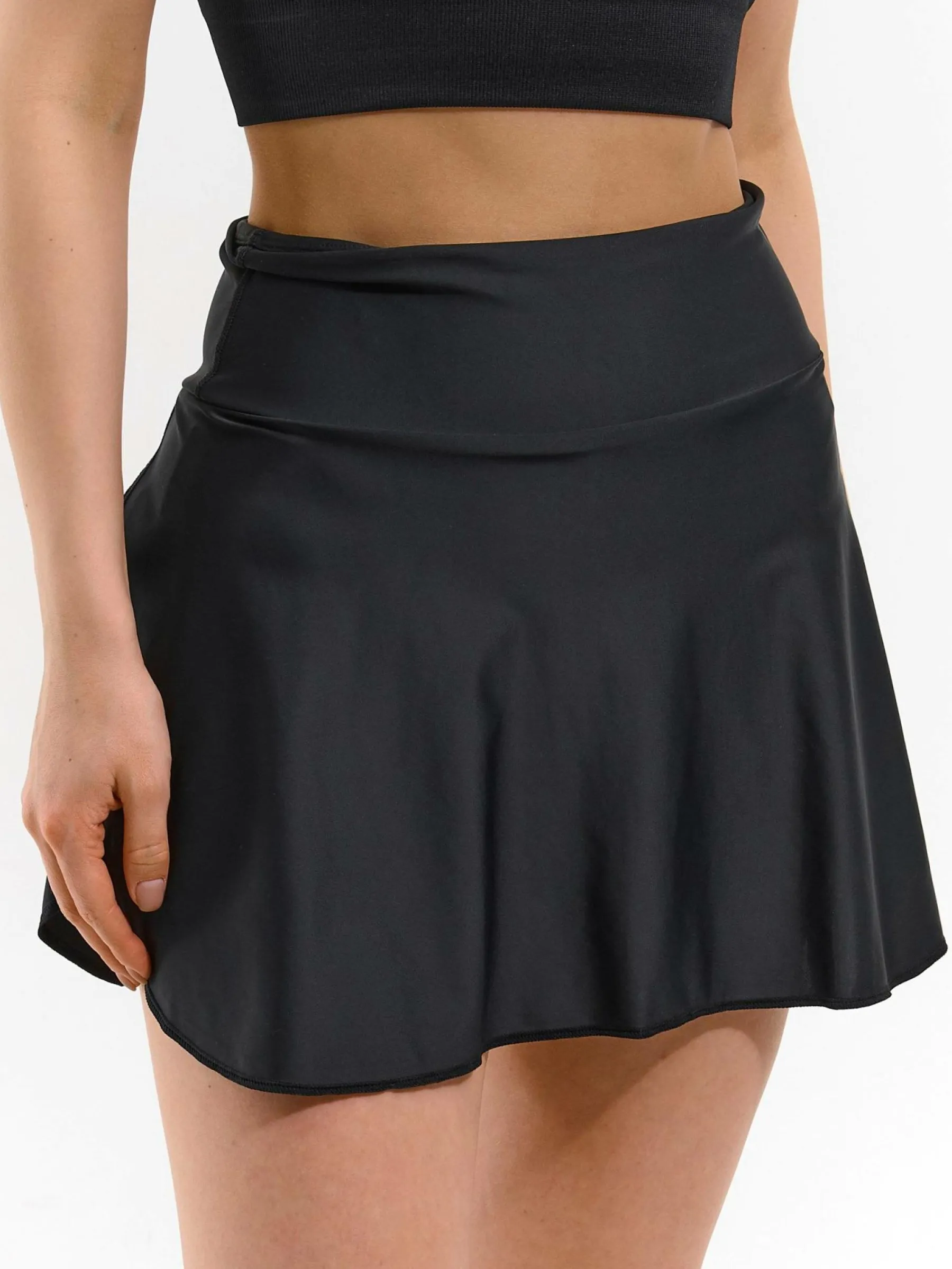 Kolor: czarnyKrój: regularTyp: spódnicaDługość: miniPattern style: pojedynczy kolorDetal: z elastyczną opaskąMate…