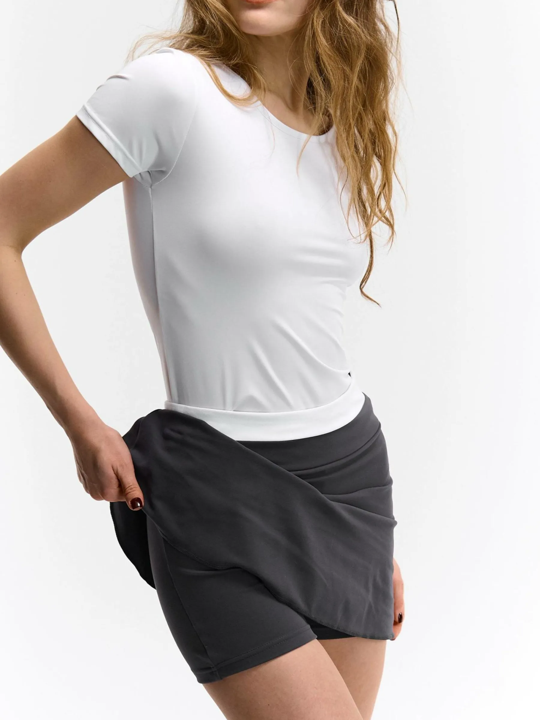 Kolor: szaryKrój: asyTyp: spódnicaDługość: miniPattern style: pojedynczy kolorDetal: z elastyczną opaskąMateriał…