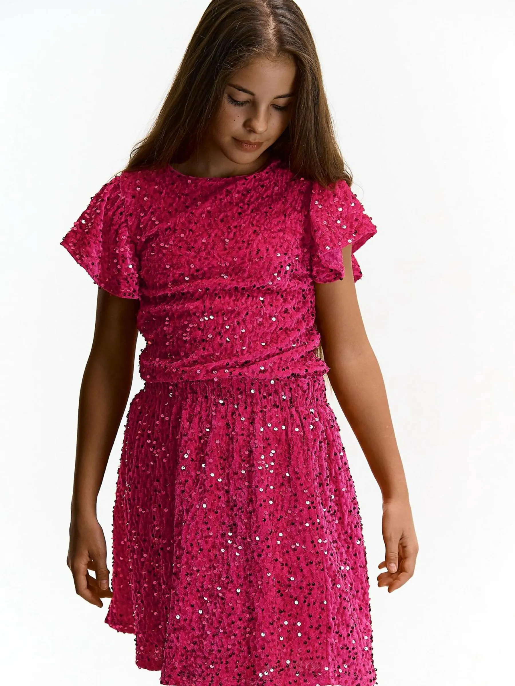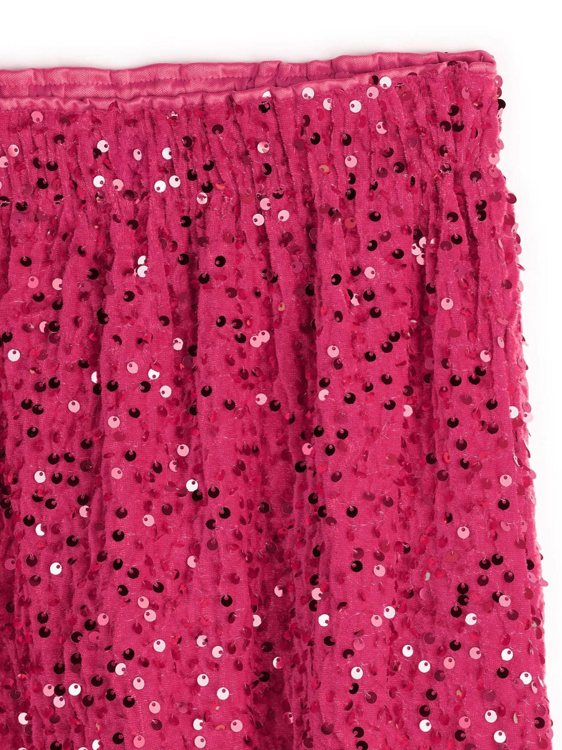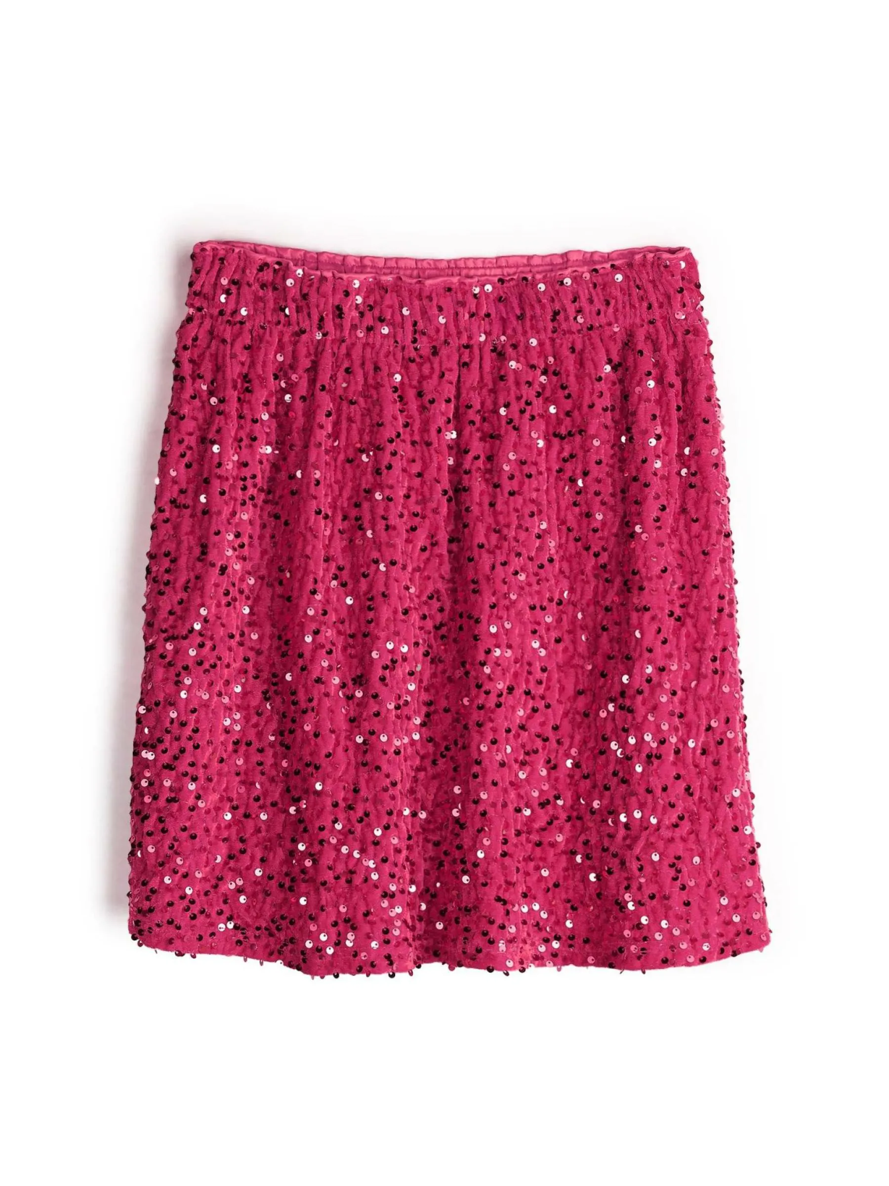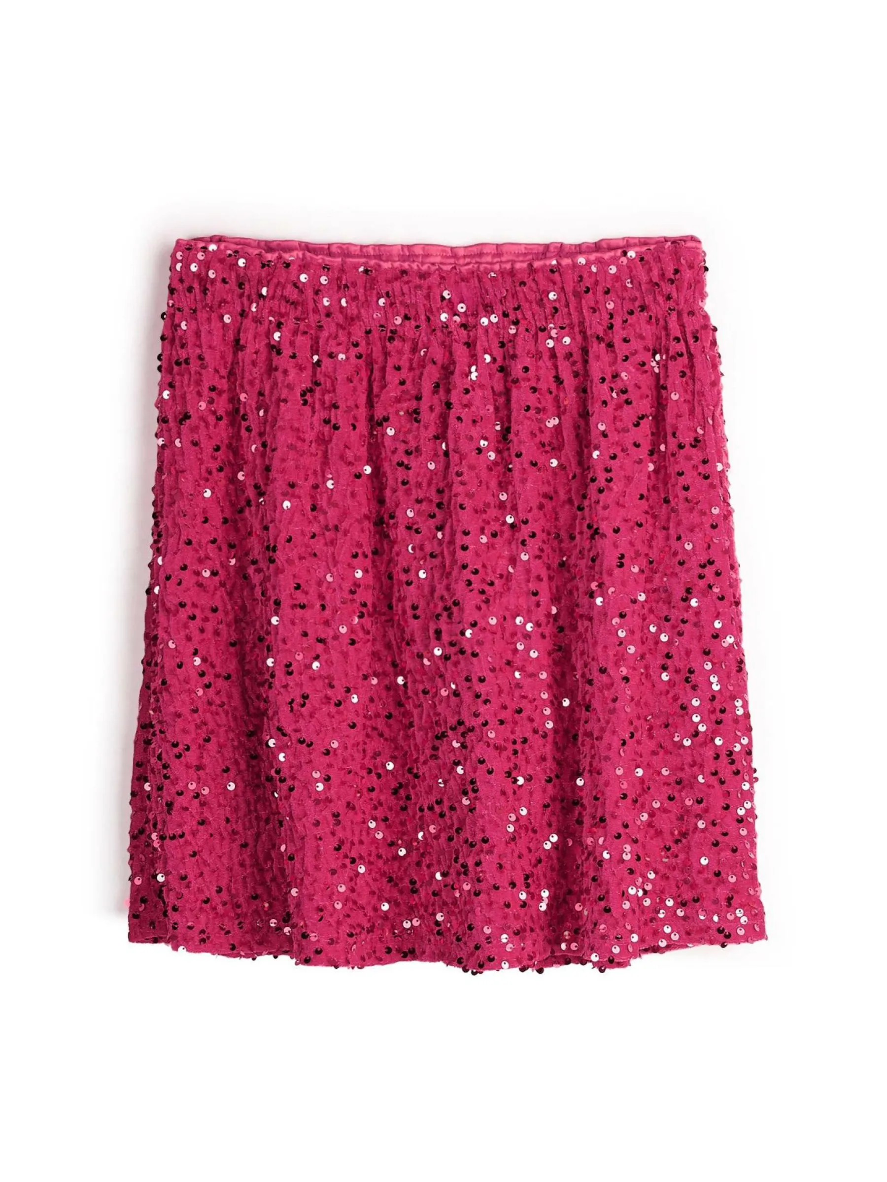 Kolor: różowyKrój: asyTyp: spódnicaDługość: miniPattern style: pojedynczy kolor, z cekinamiDetal: z elastyczną o…