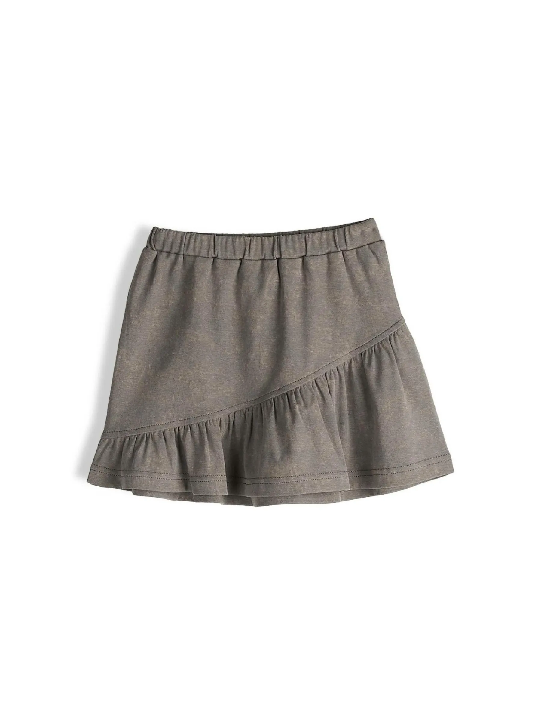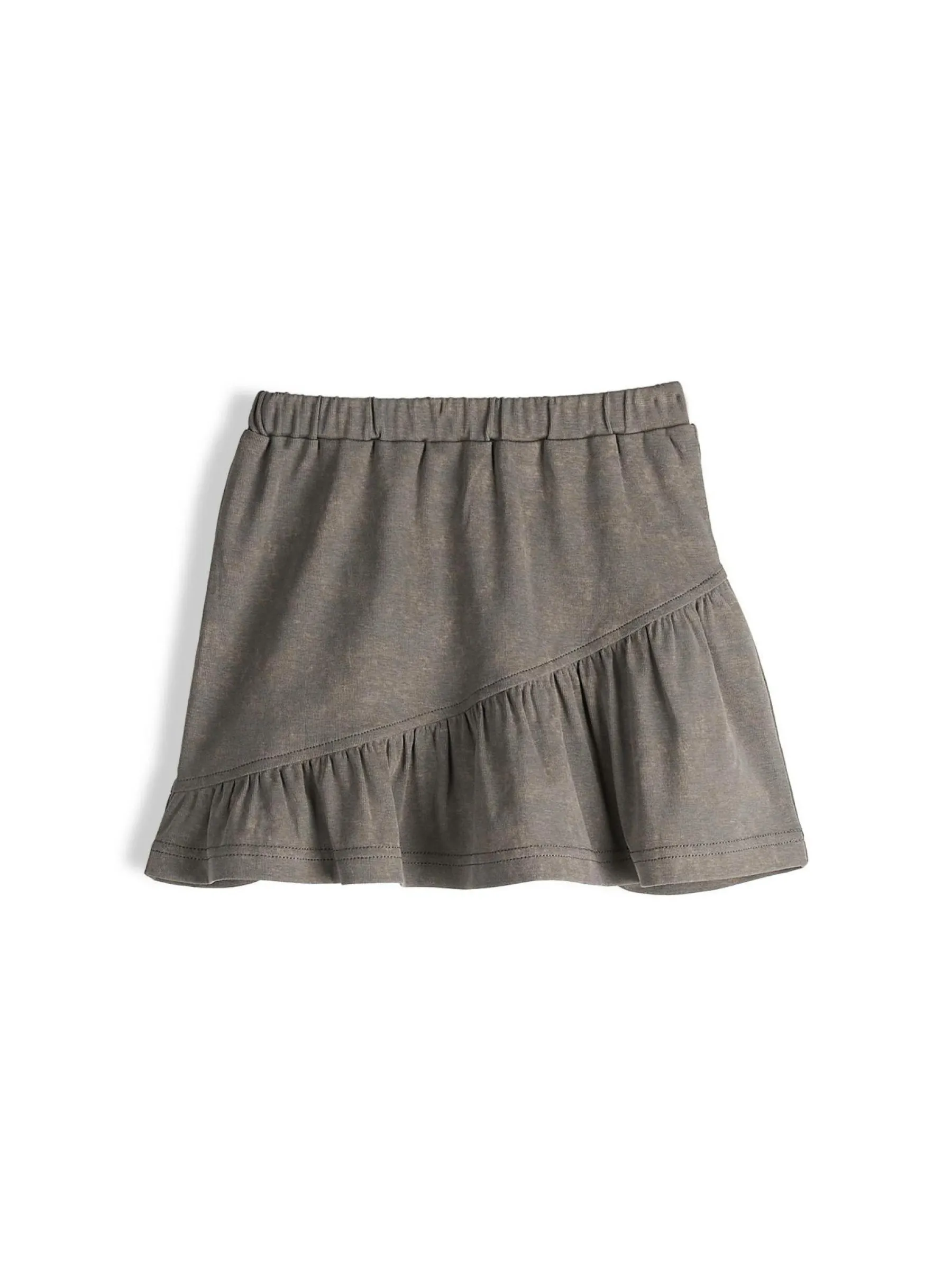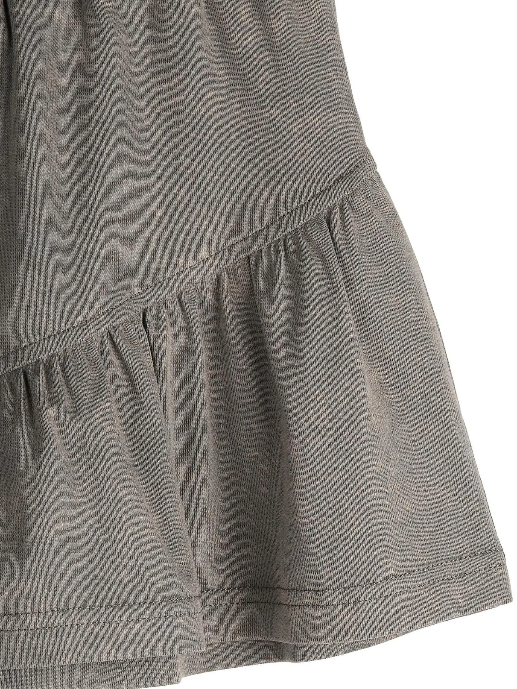 Kolor: szaryKrój: z falbanąTyp: spódnicaDługość: miniPattern style: pojedynczy kolorDetal: z elastyczną opaskąMa…