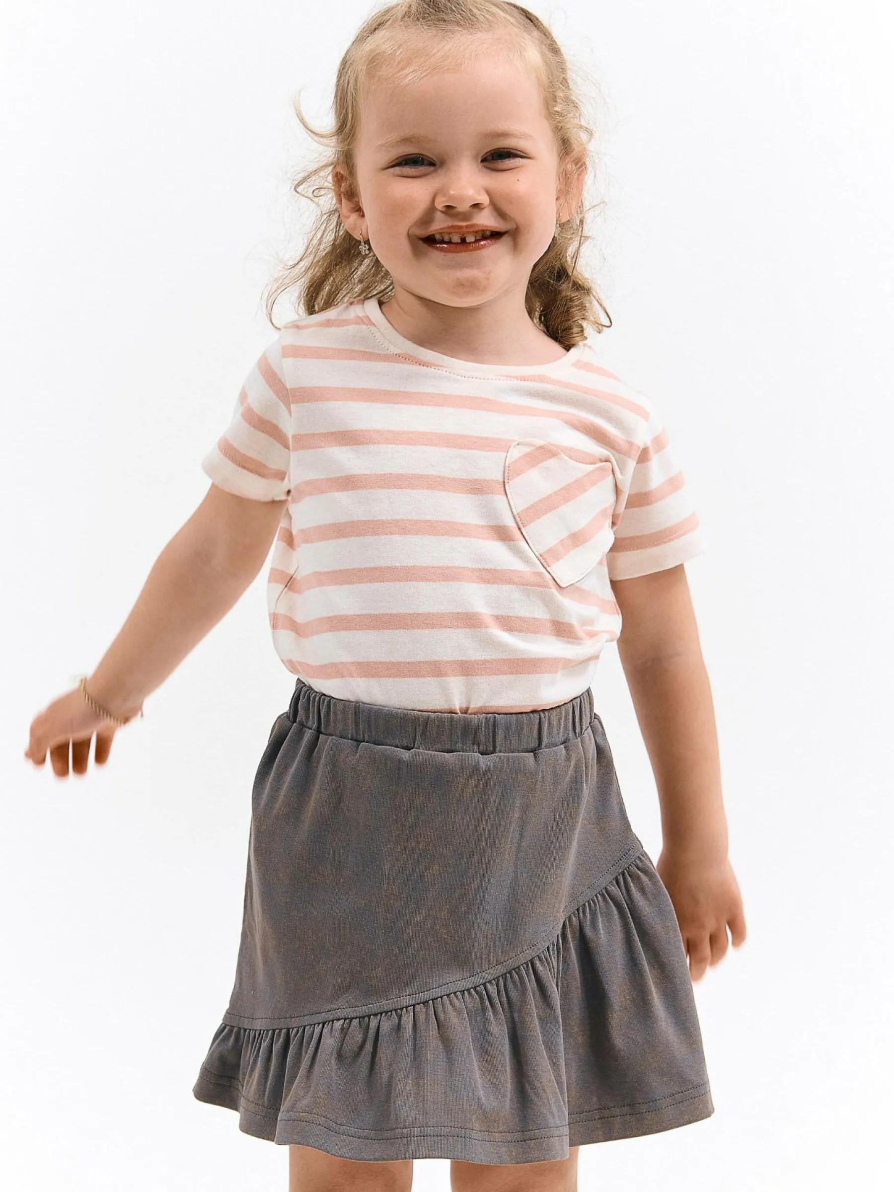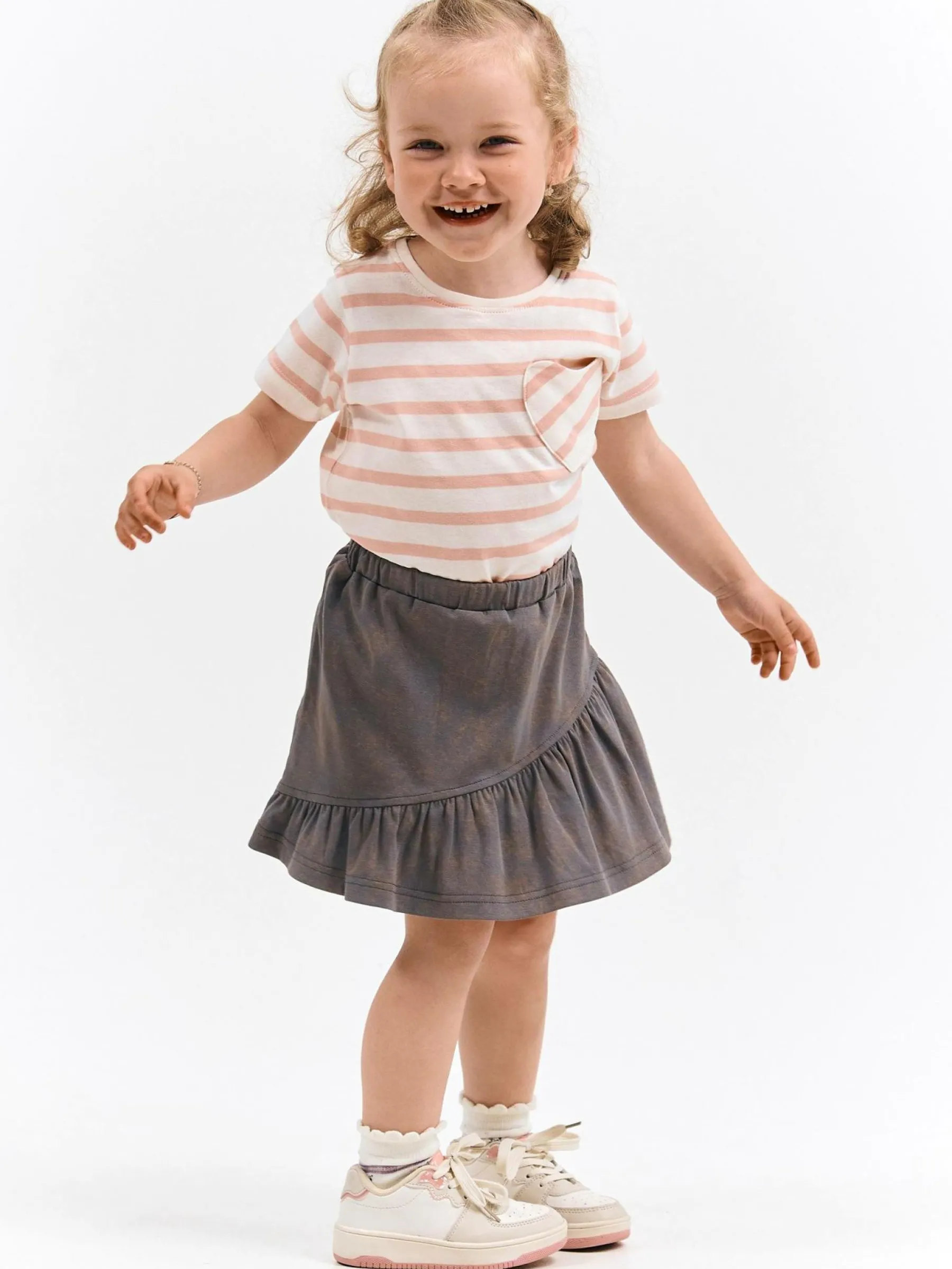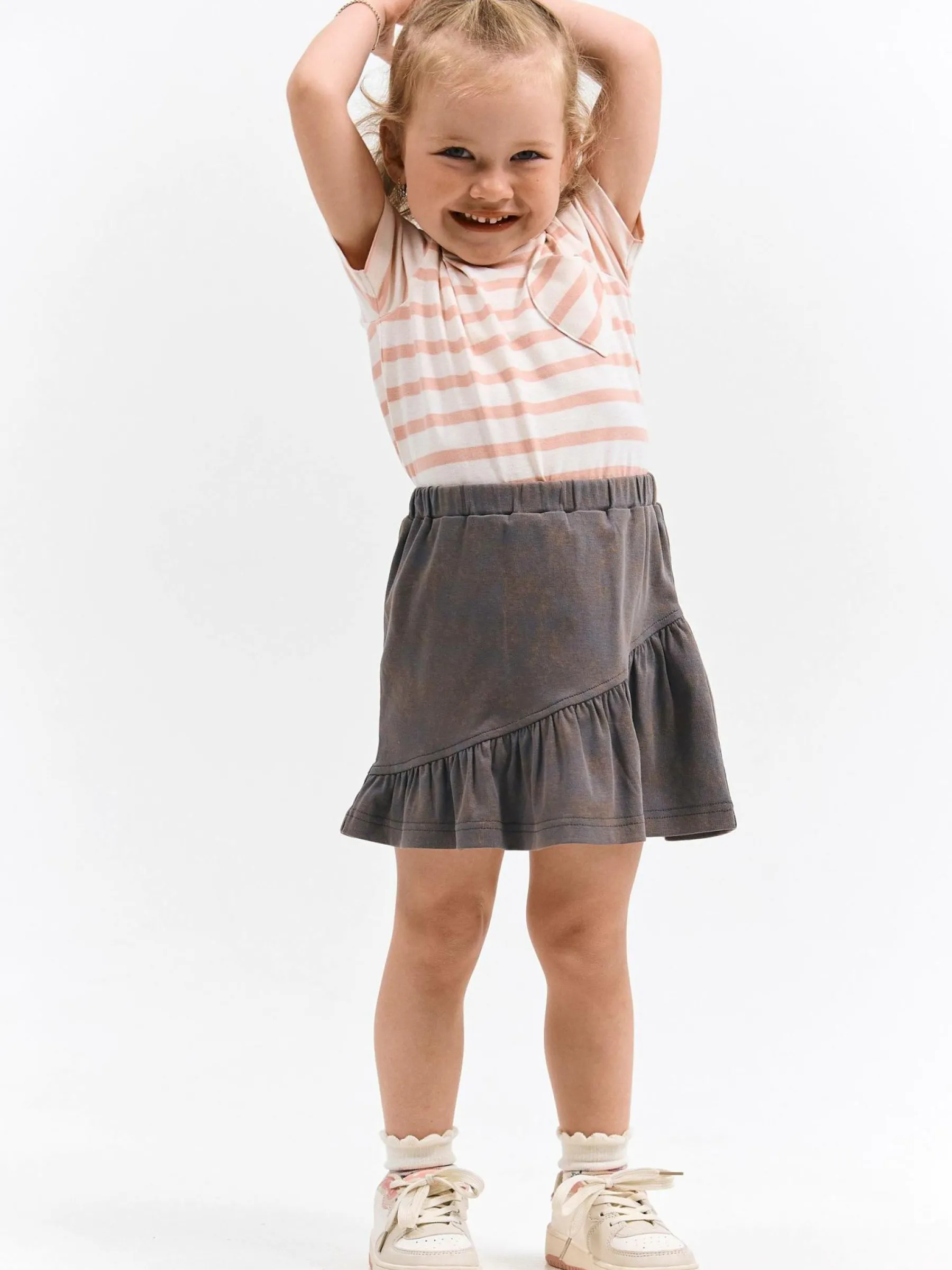 Kolor: szaryKrój: z falbanąTyp: spódnicaDługość: miniPattern style: pojedynczy kolorDetal: z elastyczną opaskąMa…