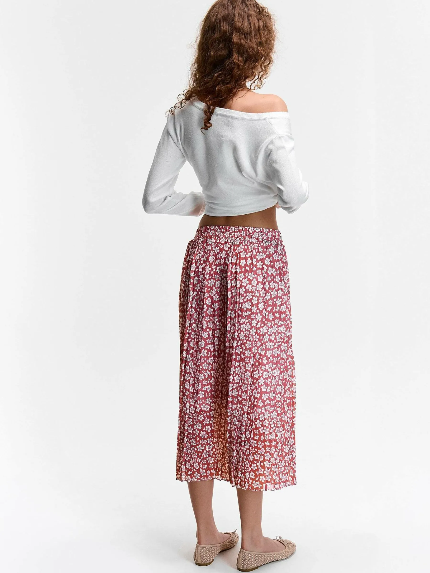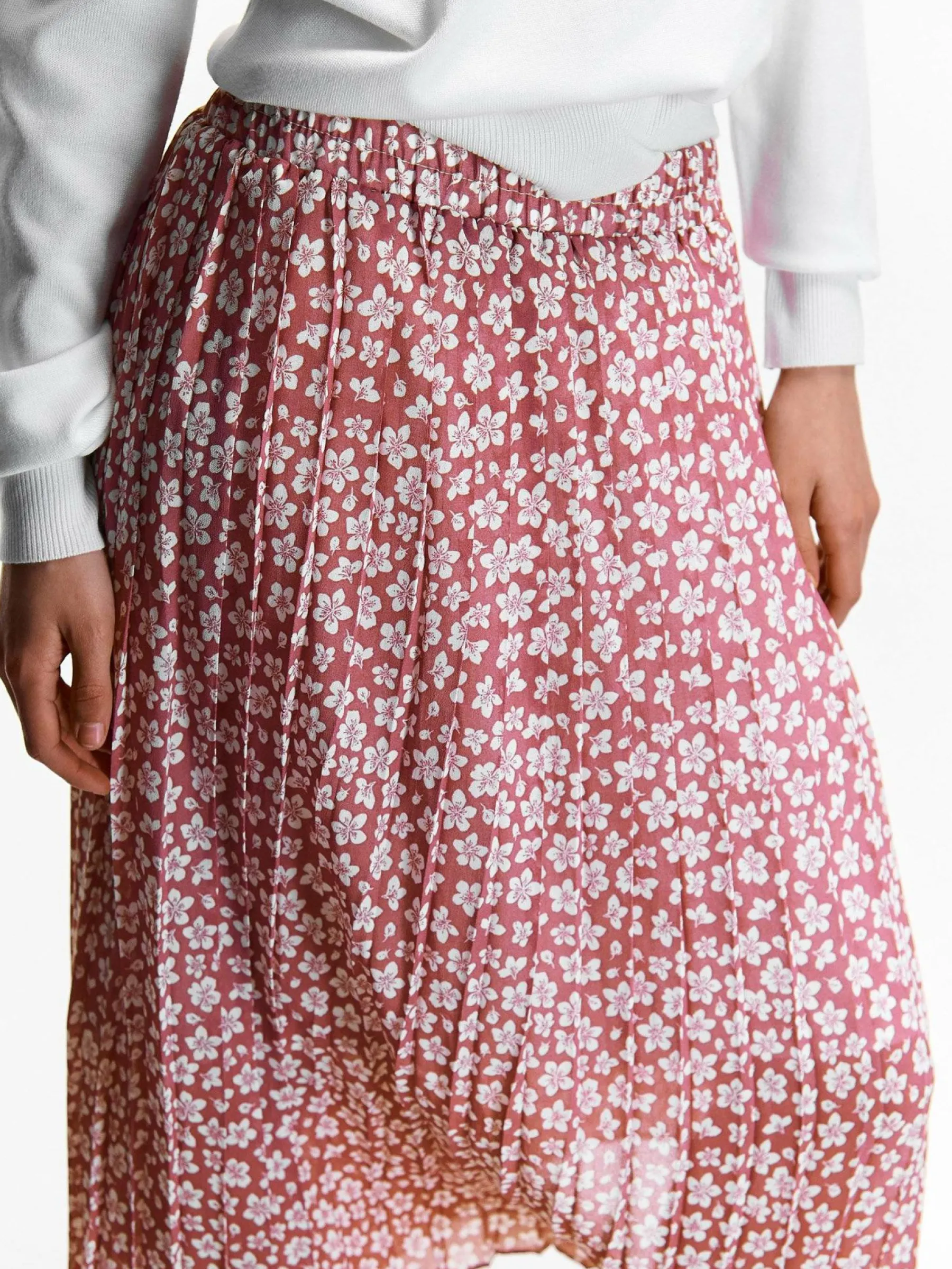 Kolor: różowyKrój: plisowaneTyp: spódnicaDługość: midiPattern style: kwiatoweDetal: z elastyczną opaską, z halk…