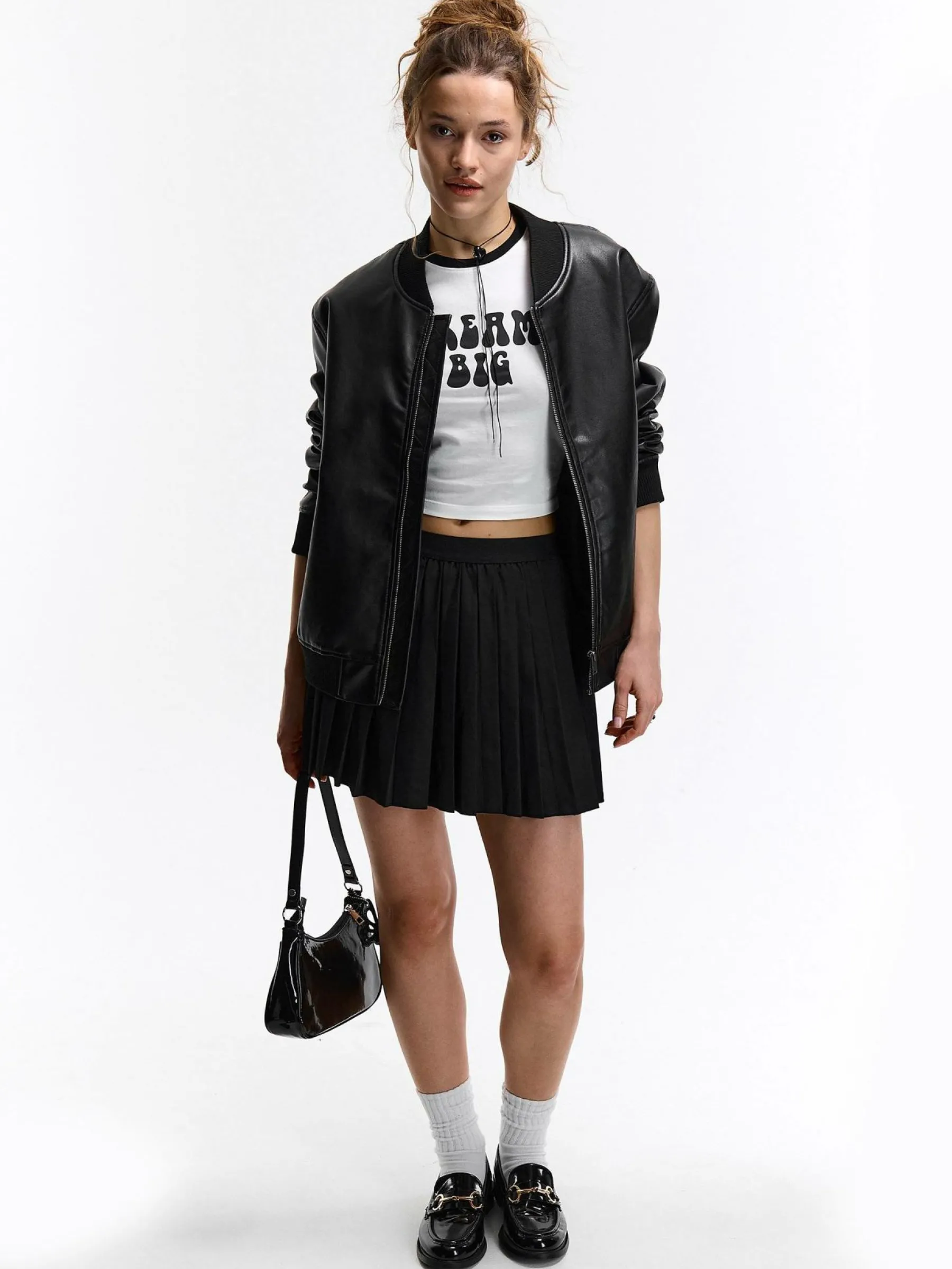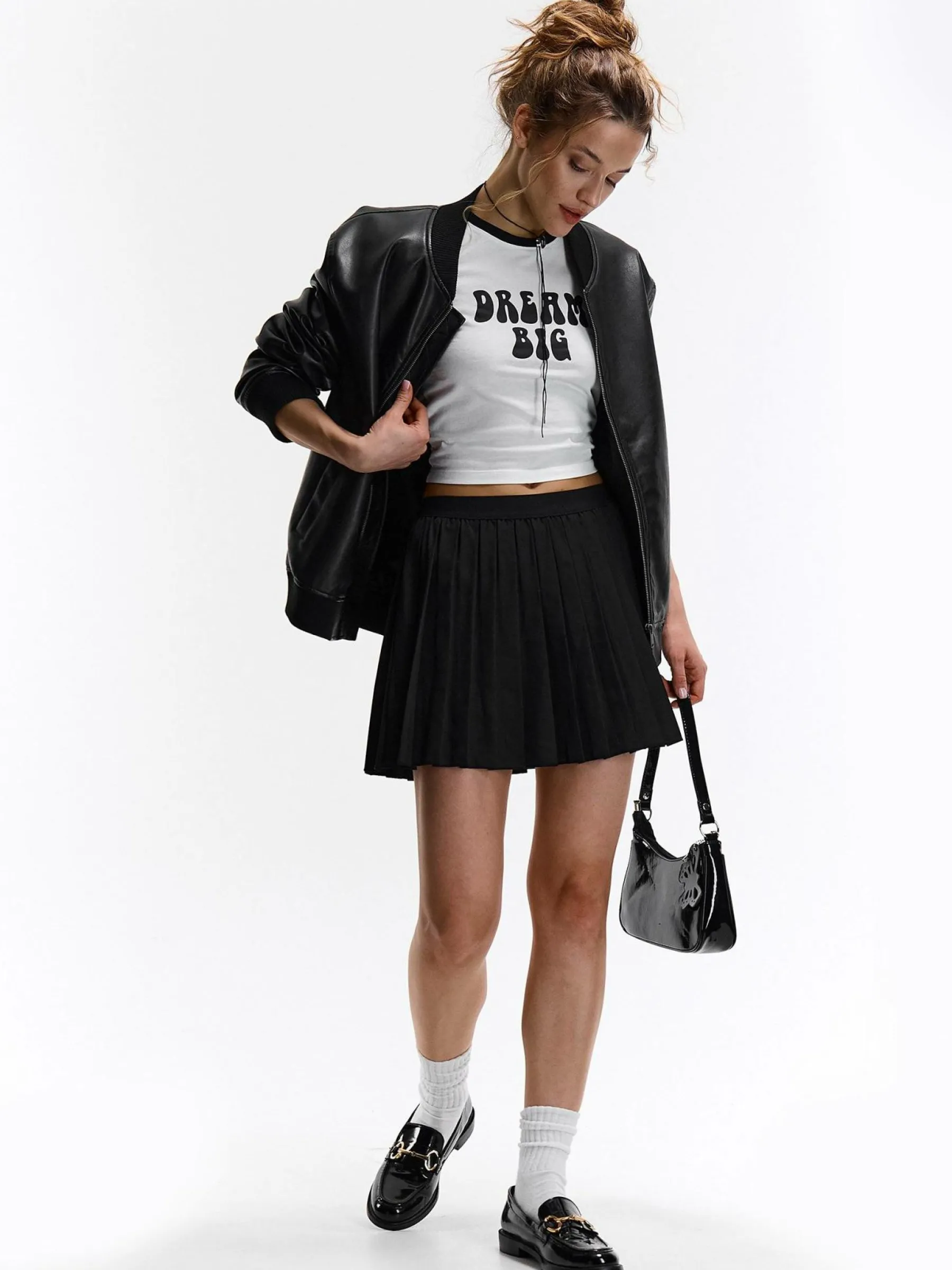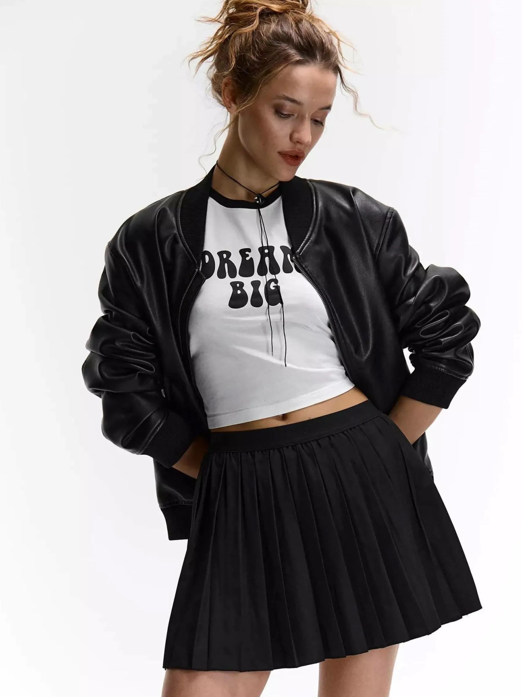 Kolor: czarnyKrój: plisowanyTyp: spódnicaDługość: miniPattern style: pojedynczy kolorDetal: z elastyczną opaskąMa…